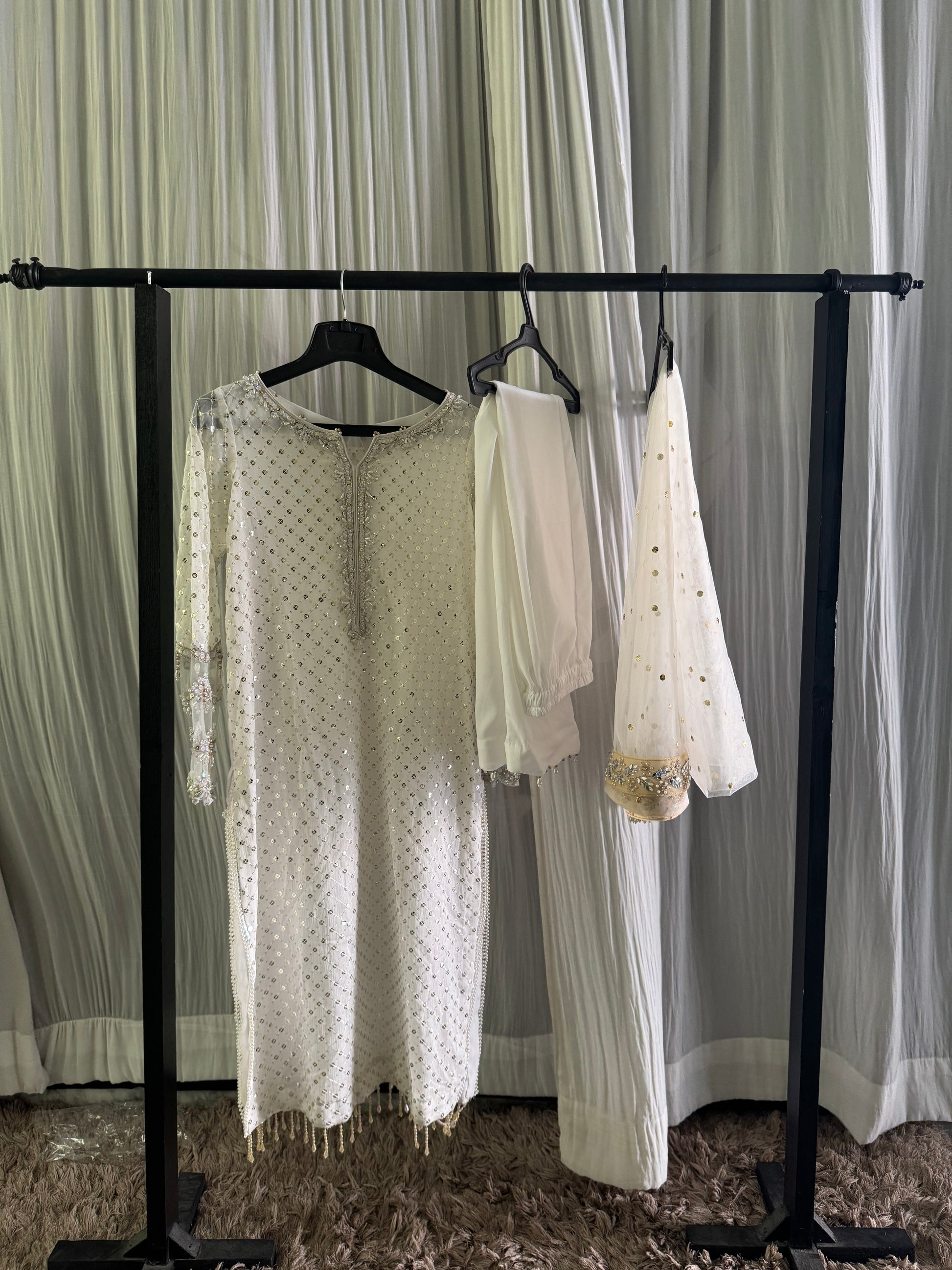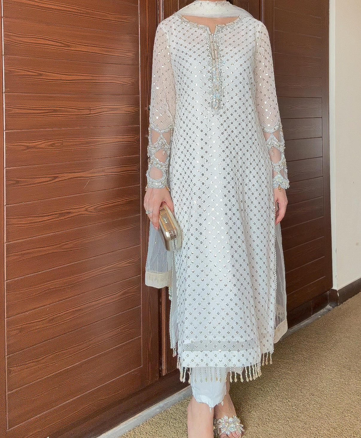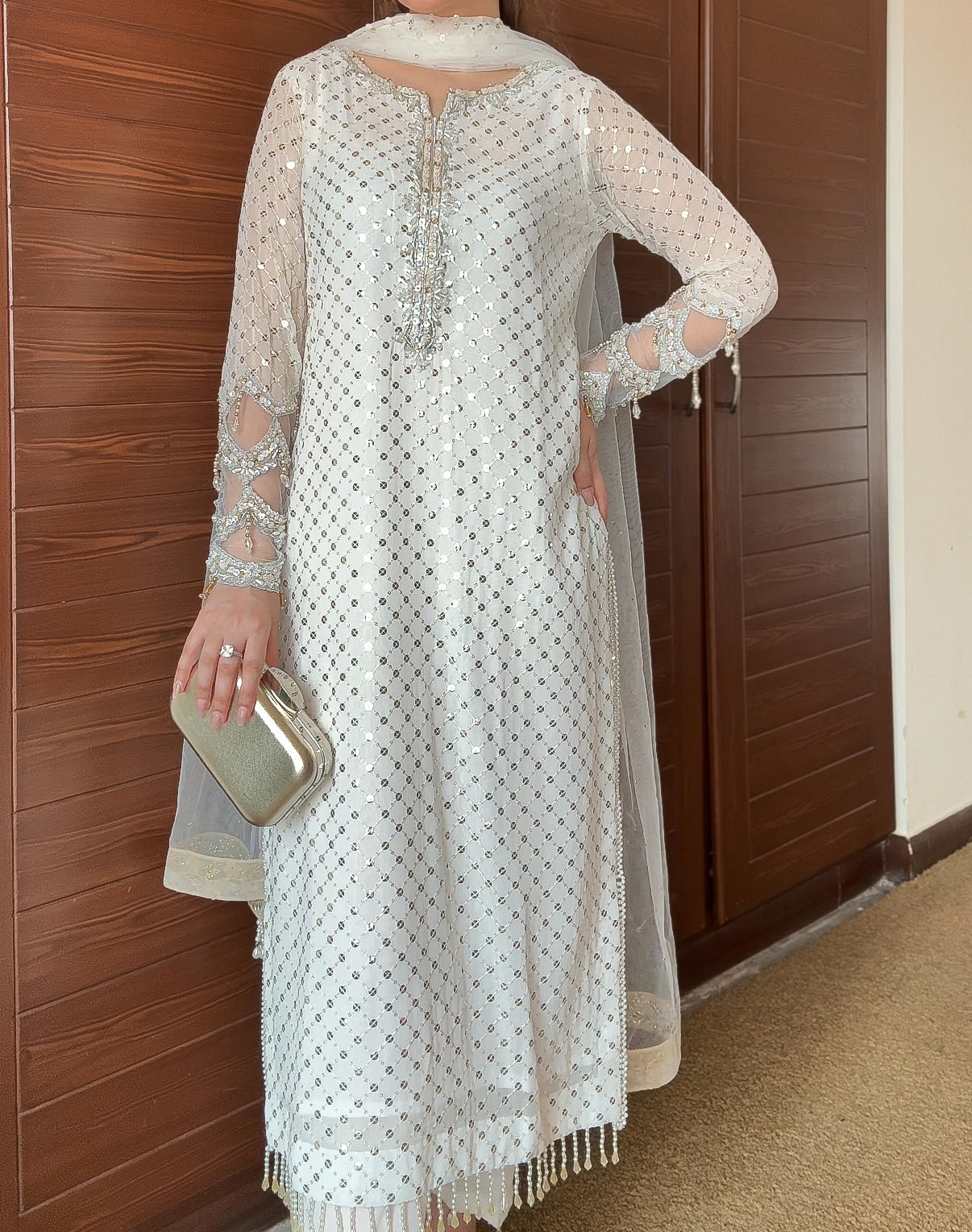 Stunning heavy base chiffon shirt with unique Cutwork handwork sleeves with tassles and a beautiful neckline.