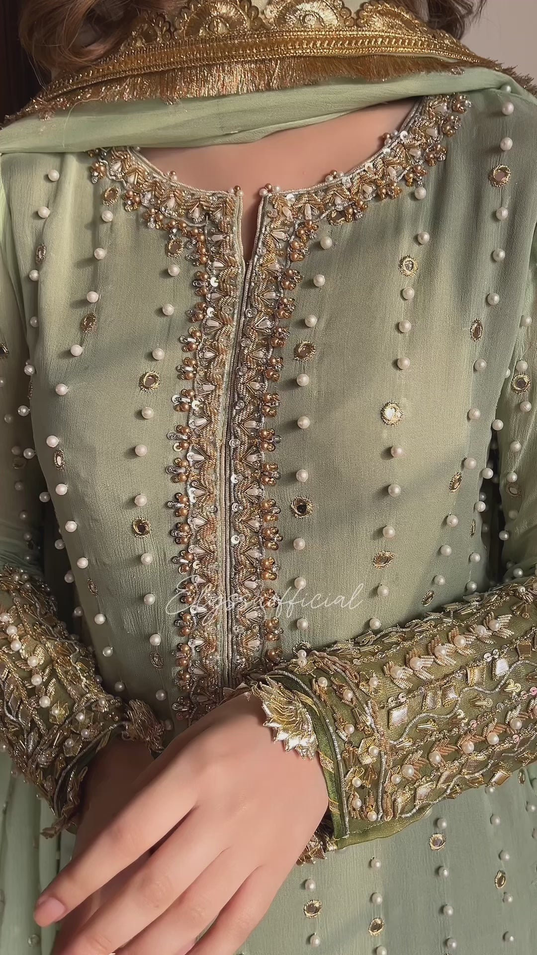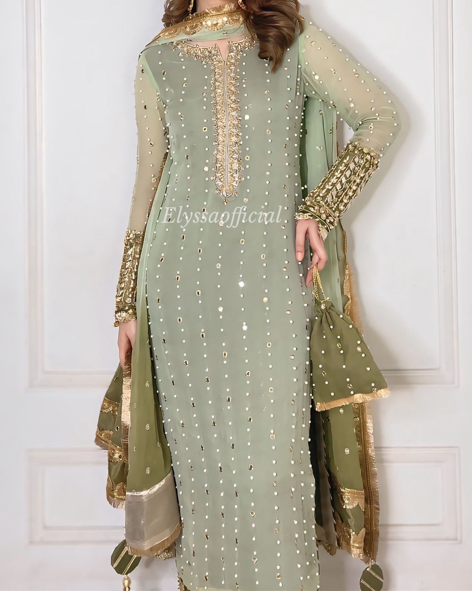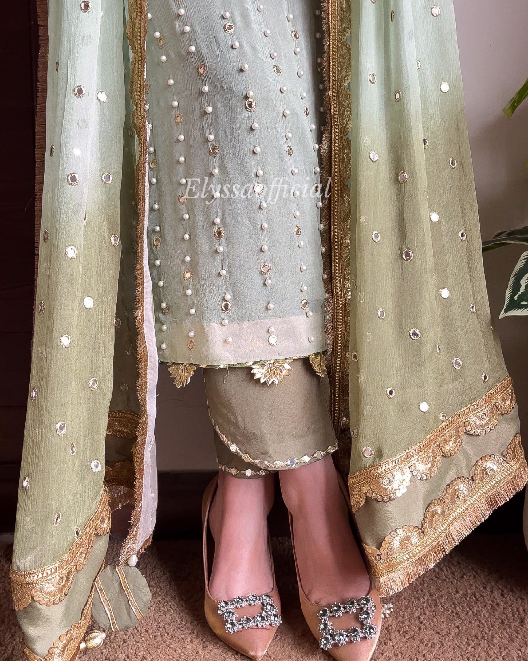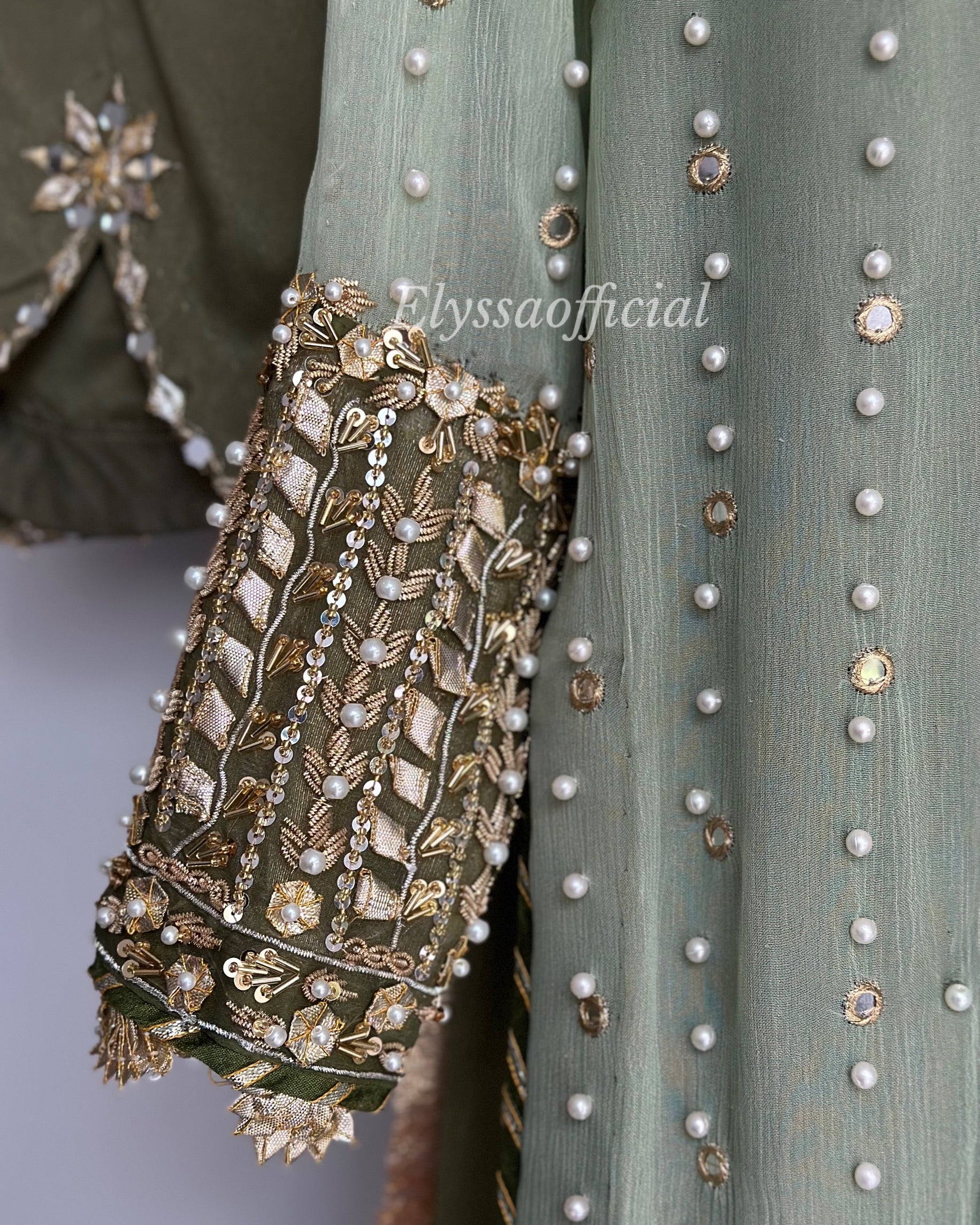 This suit Colour is a sage mint with olive dusky contrast touches.. Stunning unique combination