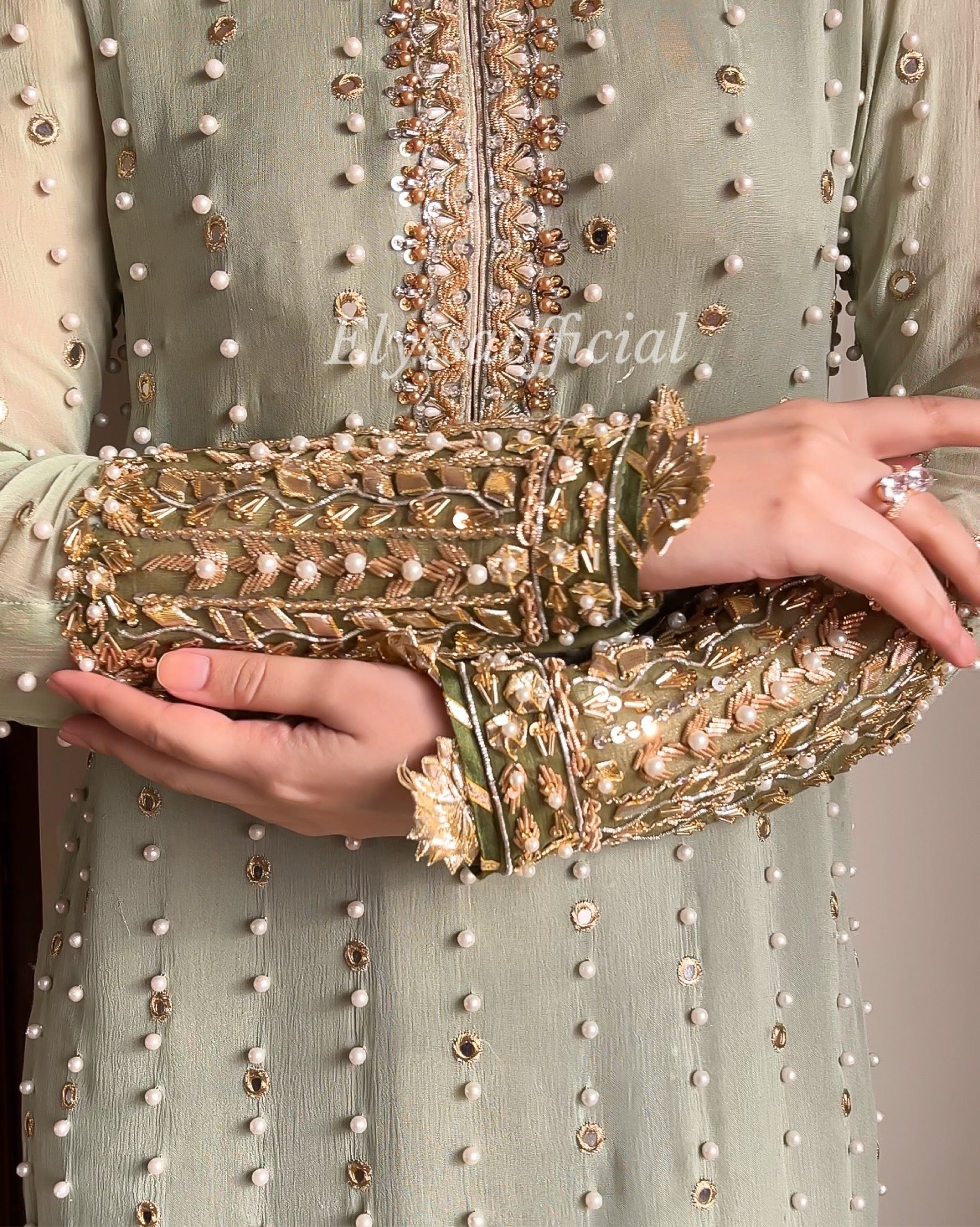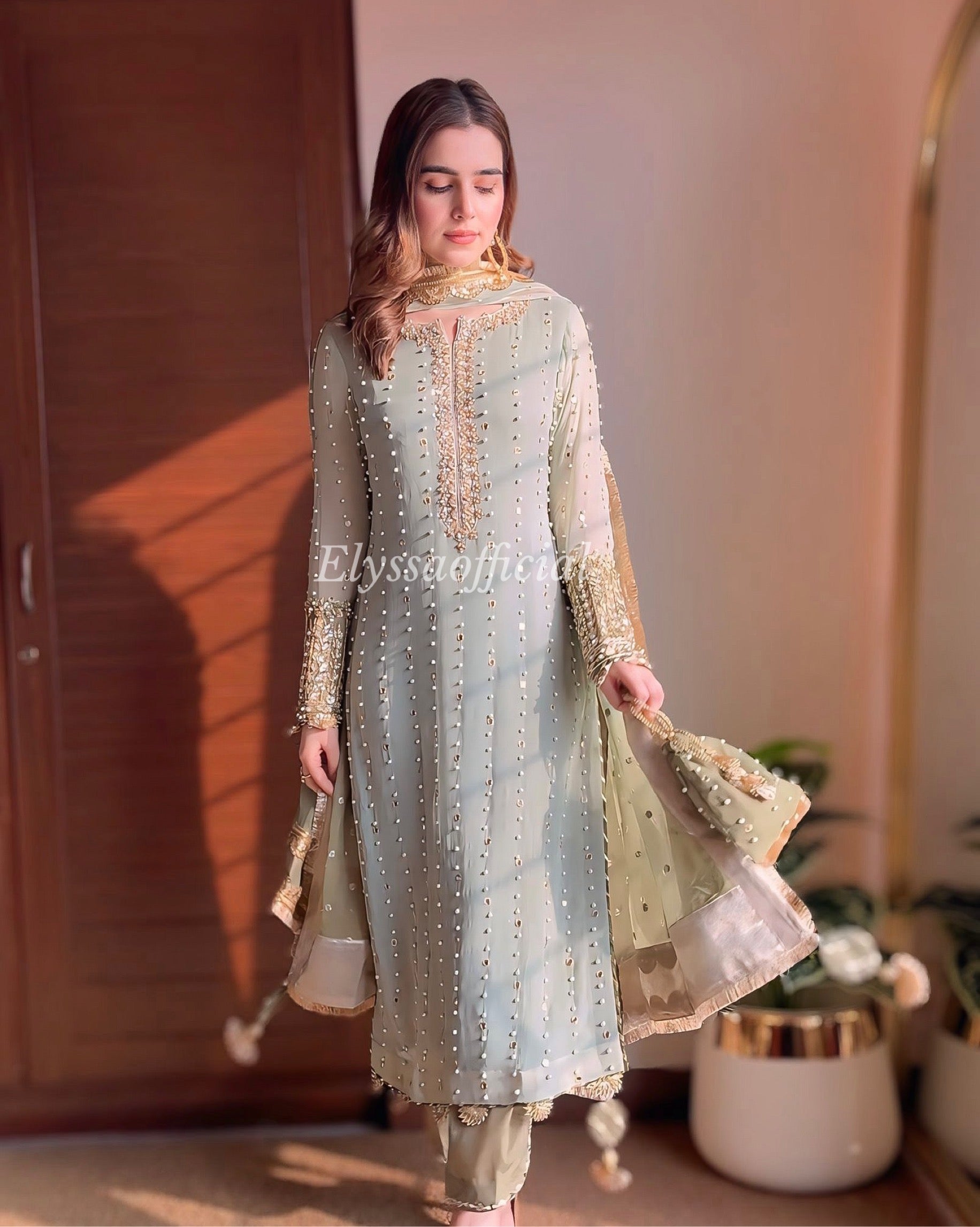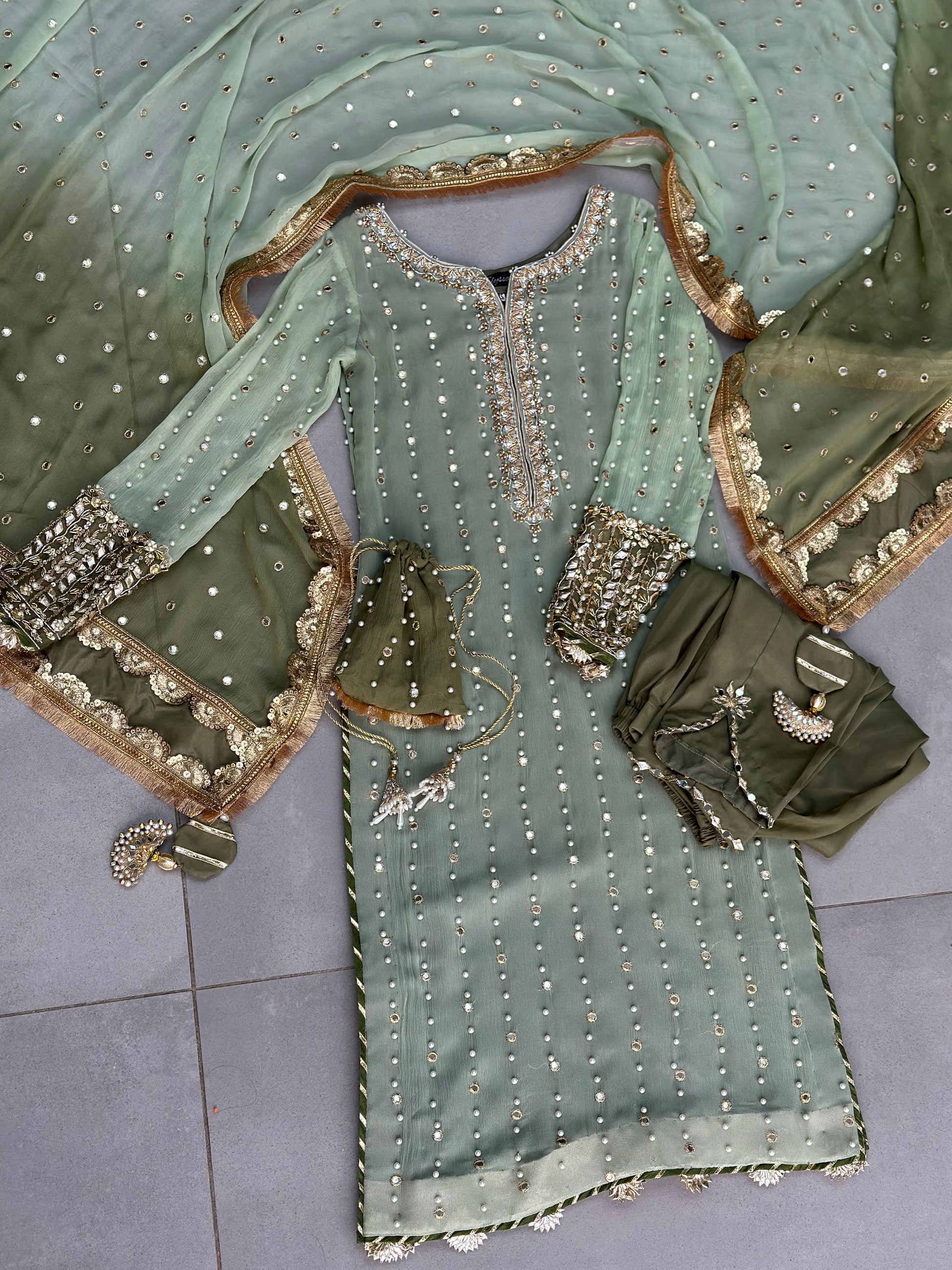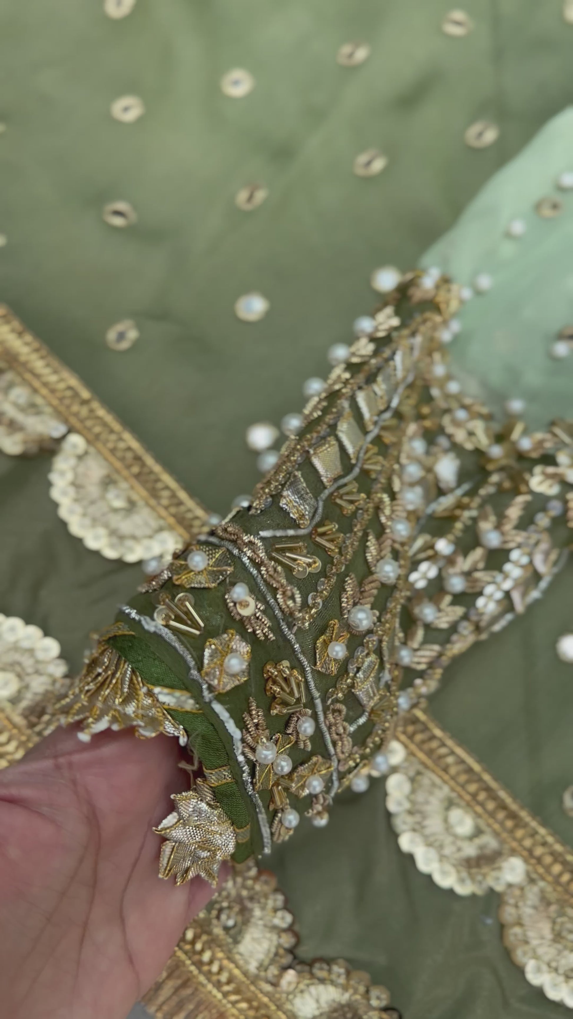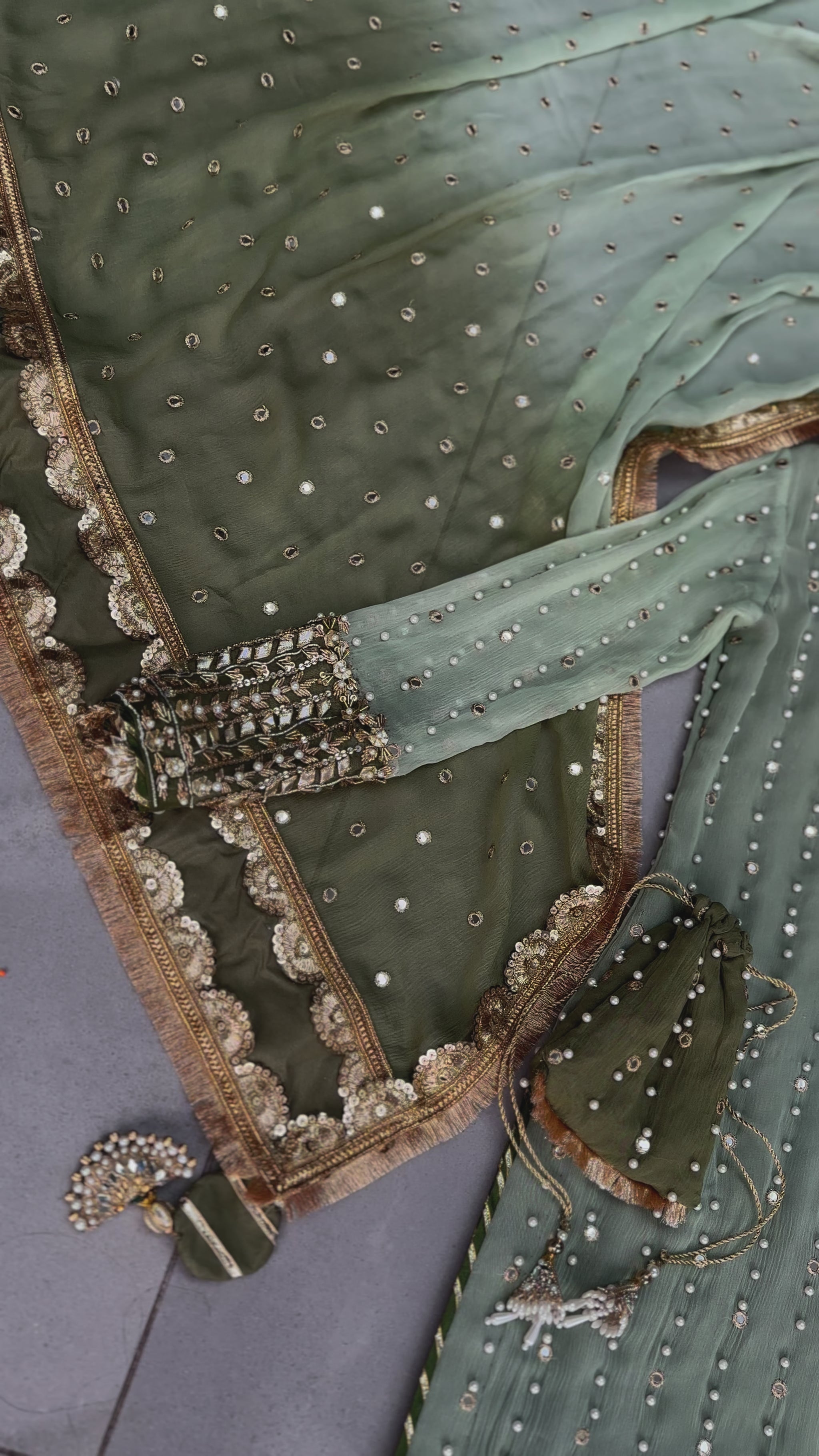 This suit Colour is a sage mint with olive dusky contrast touches.. Stunning unique combination