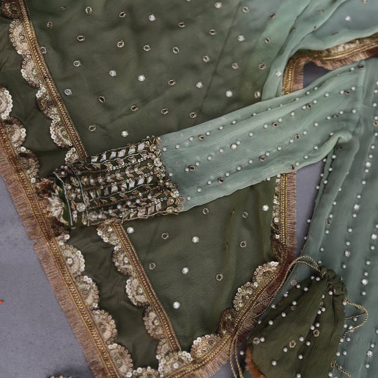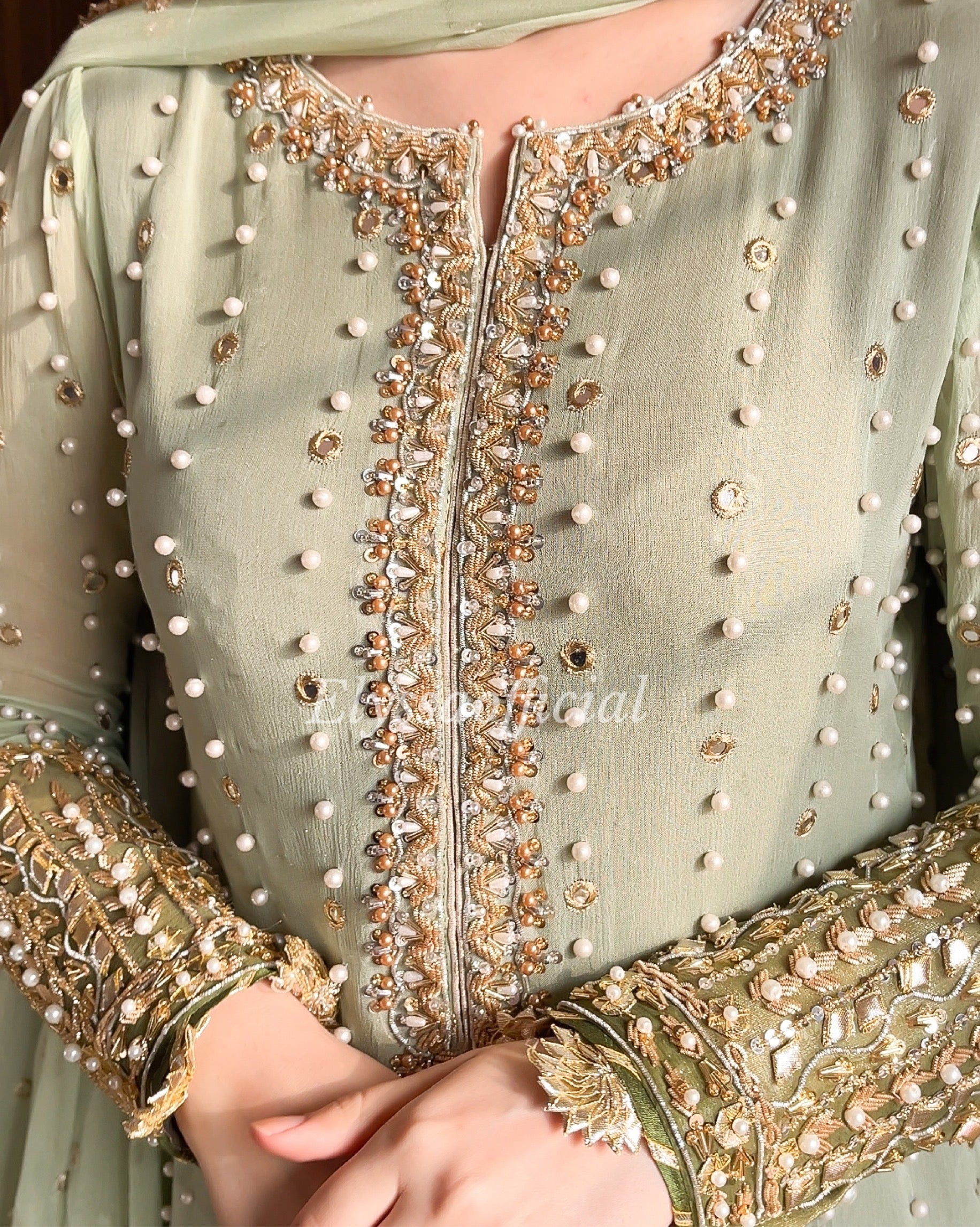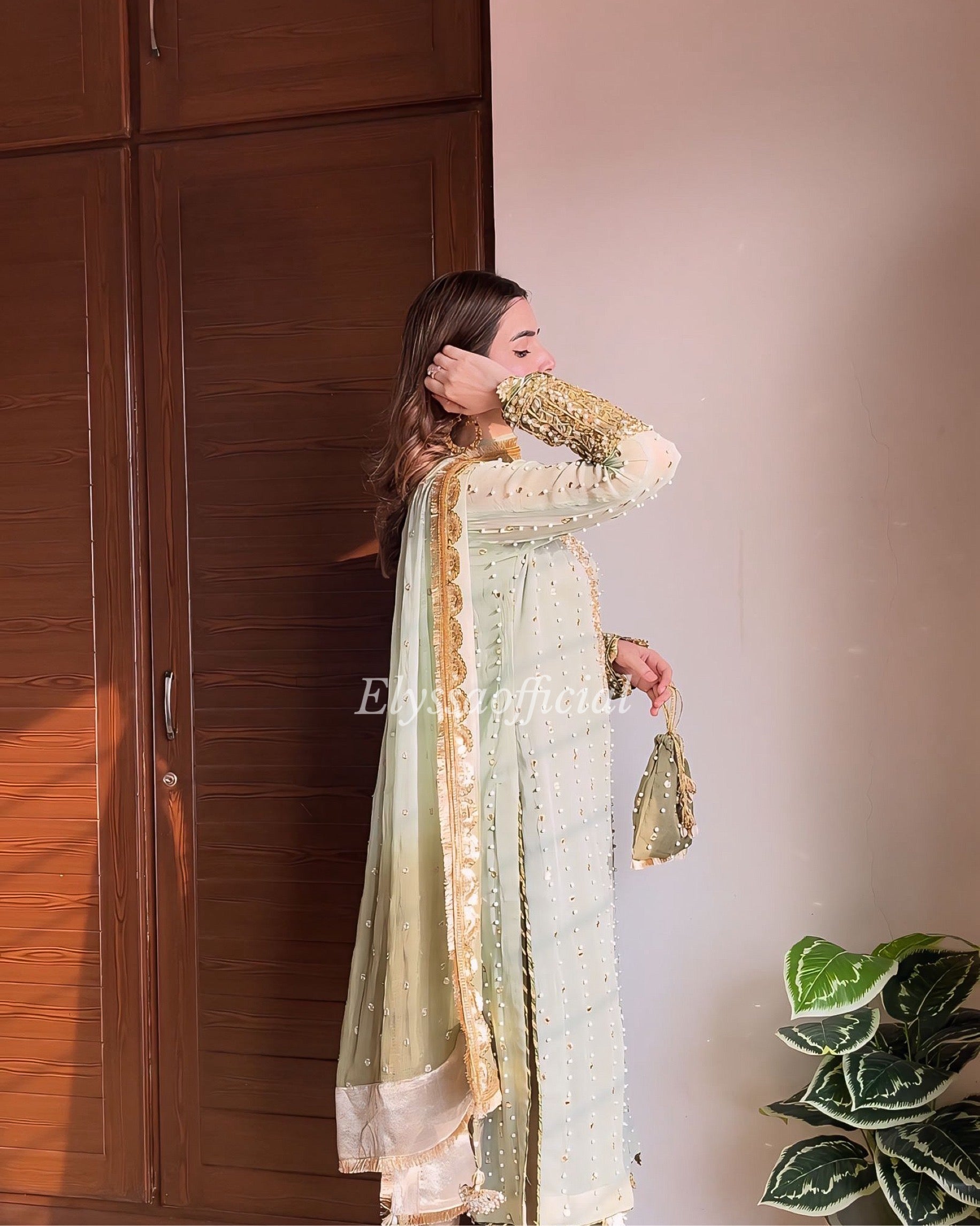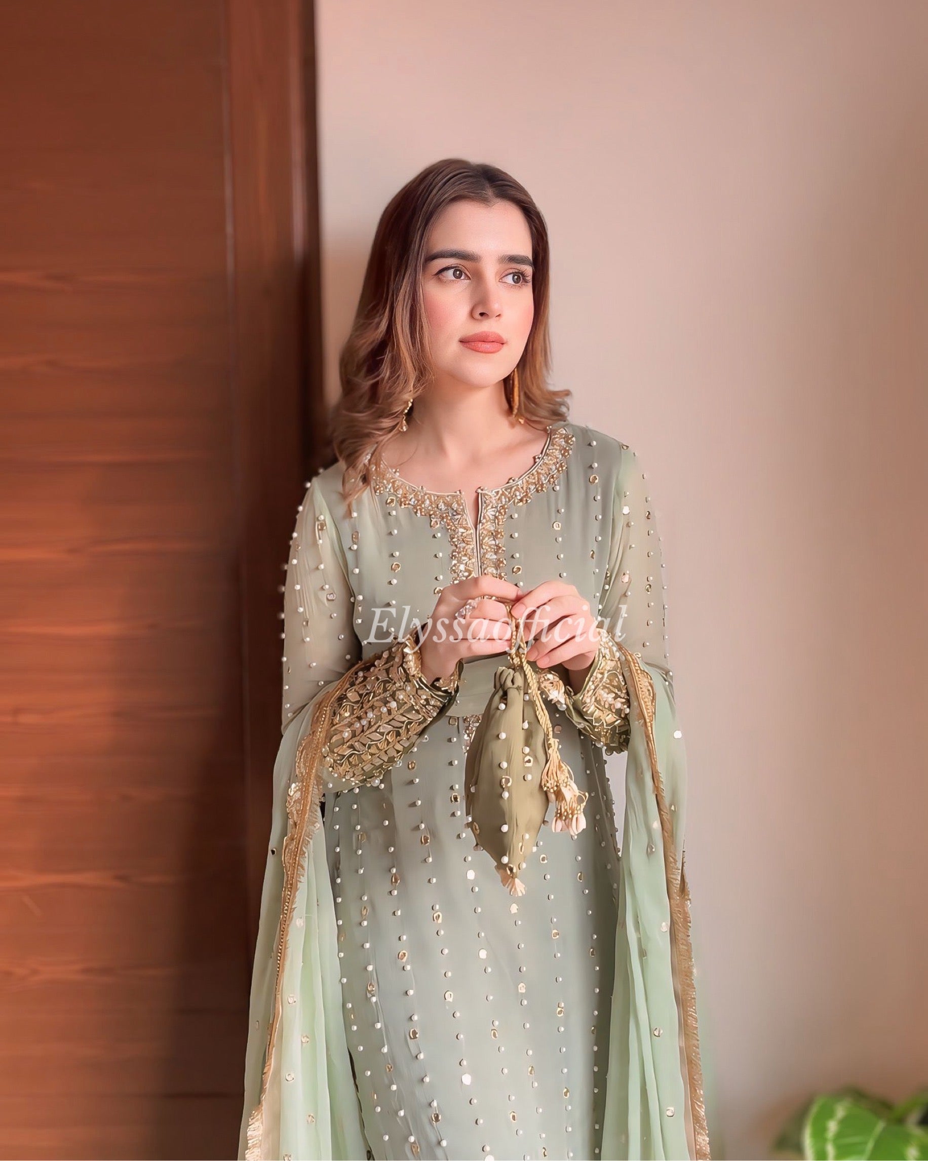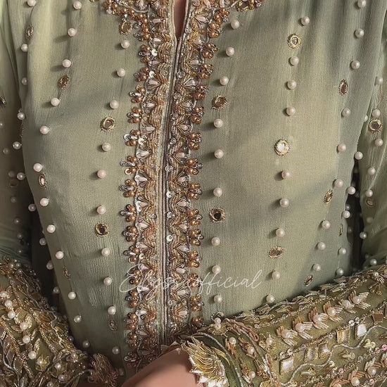 This suit Colour is a sage mint with olive dusky contrast touches.. Stunning unique combination