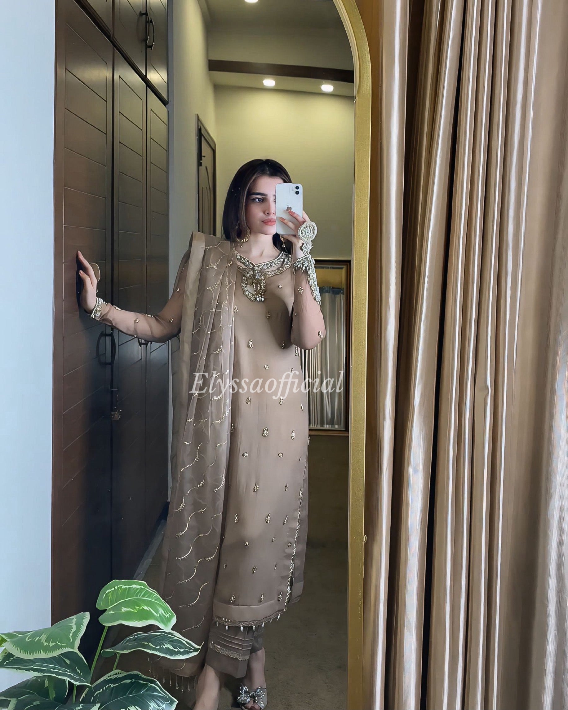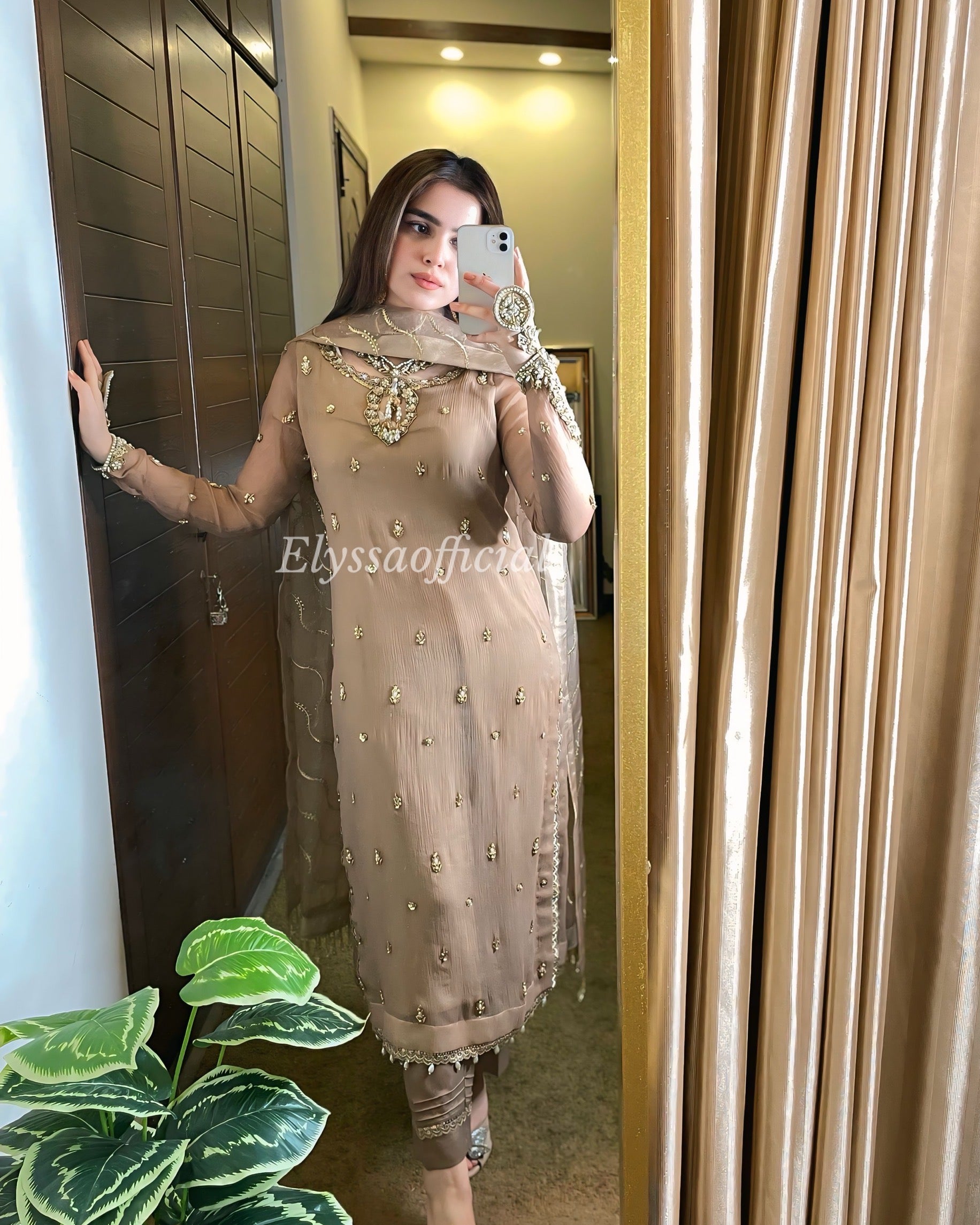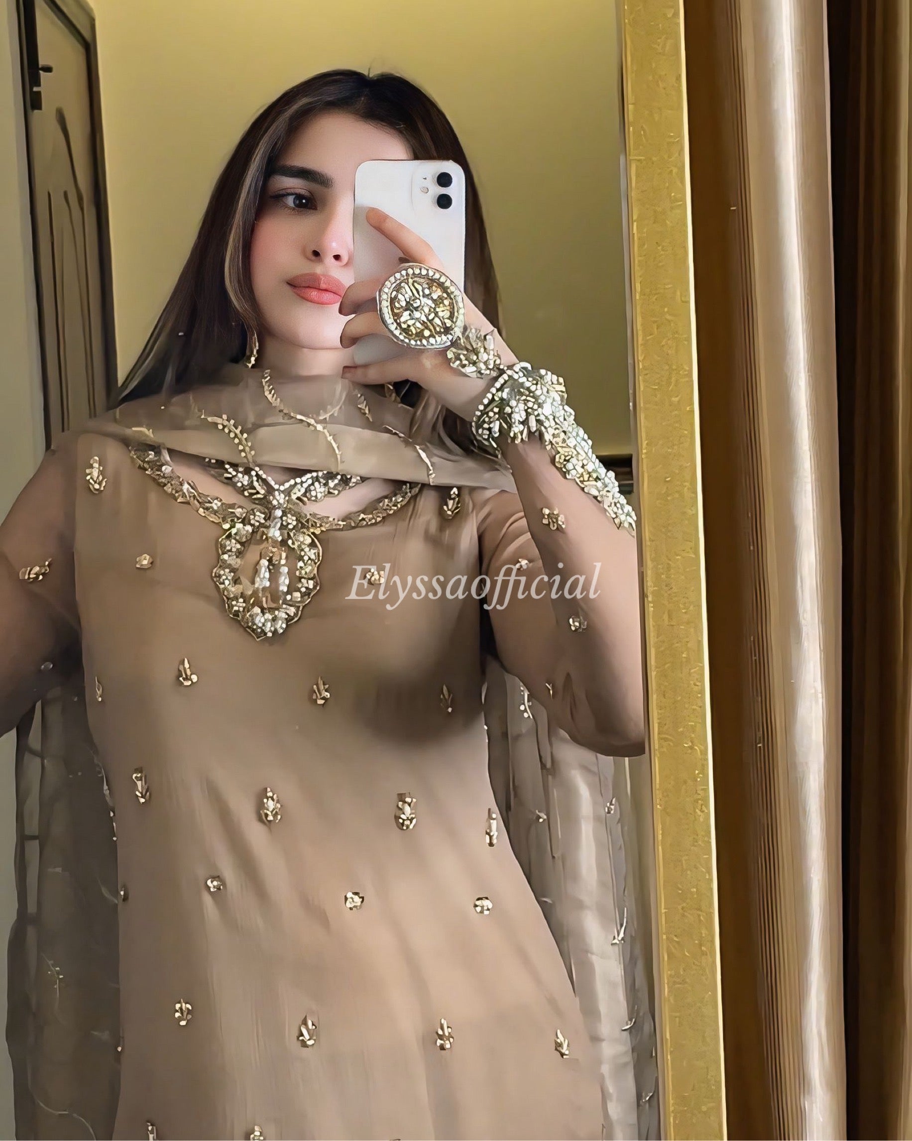 Full of heavy handwork, the neck is stylish and has Cutwork with a motif and dangling handmade tassel. The shirt is full of small booti motif work all across, making this a heavy design