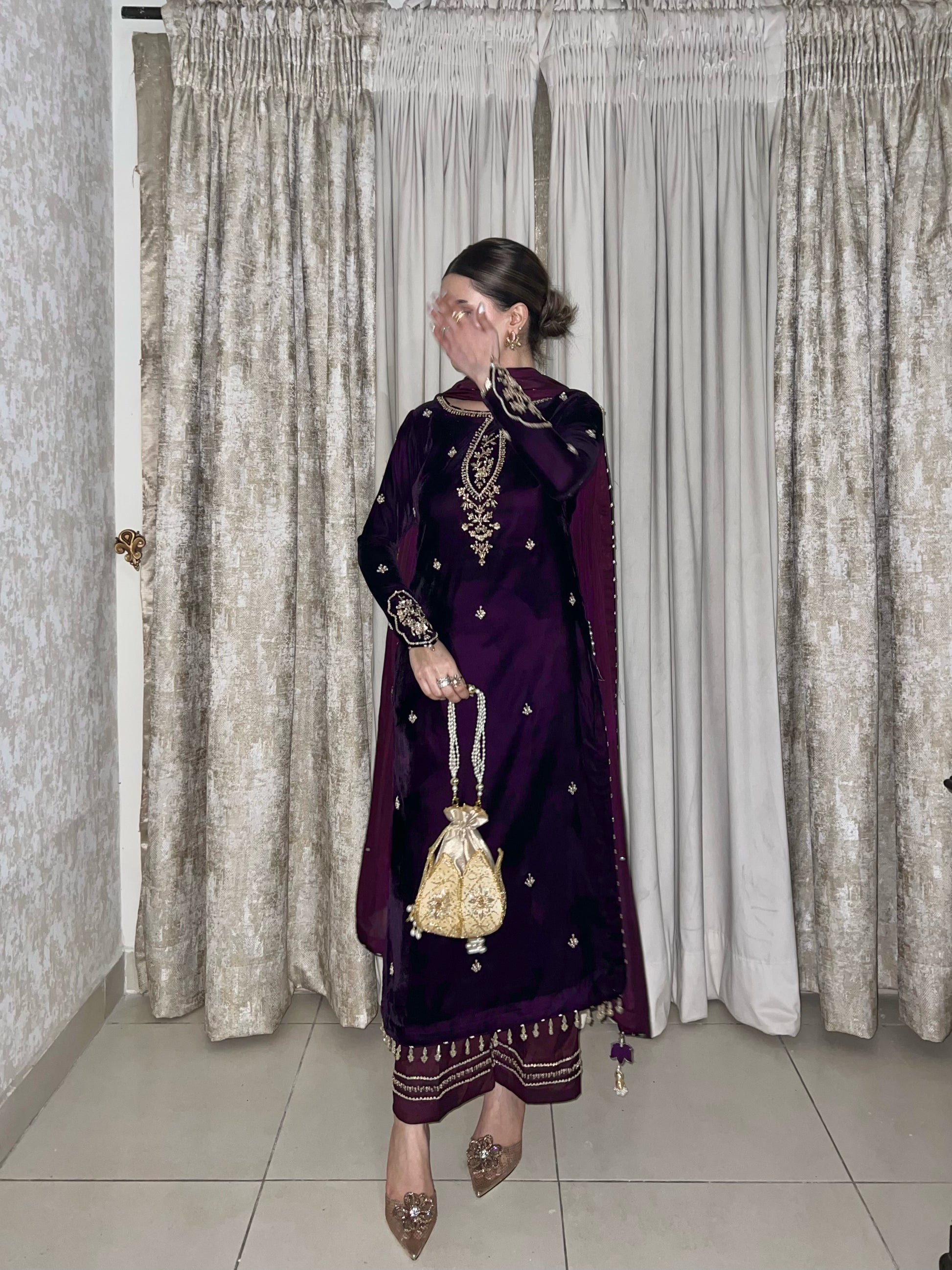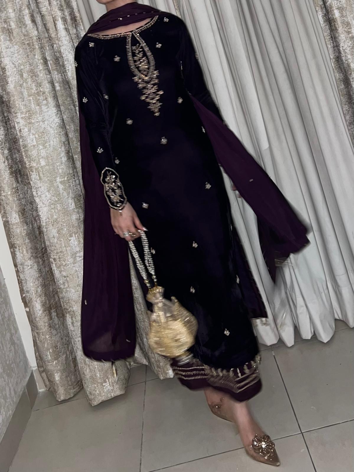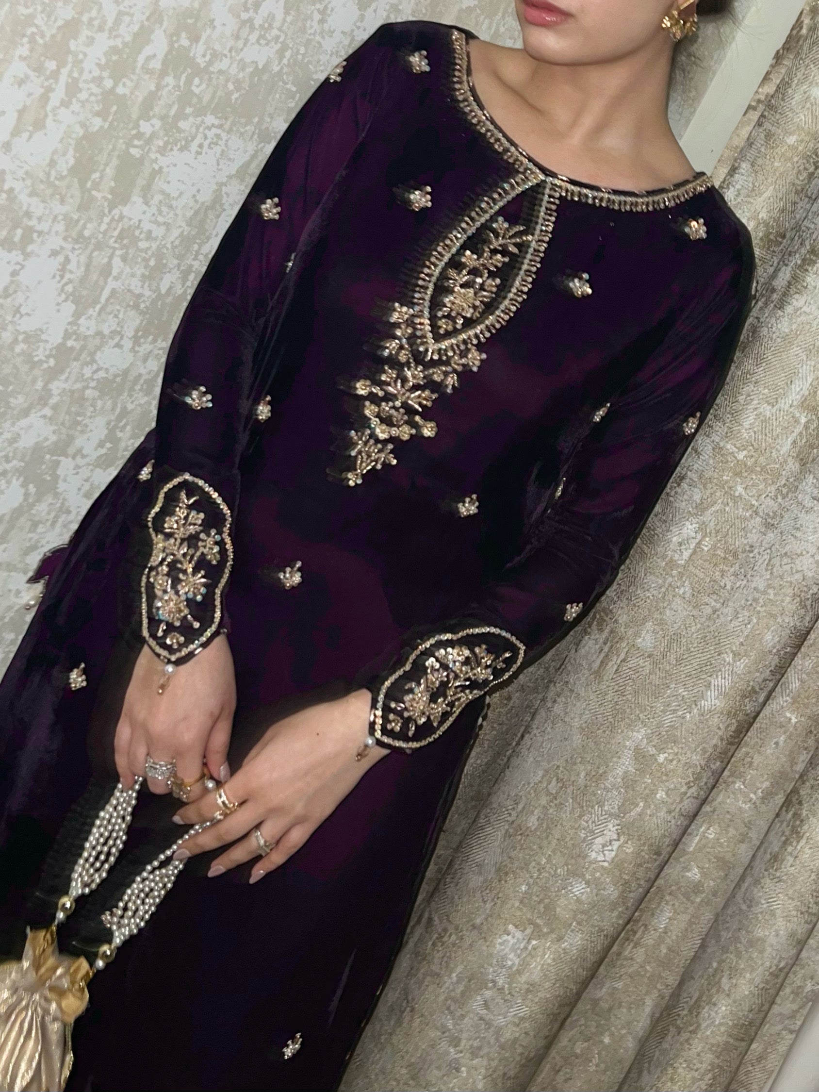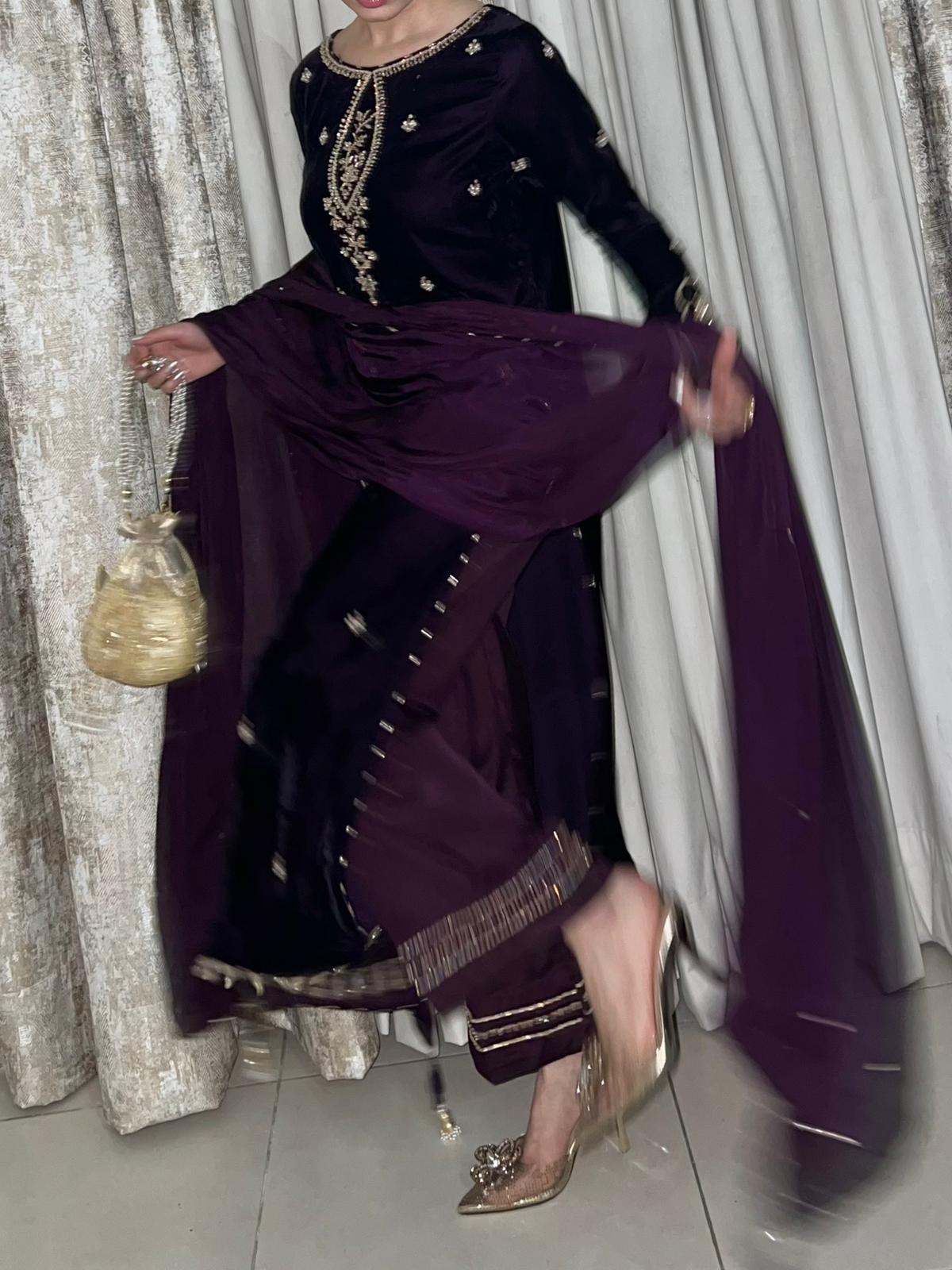 Dark deep purple velvet shirt with simple but bold sleeves work. beautiful long heavy work neckline and our signature side chaak tassles