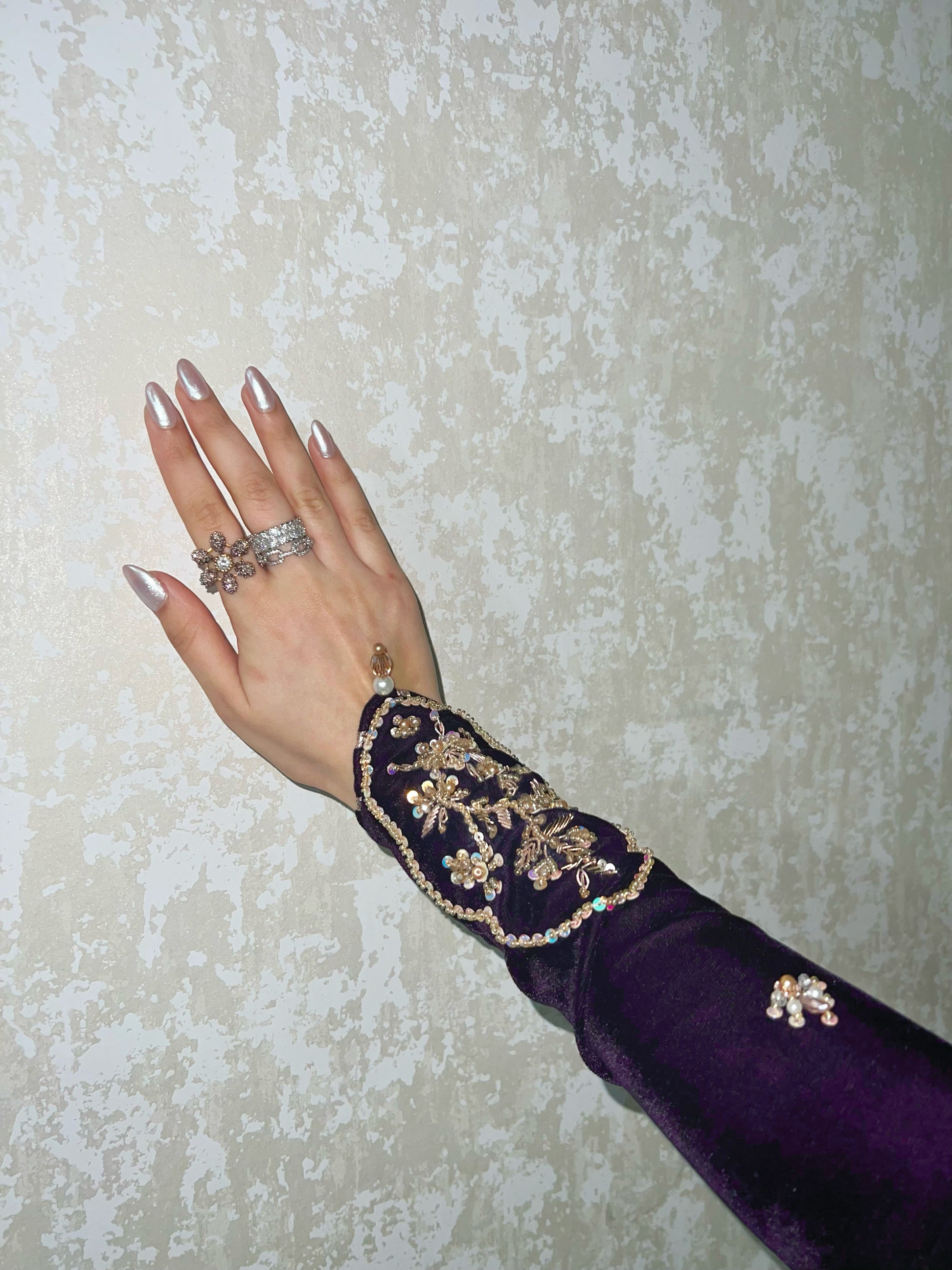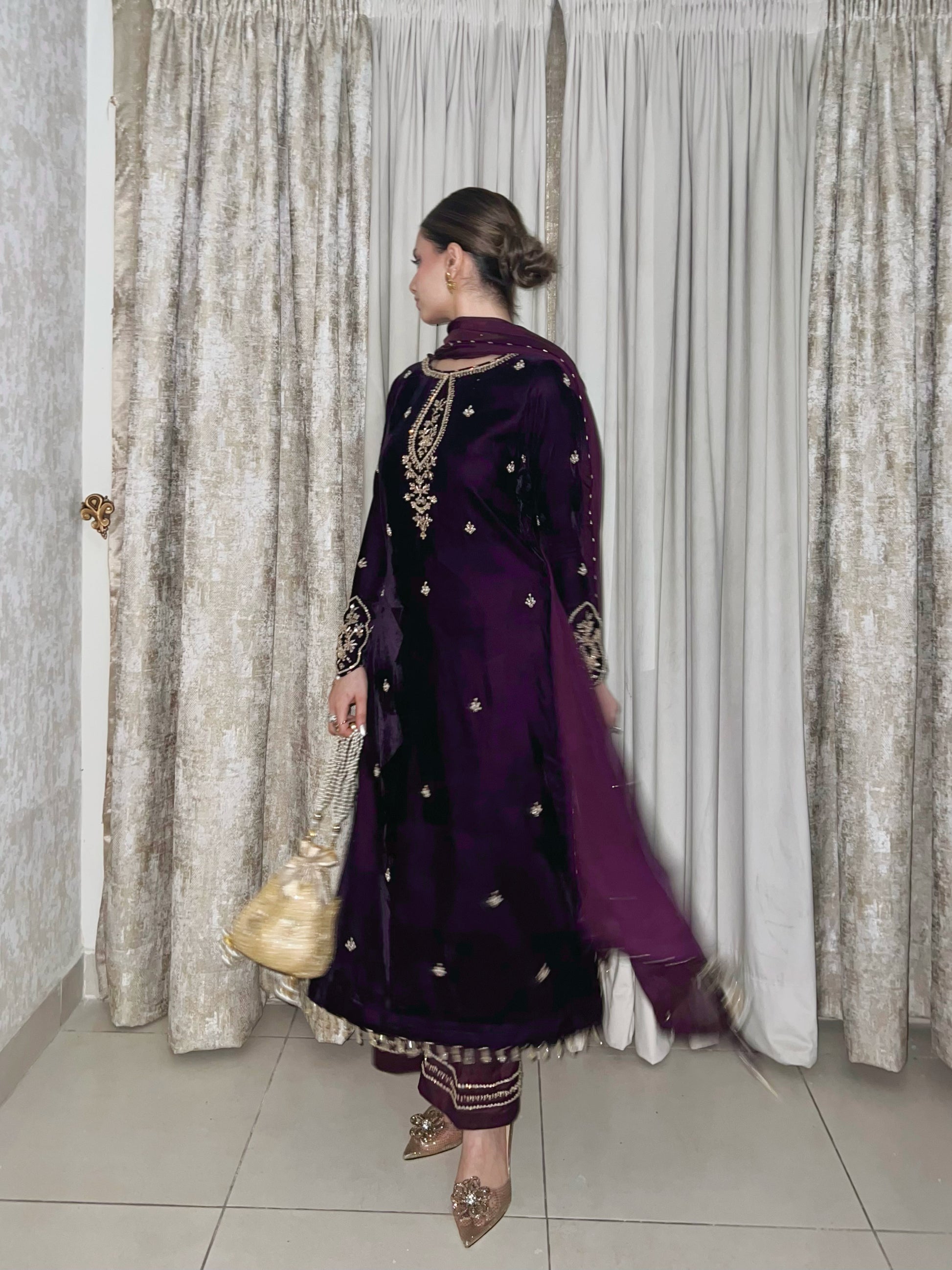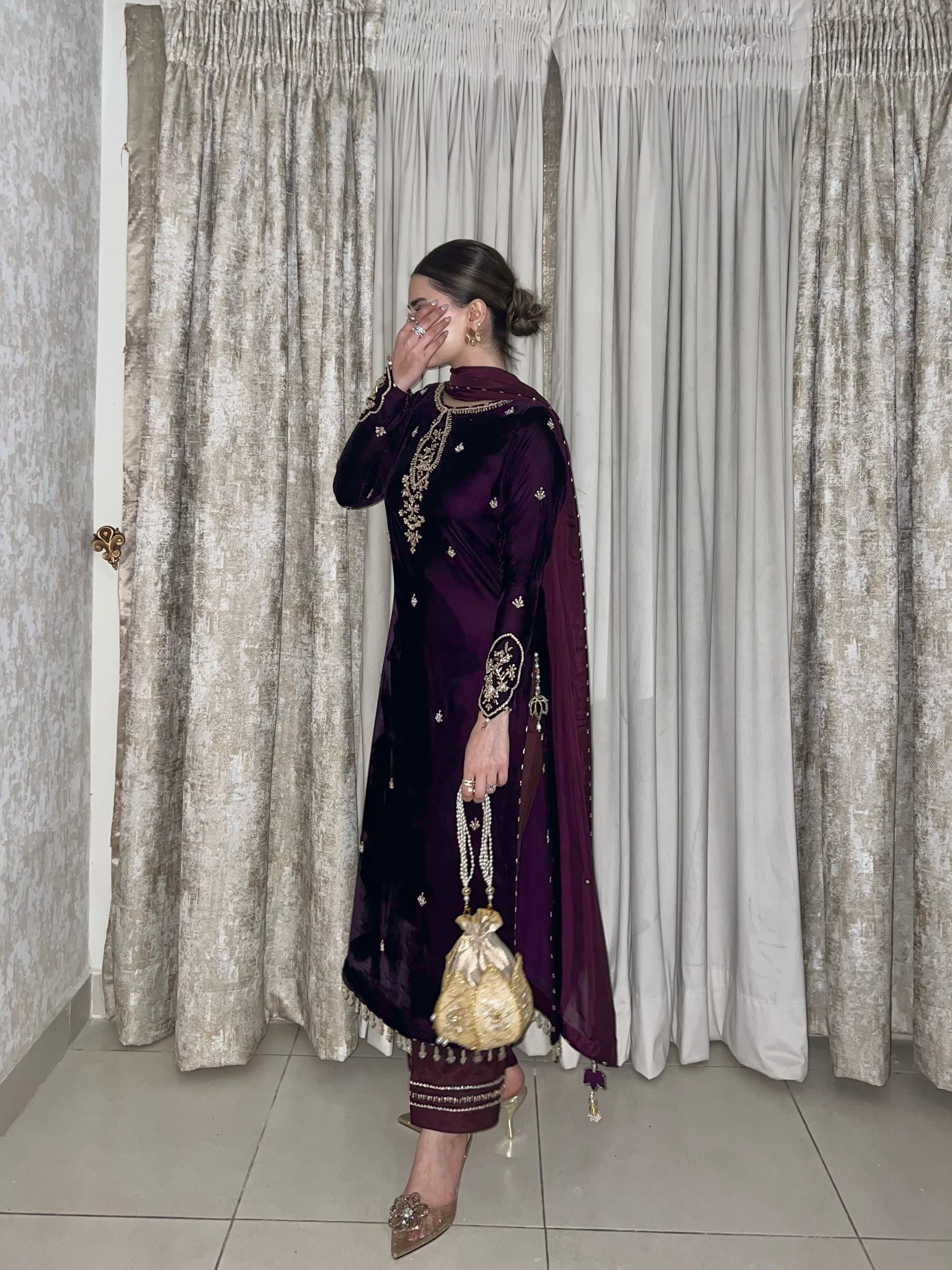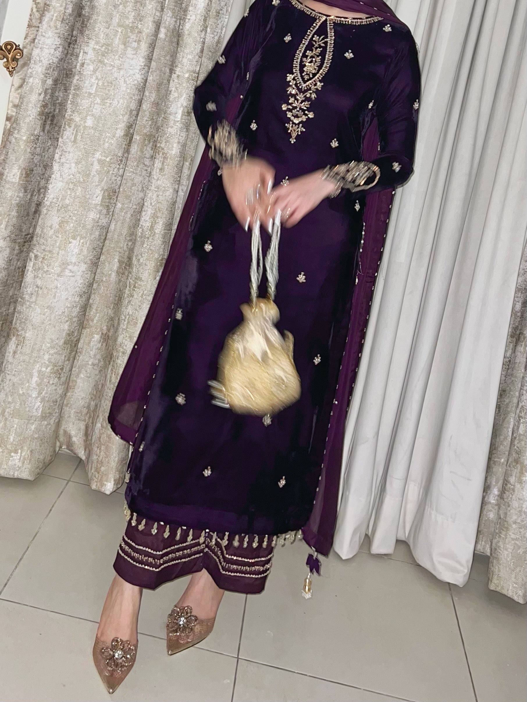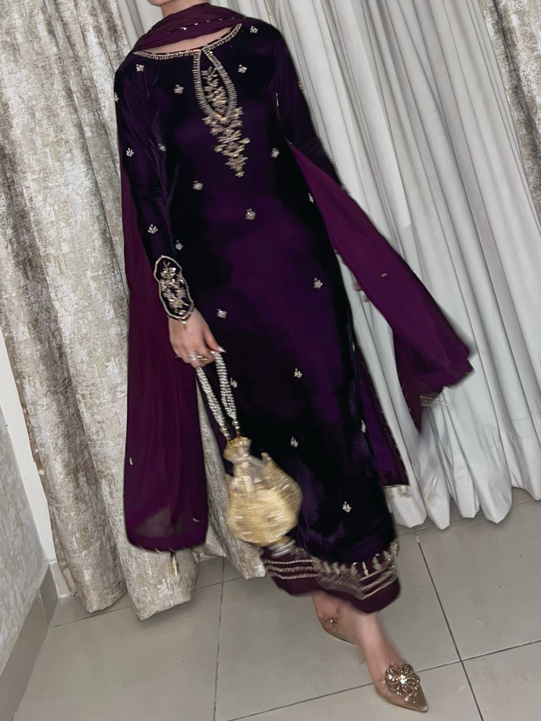 Dark deep purple velvet shirt with simple but bold sleeves work. beautiful long heavy work neckline and our signature side chaak tassles