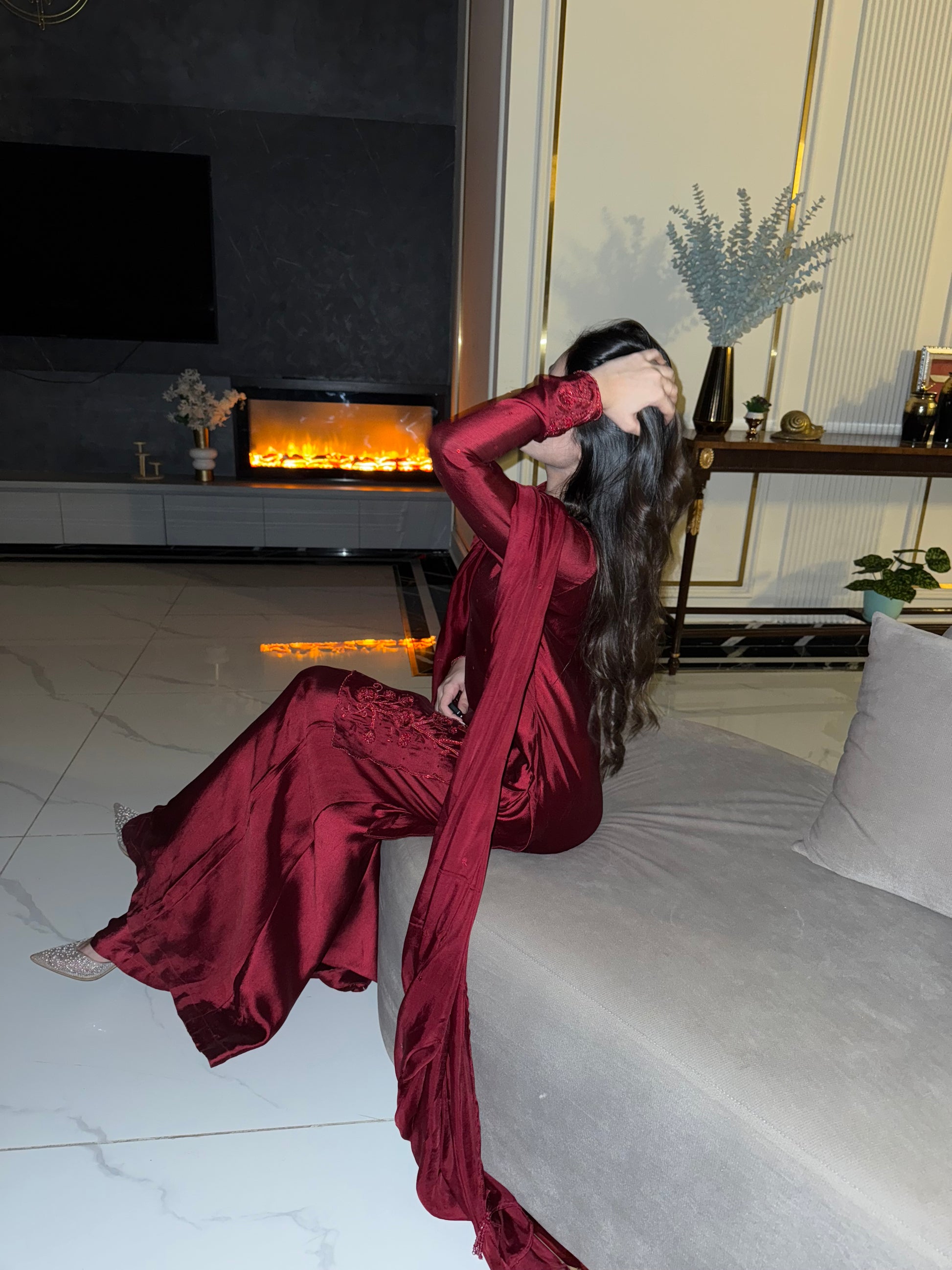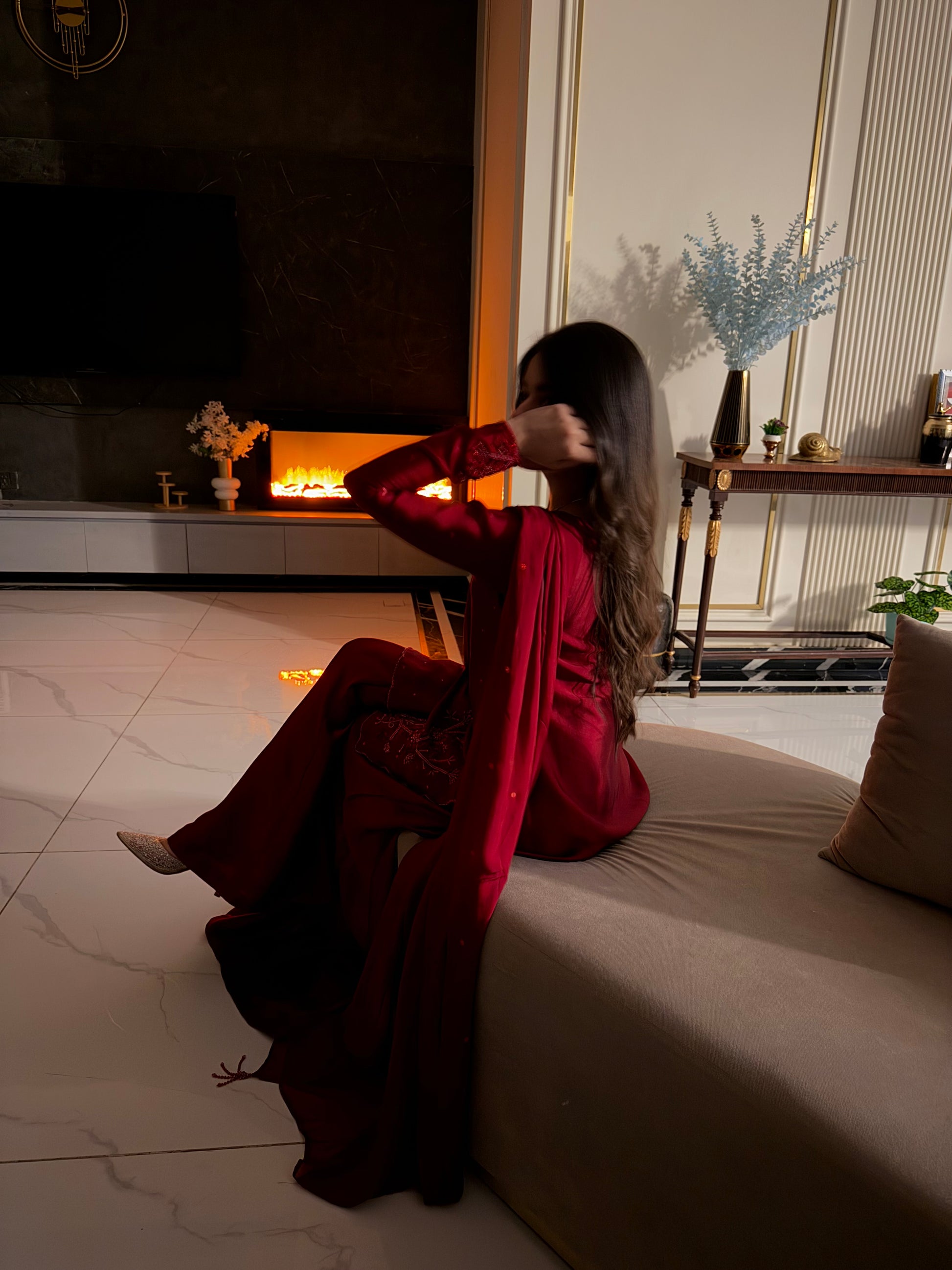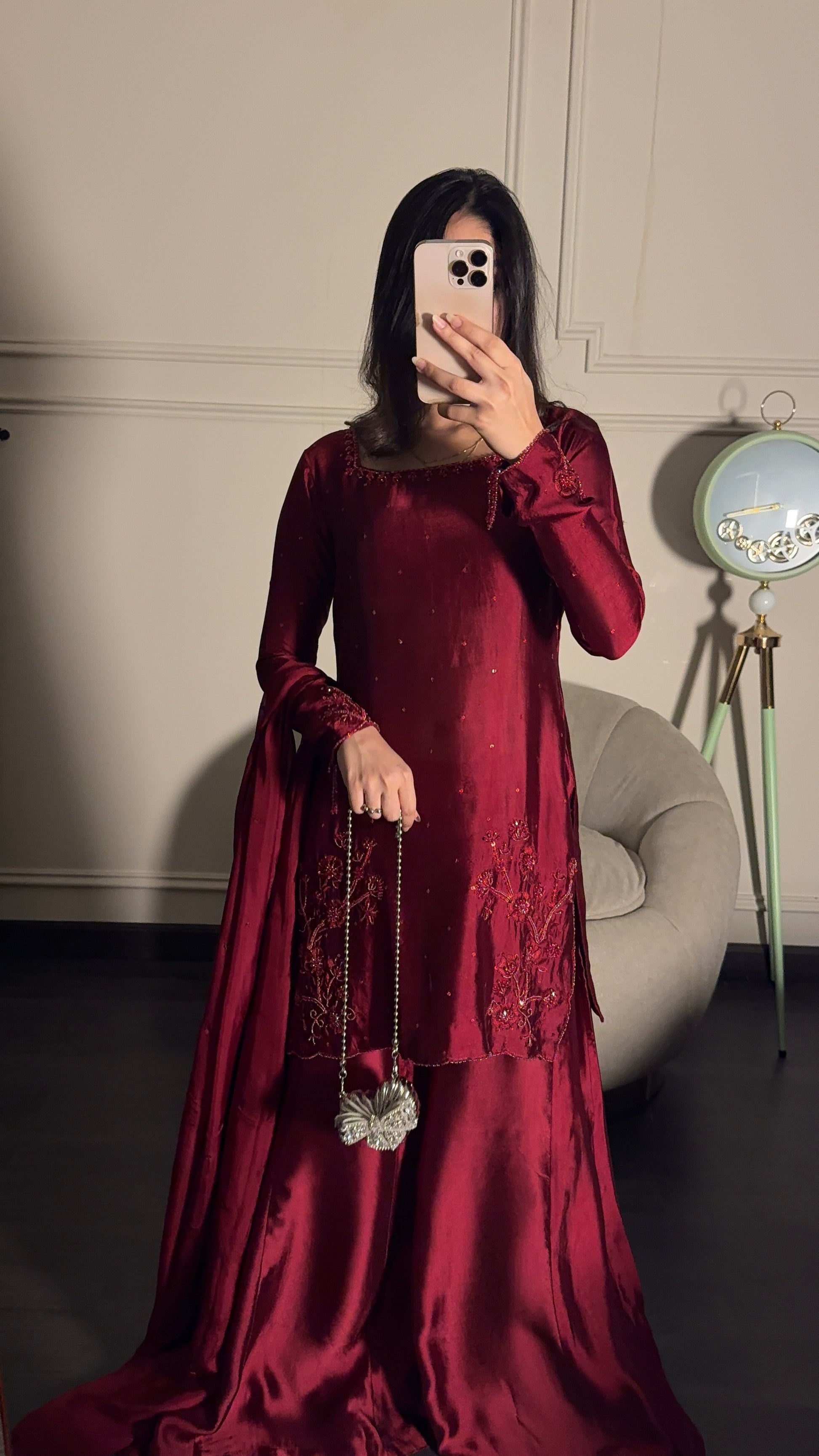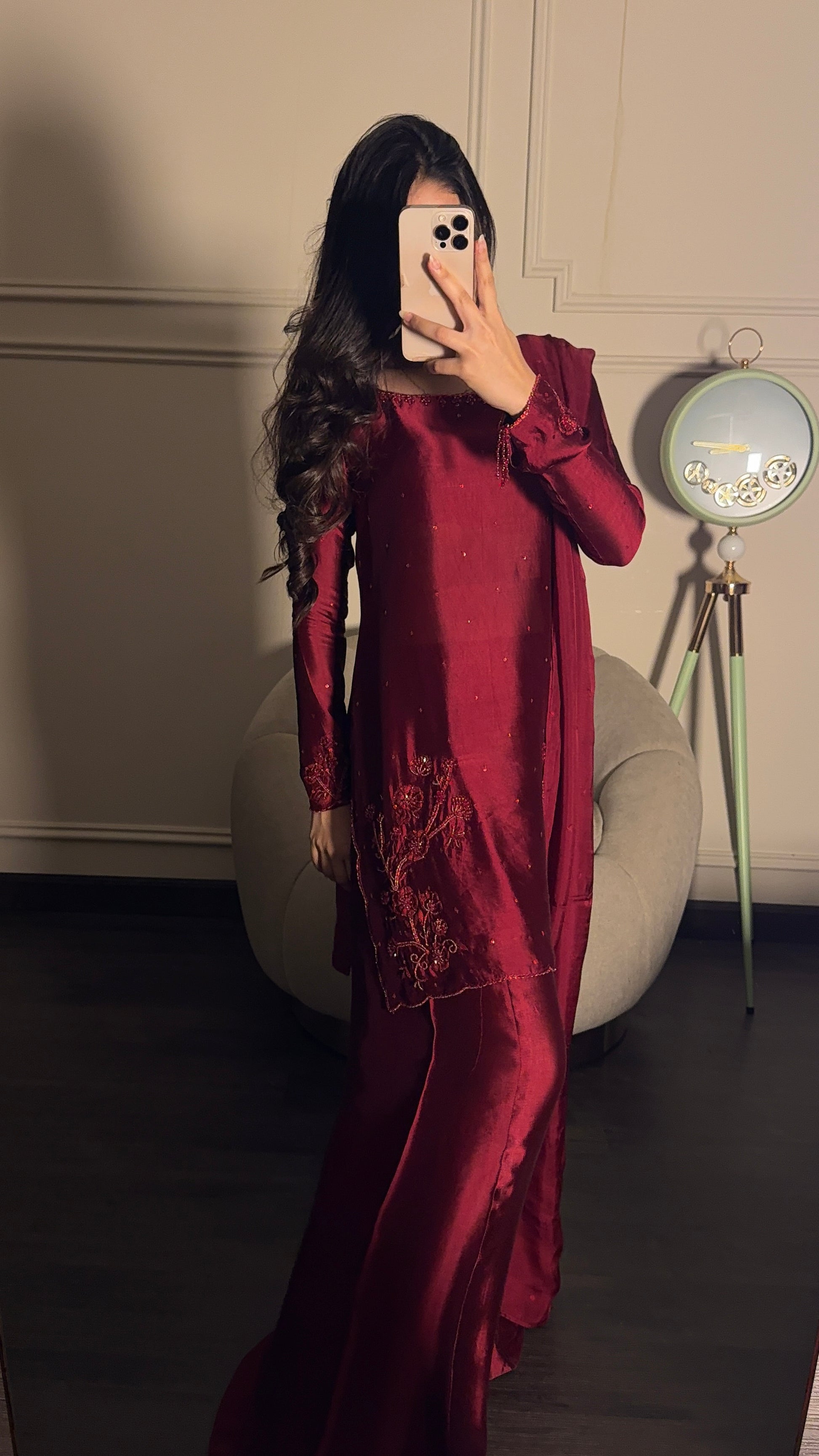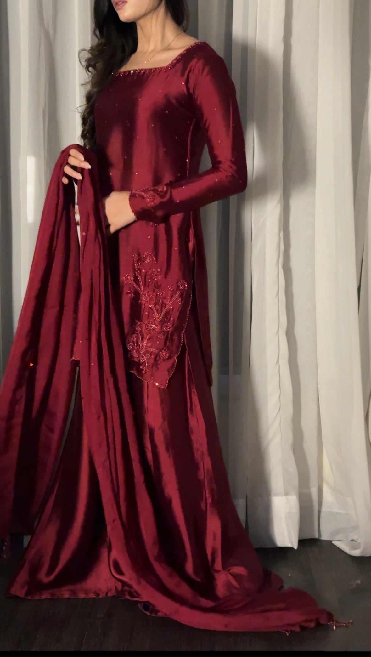 The perfect deep shade of red on a rich silk soft flowy fabric. The red on red handwork, the square neckline and the red tassles on sleeves. All trending and super pretty 😍