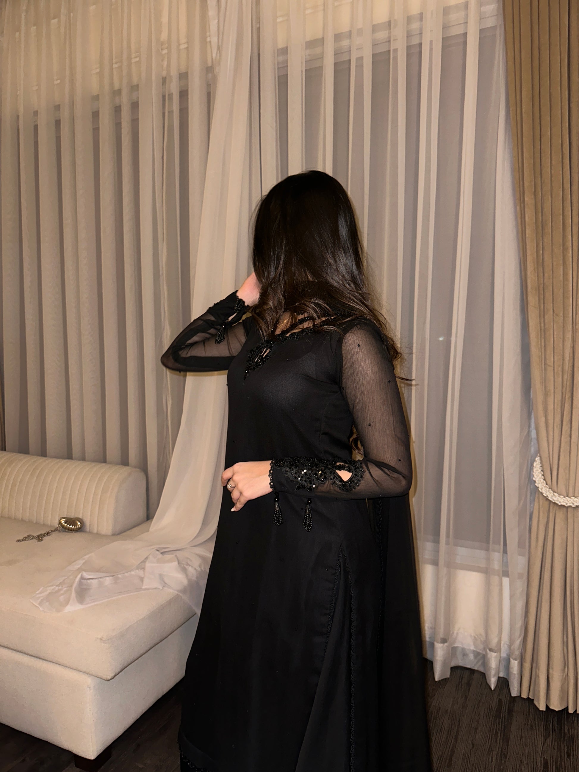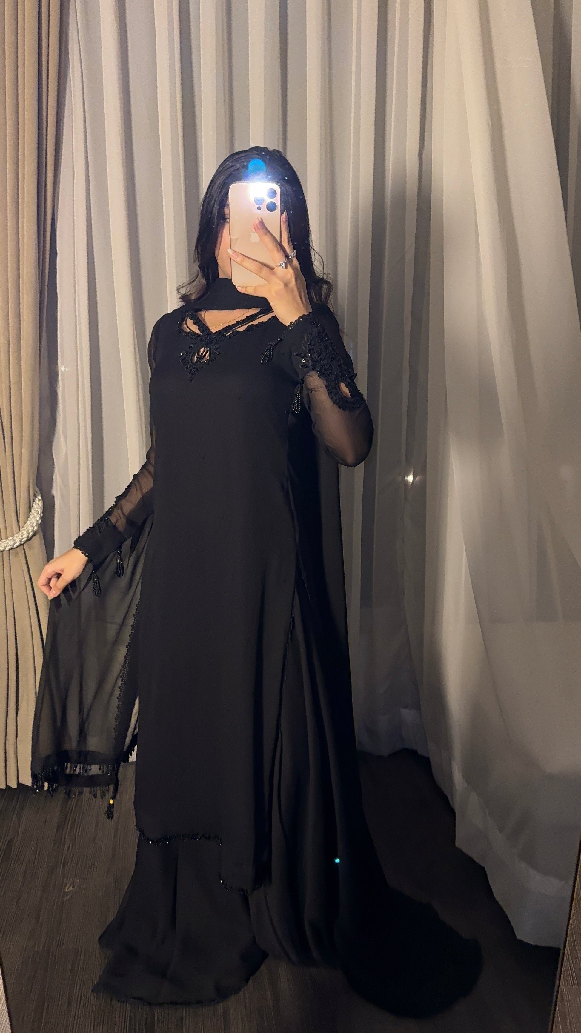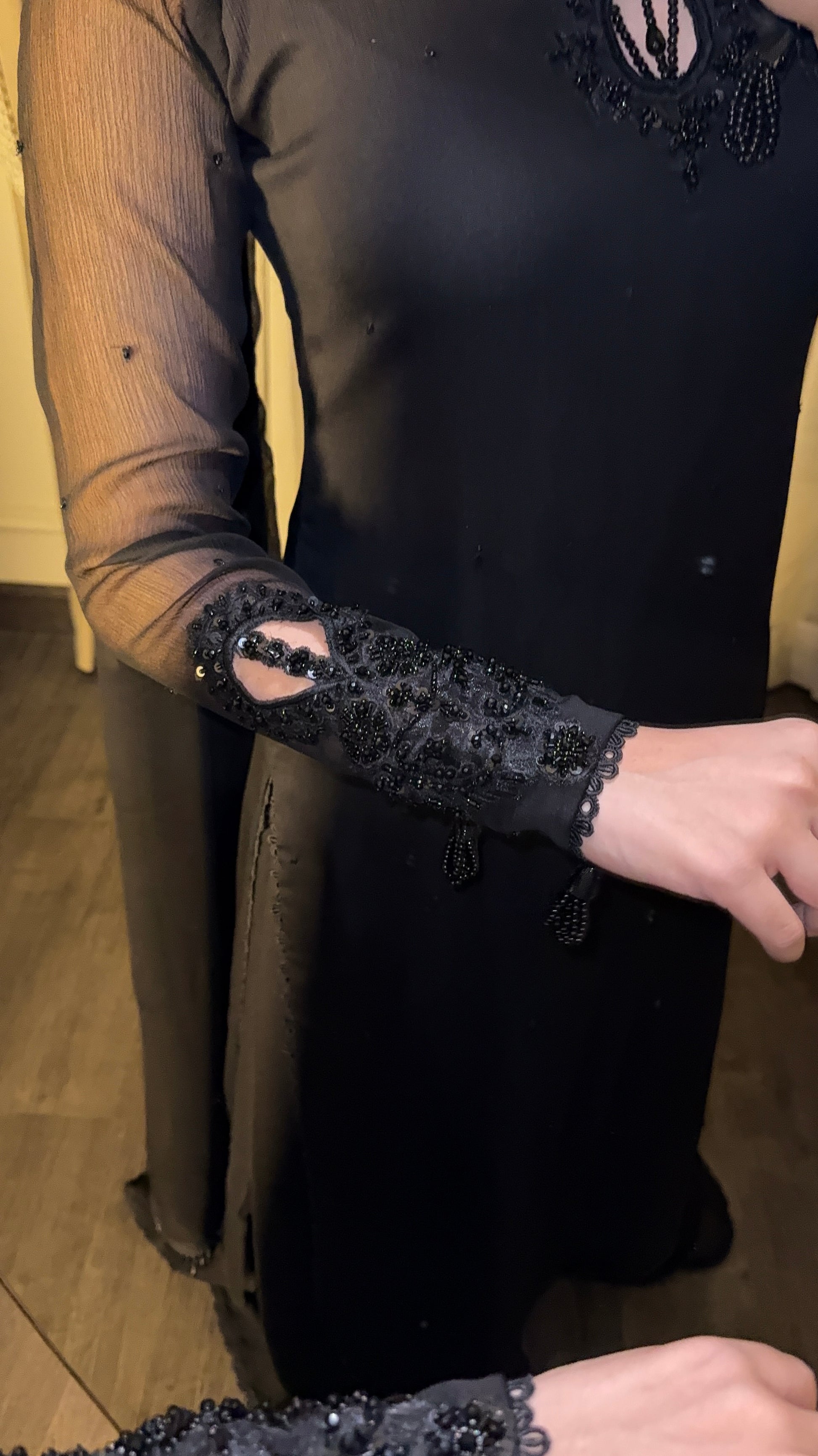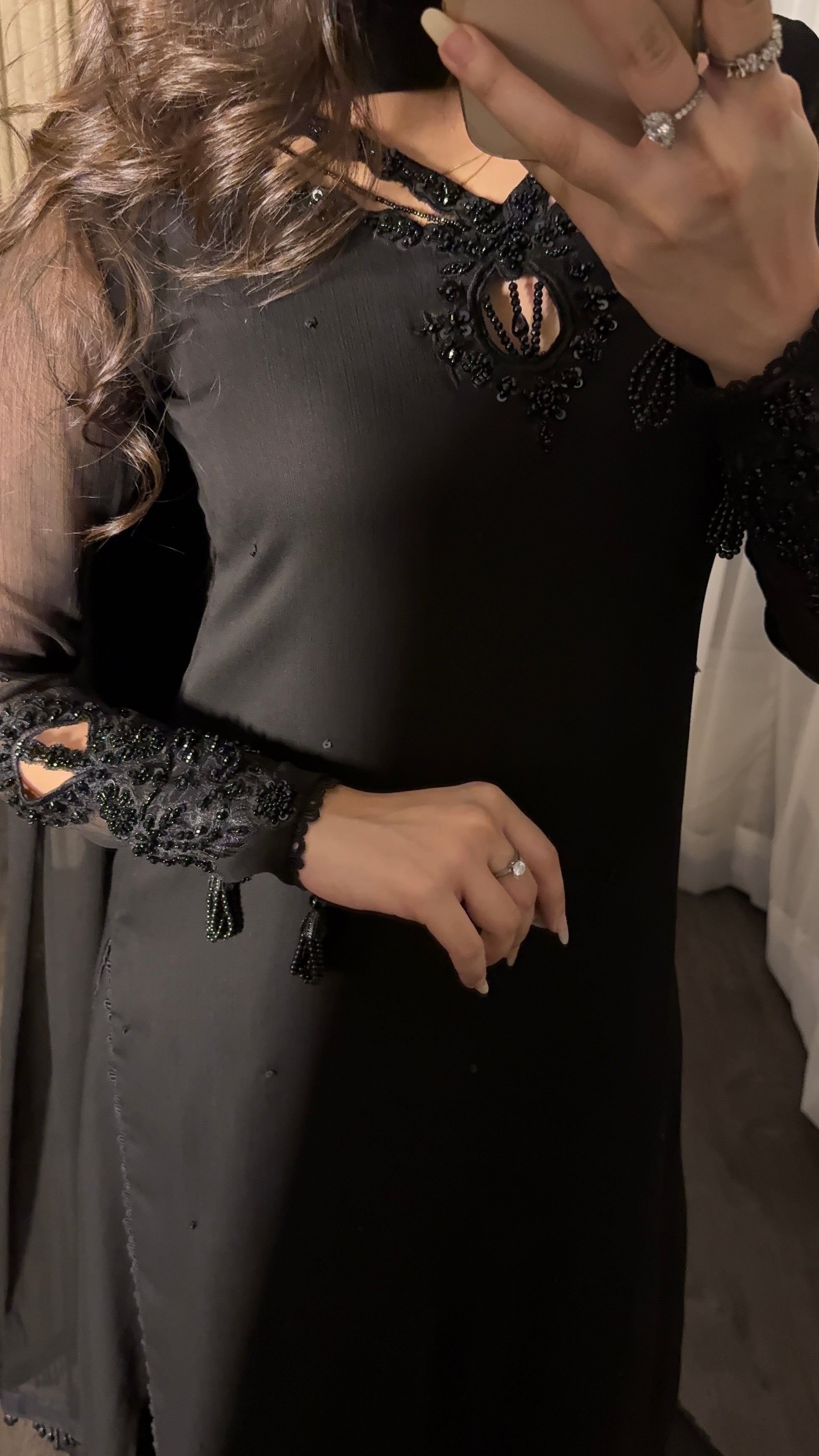 Black on black beauty. beautiful chiffon shirt with all black Cutwork handwork neckline. bead detailing on keyhole and all cut works.