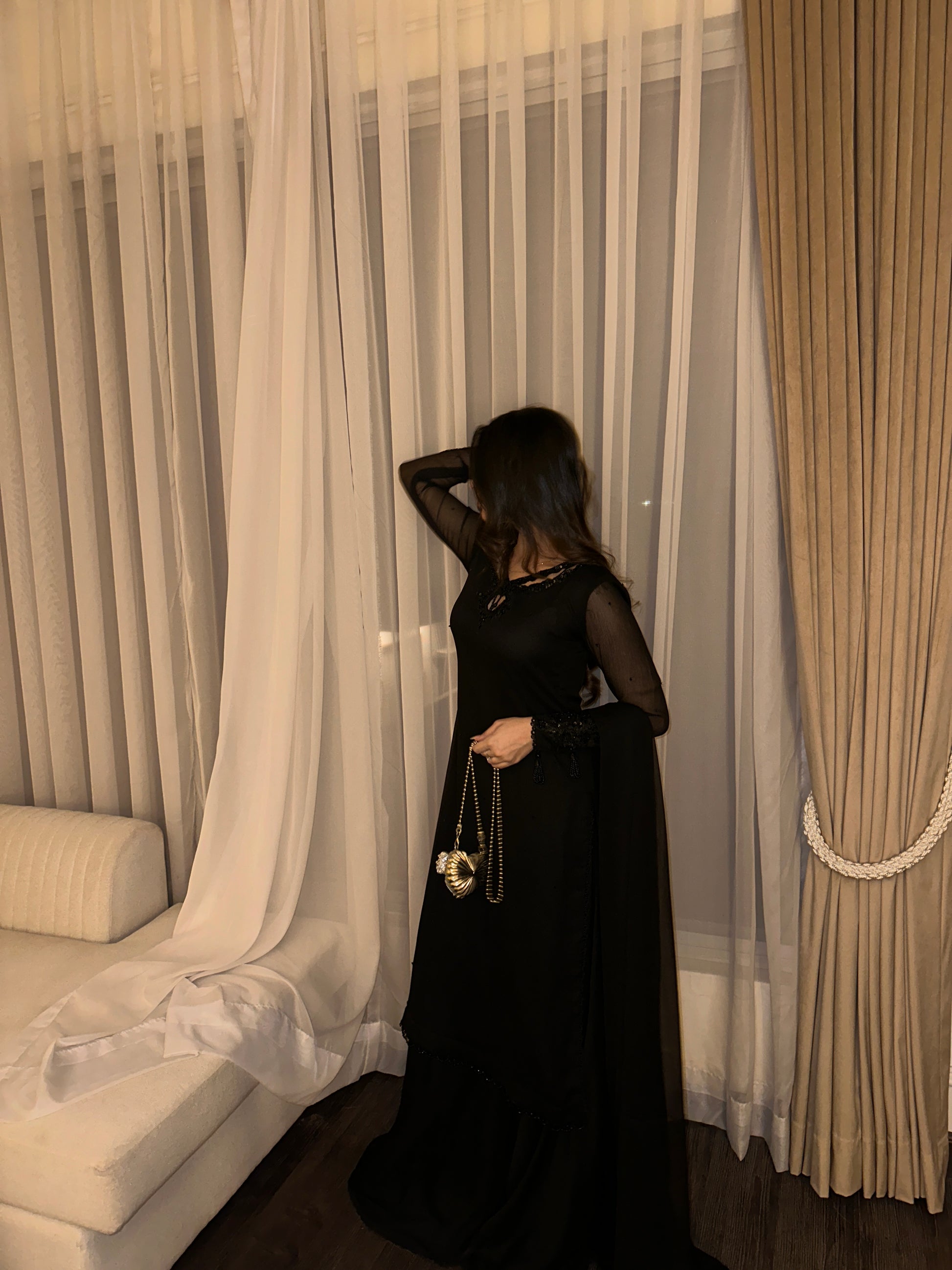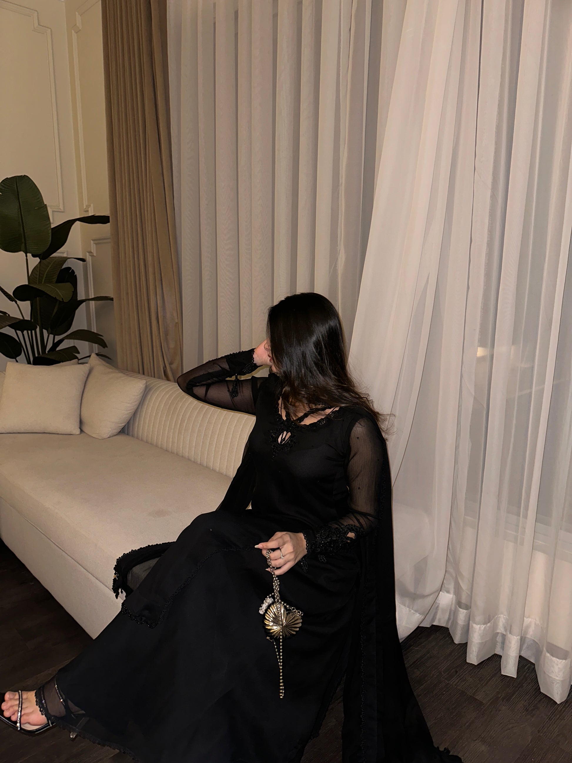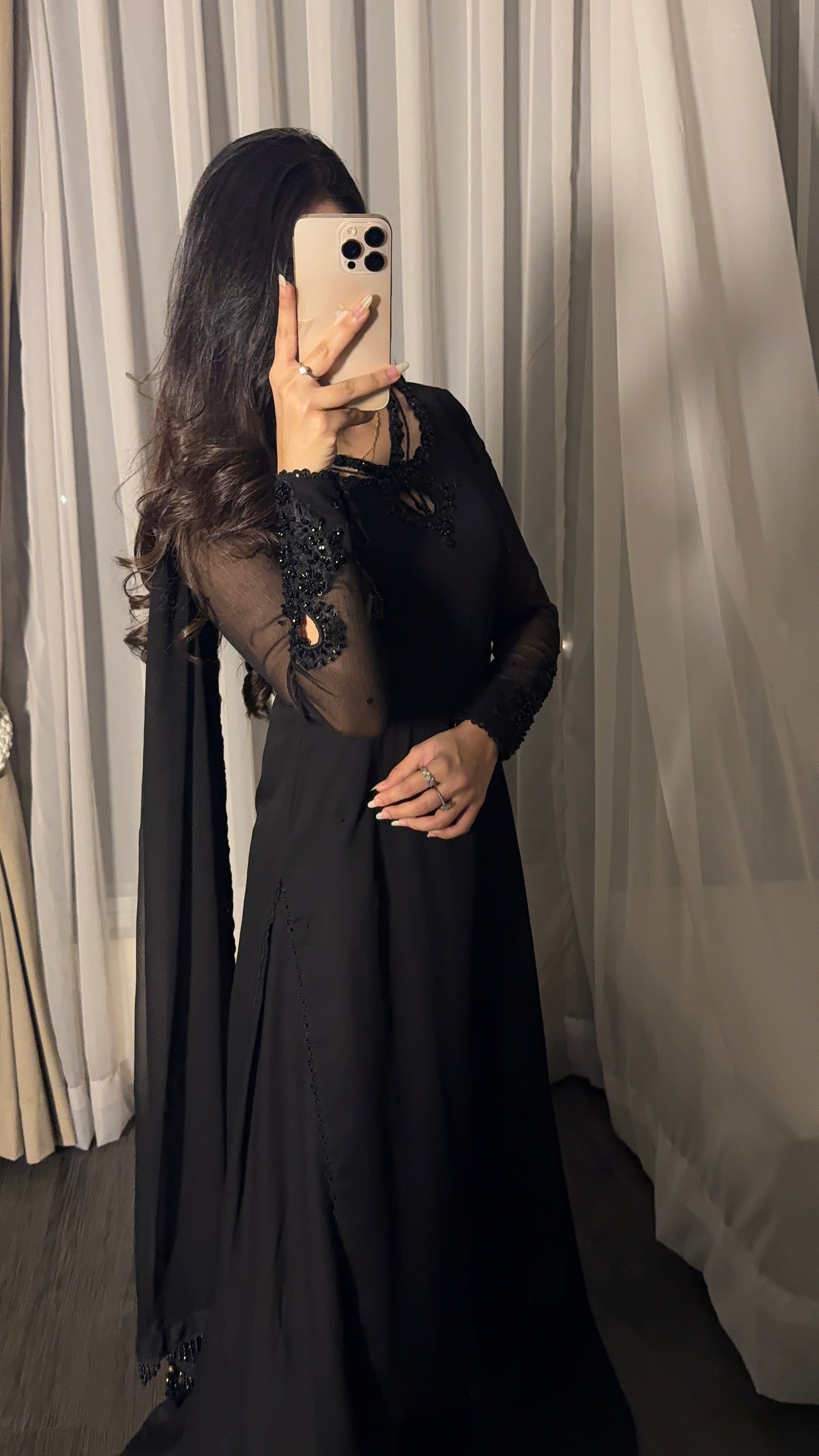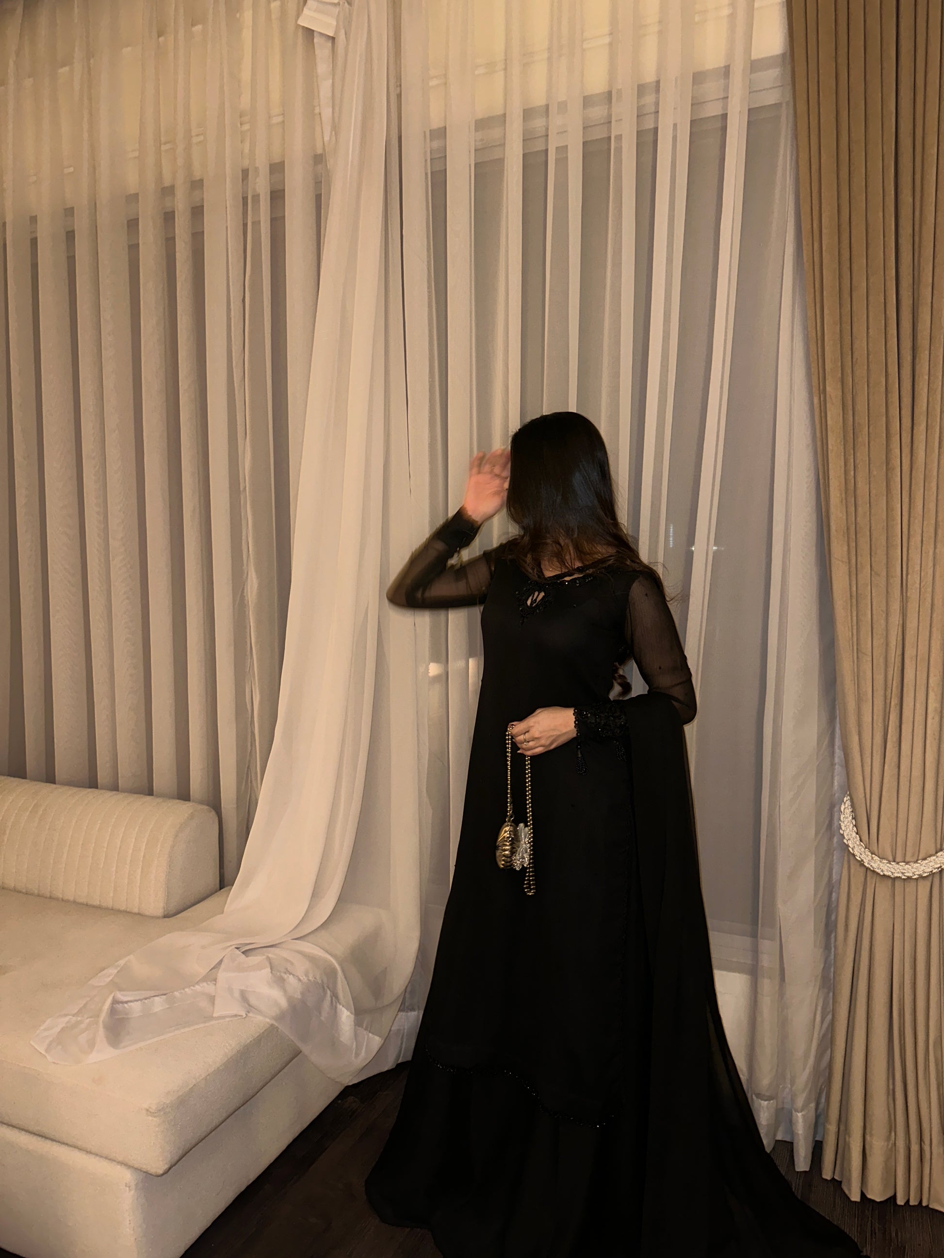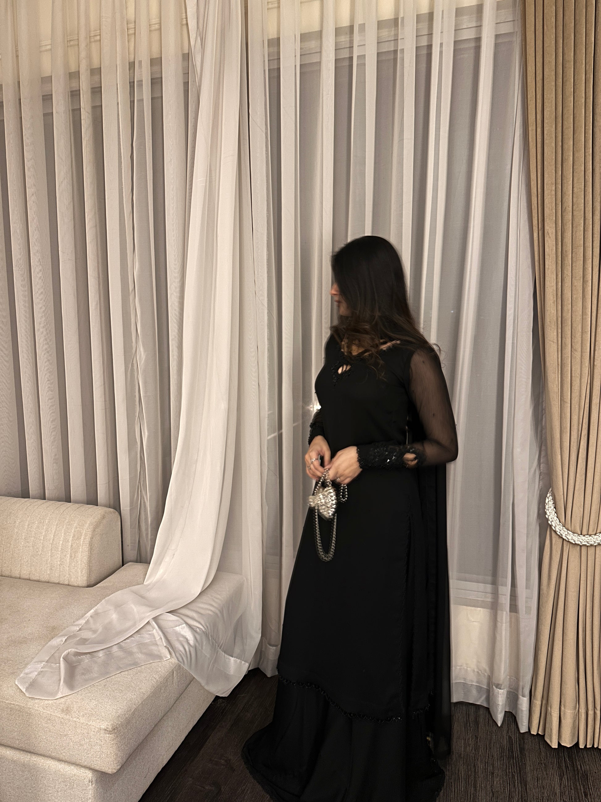 Black on black beauty. beautiful chiffon shirt with all black Cutwork handwork neckline. bead detailing on keyhole and all cut works.