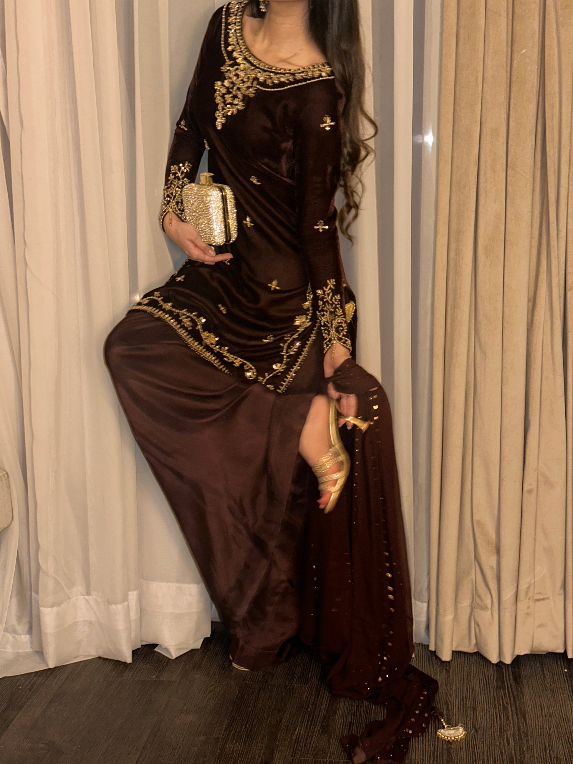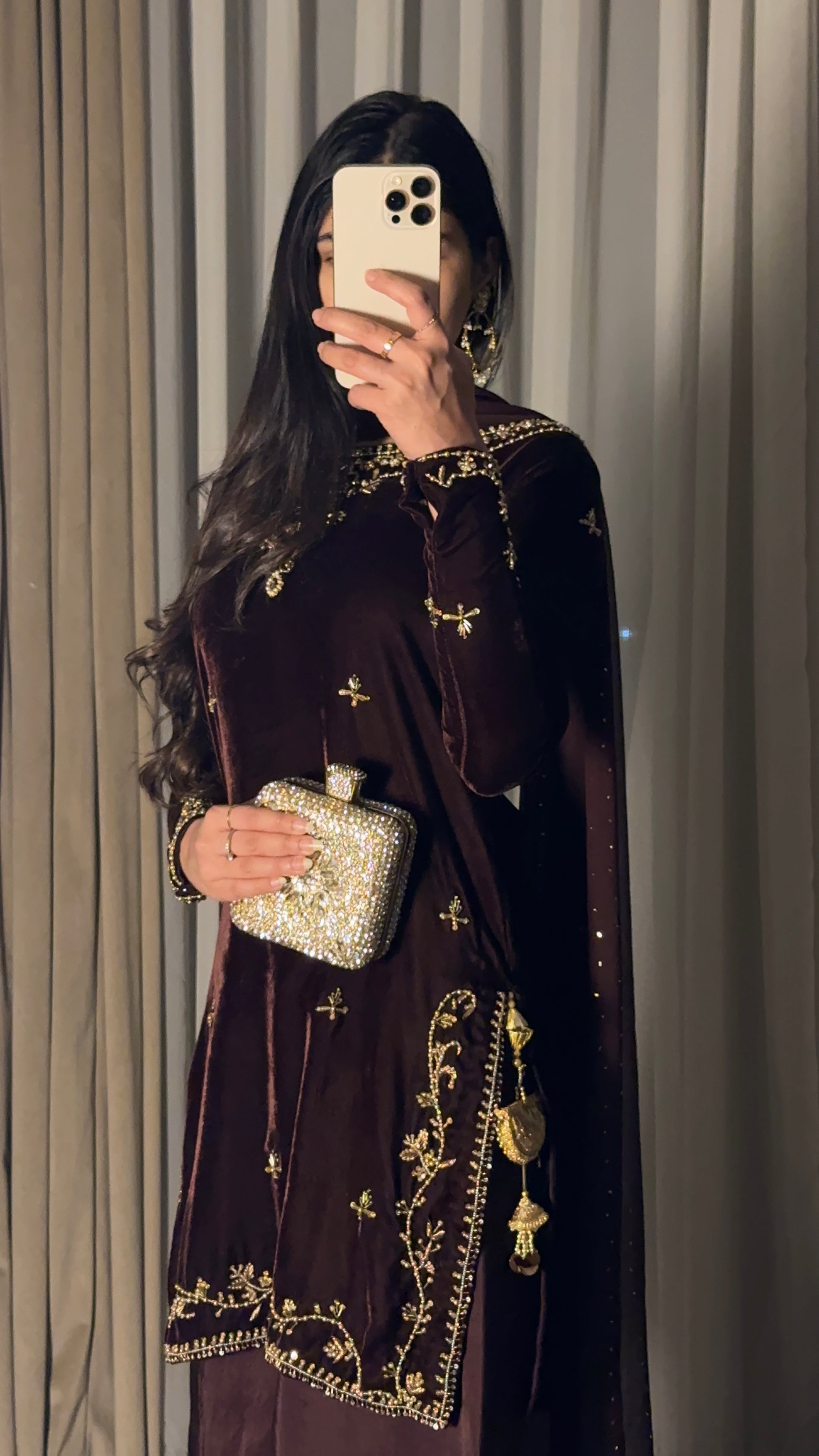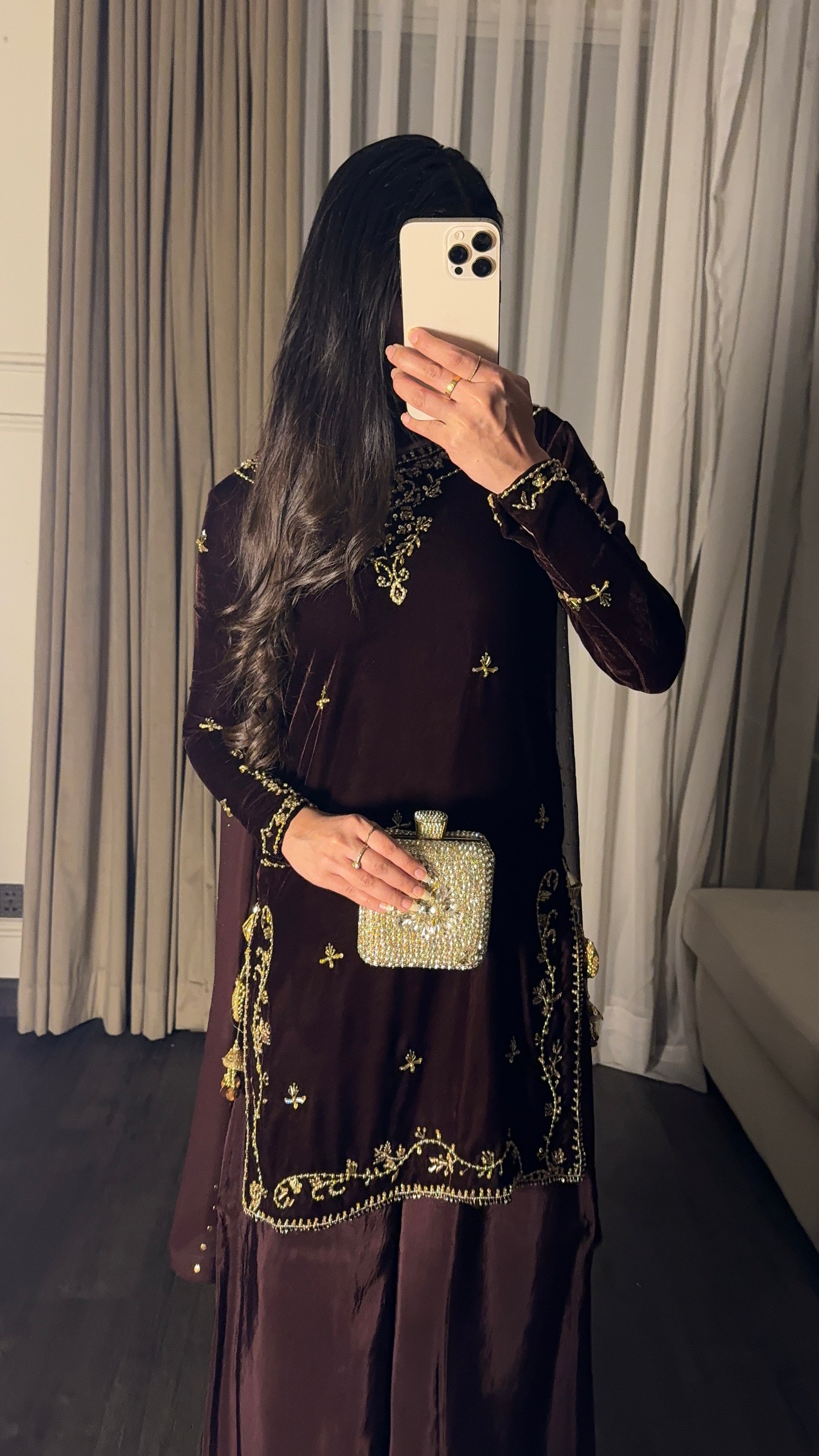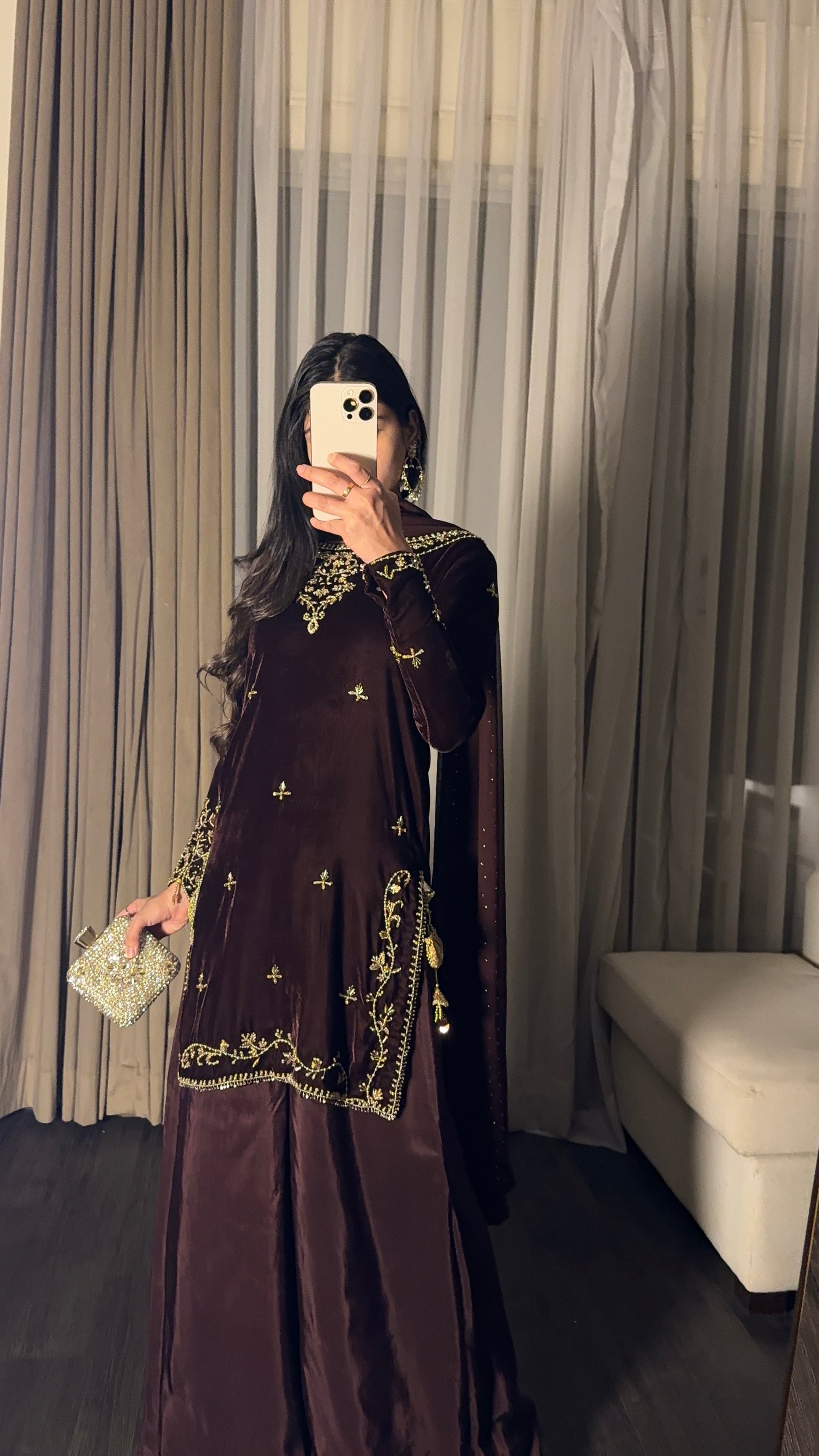 Luxurious velvet and a trending deep chocolate shade.. perfect combination. The shirt is full of handwork and detailing. Sleeves have a unique detailing and cut