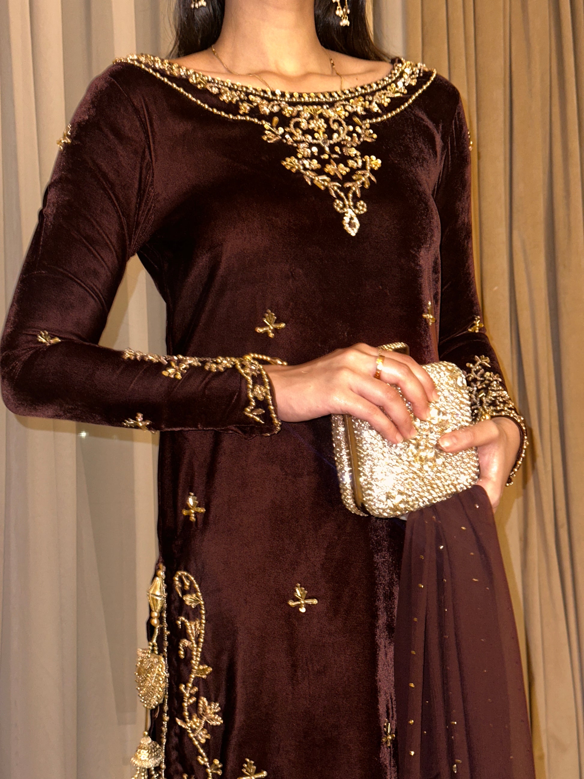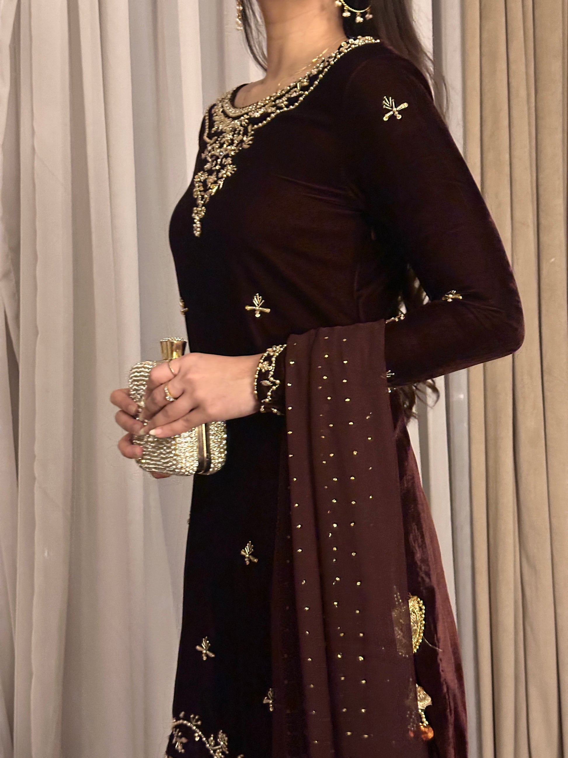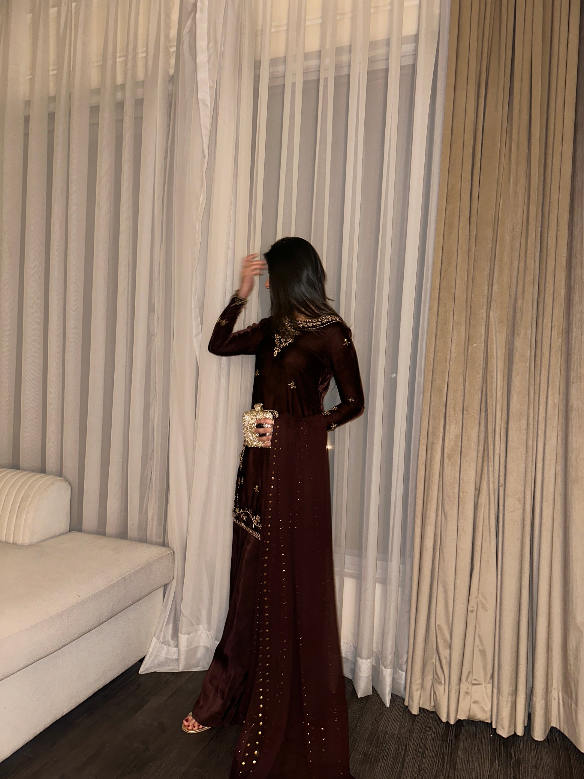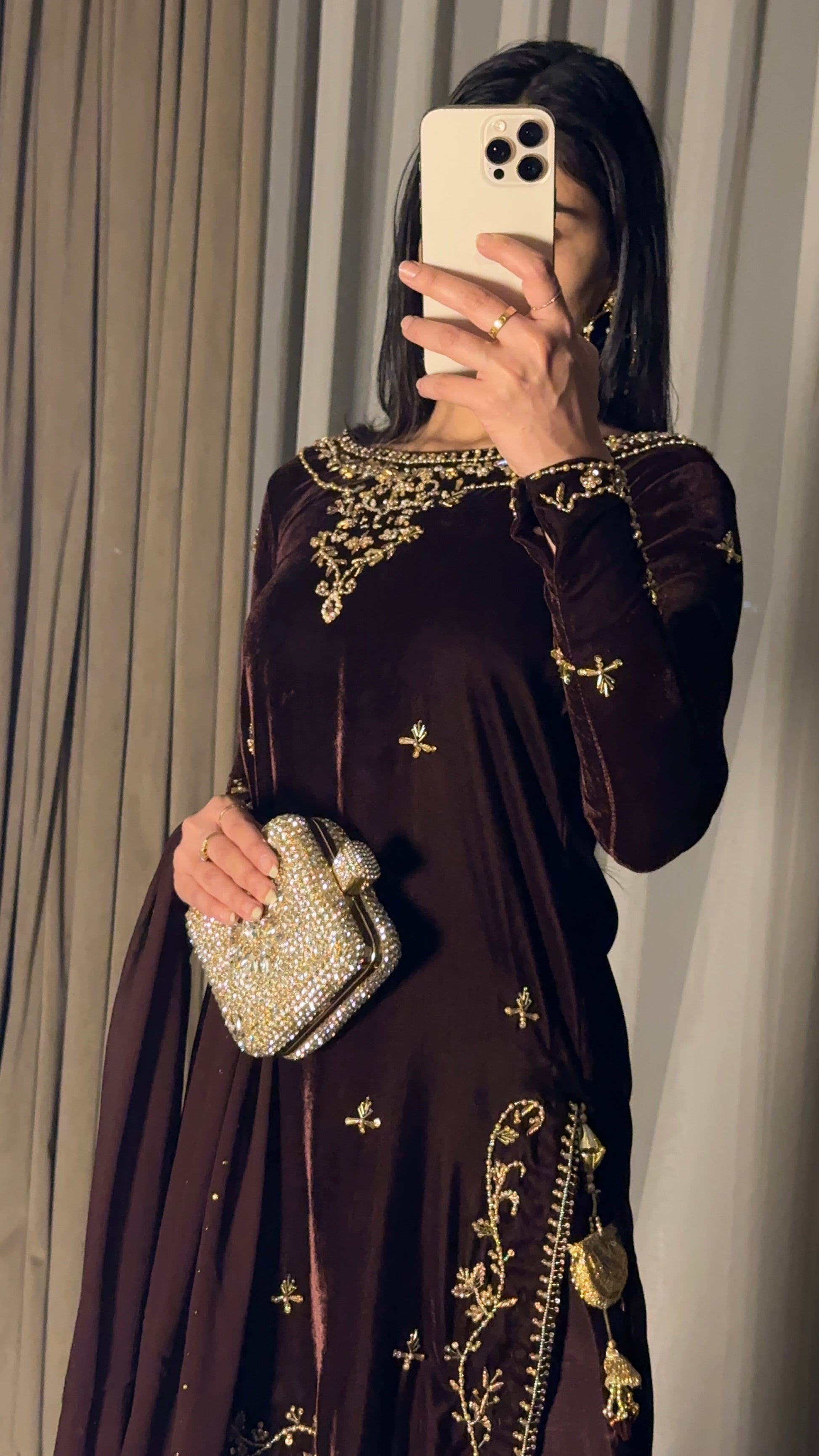 Luxurious velvet and a trending deep chocolate shade.. perfect combination. The shirt is full of handwork and detailing. Sleeves have a unique detailing and cut