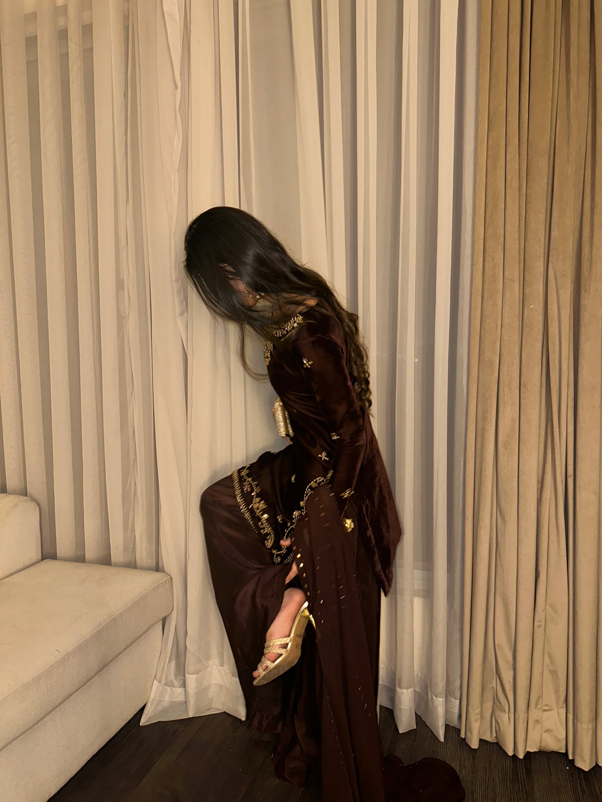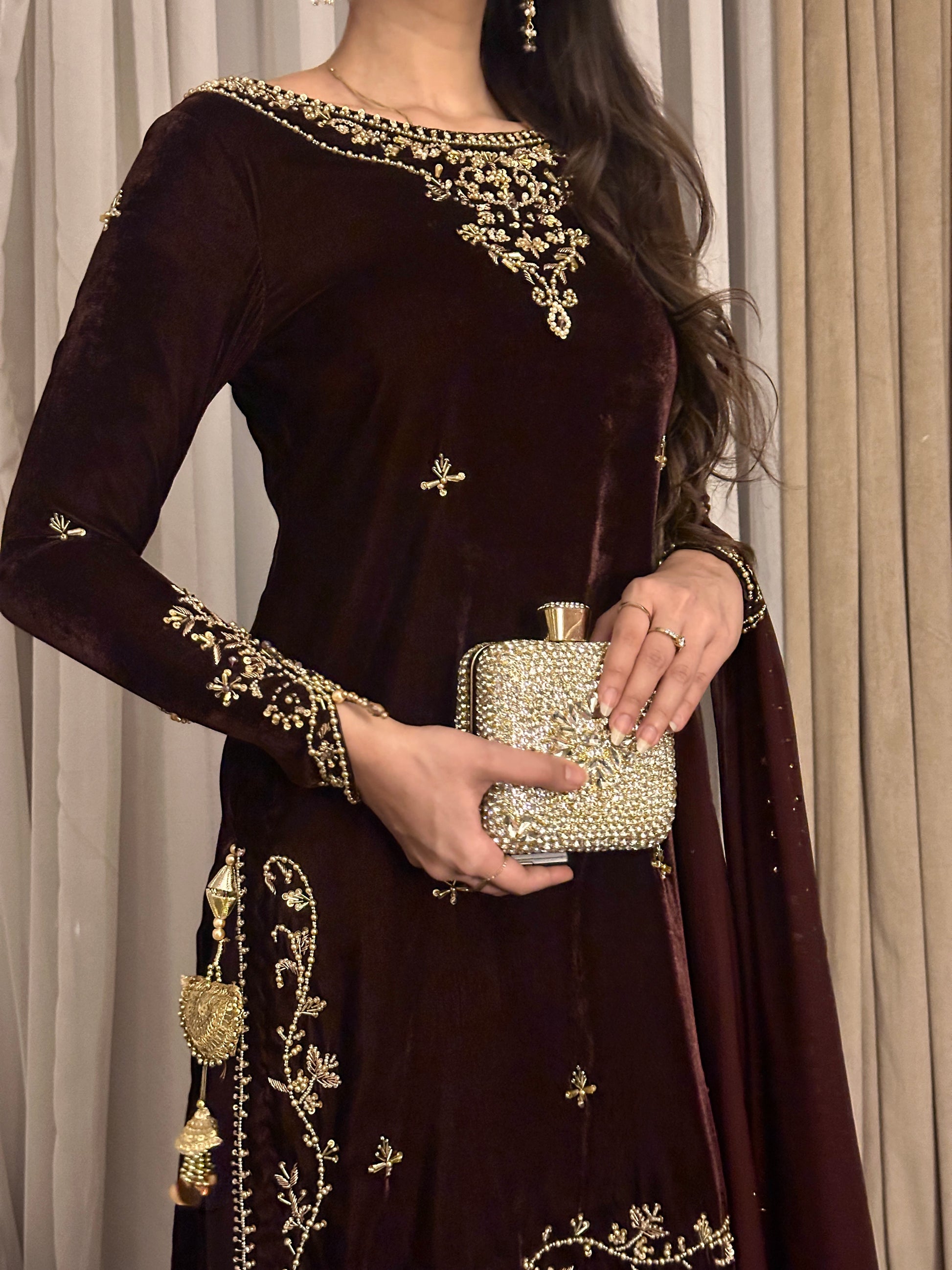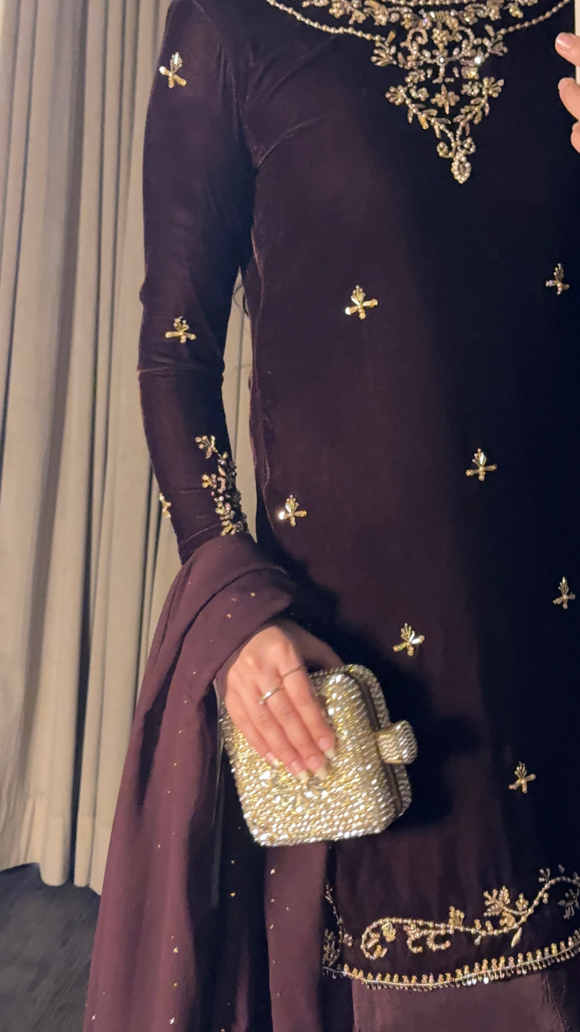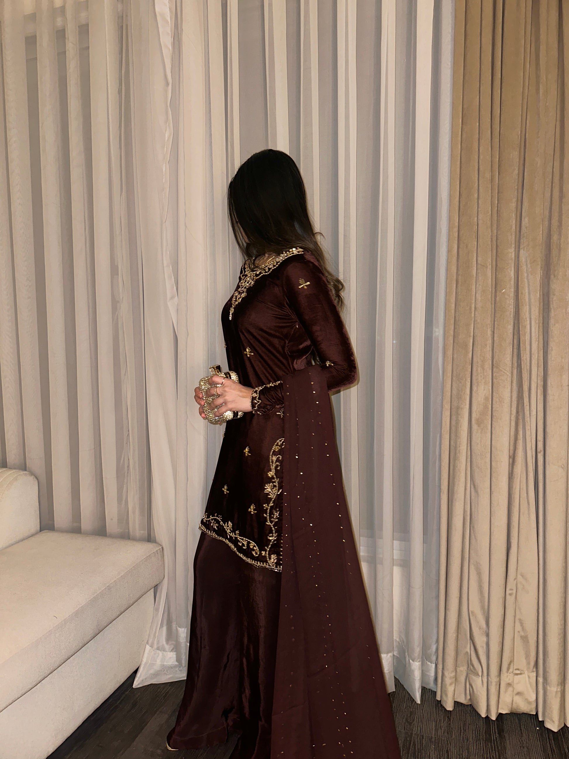 Luxurious velvet and a trending deep chocolate shade.. perfect combination. The shirt is full of handwork and detailing. Sleeves have a unique detailing and cut