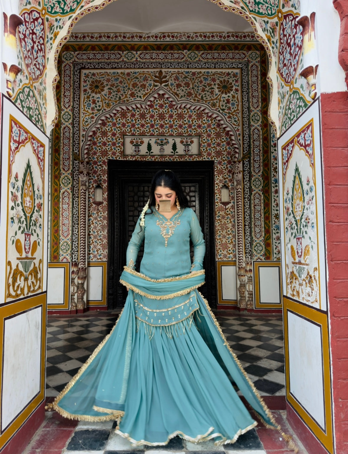 Regal outfit in a stunning blue shade. The hand and sleeves are handwork with a dangling tassle, work chan all over the shirt and a border of work on end of shirt
