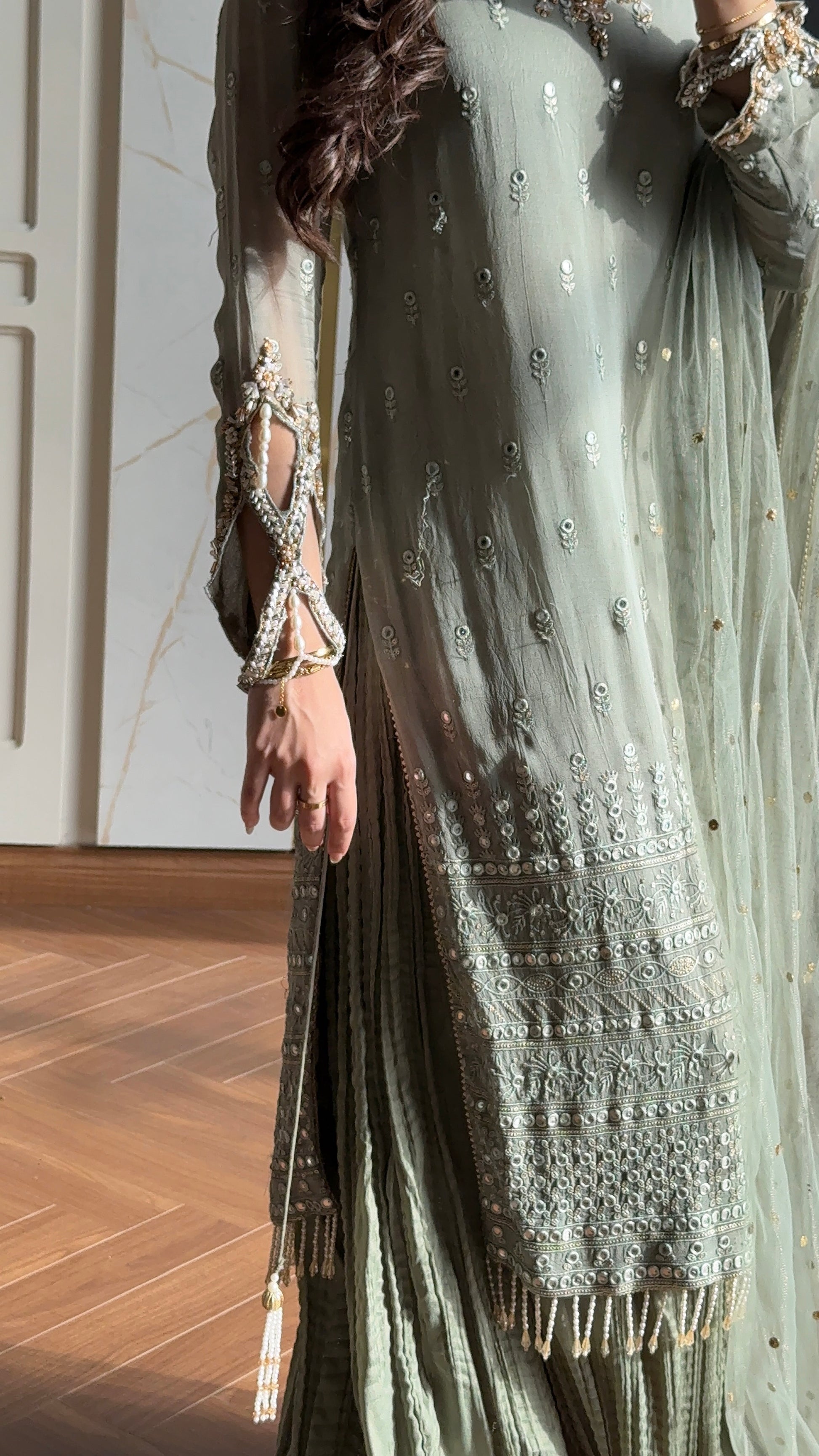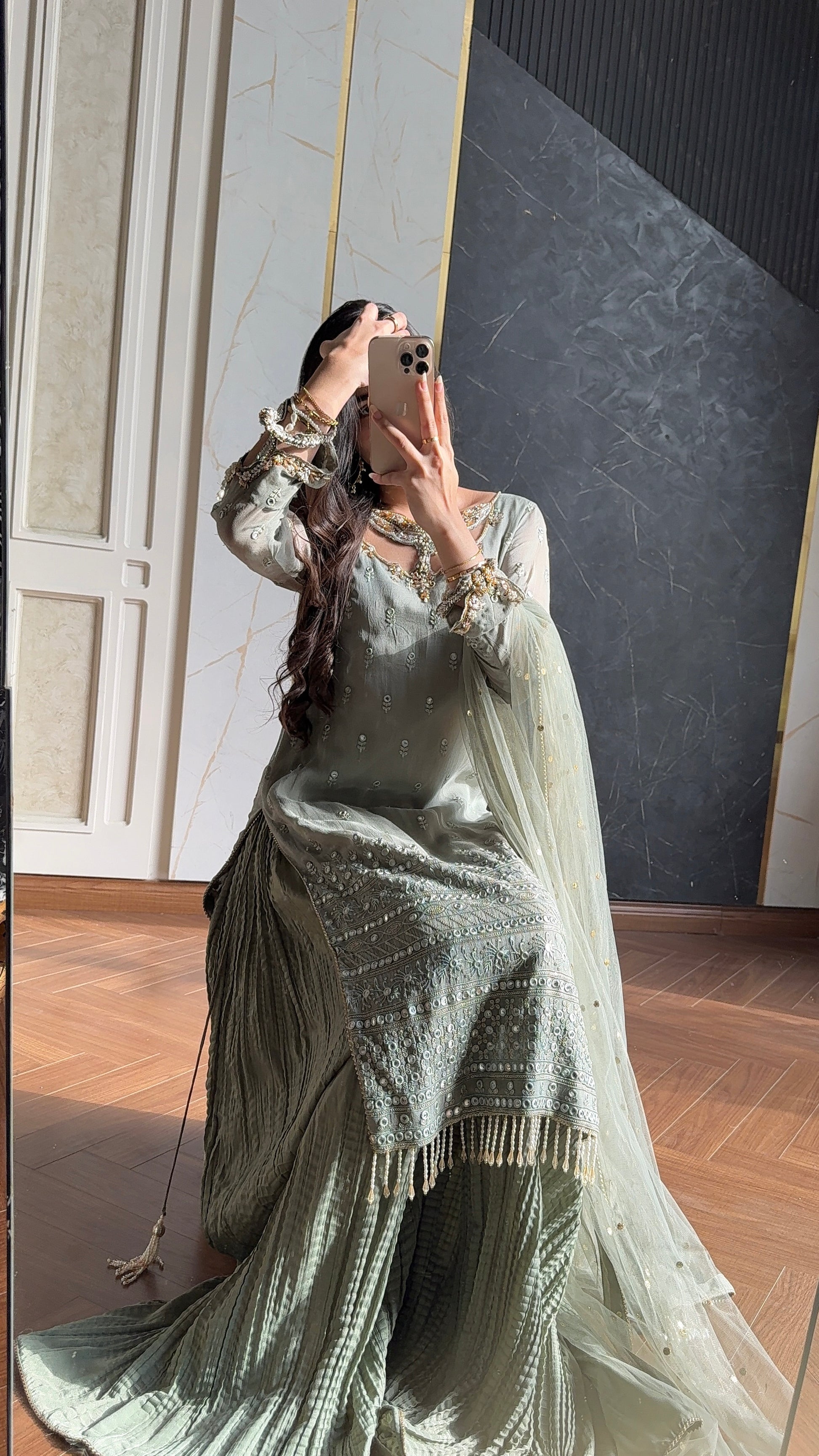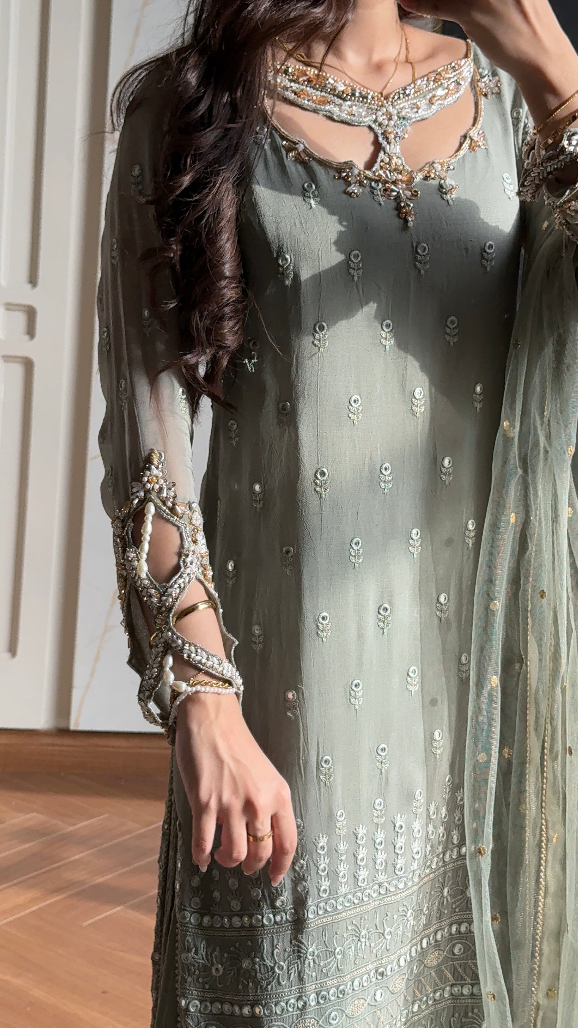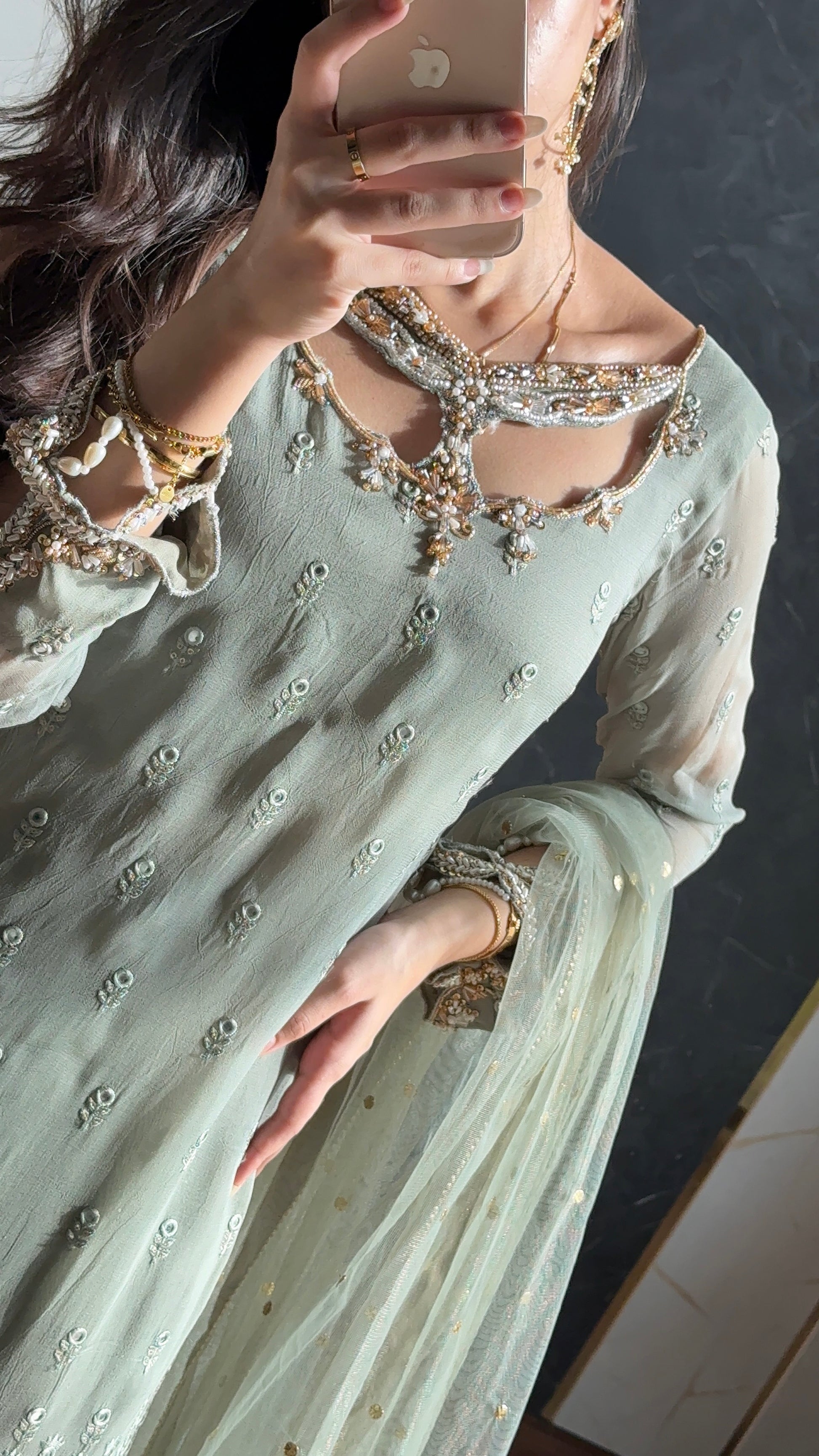 A beautiful sage embroidered base. Our signature handwork neckline and a new Cutwork stylish sleeves.