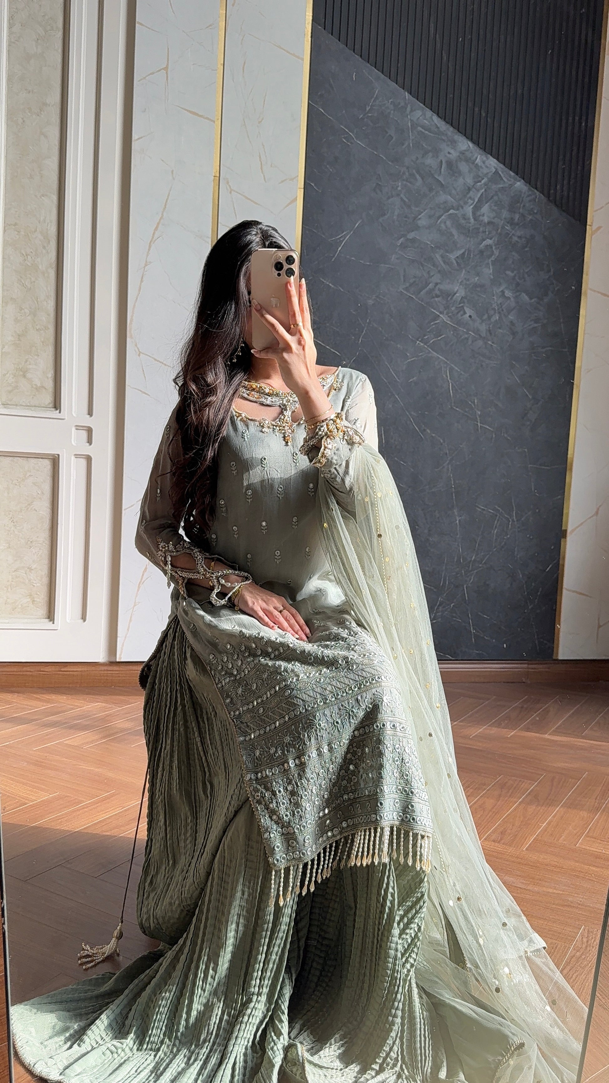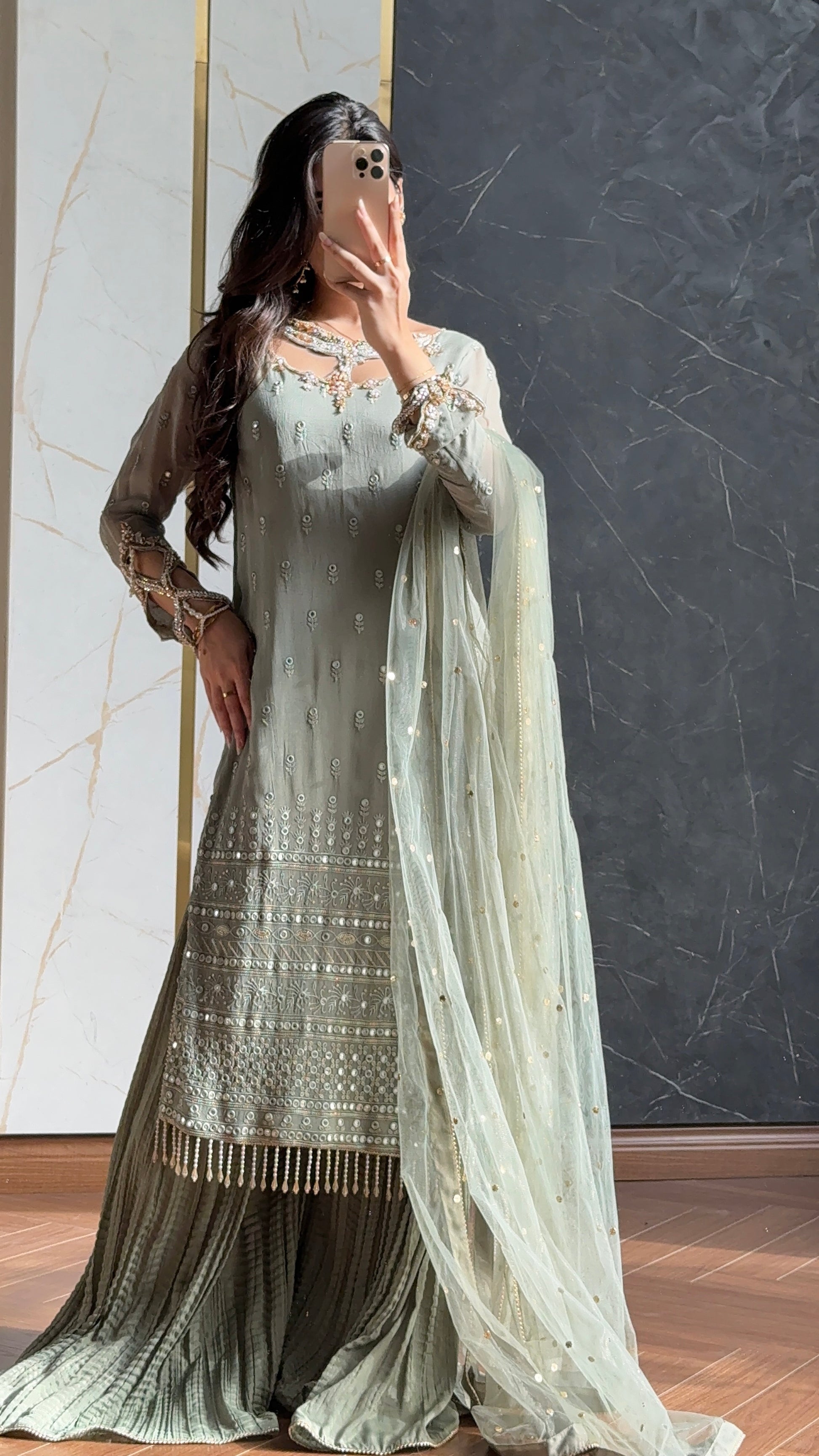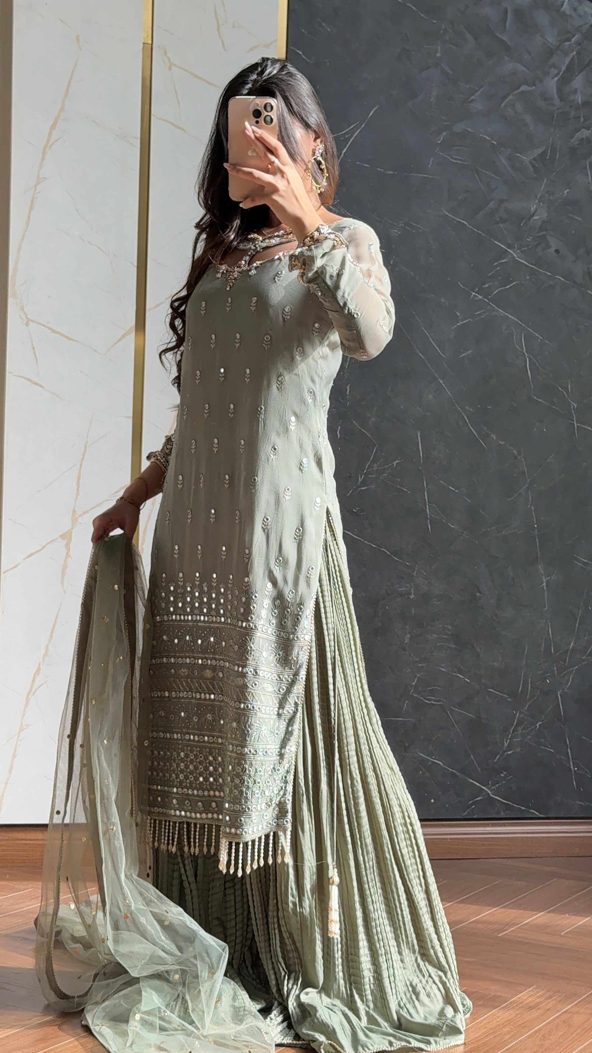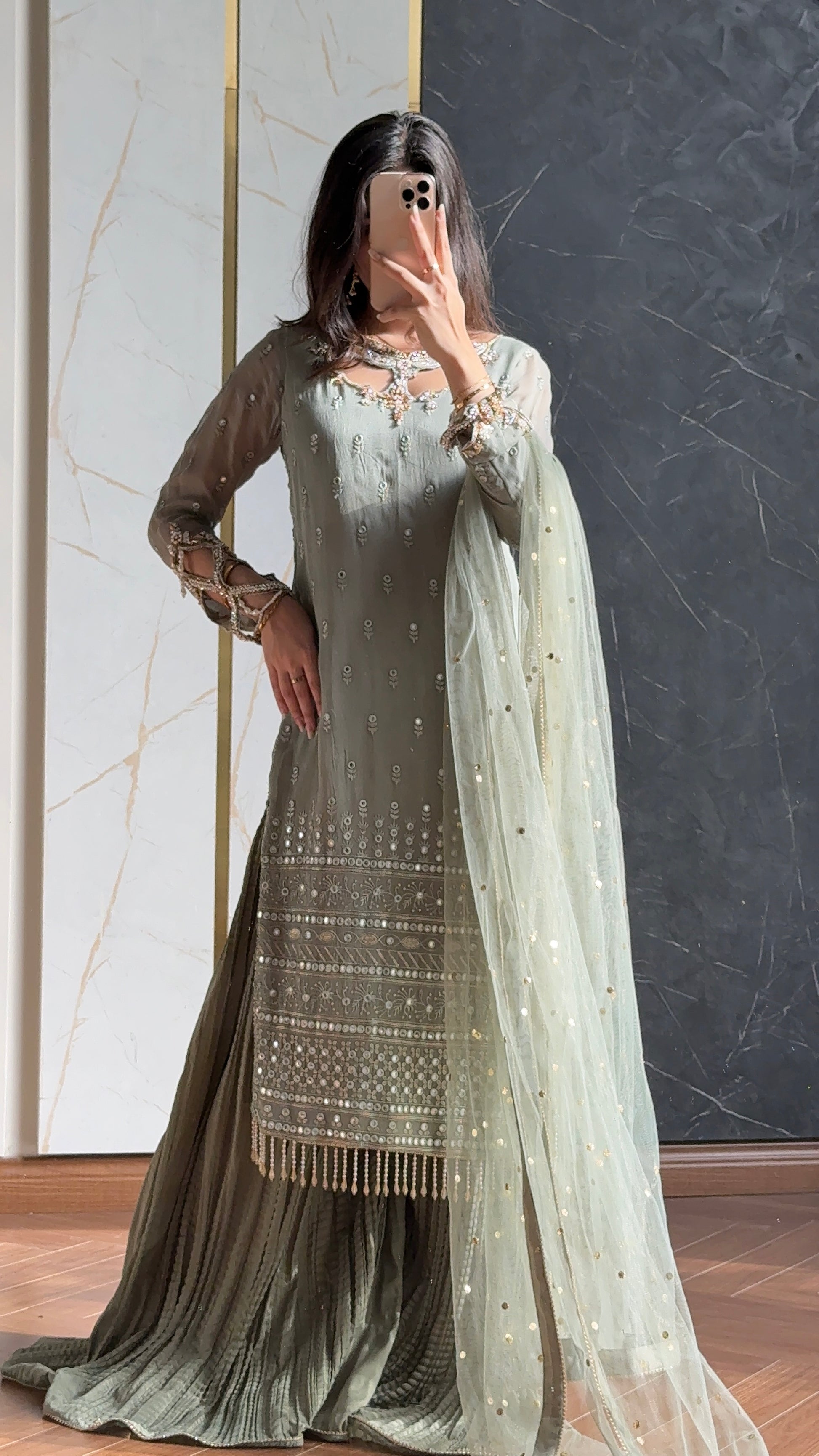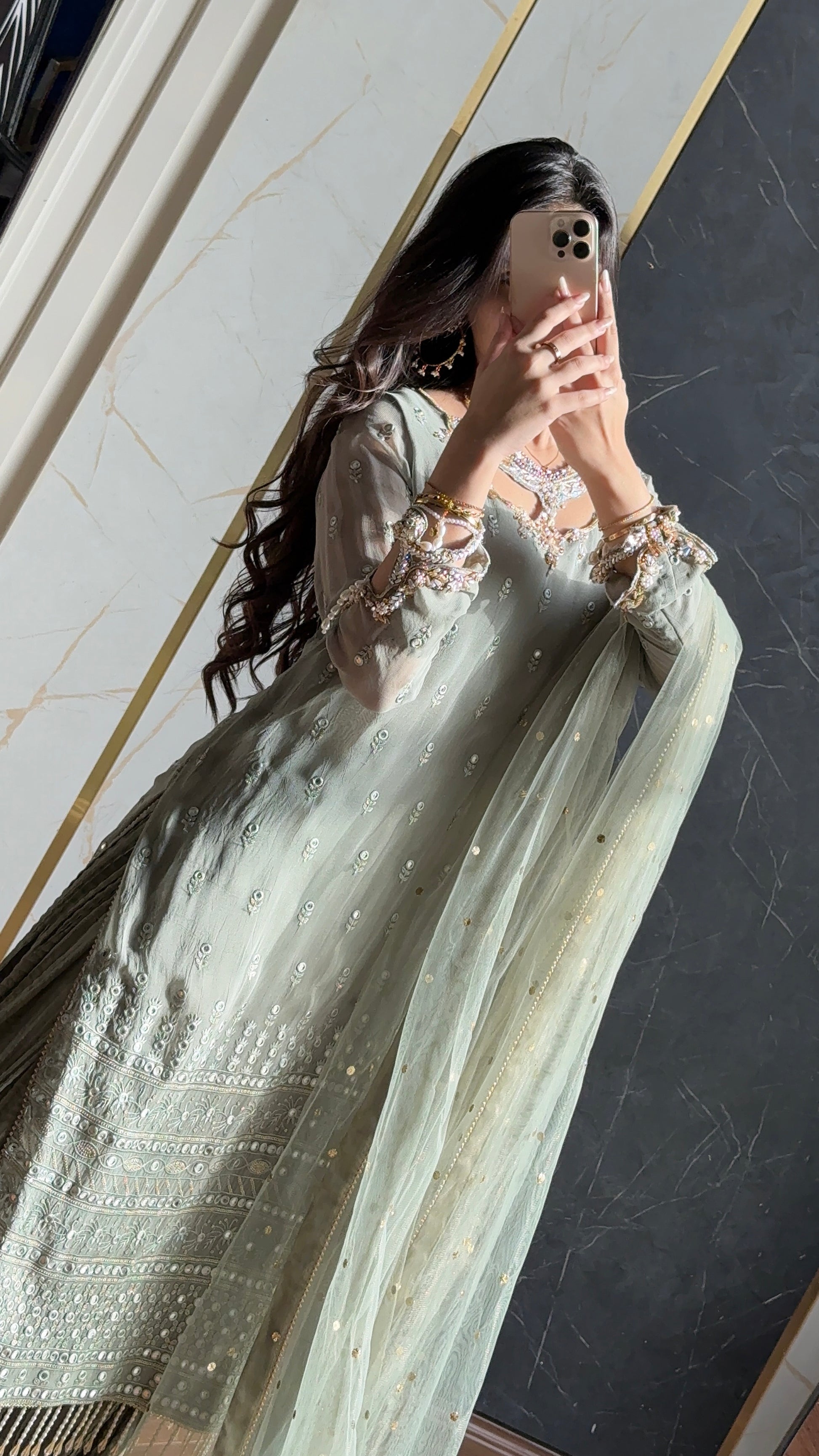 A beautiful sage embroidered base. Our signature handwork neckline and a new Cutwork stylish sleeves.