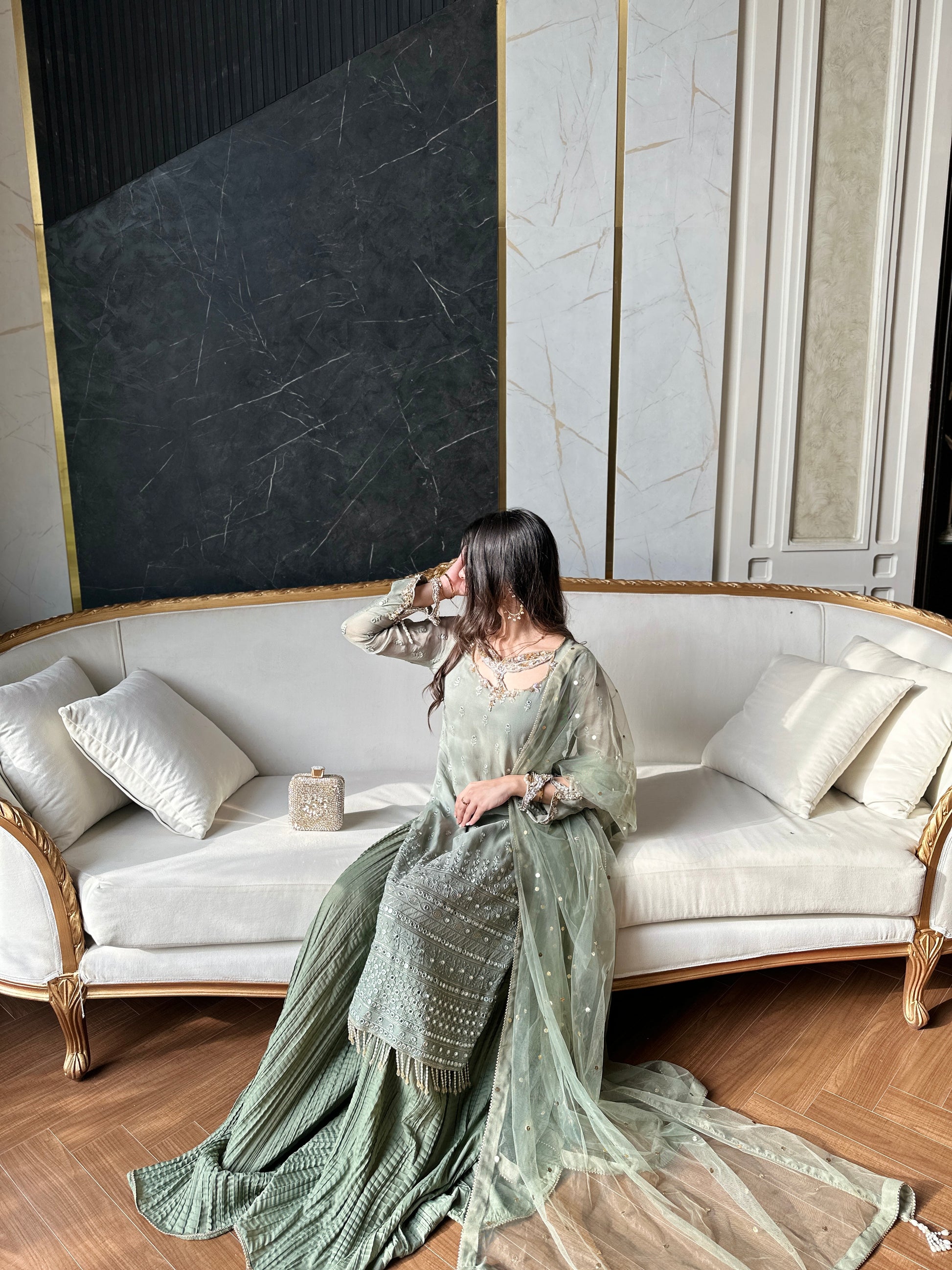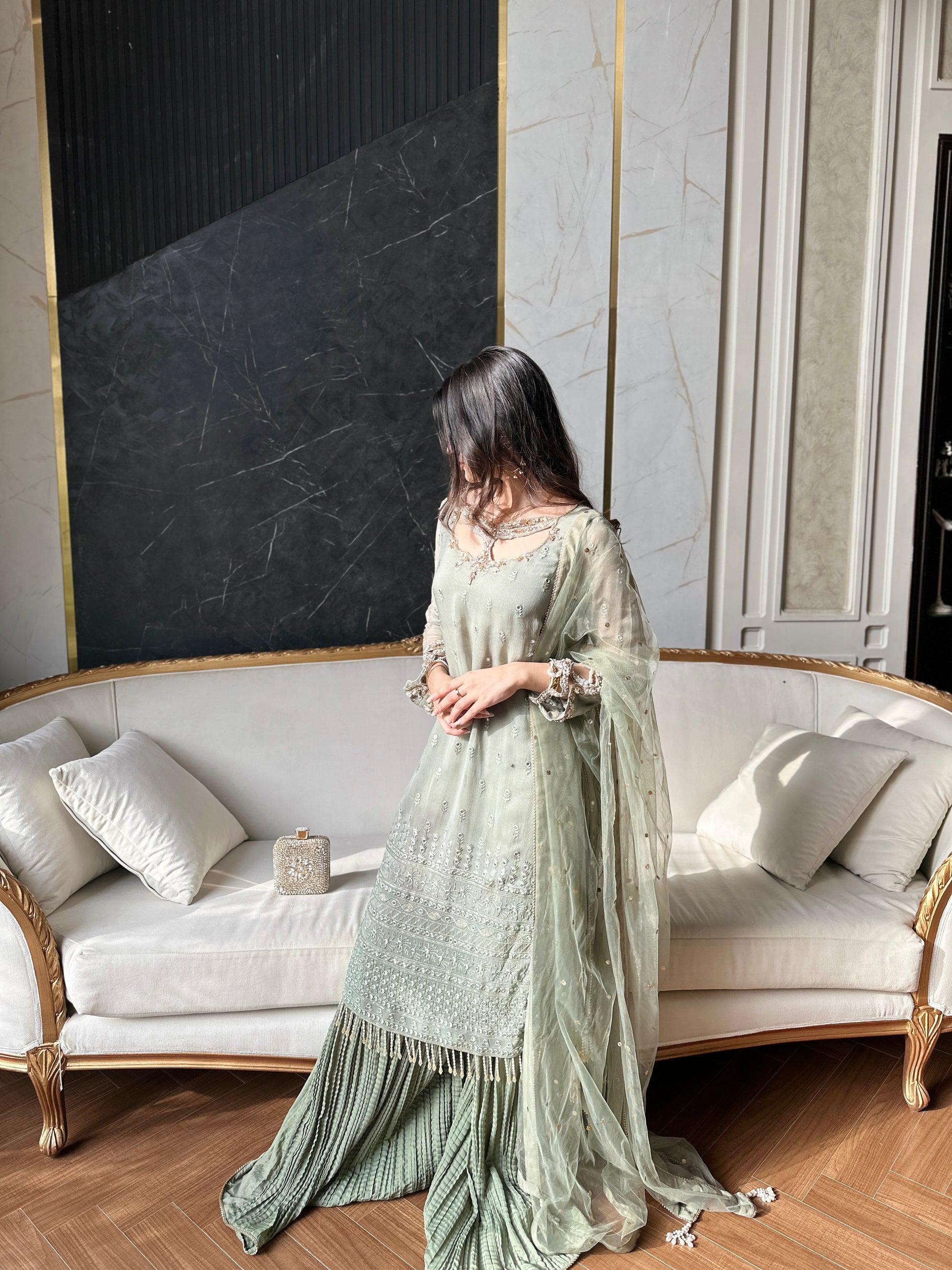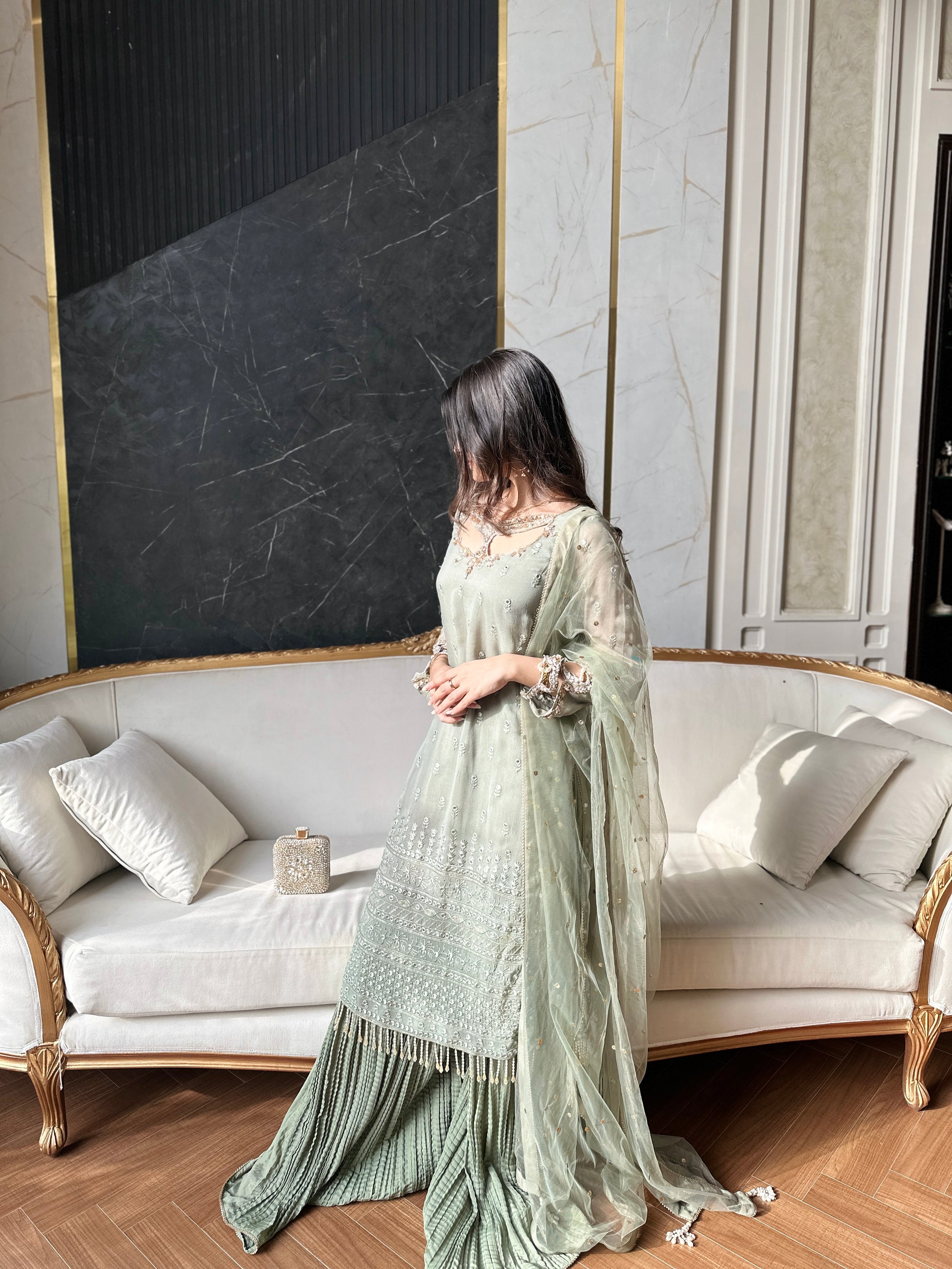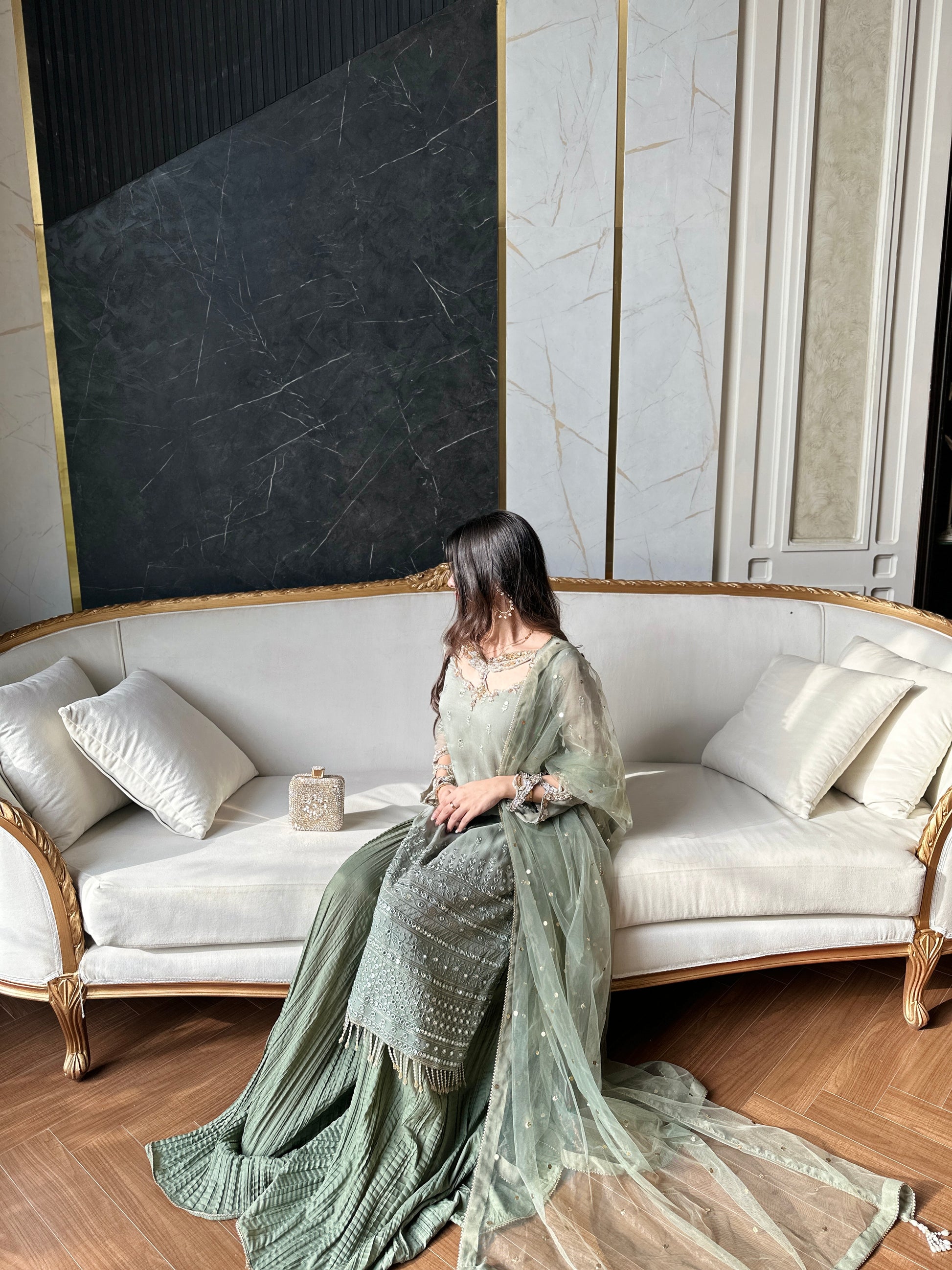 A beautiful sage embroidered base. Our signature handwork neckline and a new Cutwork stylish sleeves.
