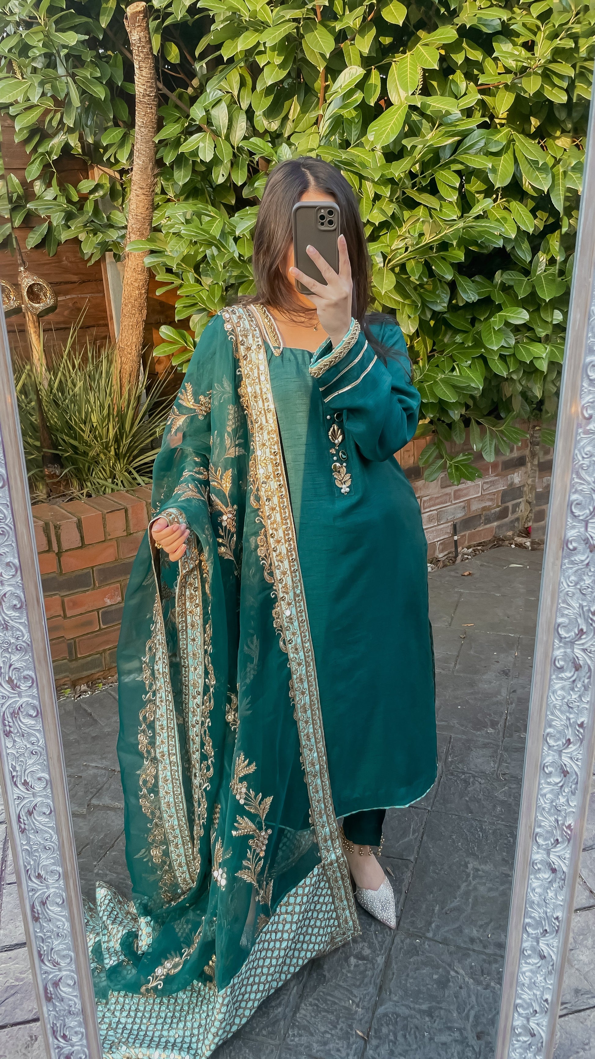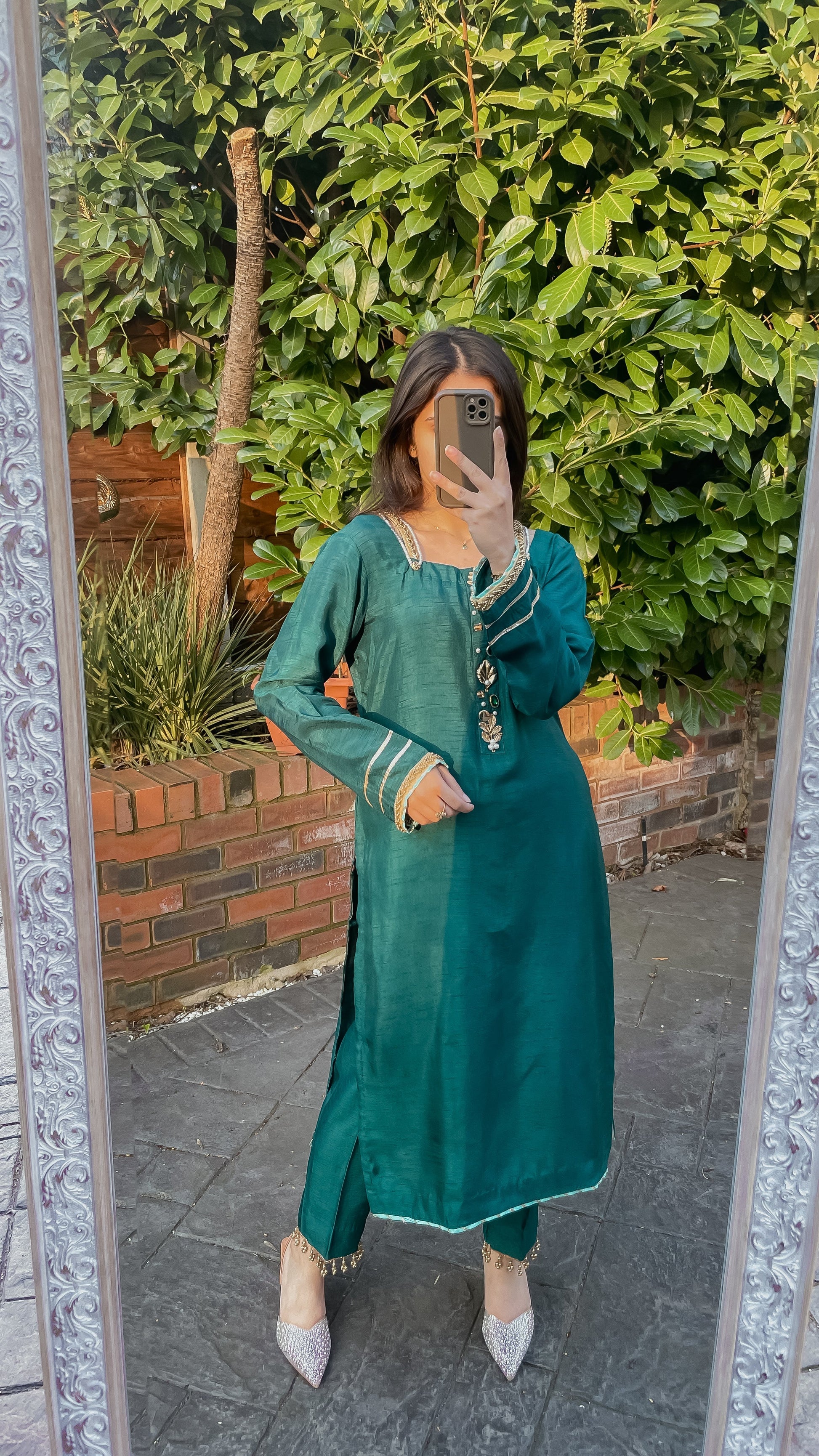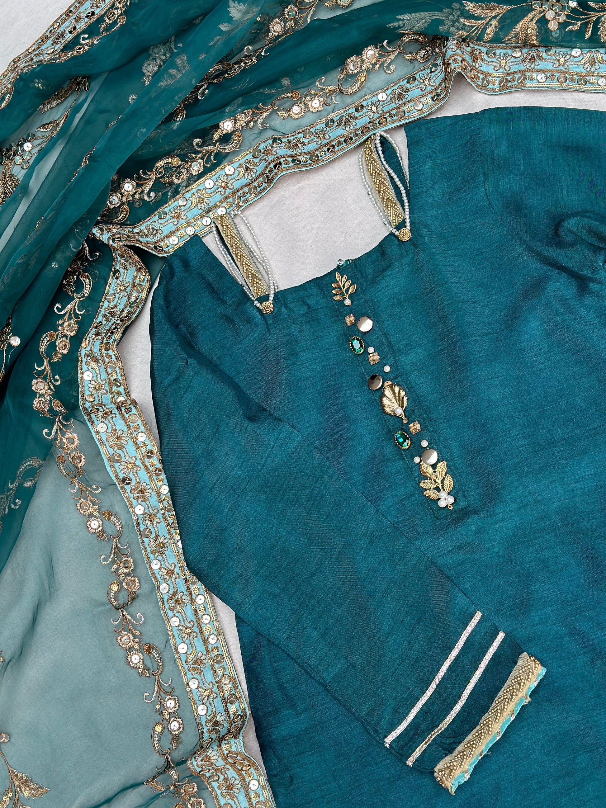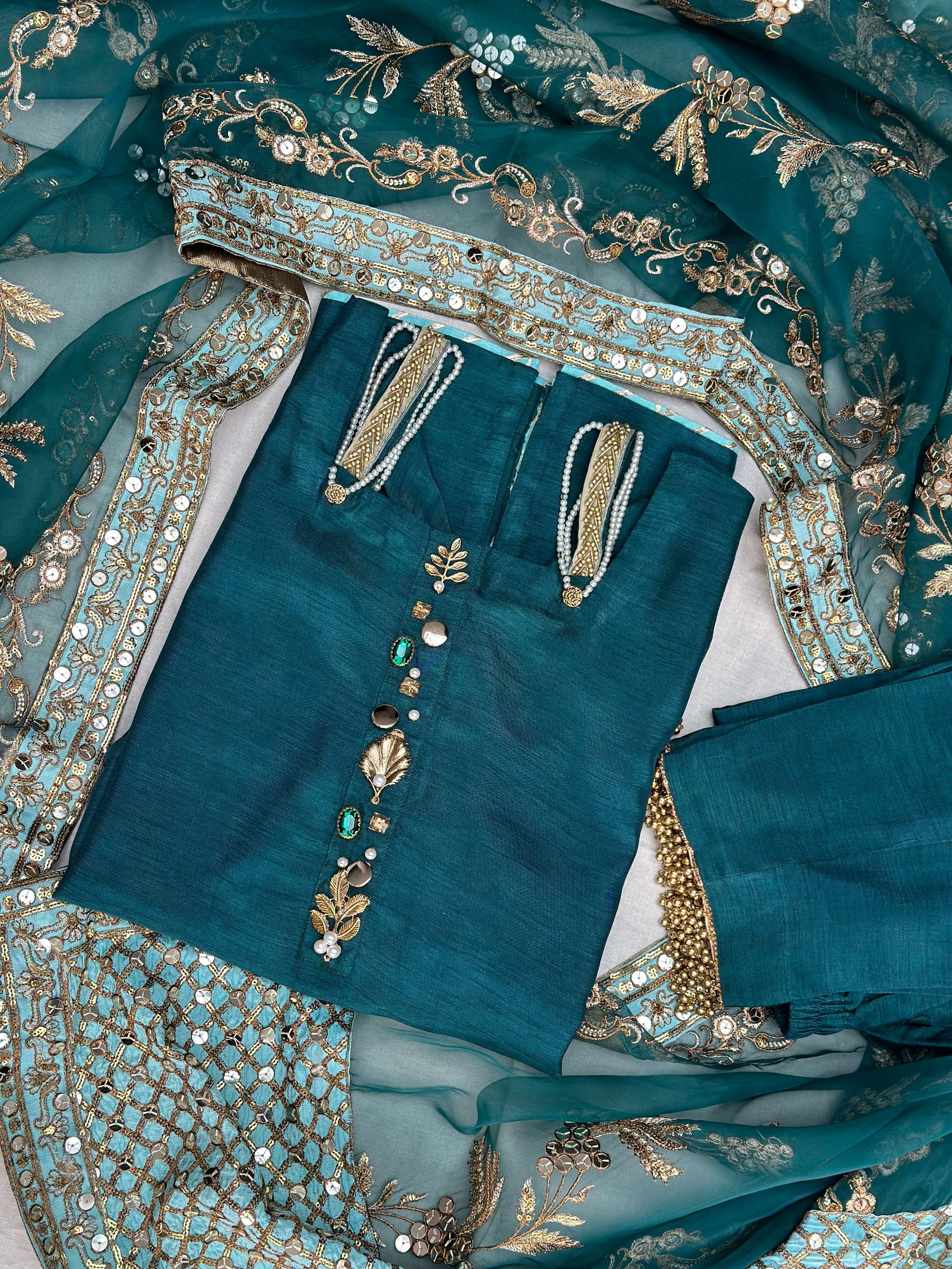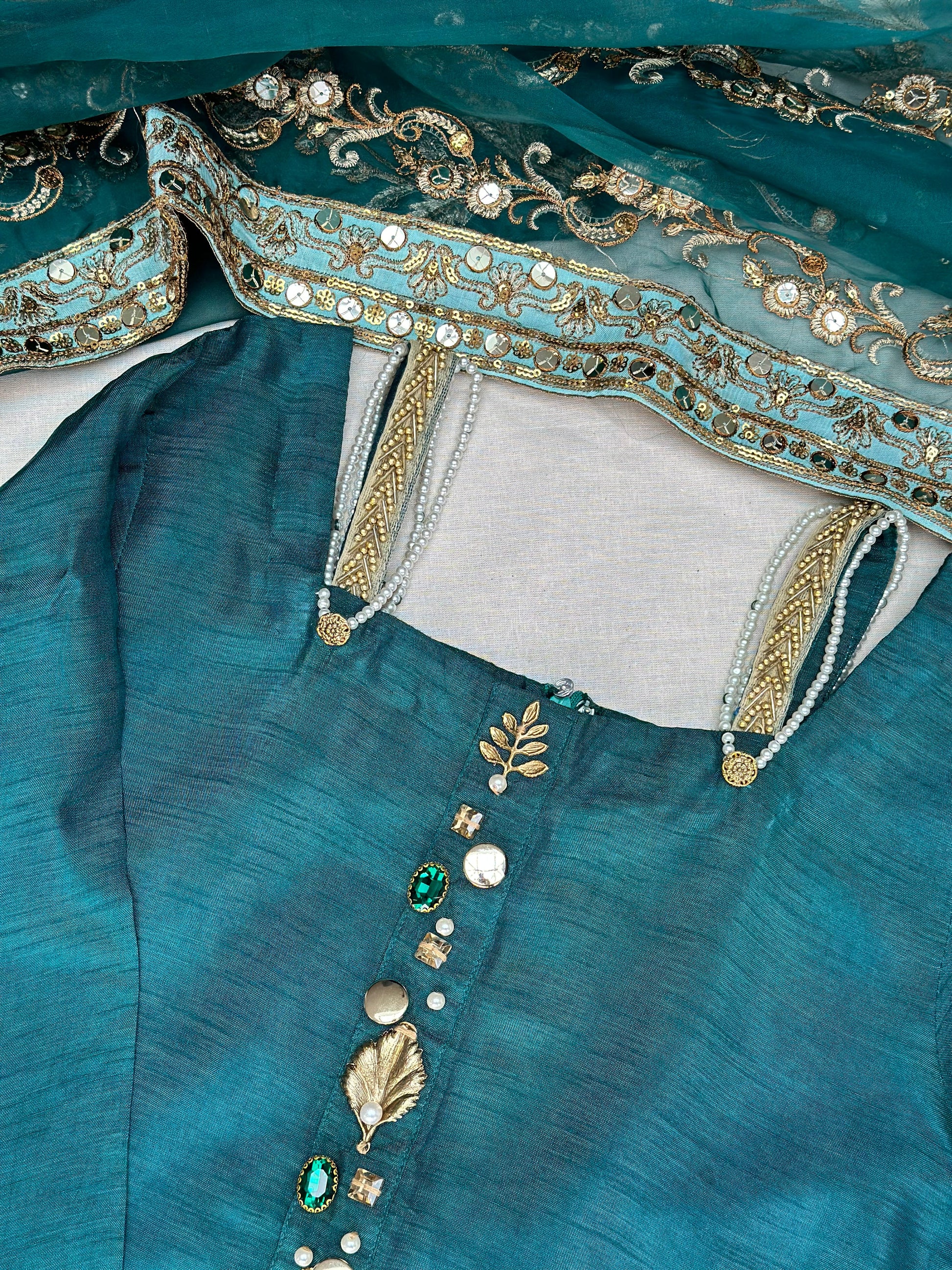 The finishing in the shirt is a light ferozi and gold colour to give a nice contrast in colours.
