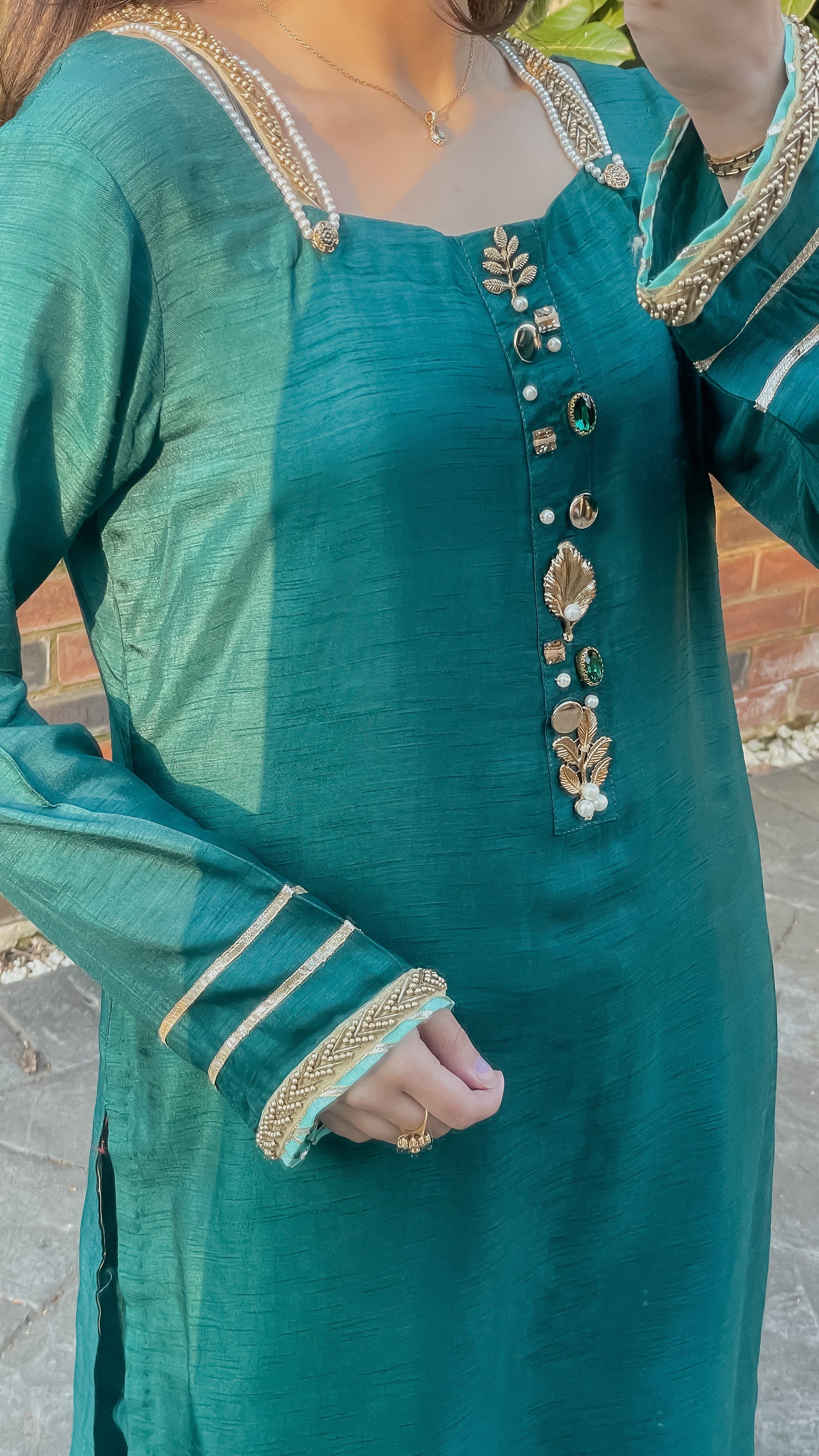 Long raw silk stylish shirt with a unite pearl and lace work strap detailing in the normal depth neckline