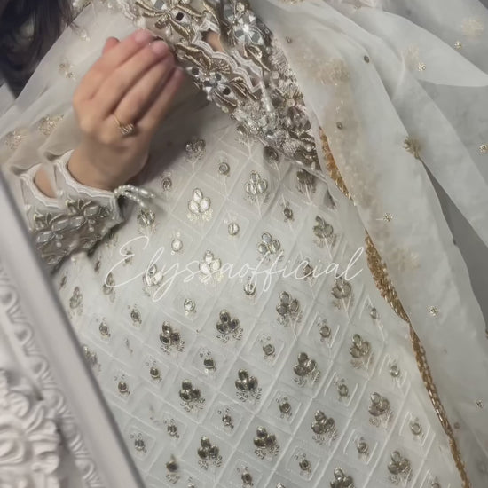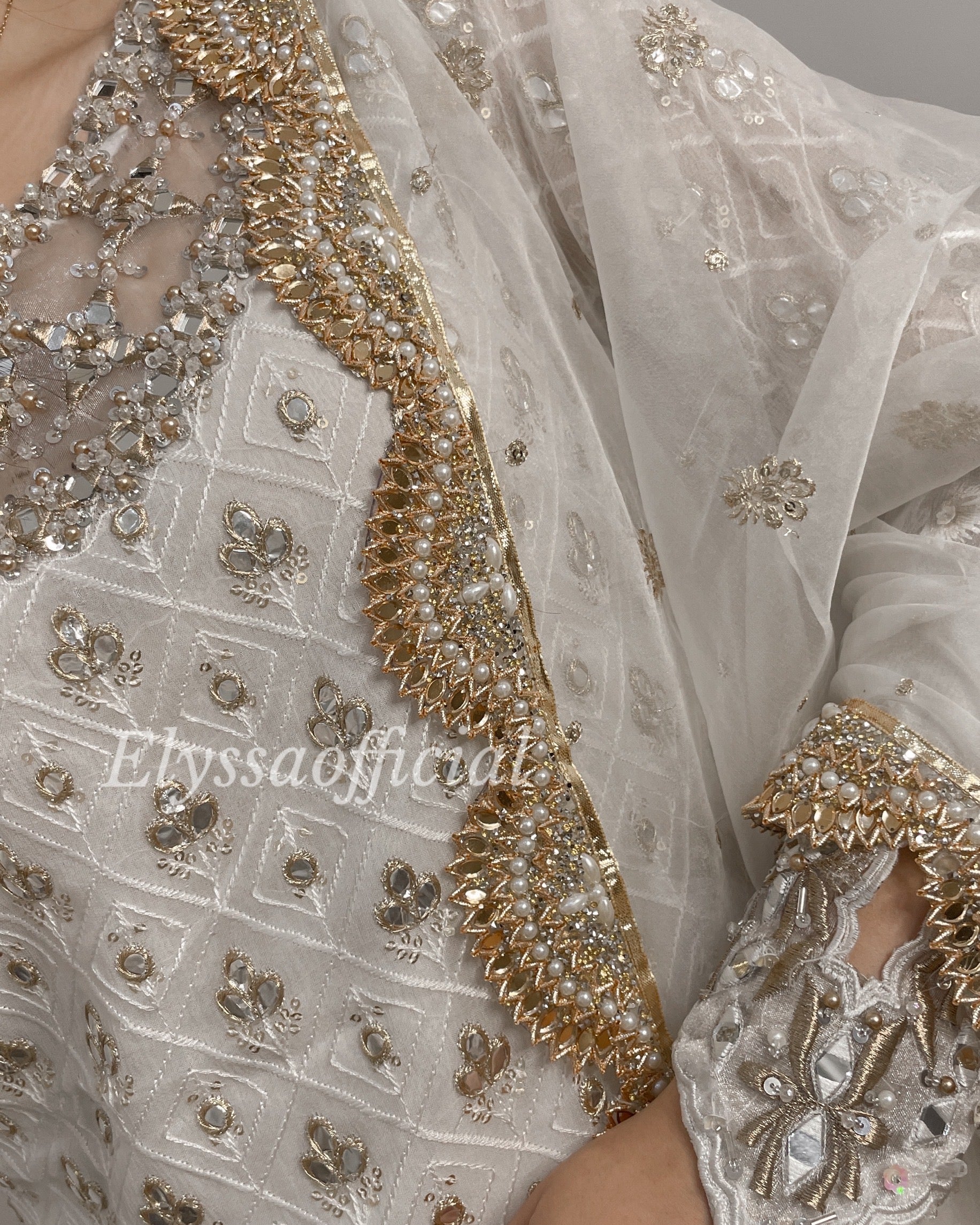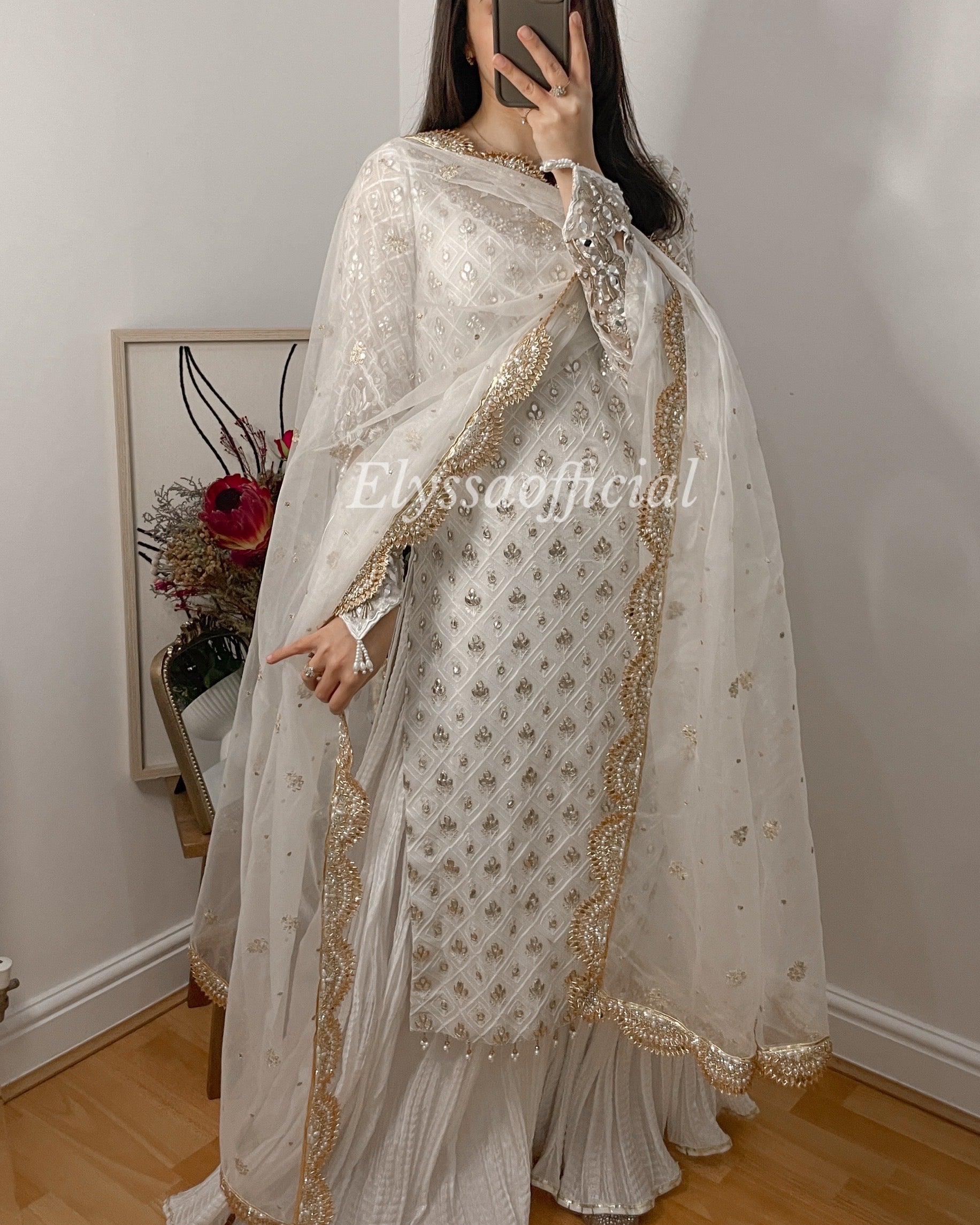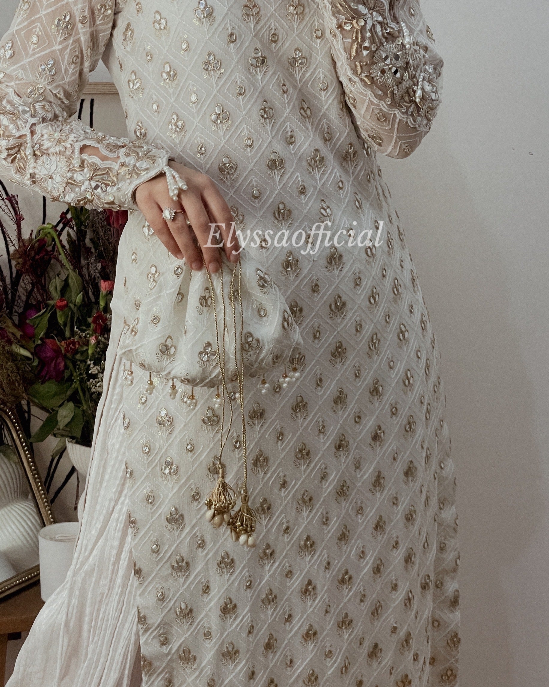 Price includes Embroidered mirror chiffon shirt, embroidered organza dupatta and crushed sHarare and matching potli bag