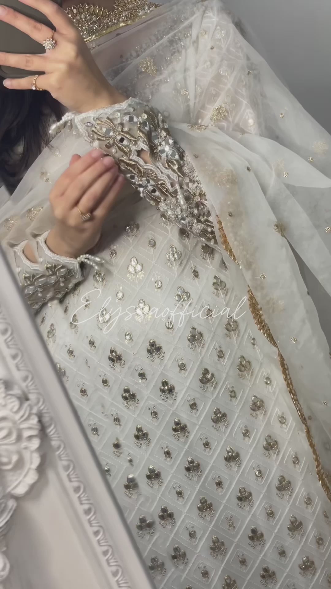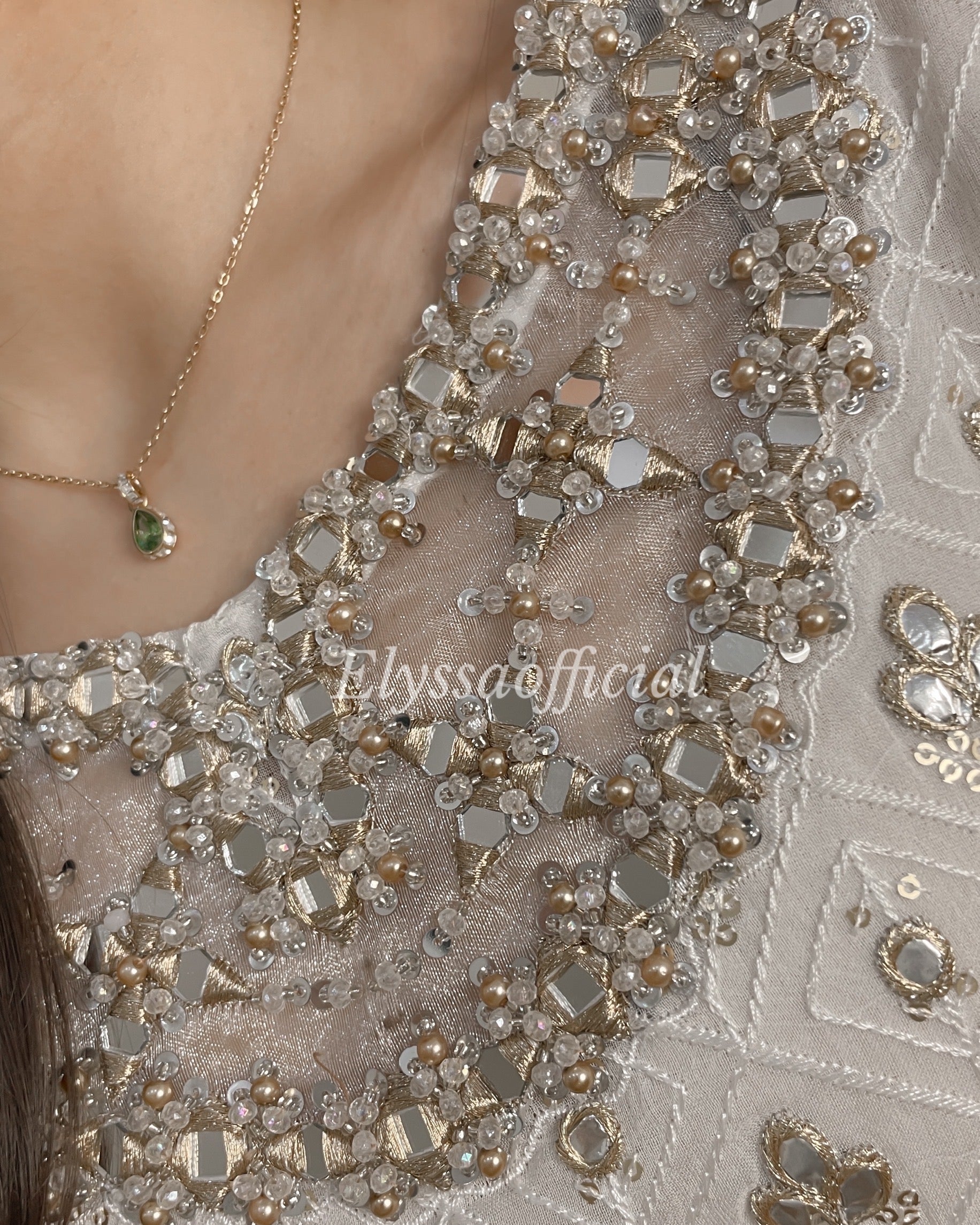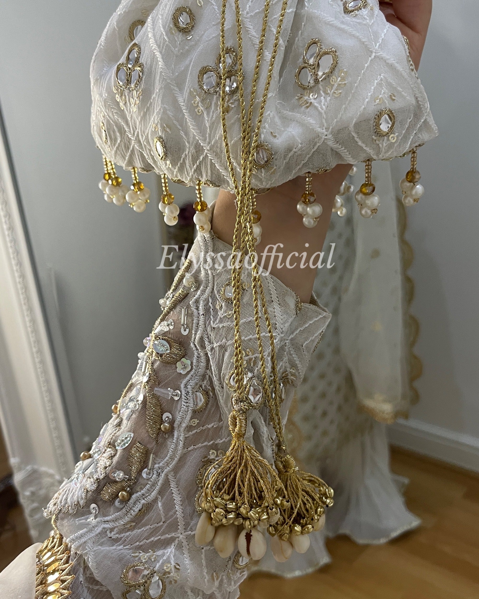 The cutout sleeve detsils hand work, is our signature work and has mix of mirror, pearl and thread work and dangling pearl tassels
