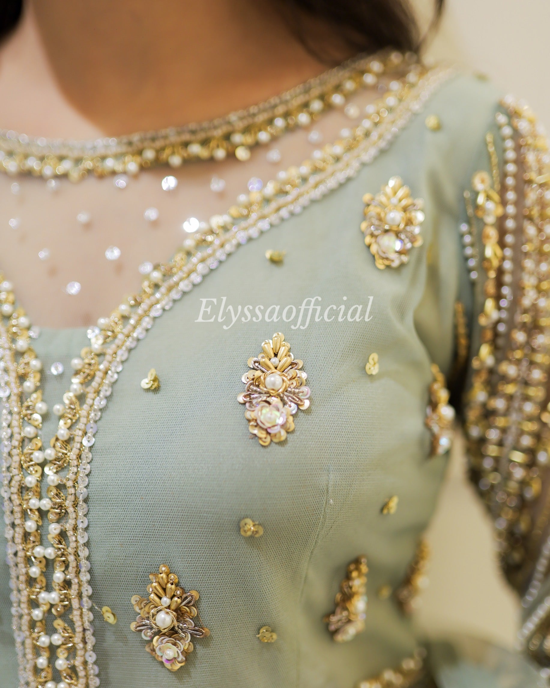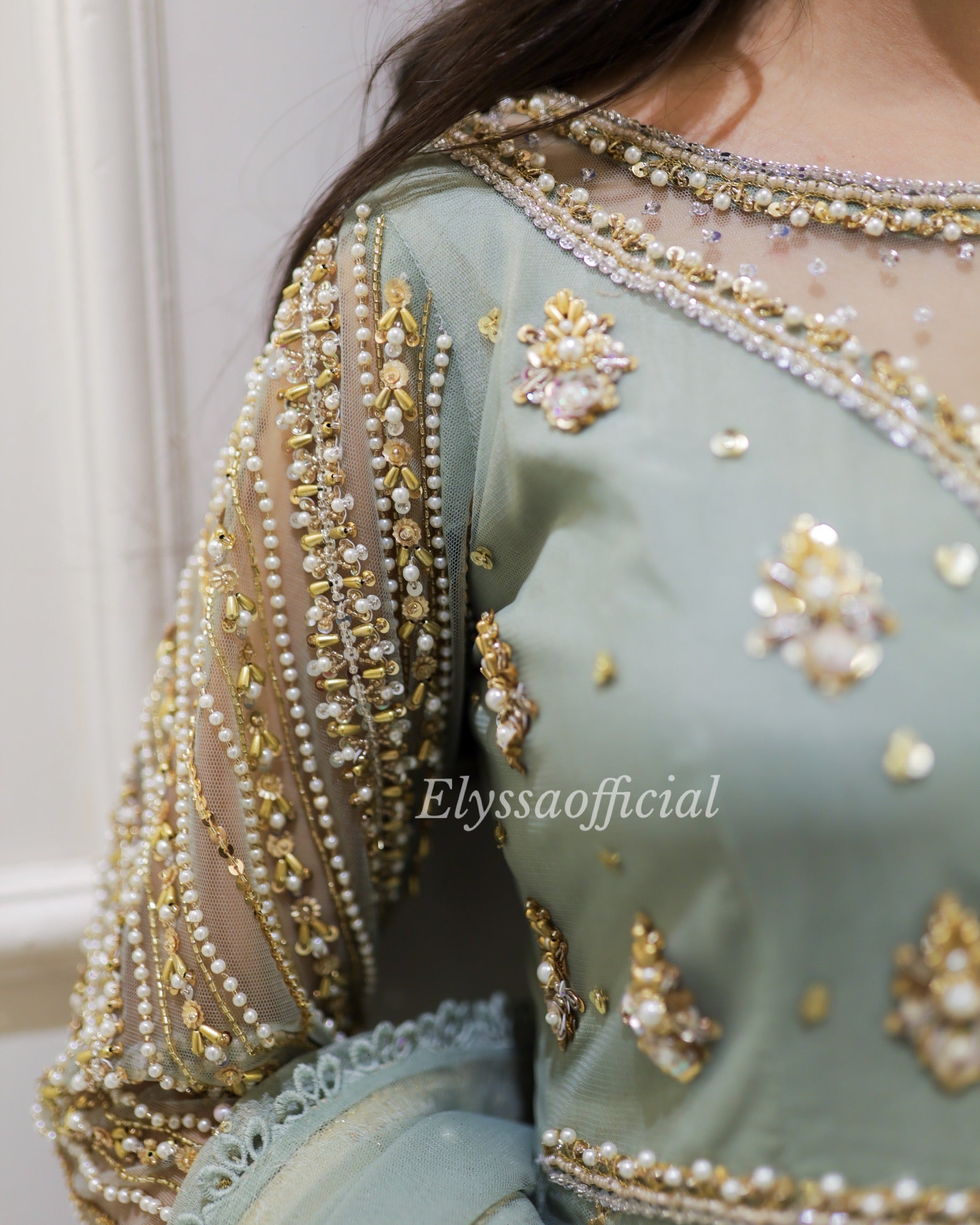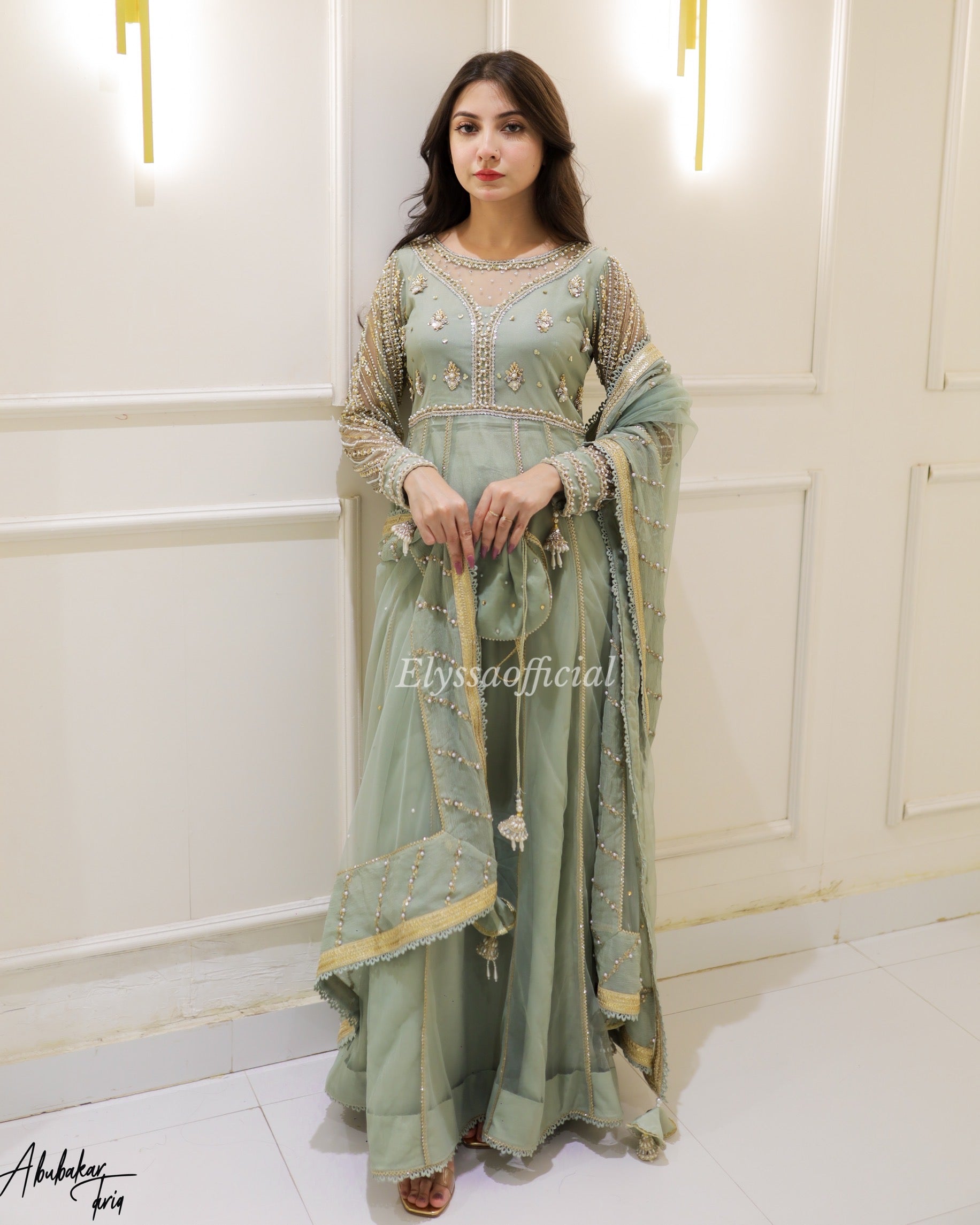 Beautiful shade of light dusky green; elegant long dress adorned with heavy thin lines of handwork all around the sleeves and neco and bodice. Close ups of the work is shown in some pictures; super pretty