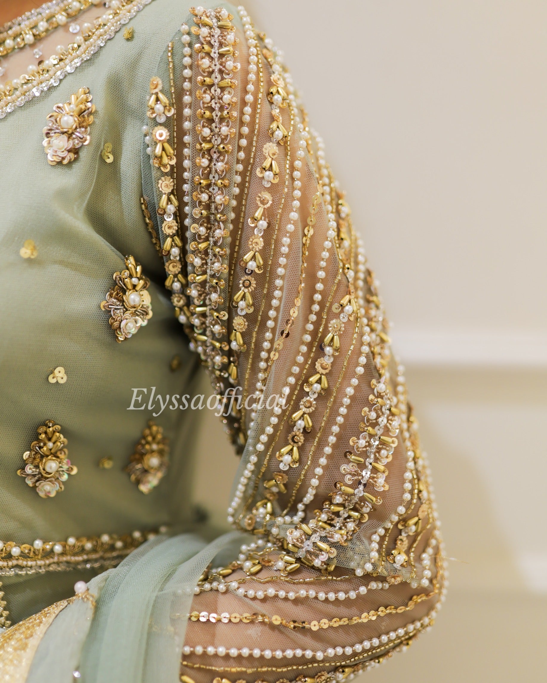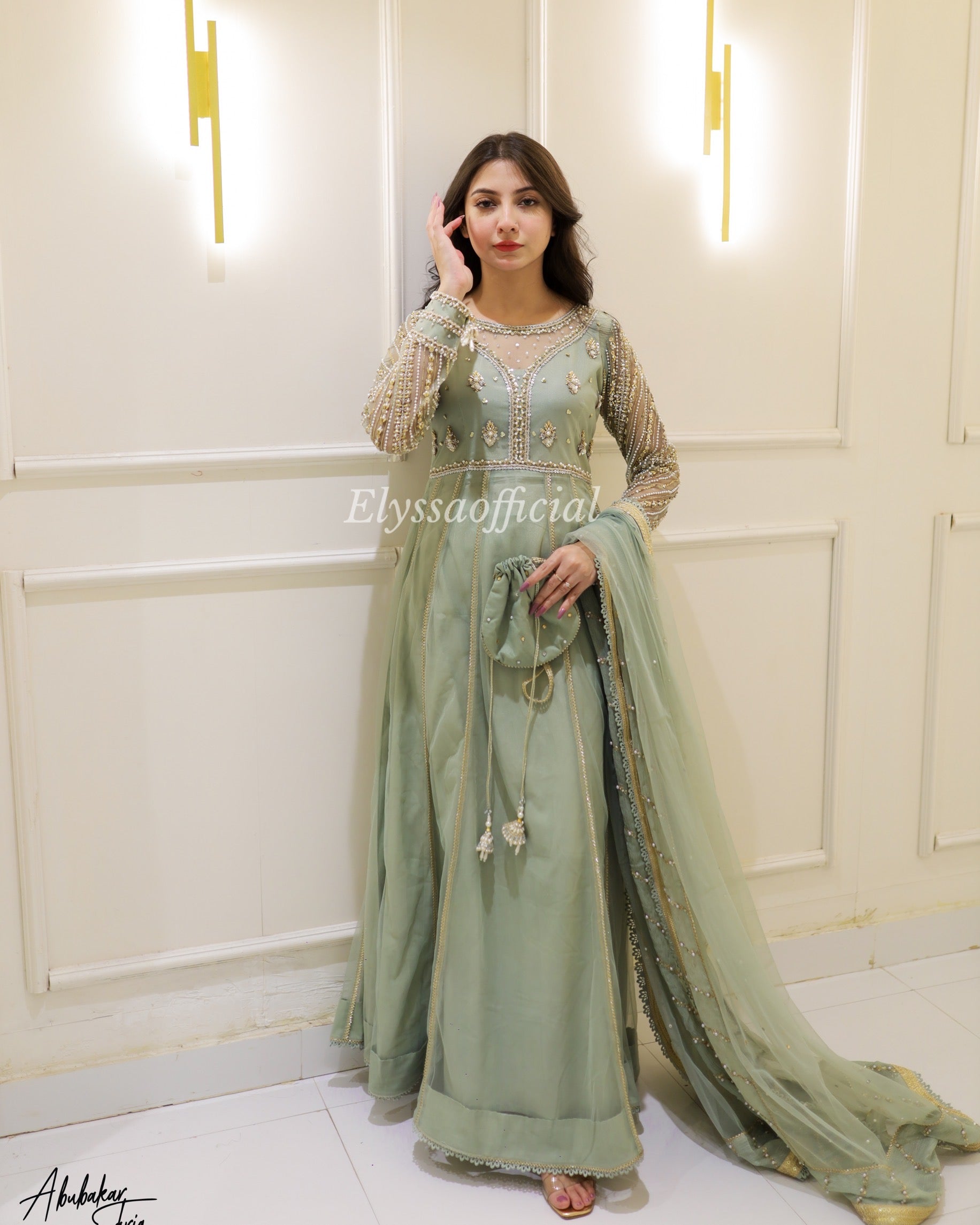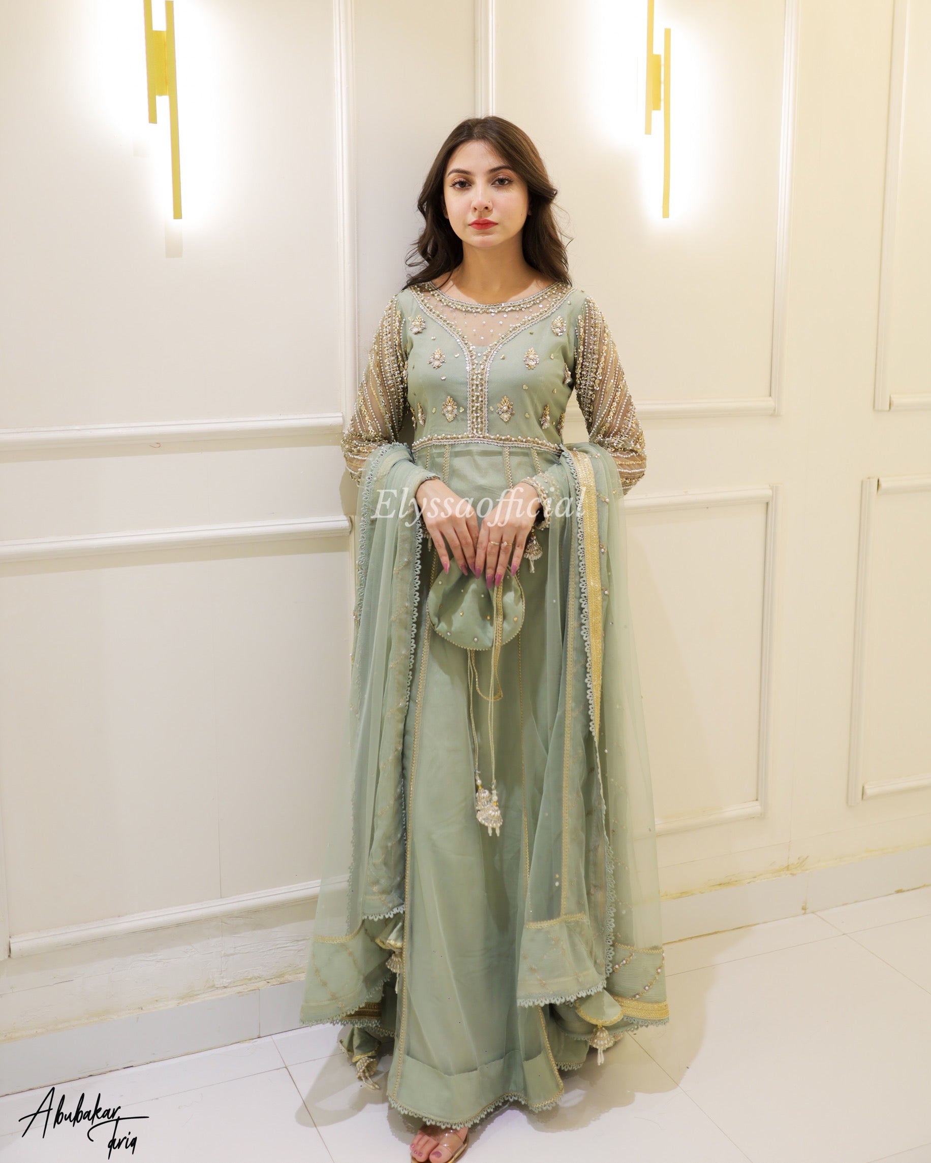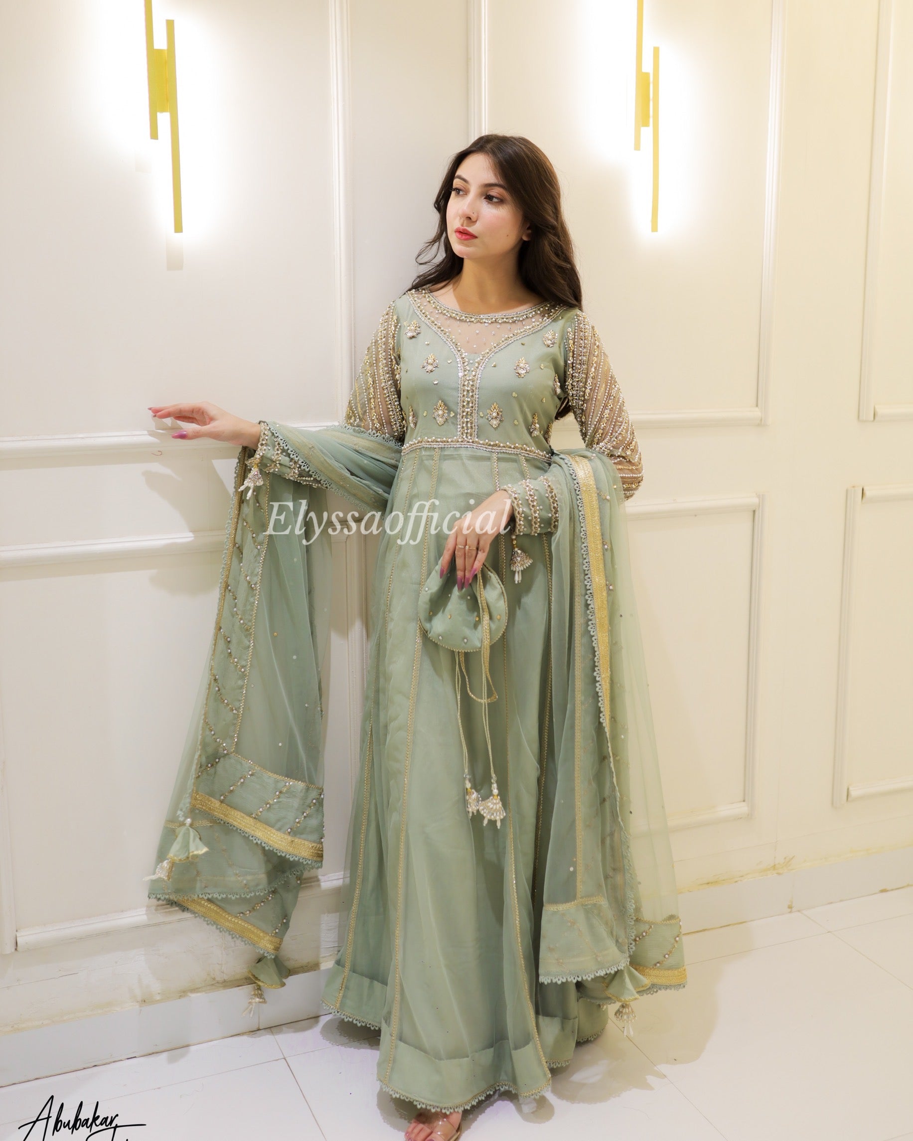 Beautiful shade of light dusky green; elegant long dress adorned with heavy thin lines of handwork all around the sleeves and neco and bodice. Close ups of the work is shown in some pictures; super pretty