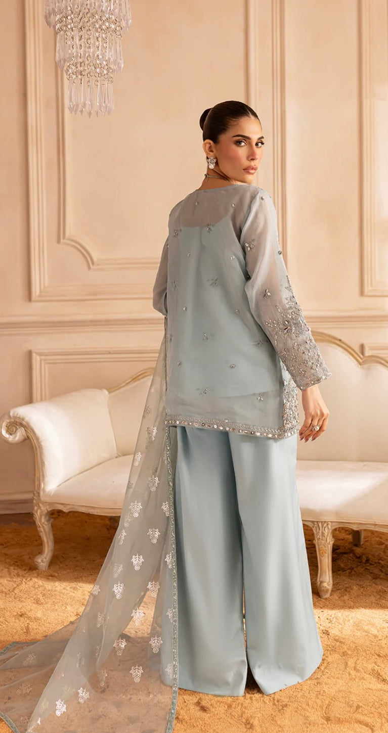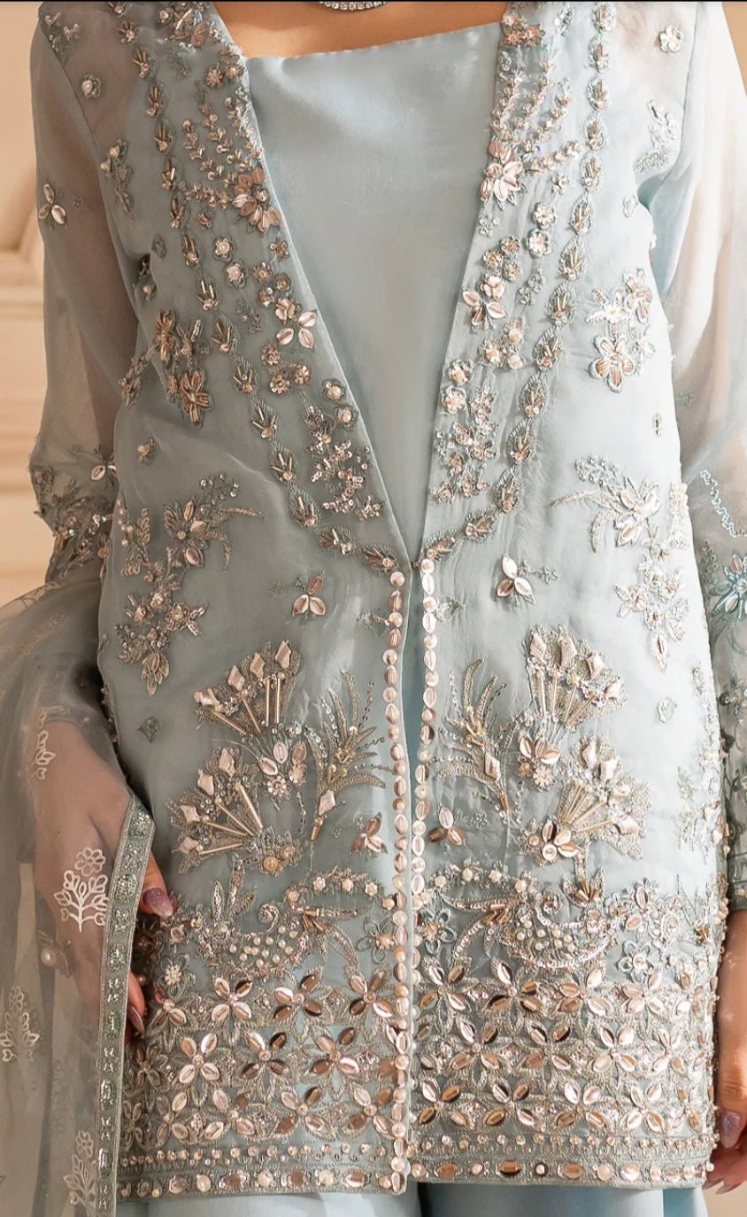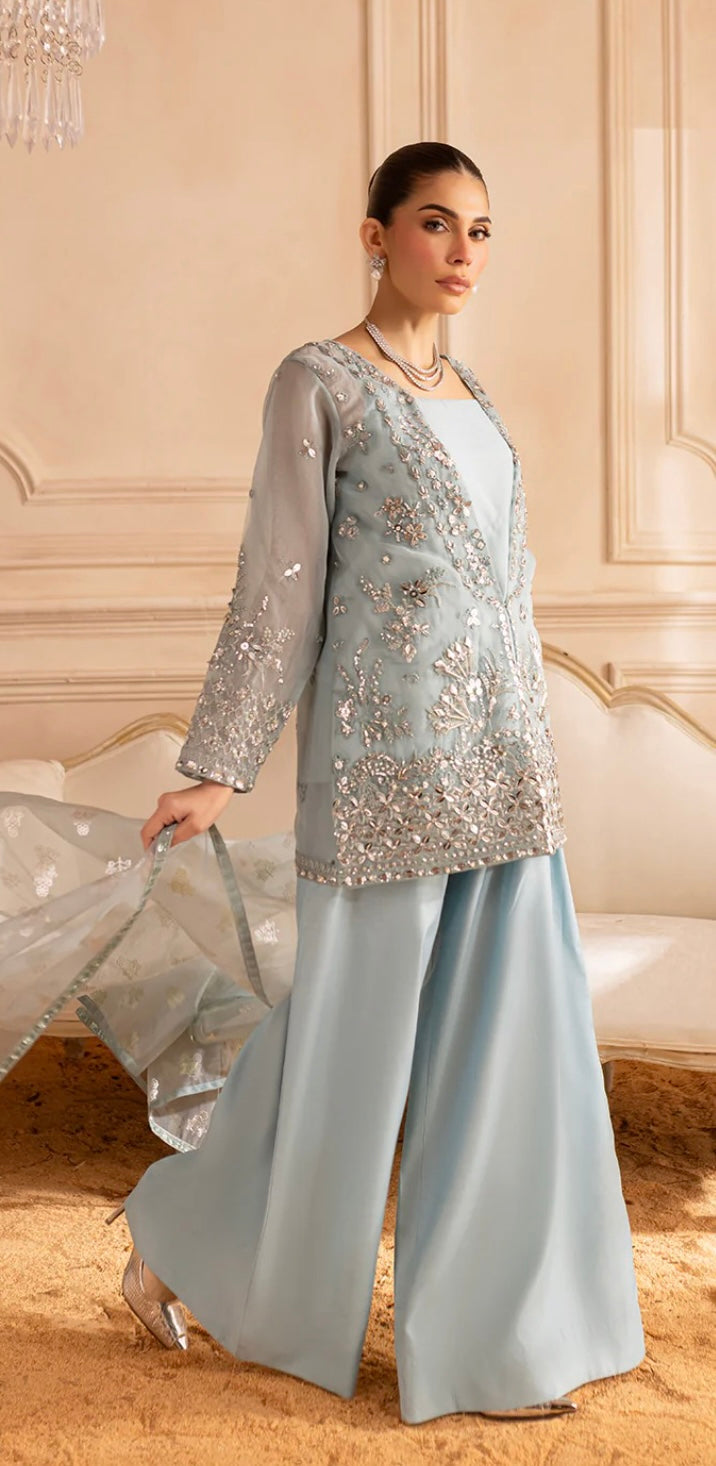 Ice blue embroidered wrap shirt with delicate hand embellishments, paired with plazo pants , foil print dupatta and a separate raw silk blouse