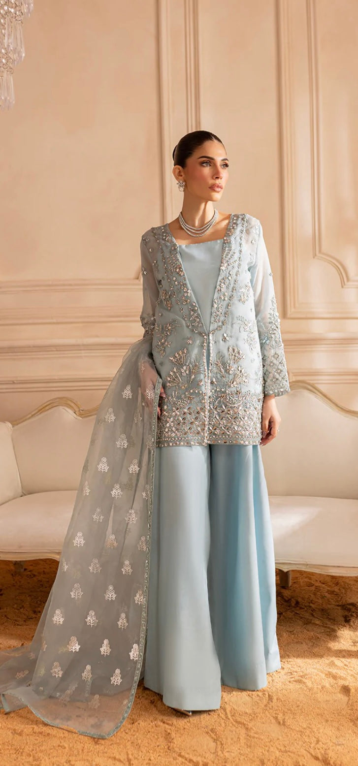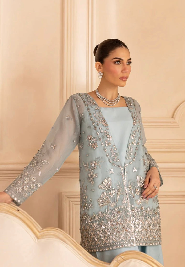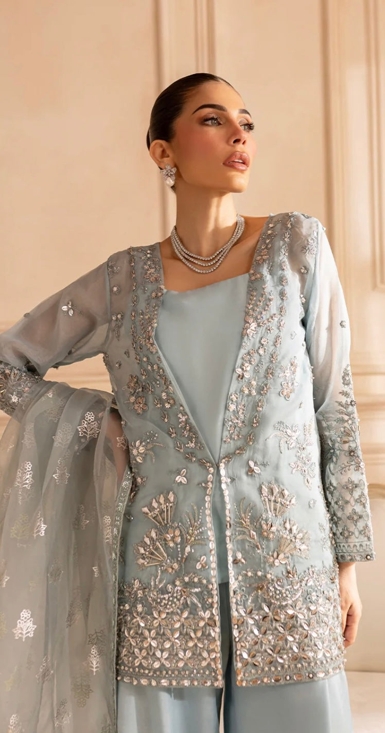 Ice blue embroidered wrap shirt with delicate hand embellishments, paired with plazo pants , foil print dupatta and a separate raw silk blouse