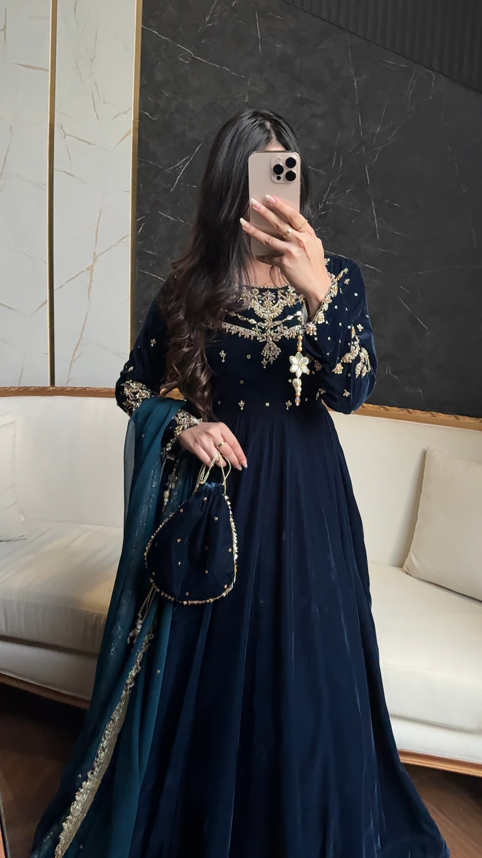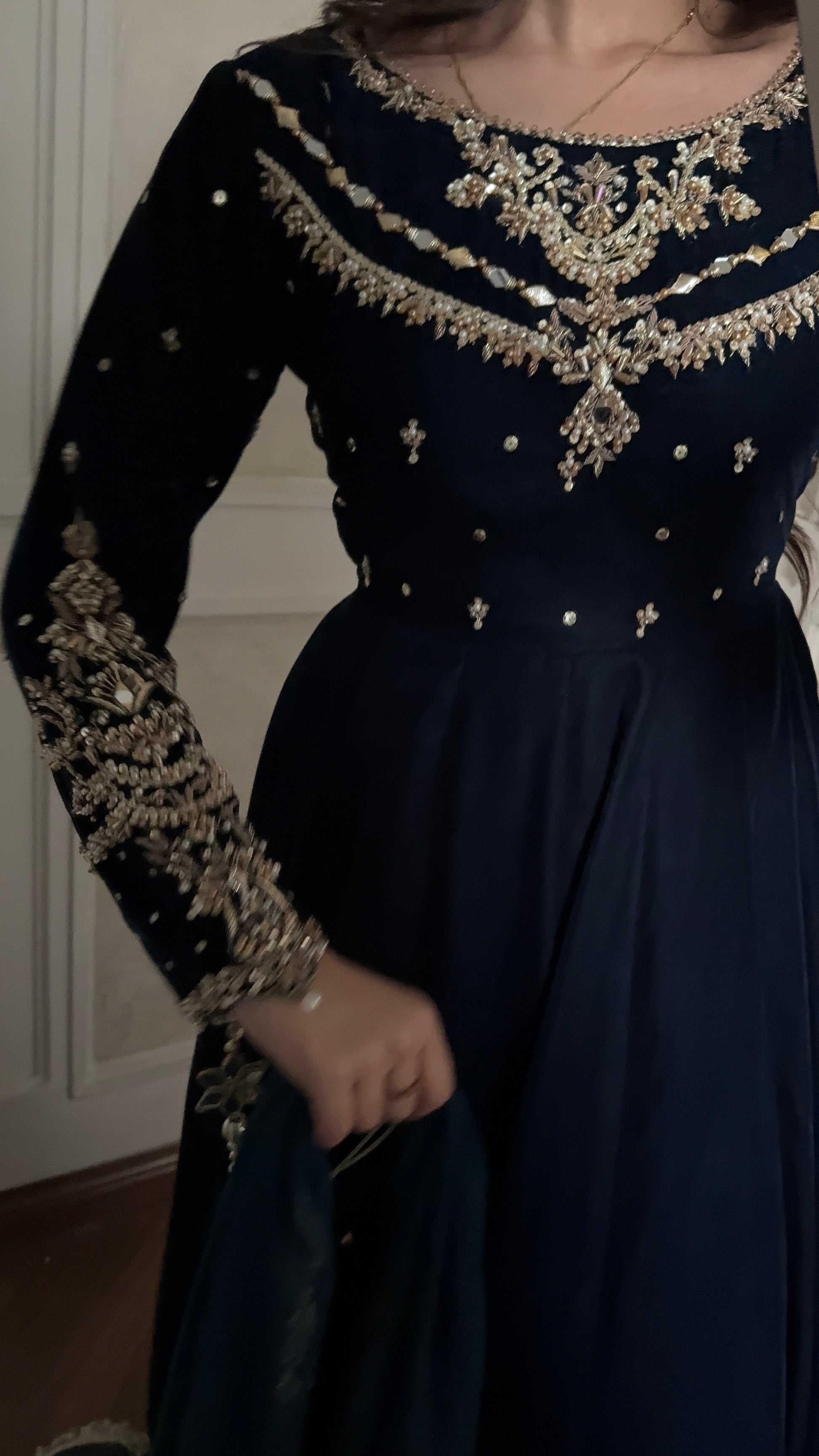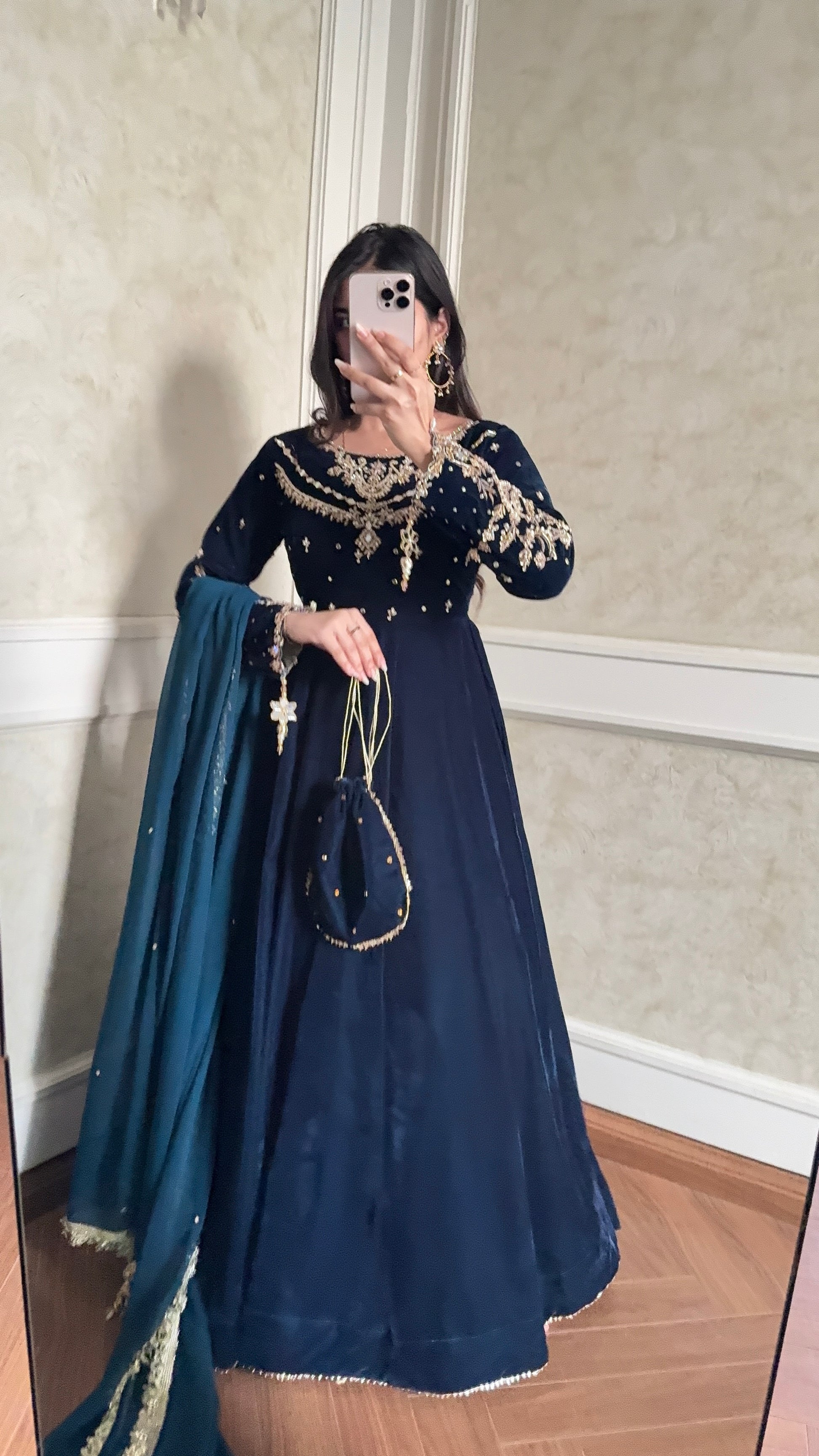A unique blue teal mix shade luxurious soft velvet. The maxi has so much flare, and very regal. The bodice is all handwork with motif chan and the sleeves has handwork and handmade tassles