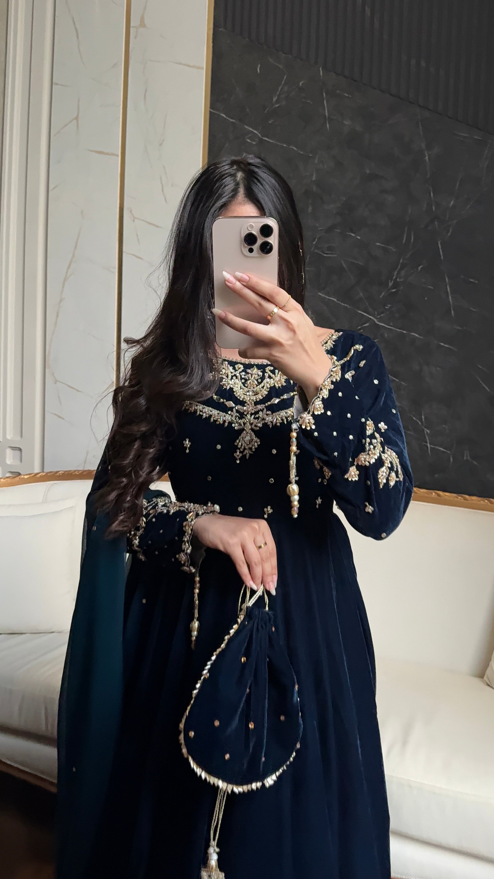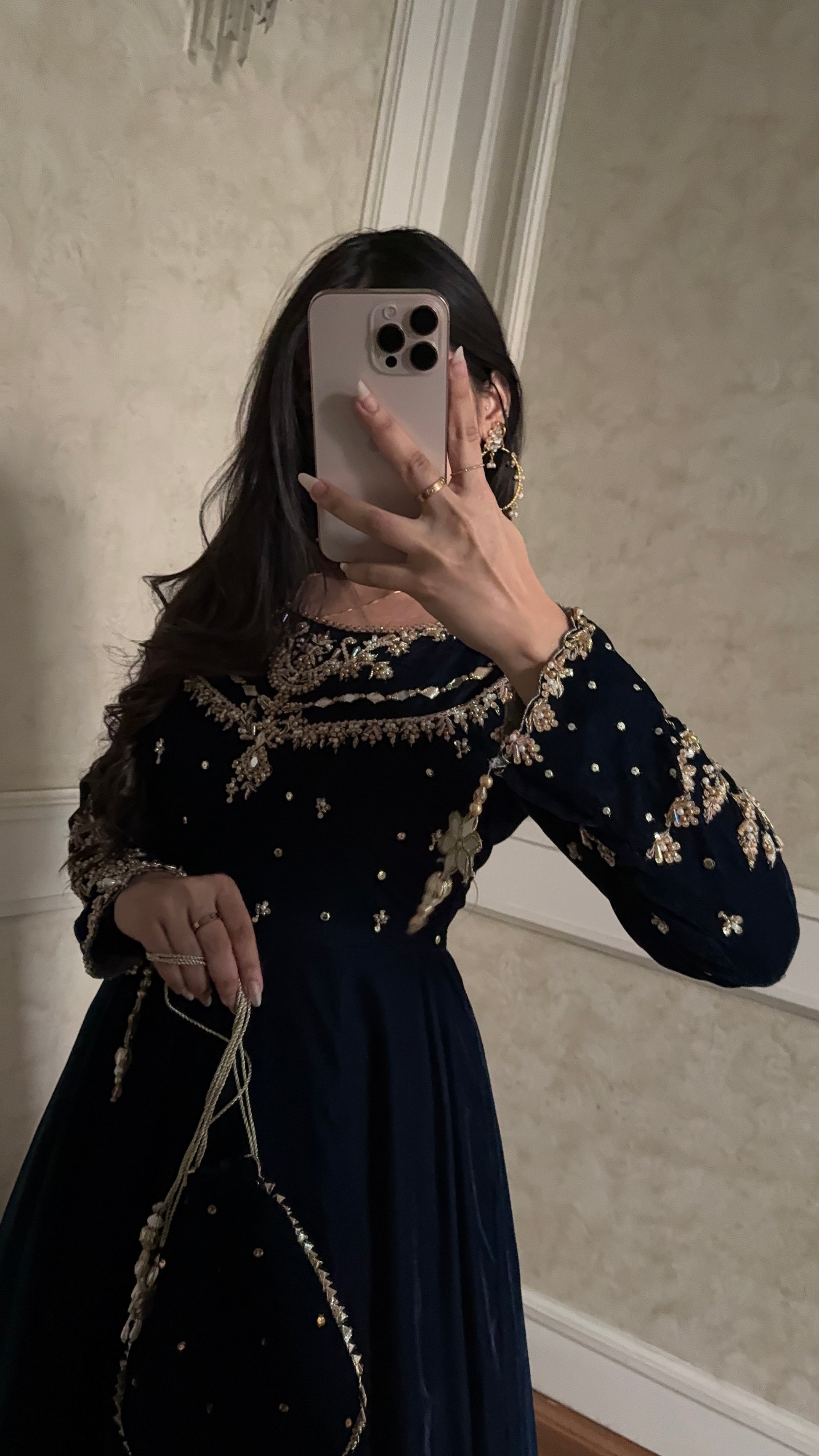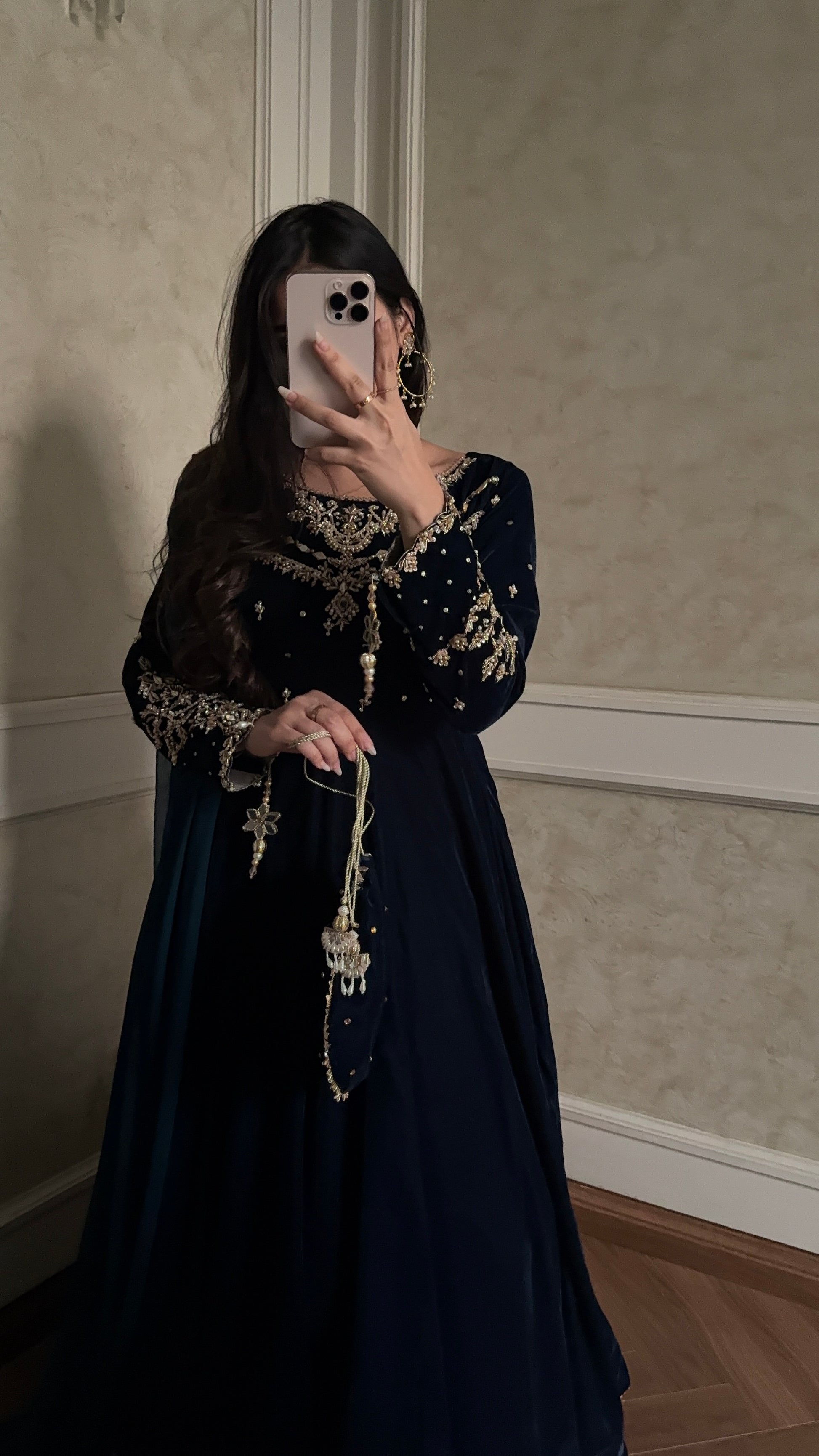 A unique blue teal mix shade luxurious soft velvet. The maxi has so much flare, and very regal. The bodice is all handwork with motif chan and the sleeves has handwork and handmade tassles