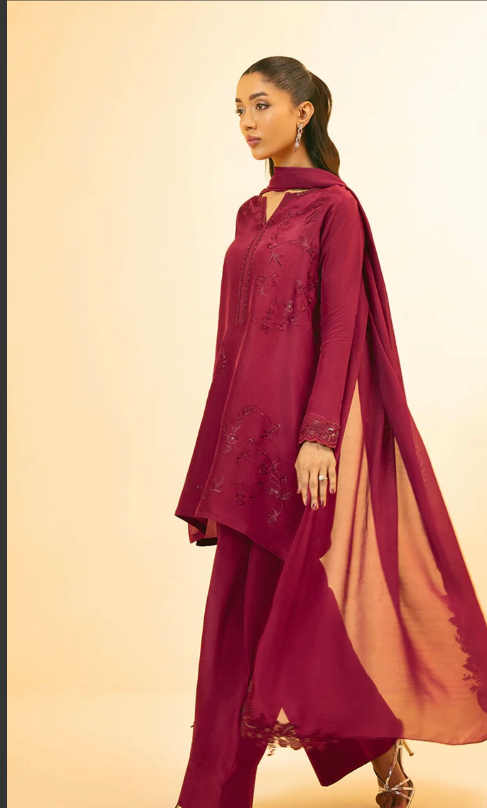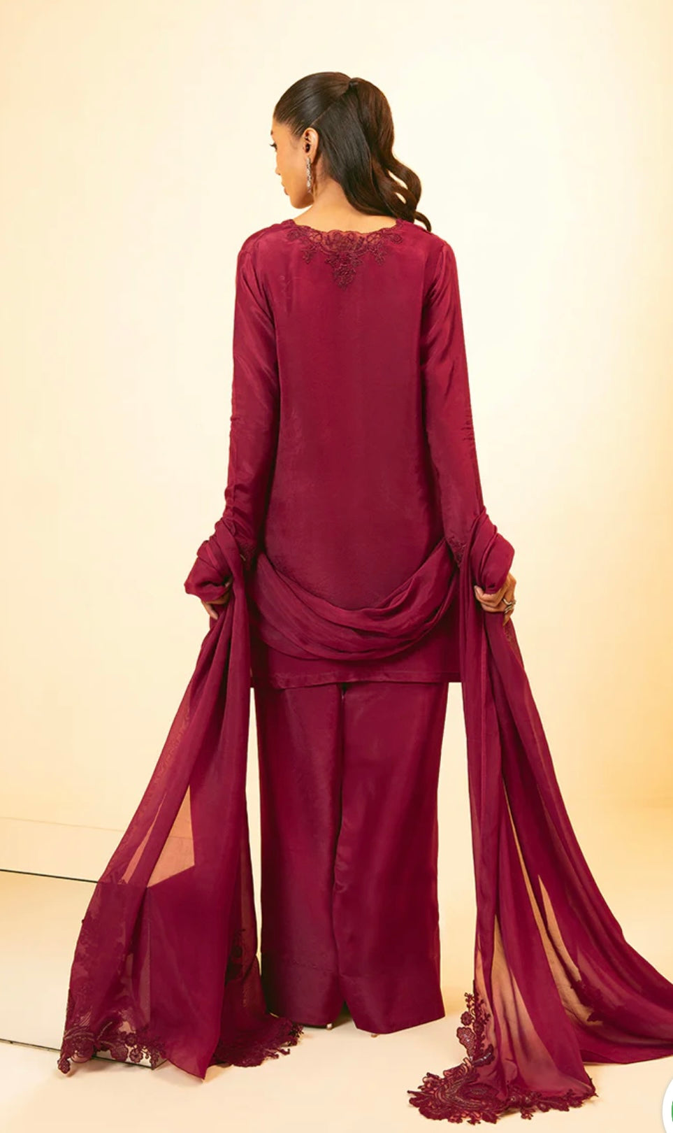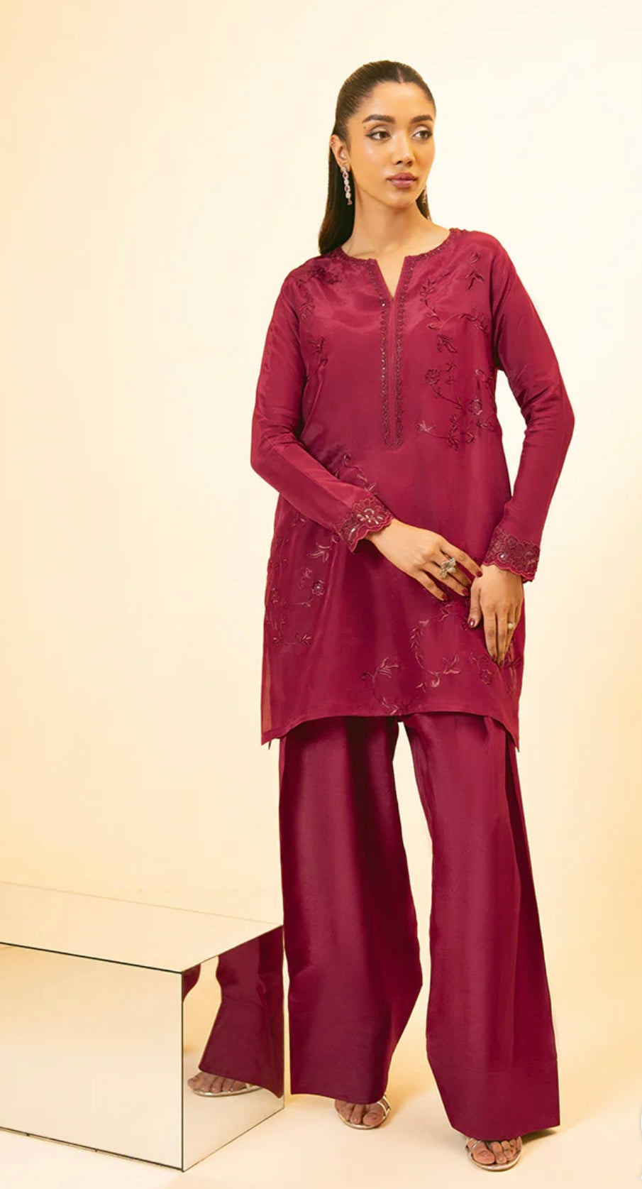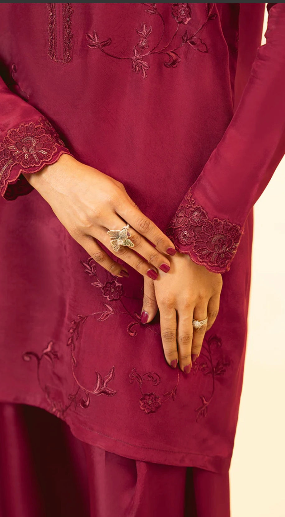 Let’s get you into this season's craze: the Gold Farshi set! An embroidered short shirt and signature farshi shalwar are enhanced by a medium silk dupatta featuring meticulously embroidered patches. Perfect choice for your Eid gatherings.