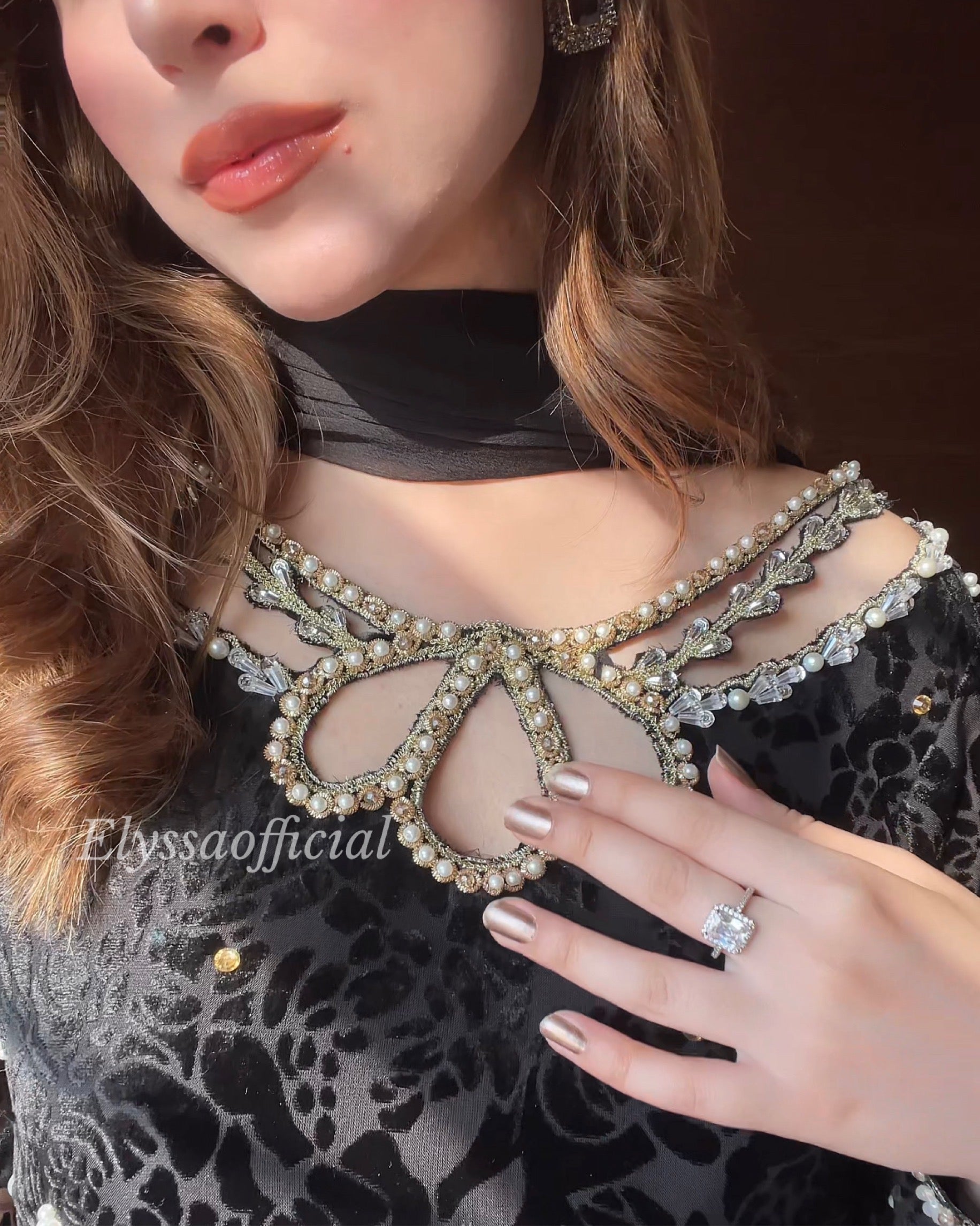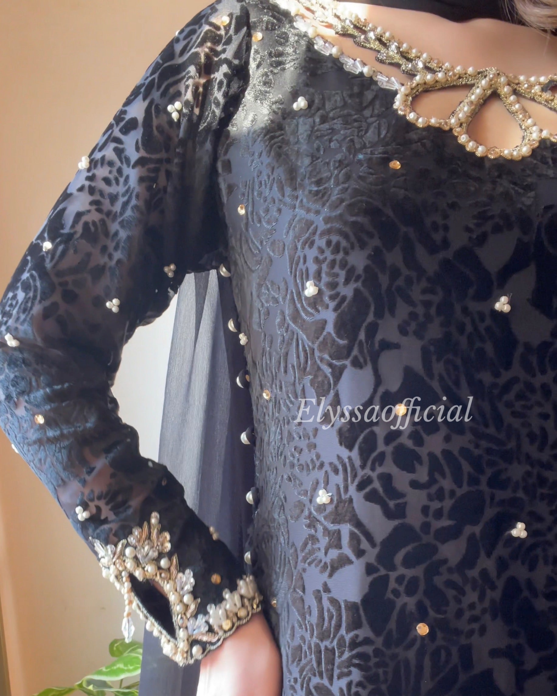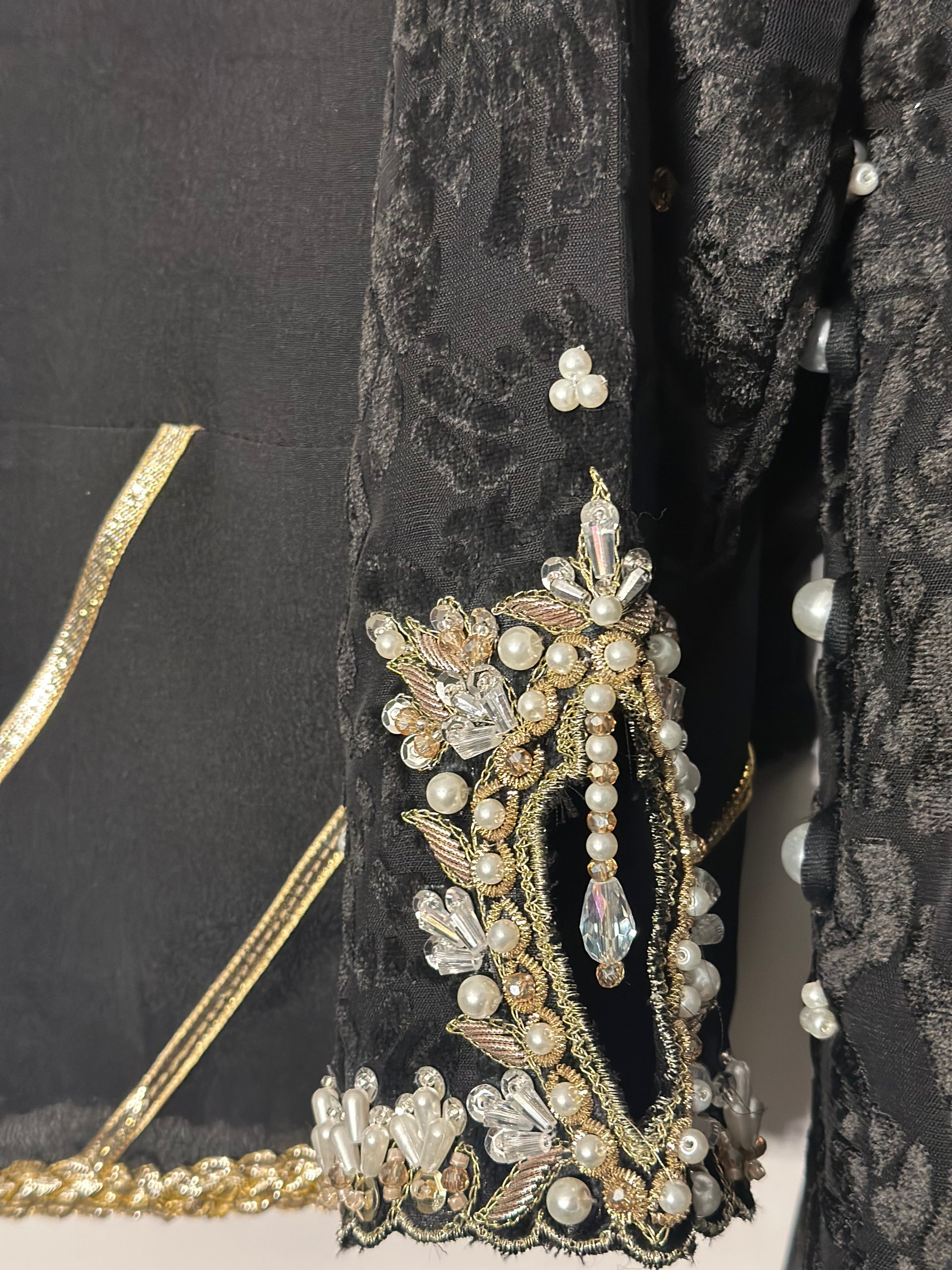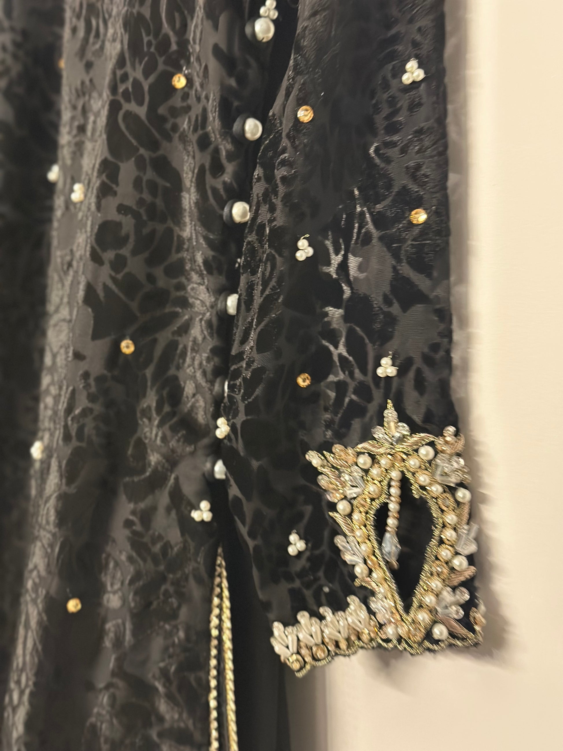Luxurious black palachi which is classic and elegant and all seasonal. beautiful Cutwork hand work neckline with a keyhole sleeves with pearl tassle dangling.