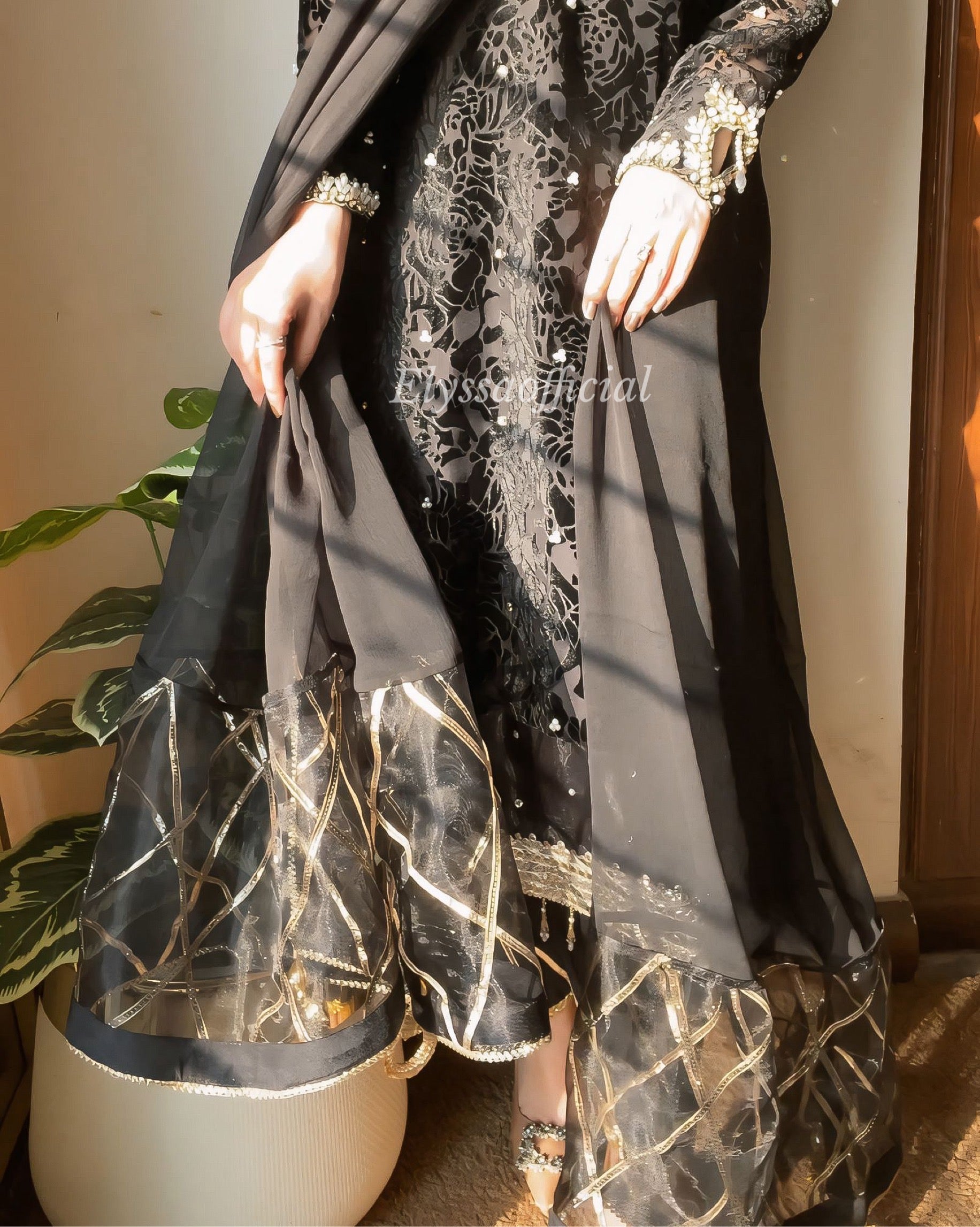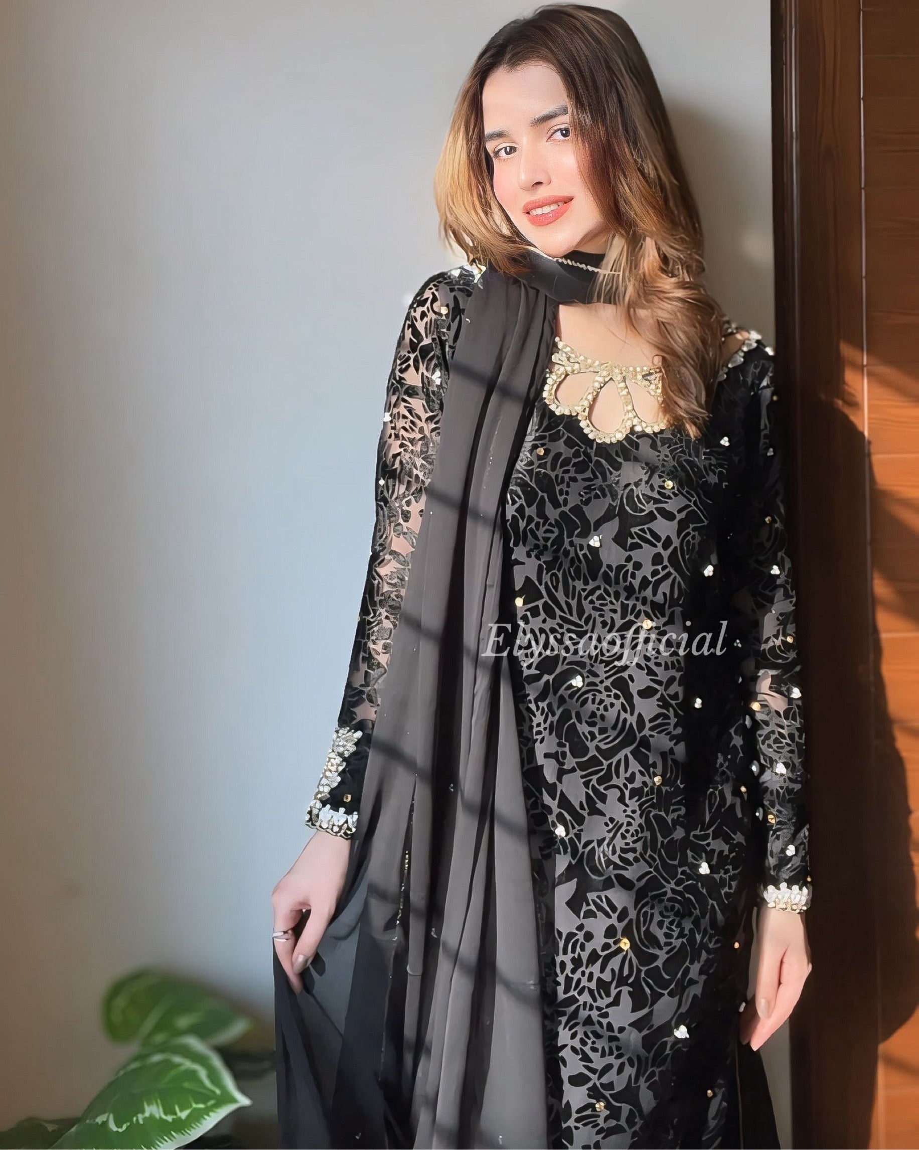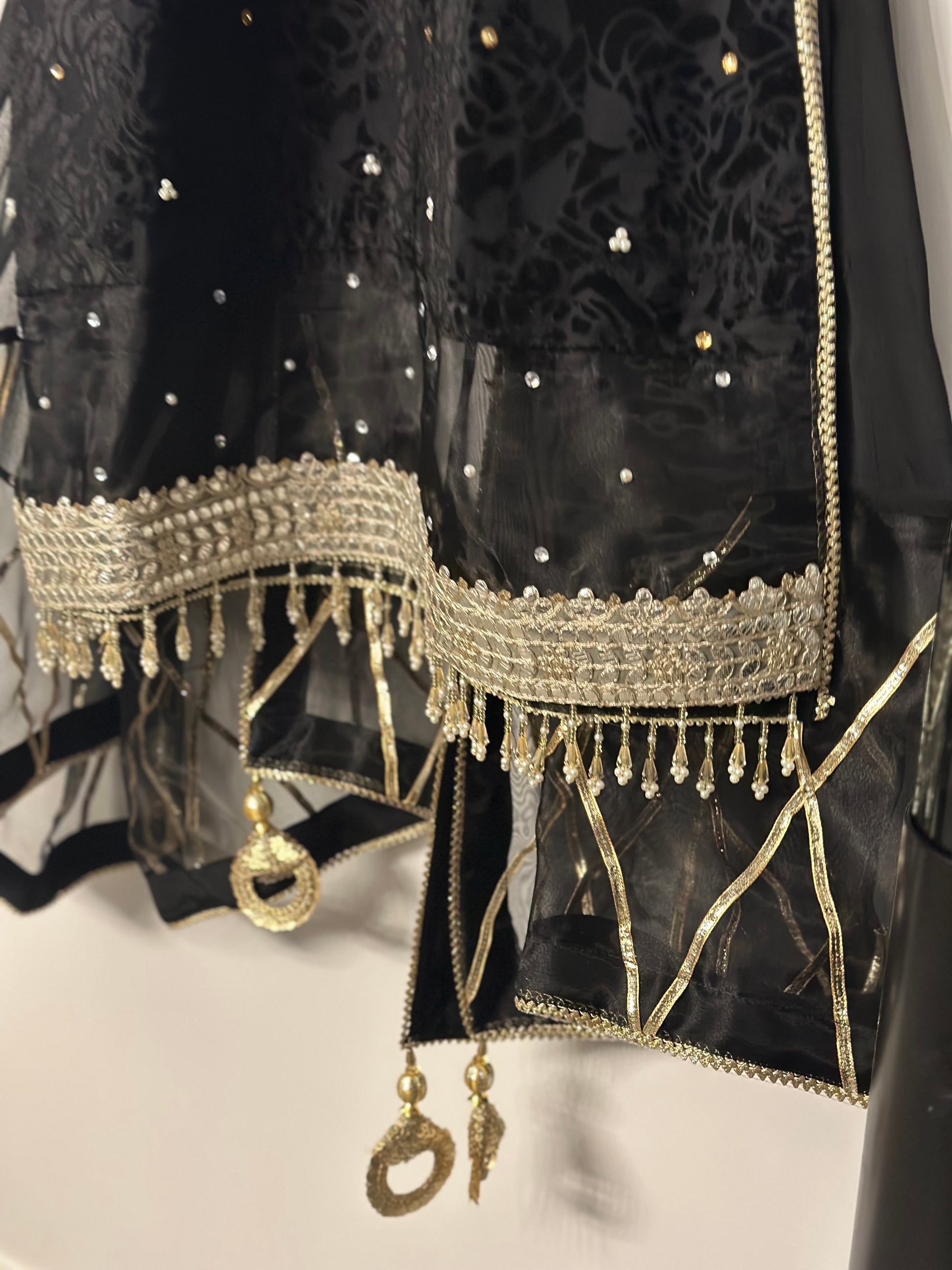 Luxurious black palachi which is classic and elegant and all seasonal. beautiful Cutwork hand work neckline with a keyhole sleeves with pearl tassle dangling.
