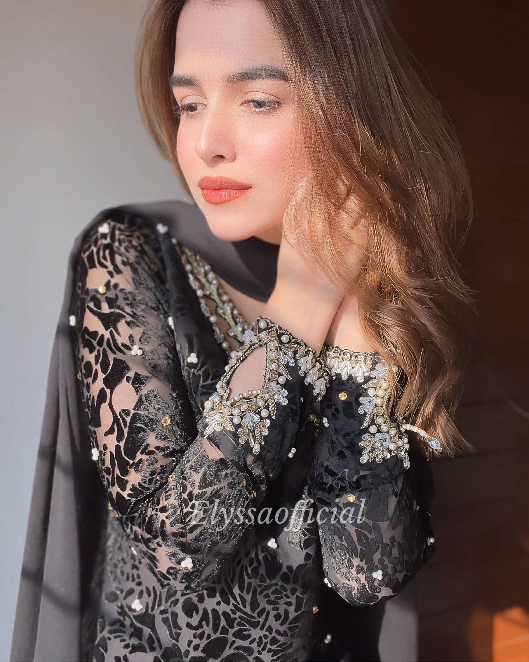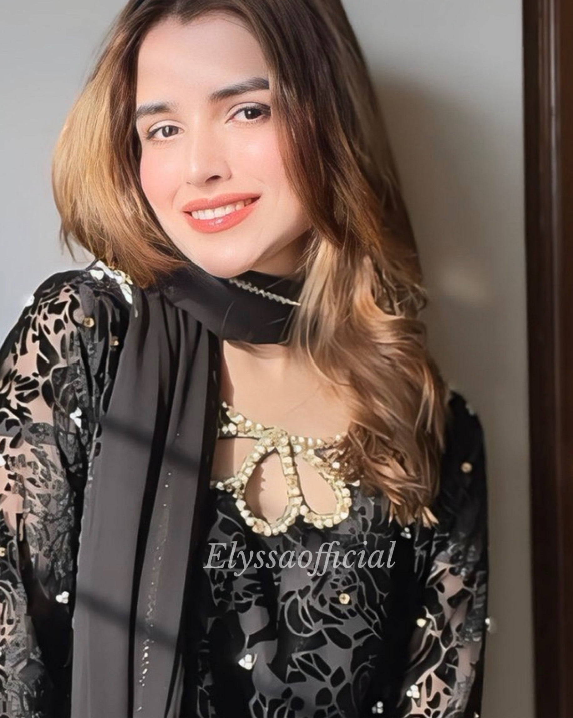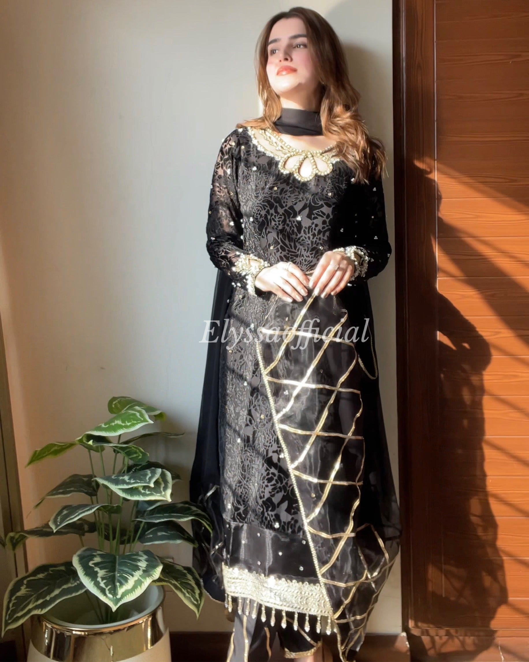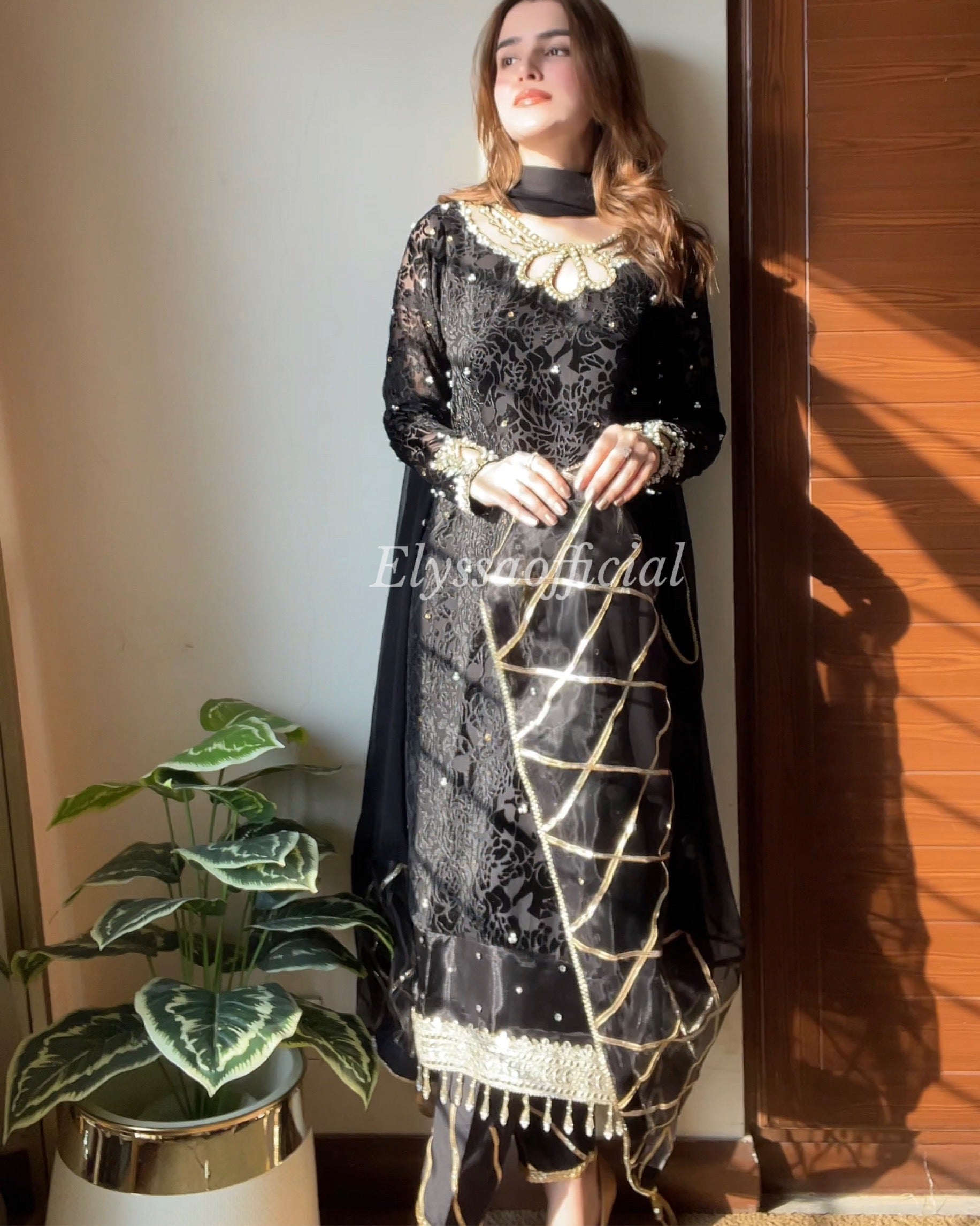 Luxurious black palachi which is classic and elegant and all seasonal. beautiful Cutwork hand work neckline with a keyhole sleeves with pearl tassle dangling.