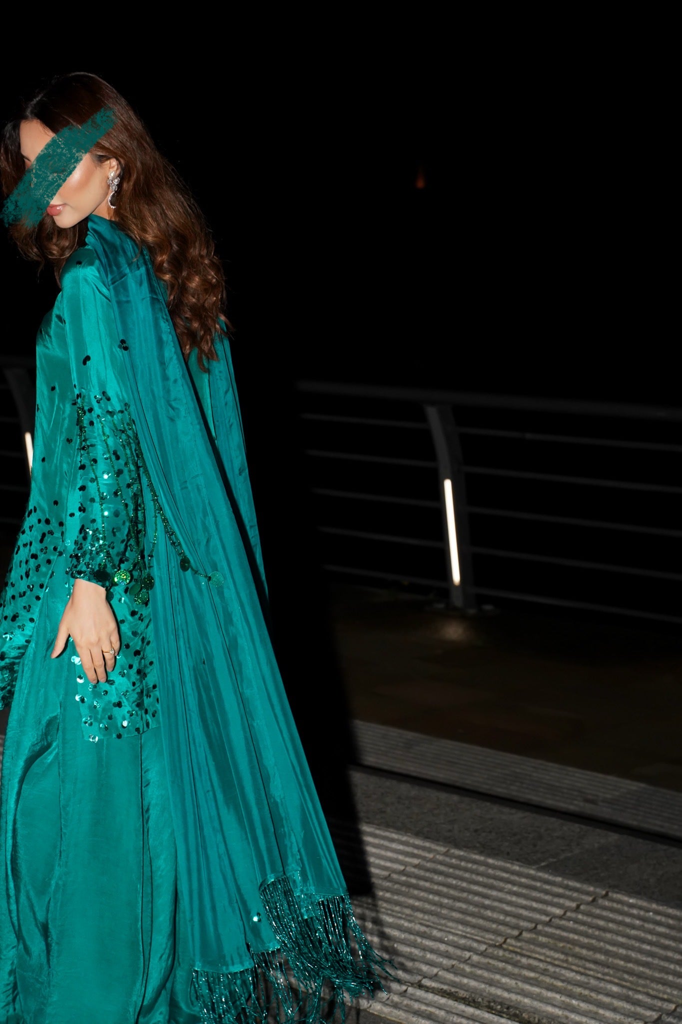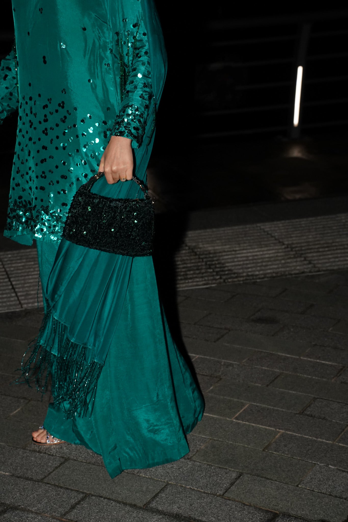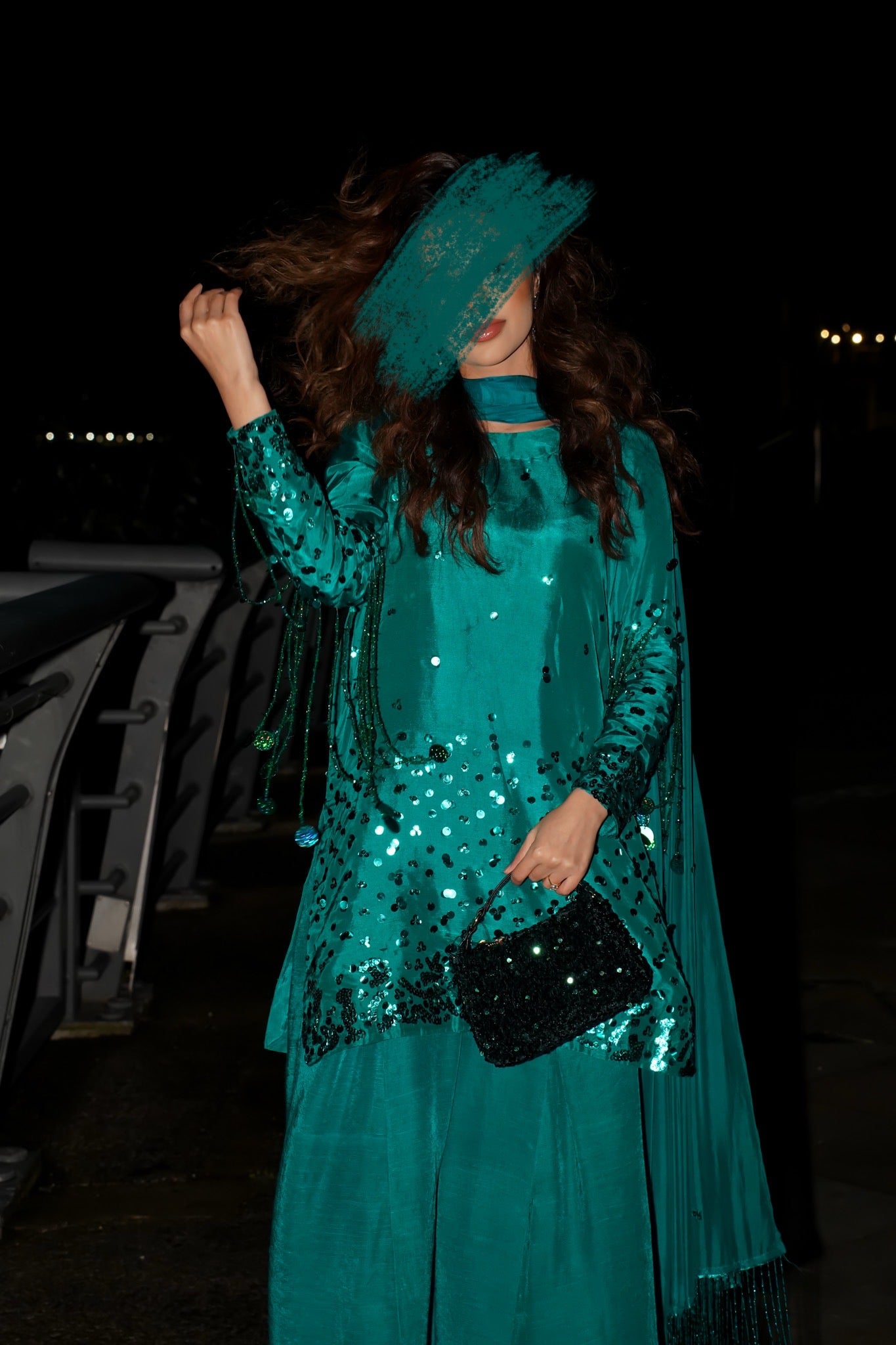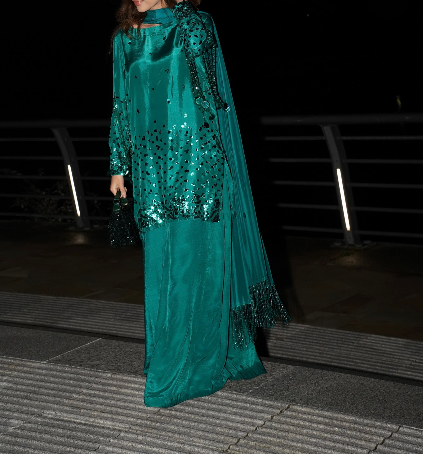 Flowy silk with hand sequins work and a stunning Hussain rehar inspired sleeves sequin tassles feature which really stands out