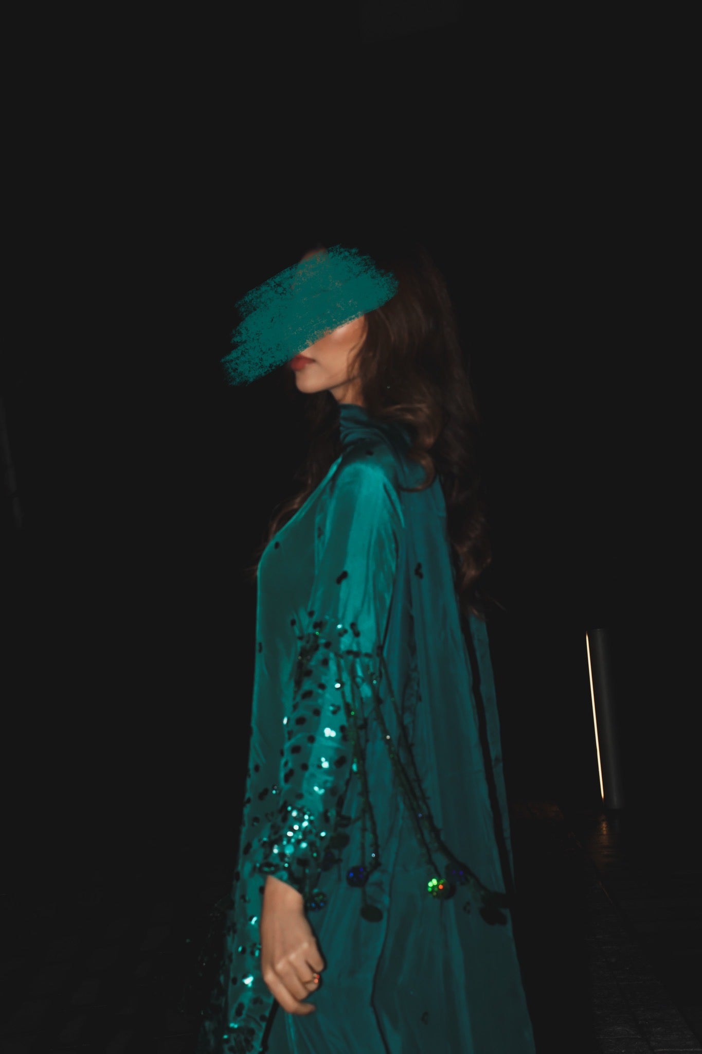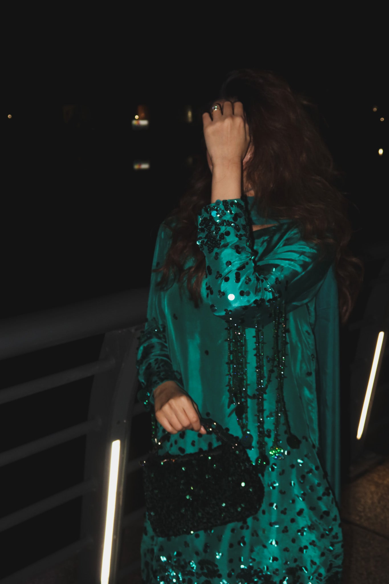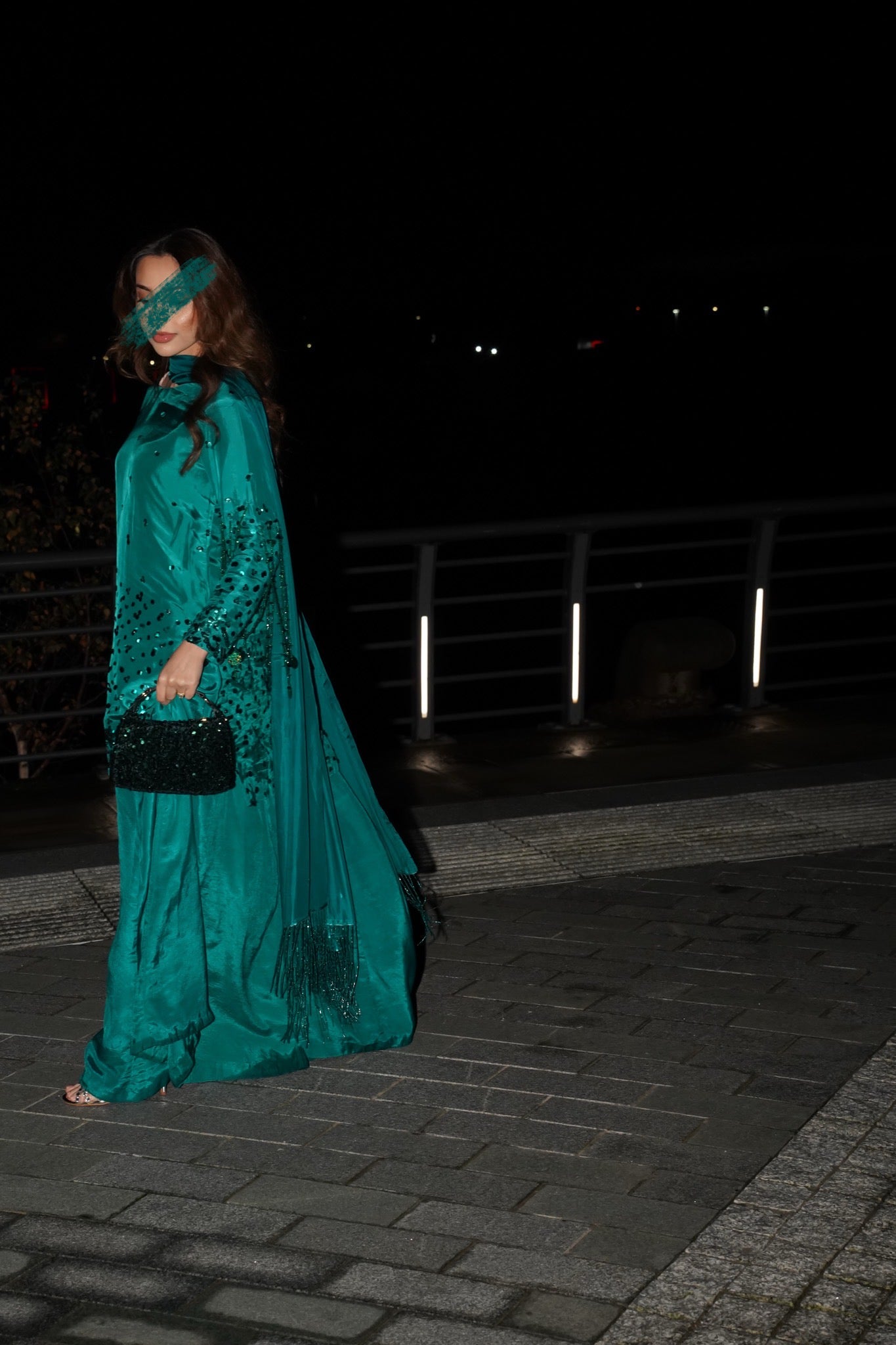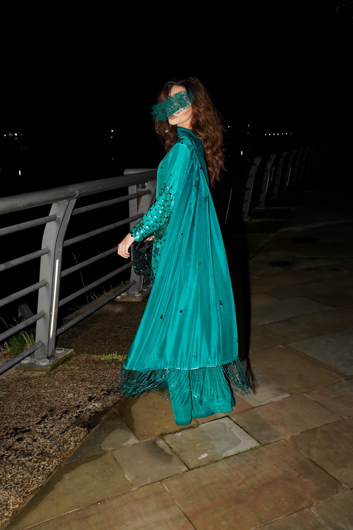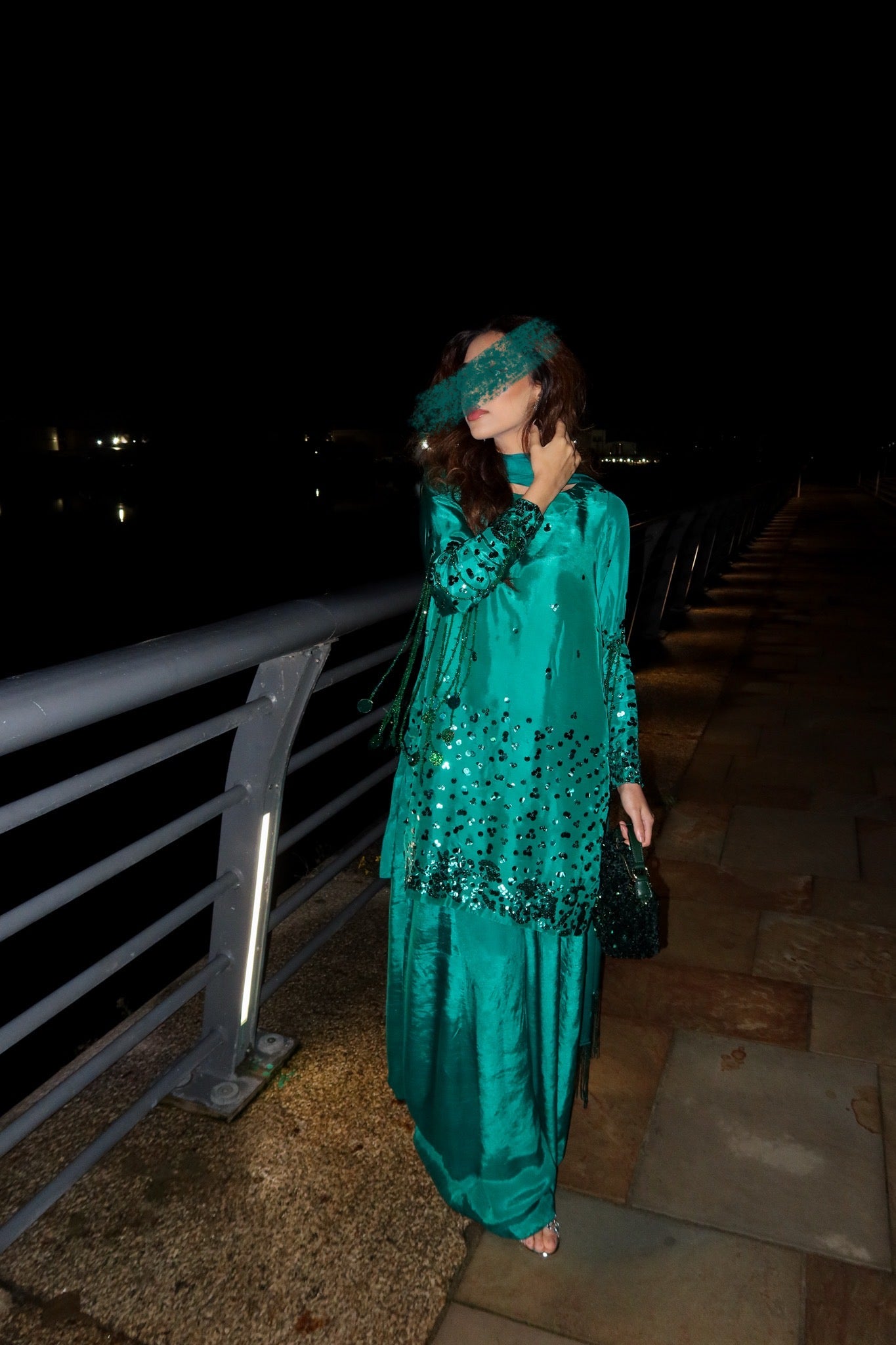 Flowy silk with hand sequins work and a stunning Hussain rehar inspired sleeves sequin tassles feature which really stands out