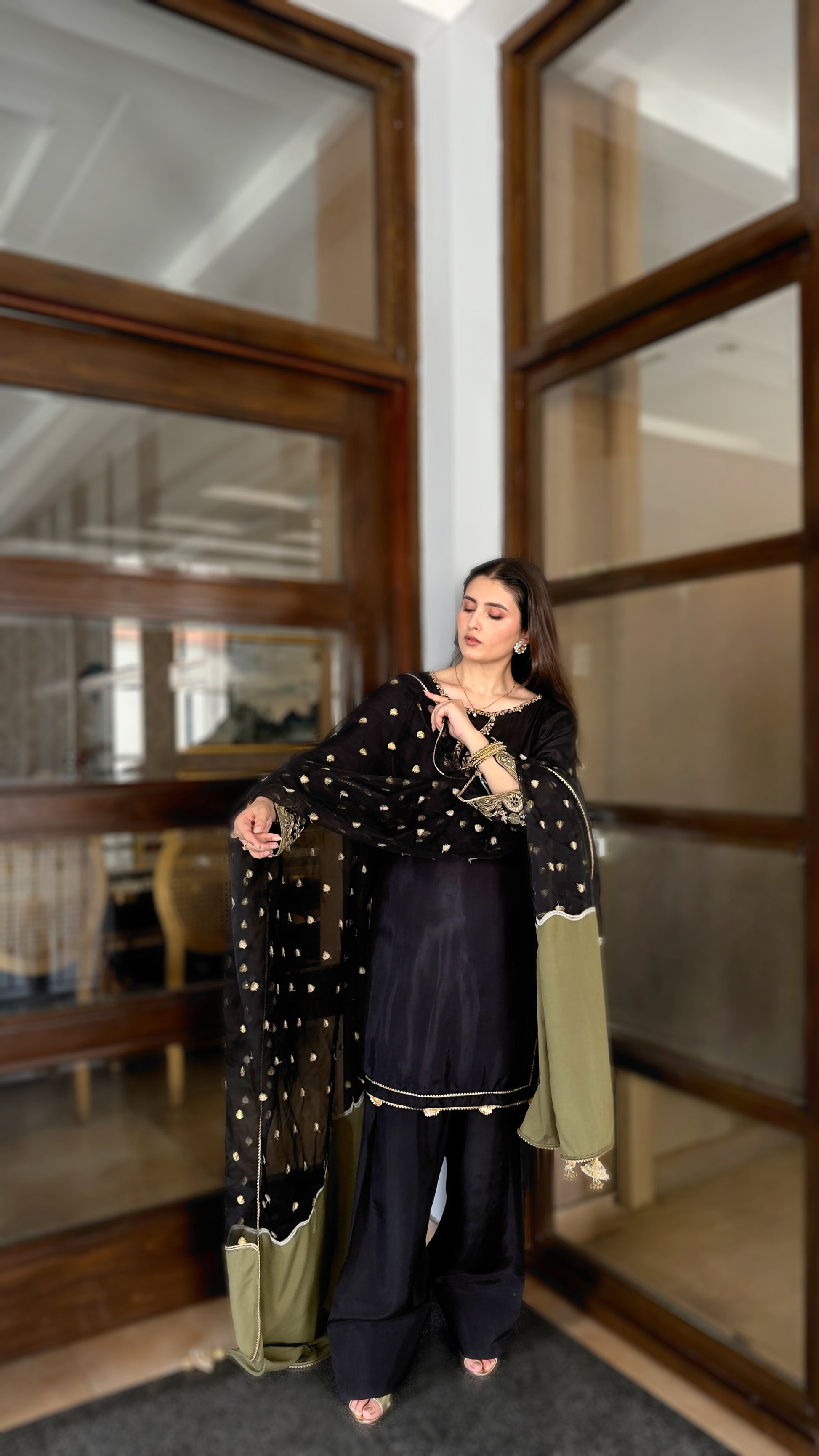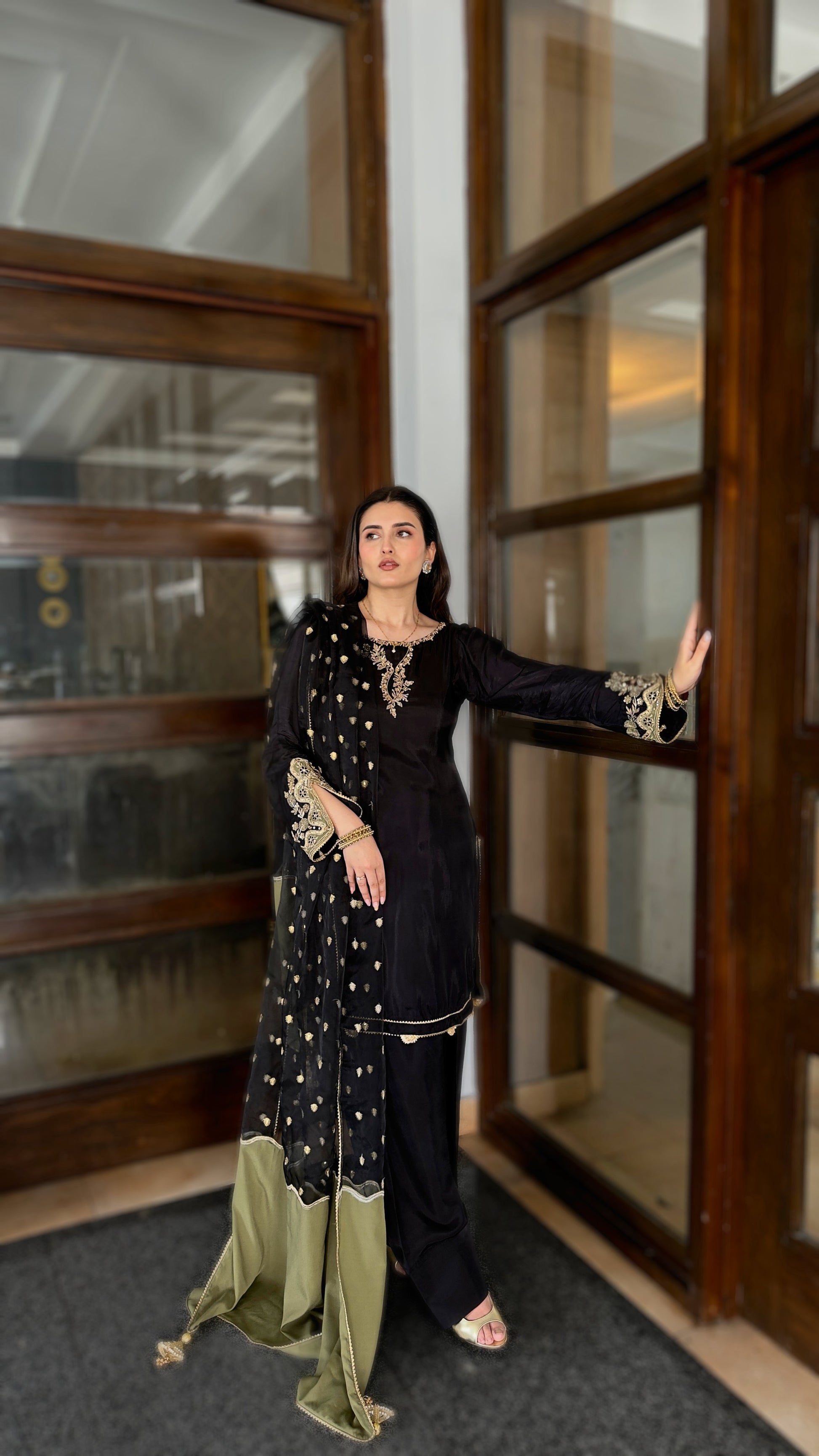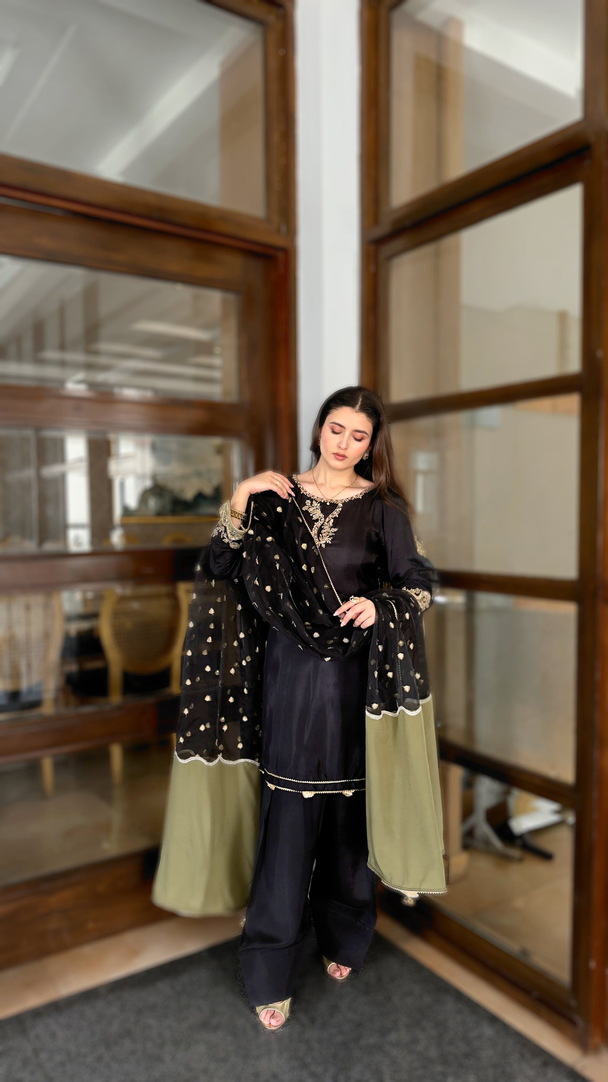 Stylish shalwar and a statement style dupatta embroidered organza with pallu detailing in the olive colour