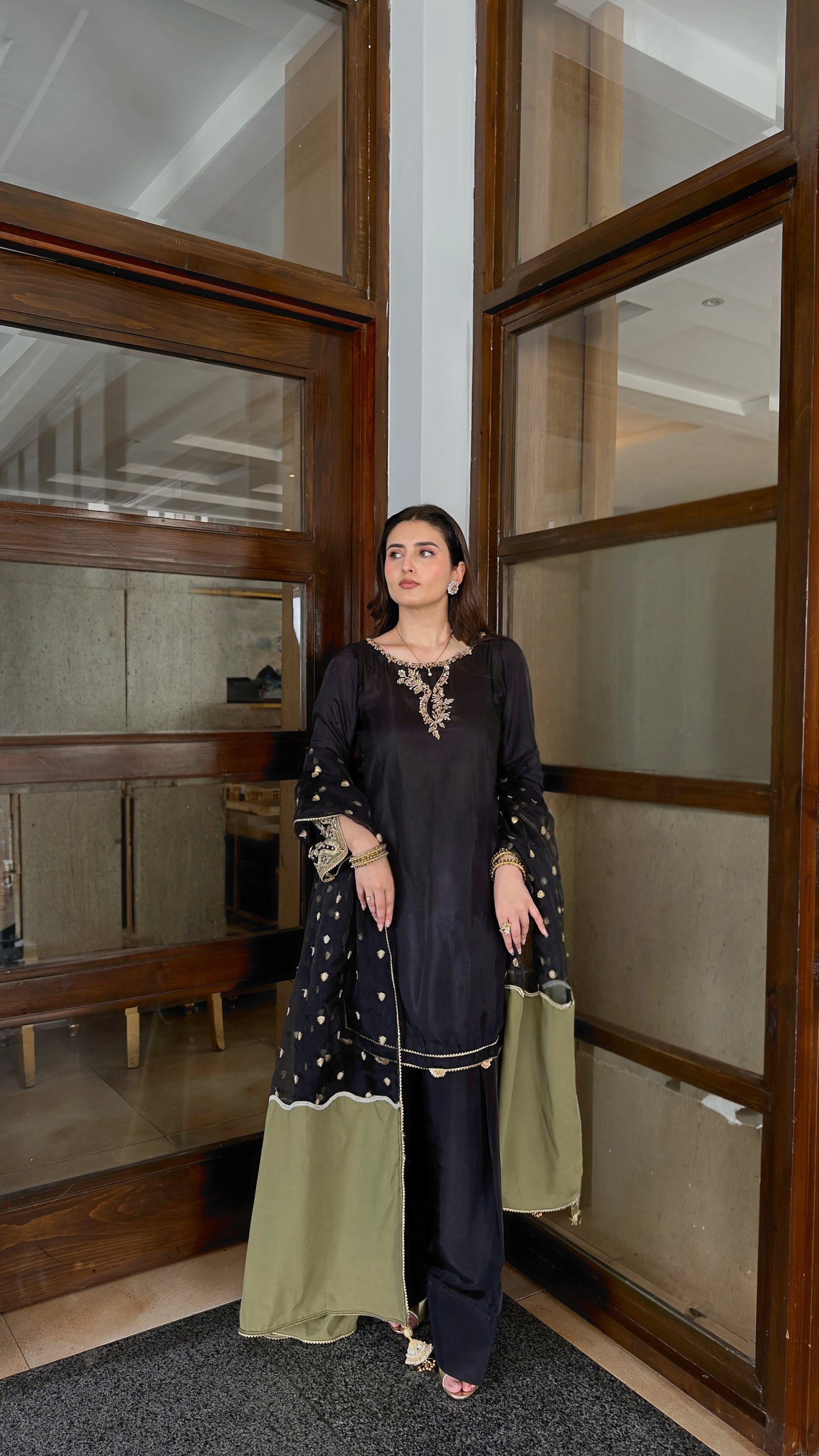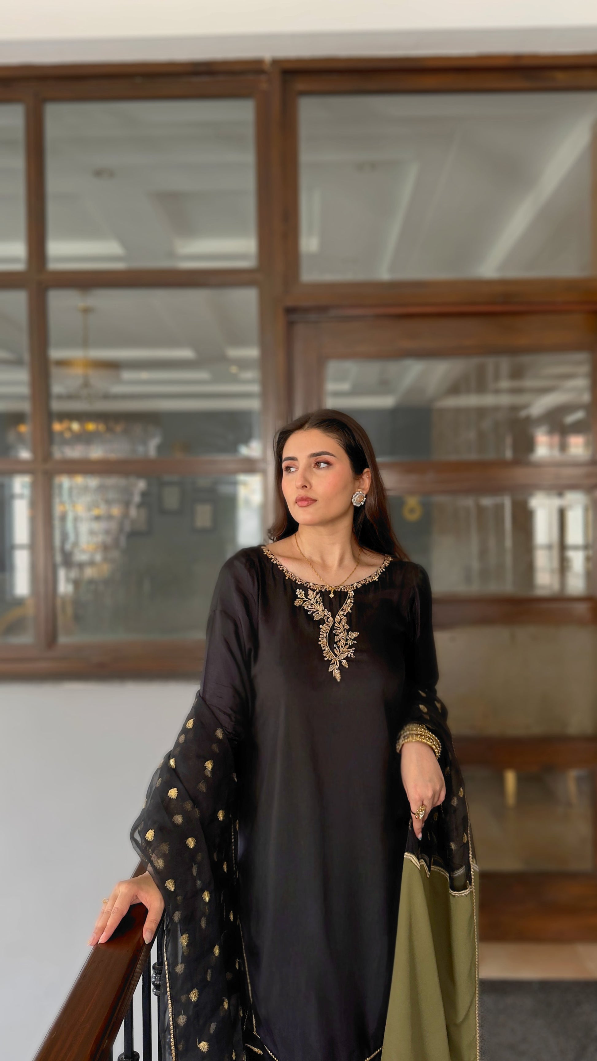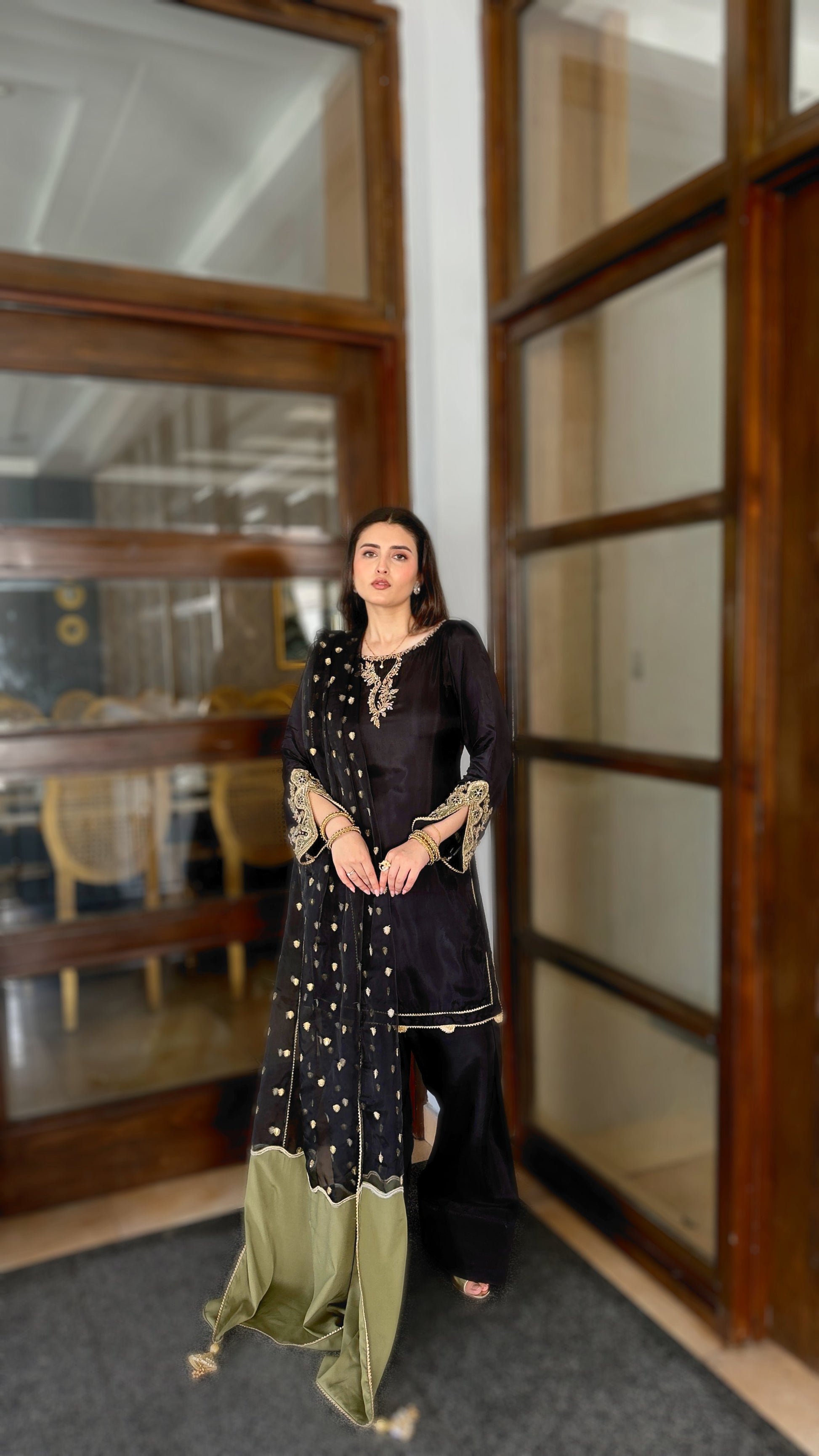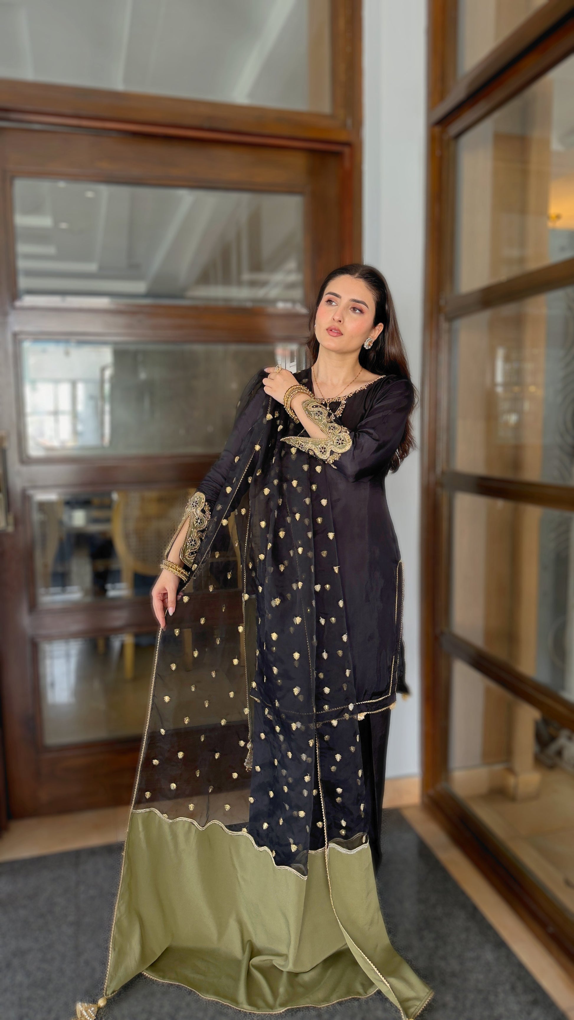 Stylish shalwar and a statement style dupatta embroidered organza with pallu detailing in the olive colour