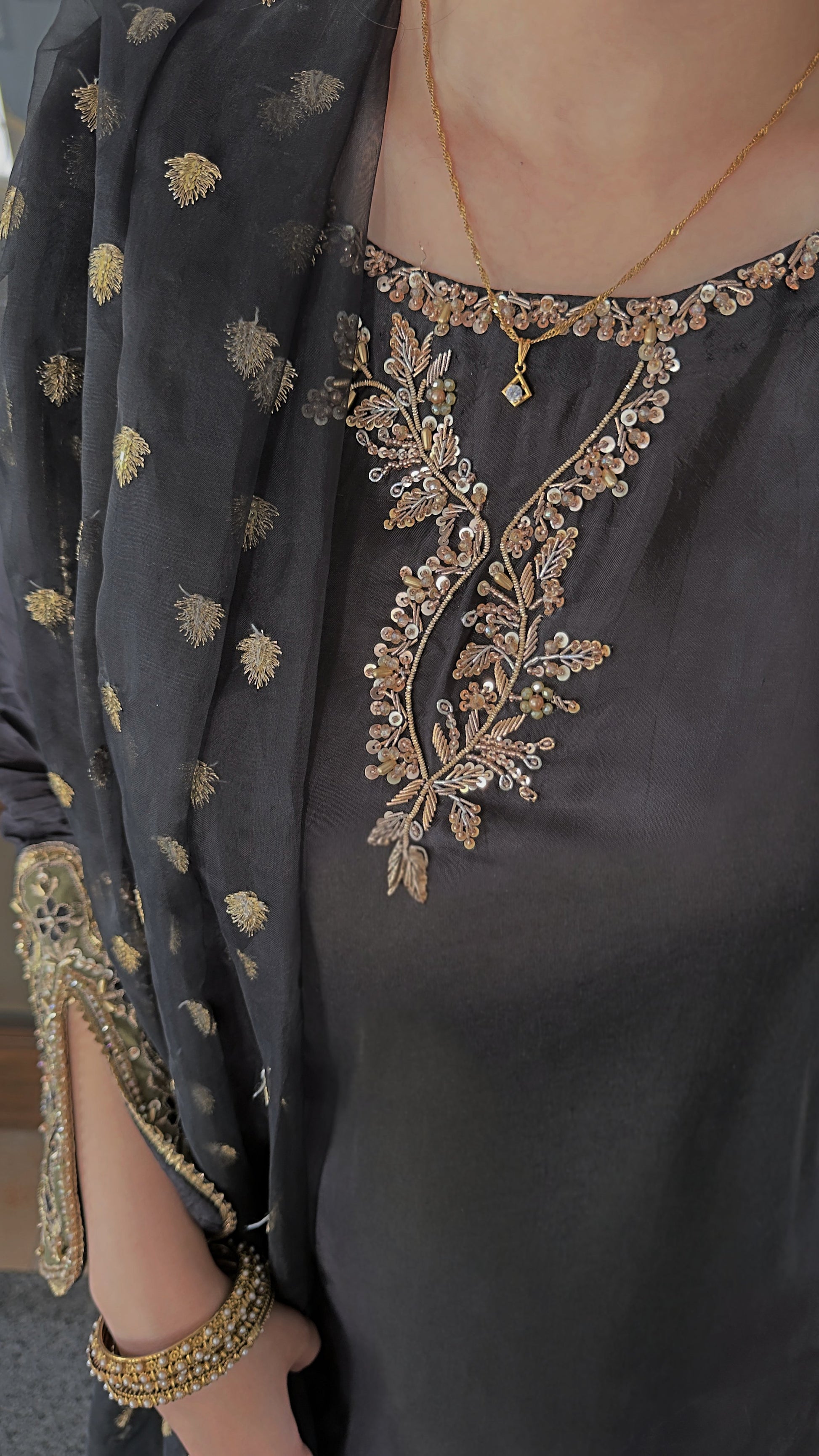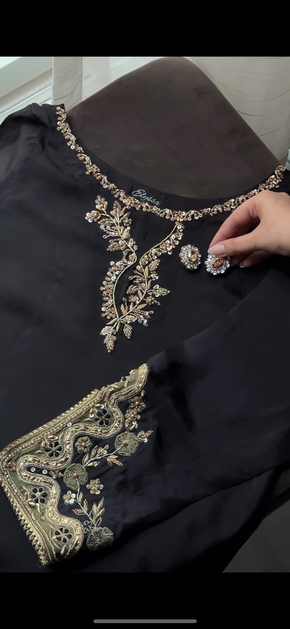 Stunning combination of 2 beautiful shades that’s incorporated into the whole design. The sleeves are heavy hand work with so much detailing finished off with lace and gota on the end