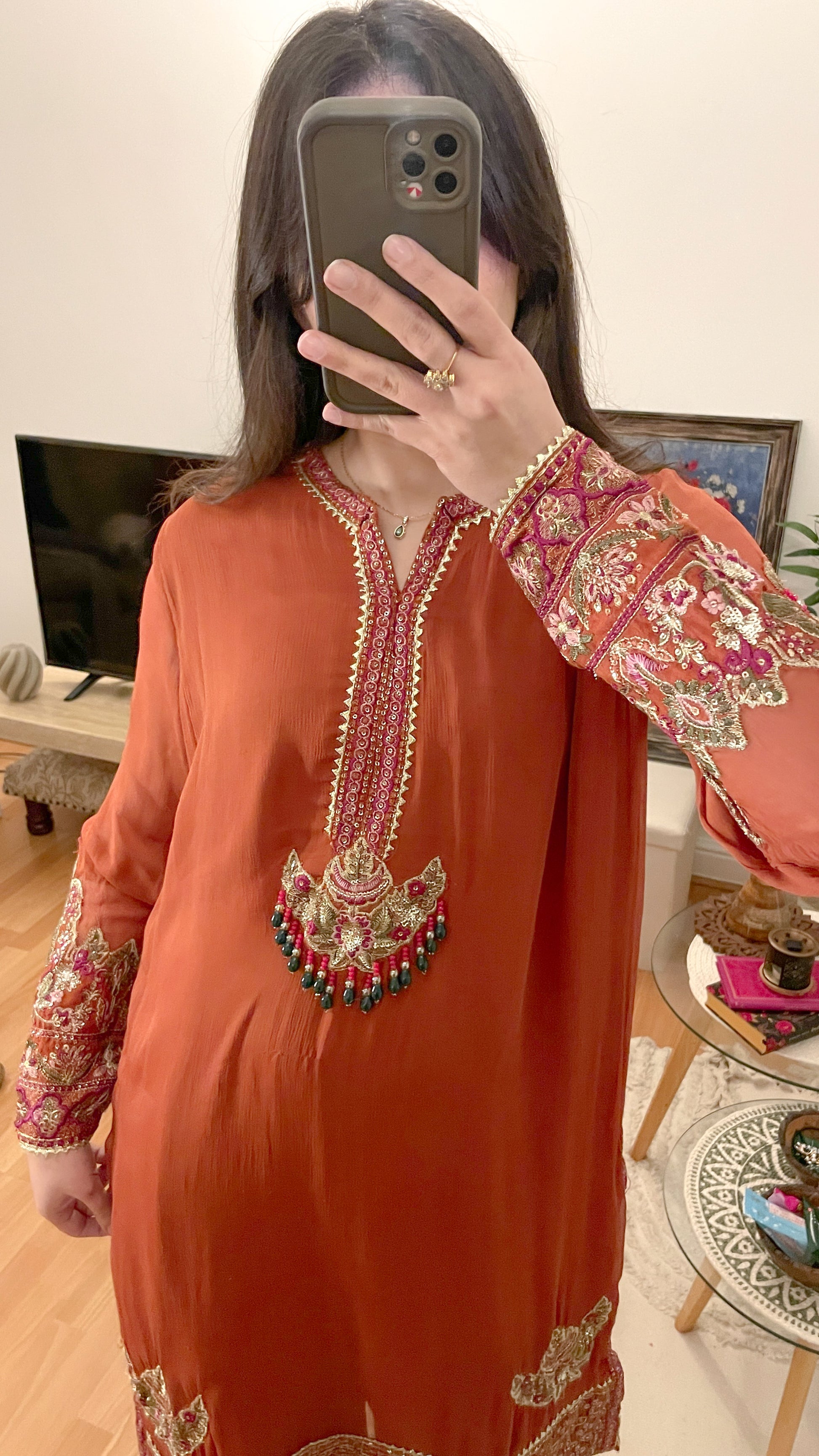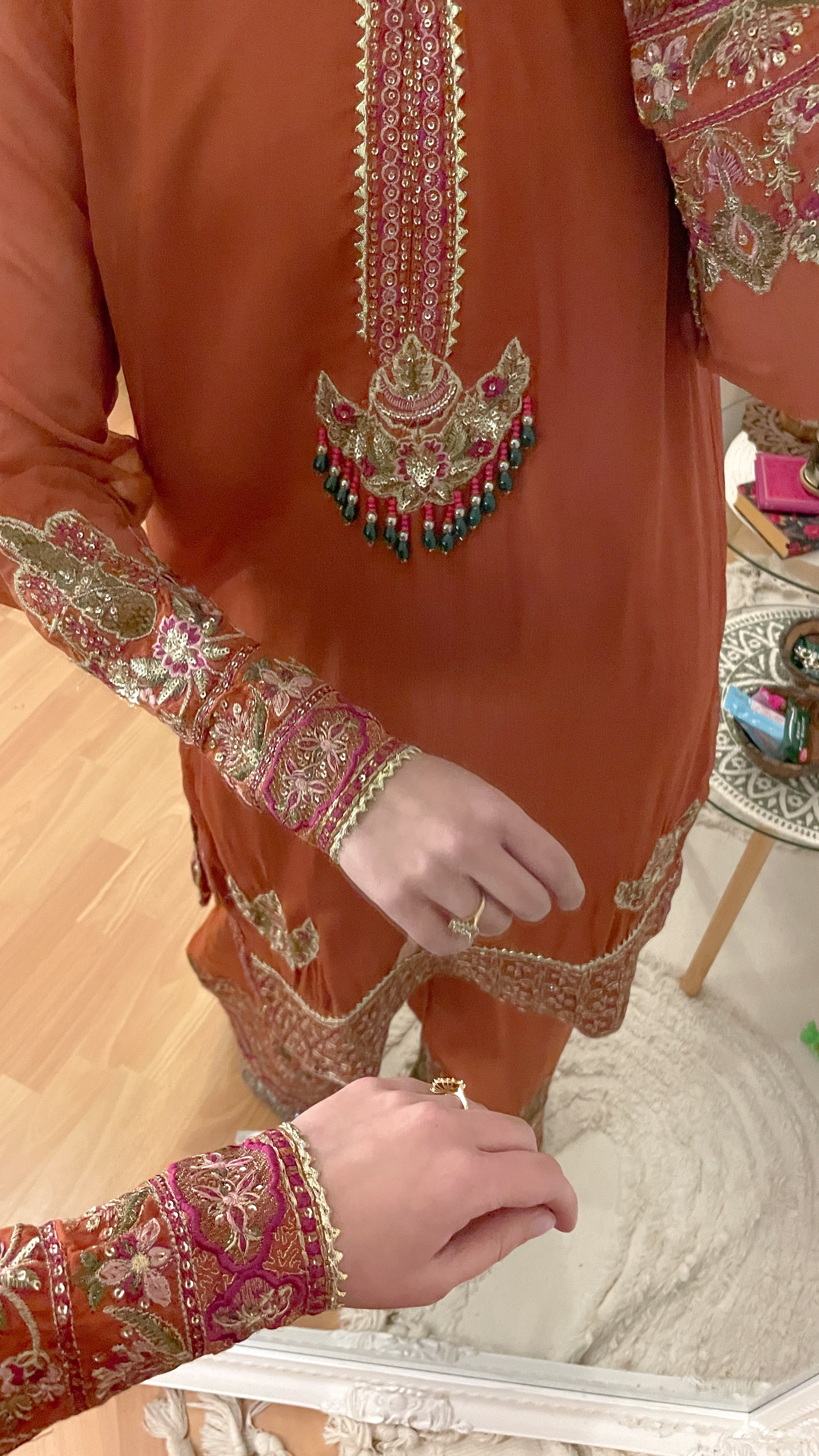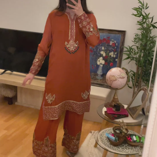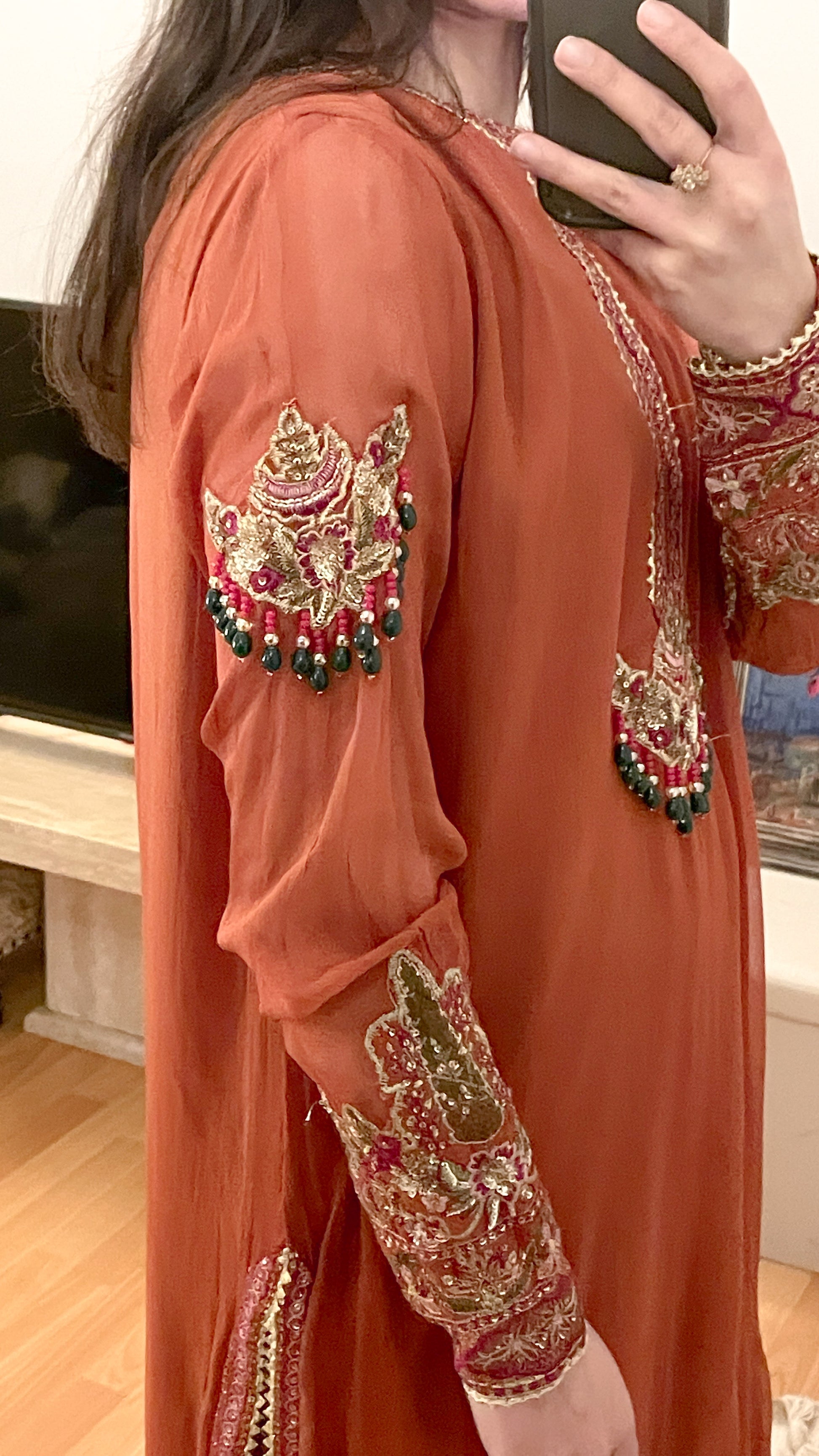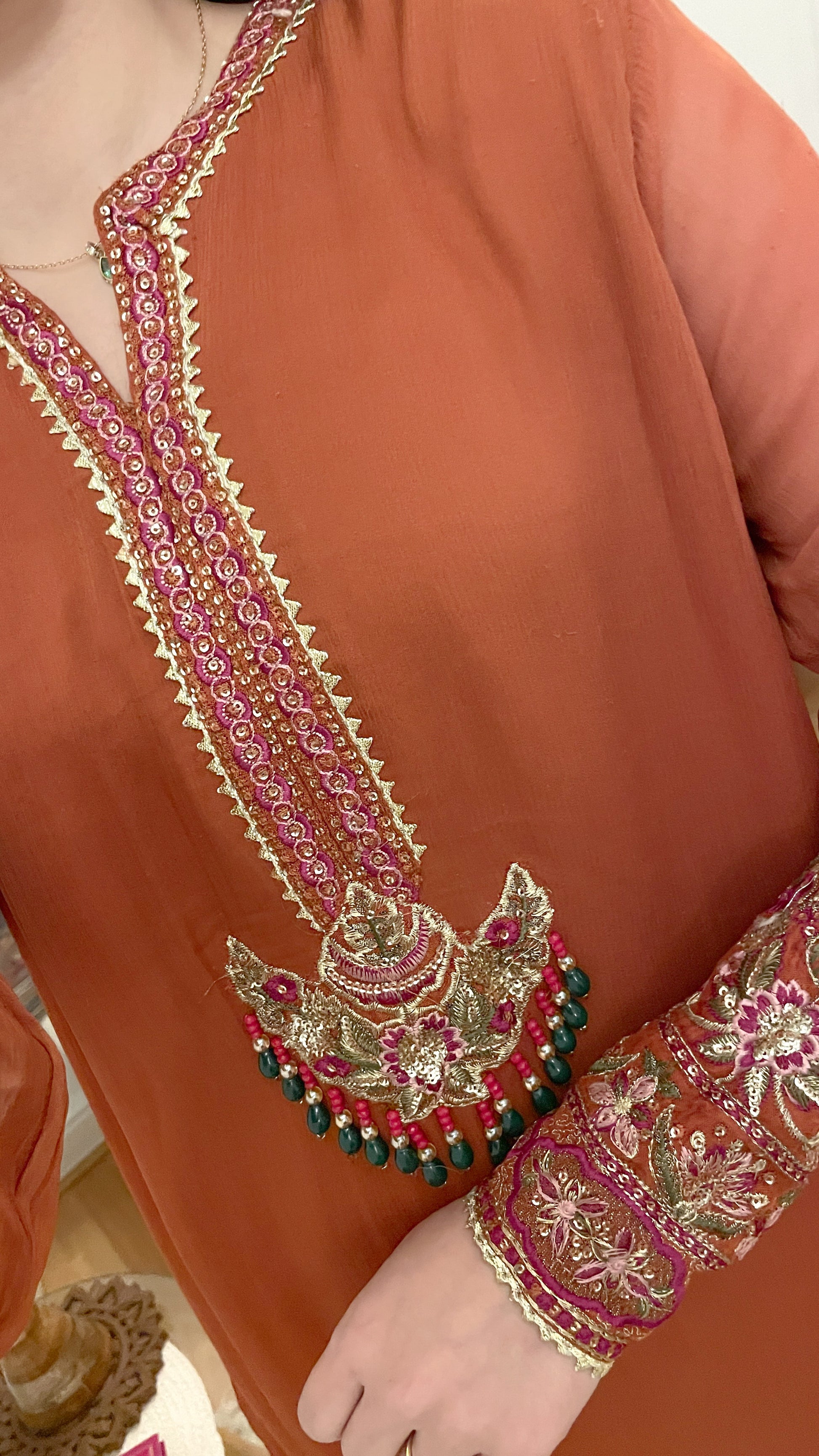 Beautiful shade of rust suit with emerald beads contrast combination in the work