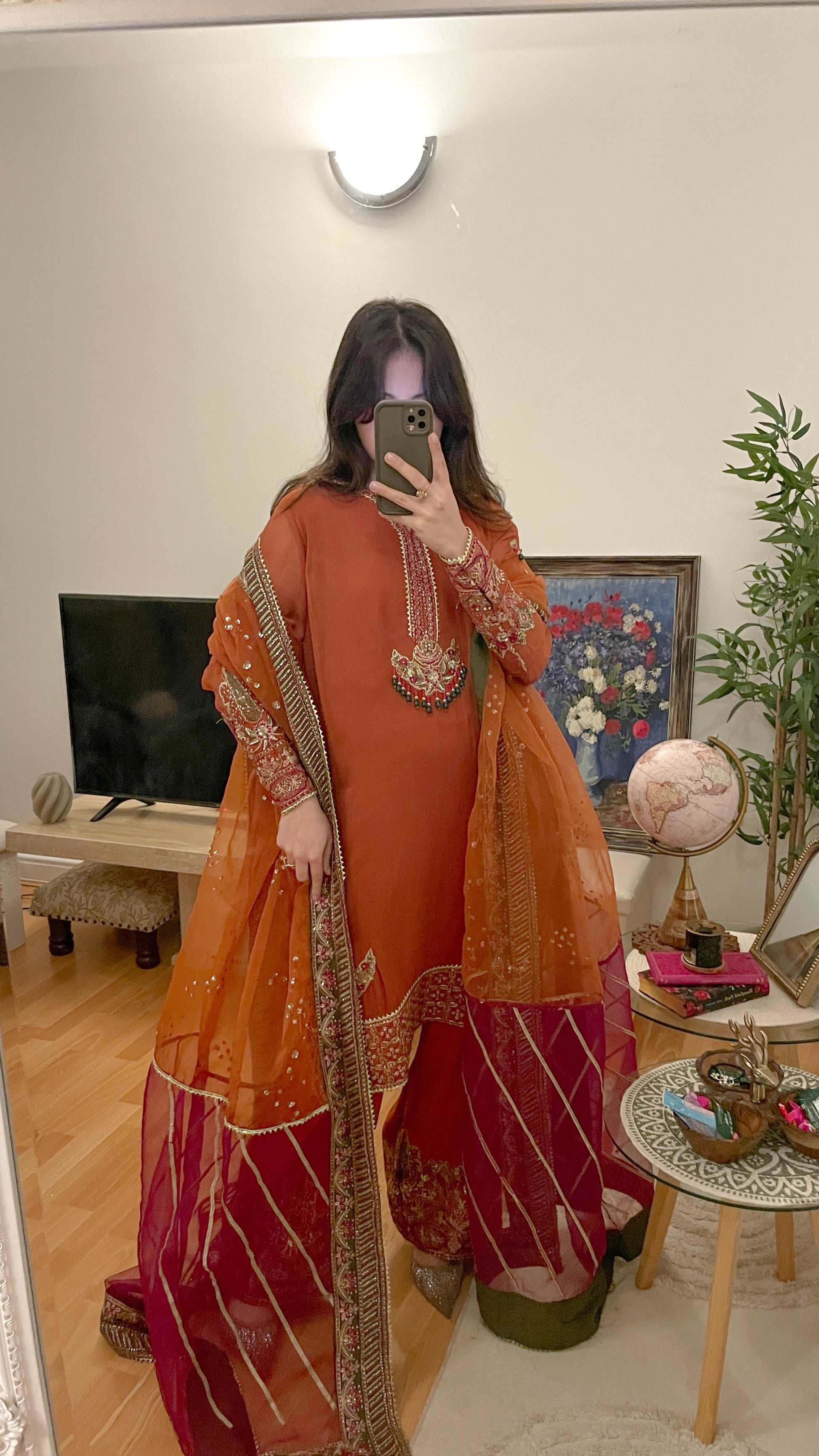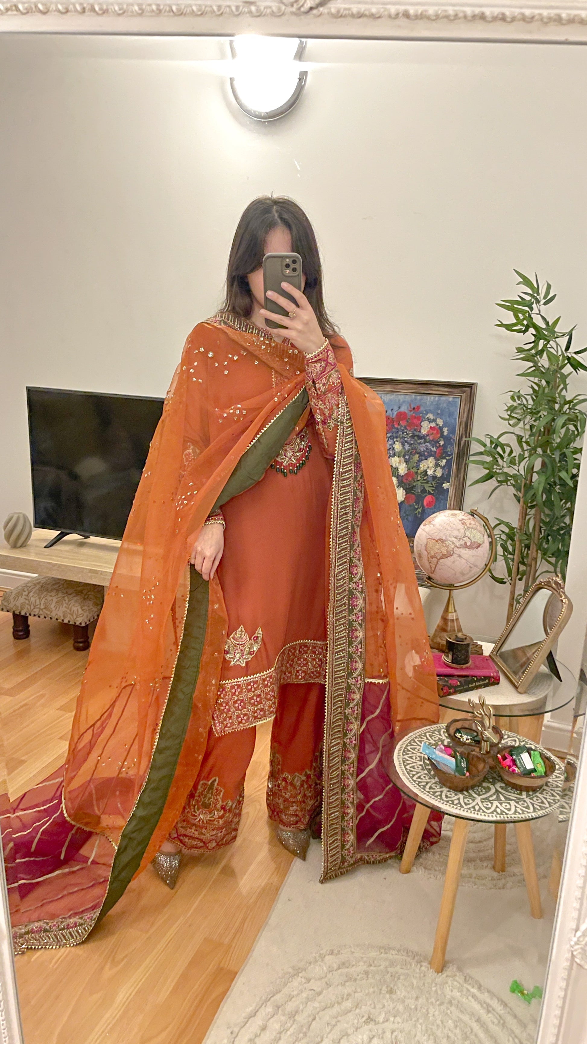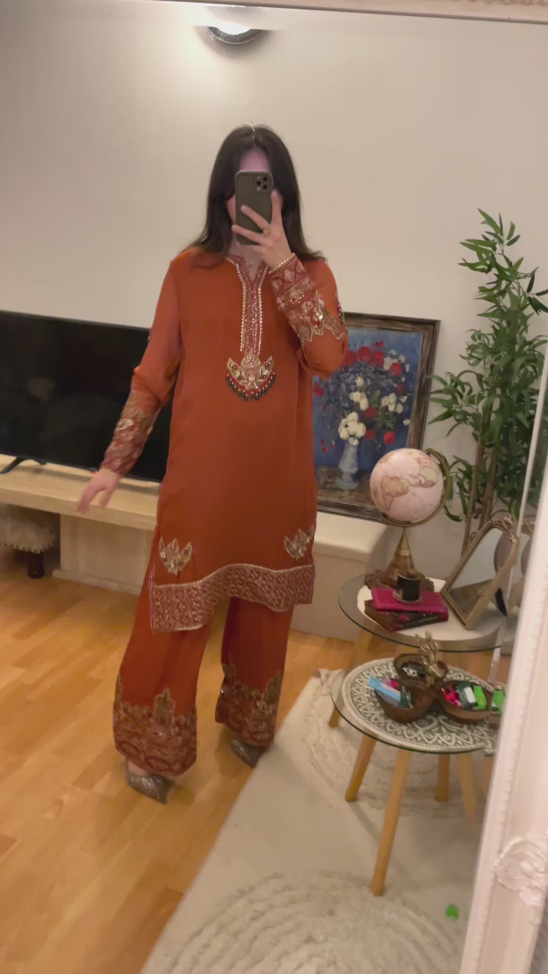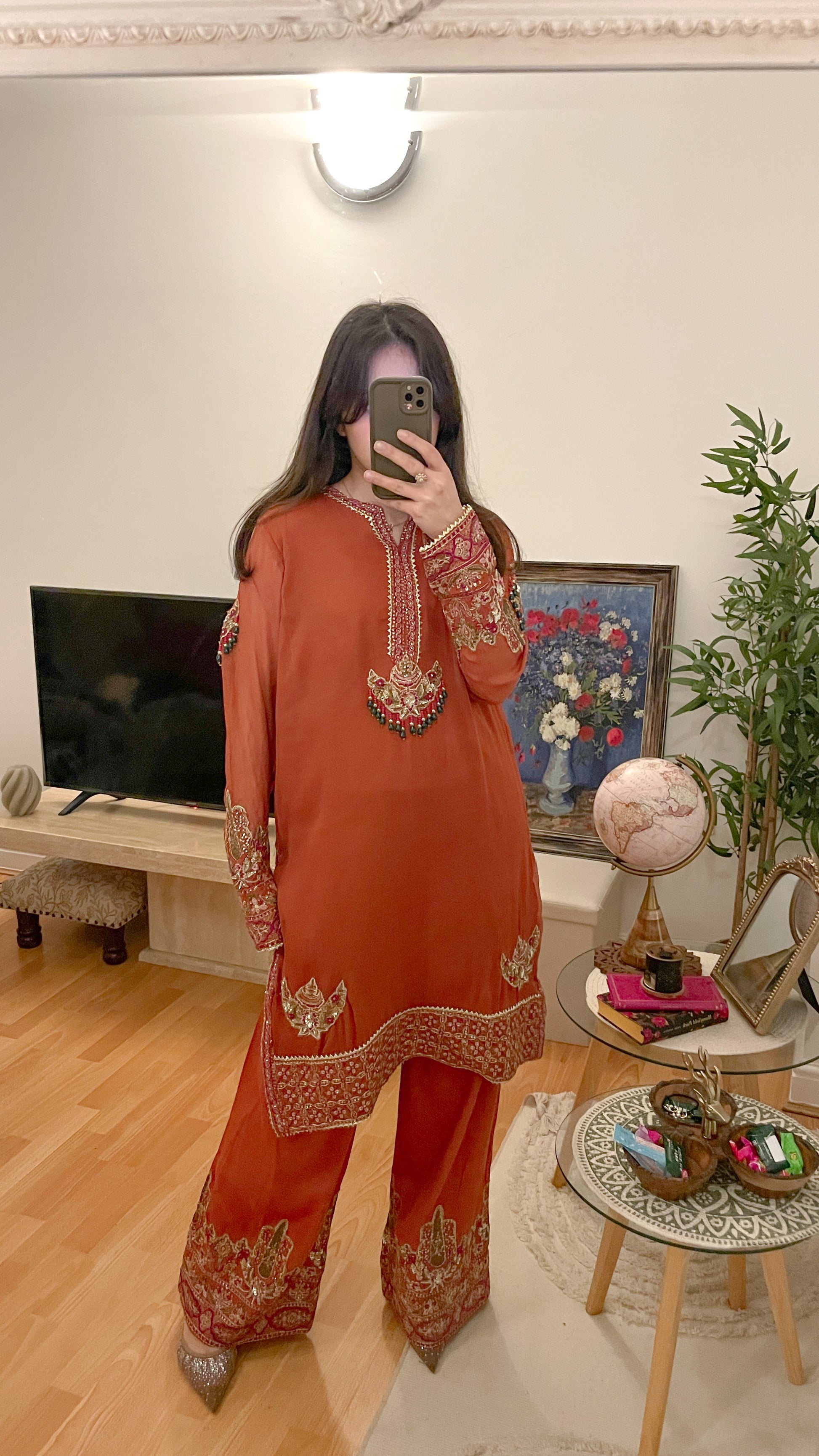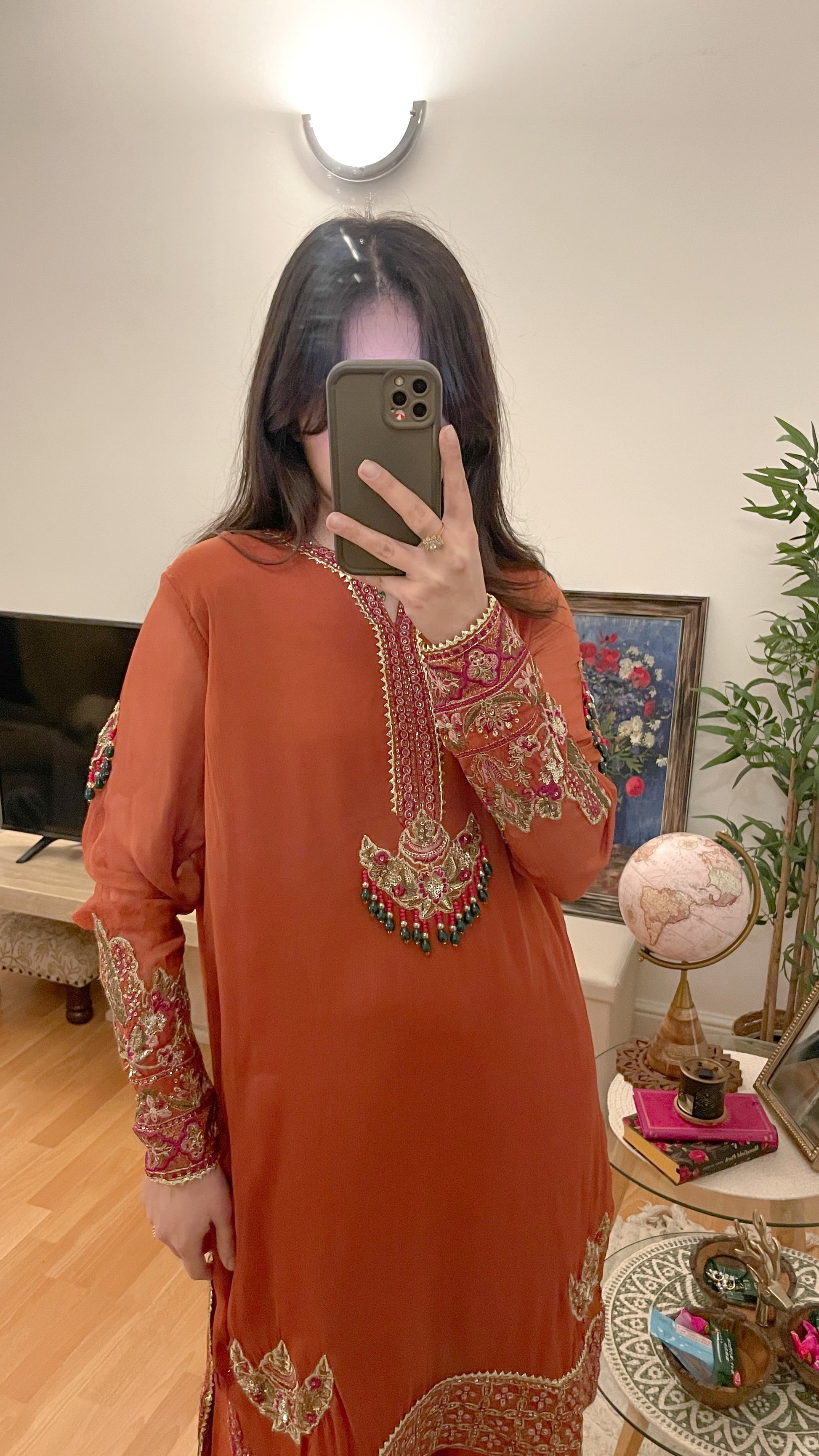 Beautiful shade of rust suit with emerald beads contrast combination in the work