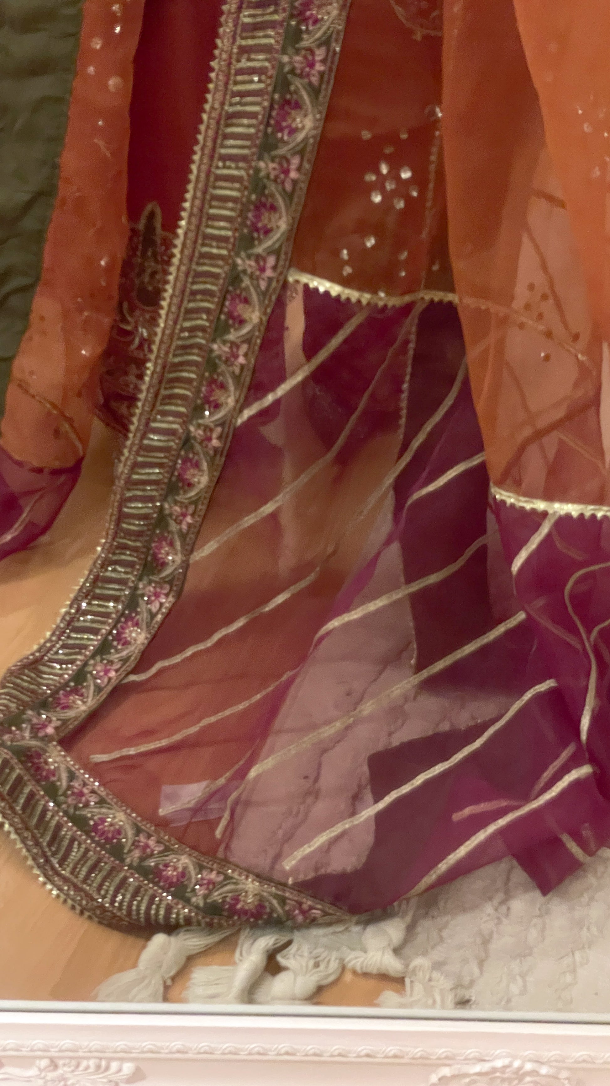 Chiffon shirt with work and machine embroidery- stunning wide trousers and a statement style heavy organza dupatta which can be styled in many ways and wear with other outfits too 🫶