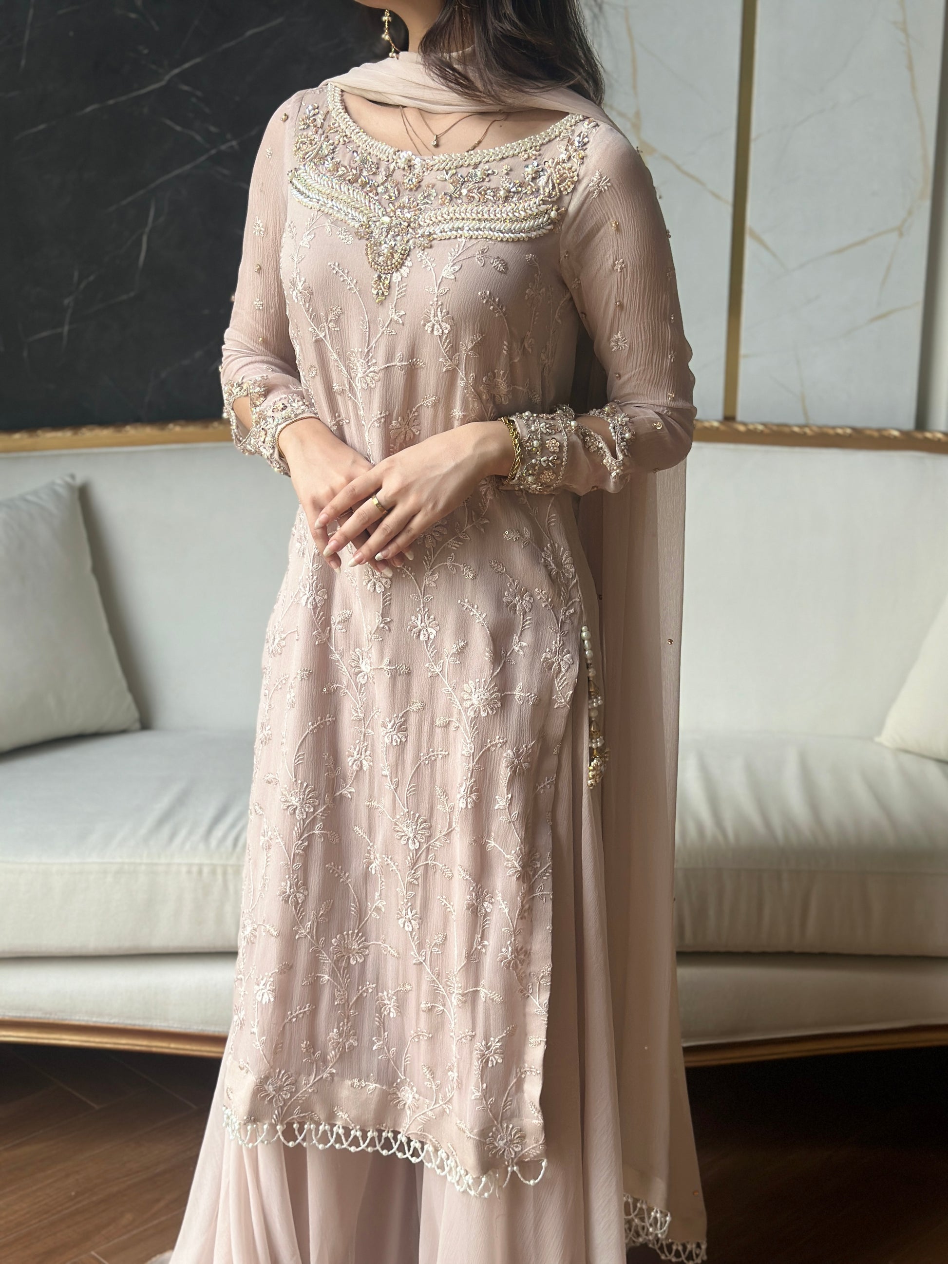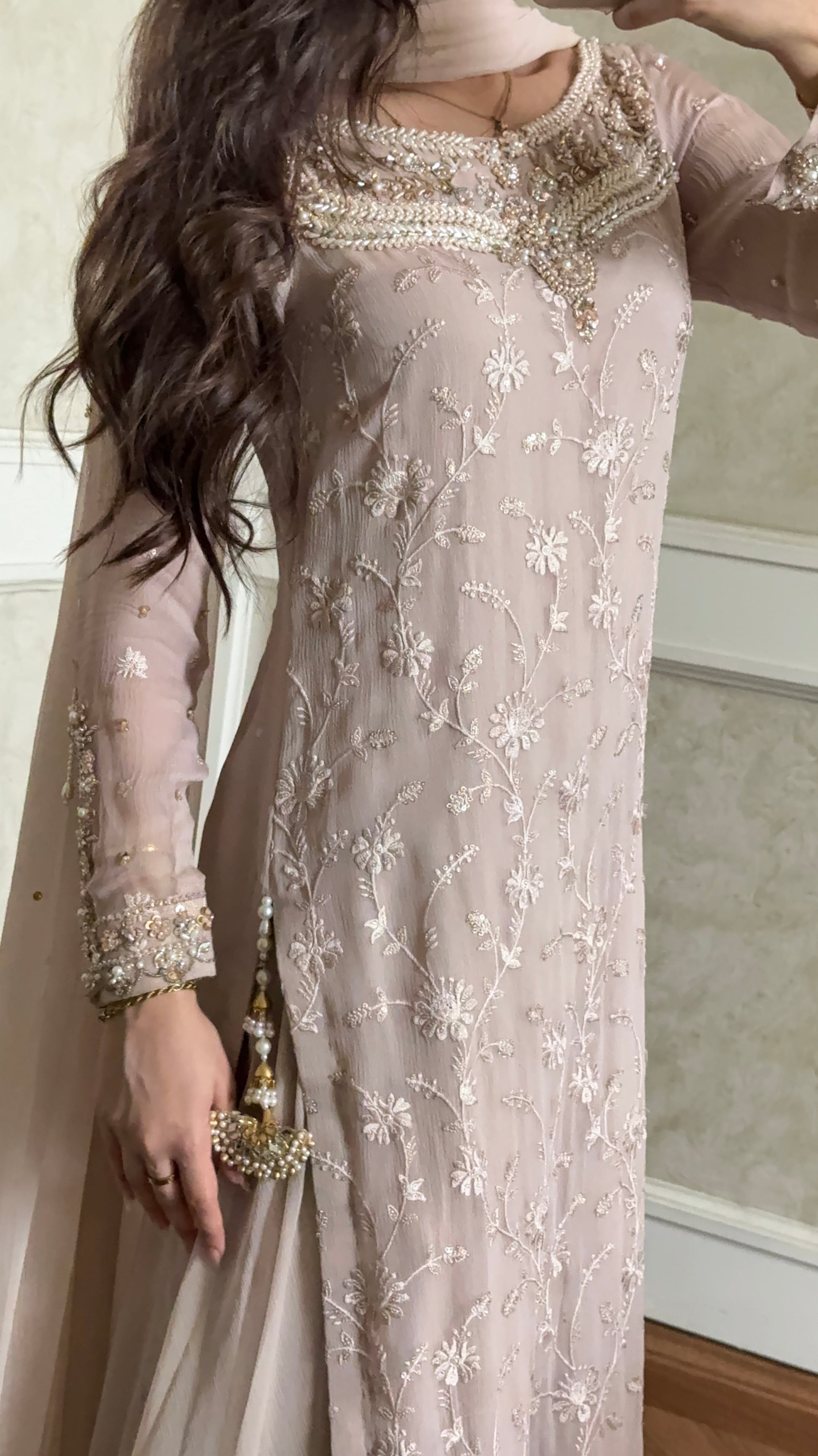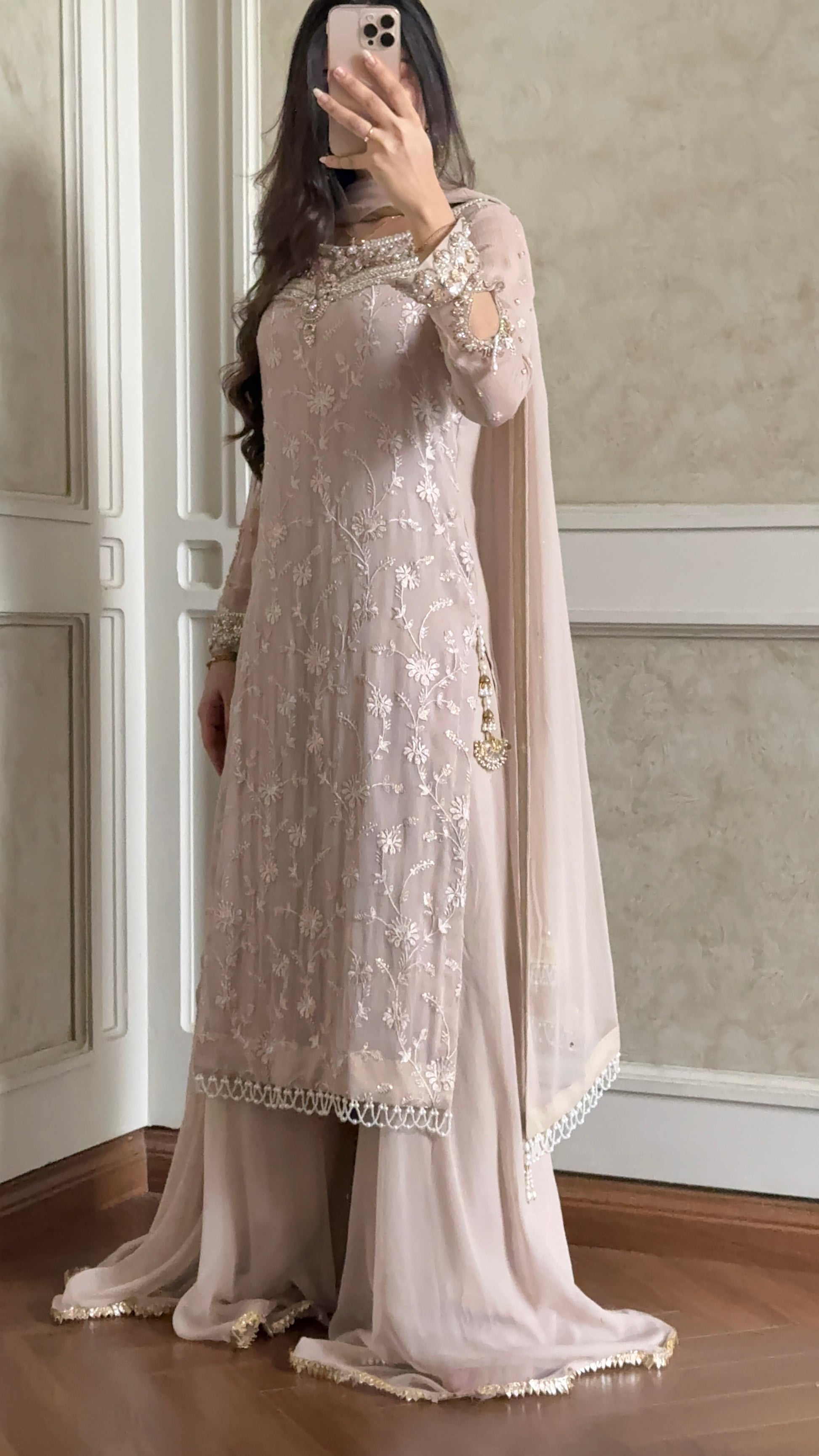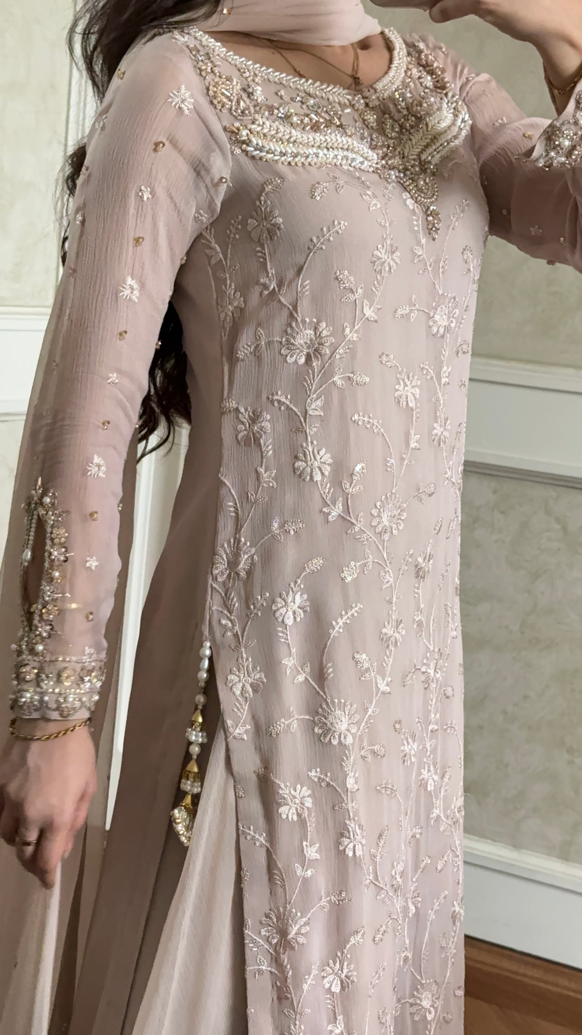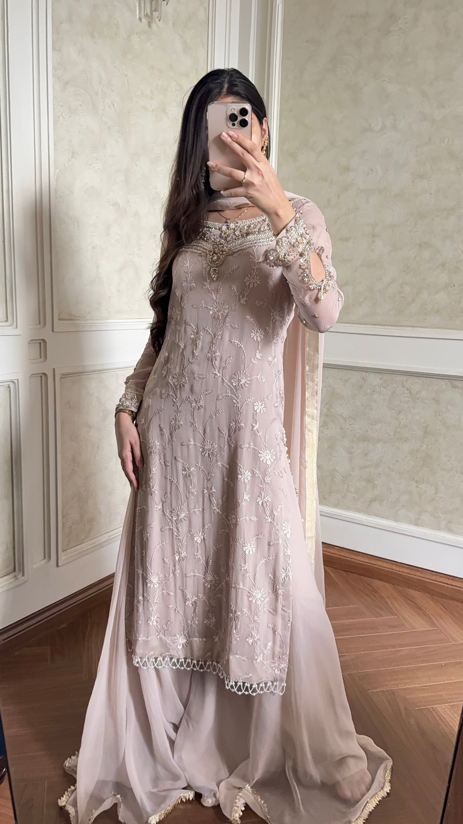 Embroidered chiffon base with handwork kaam and sleeves. the sleeves work has a border work and keyhole work with a dangling handmade tassle