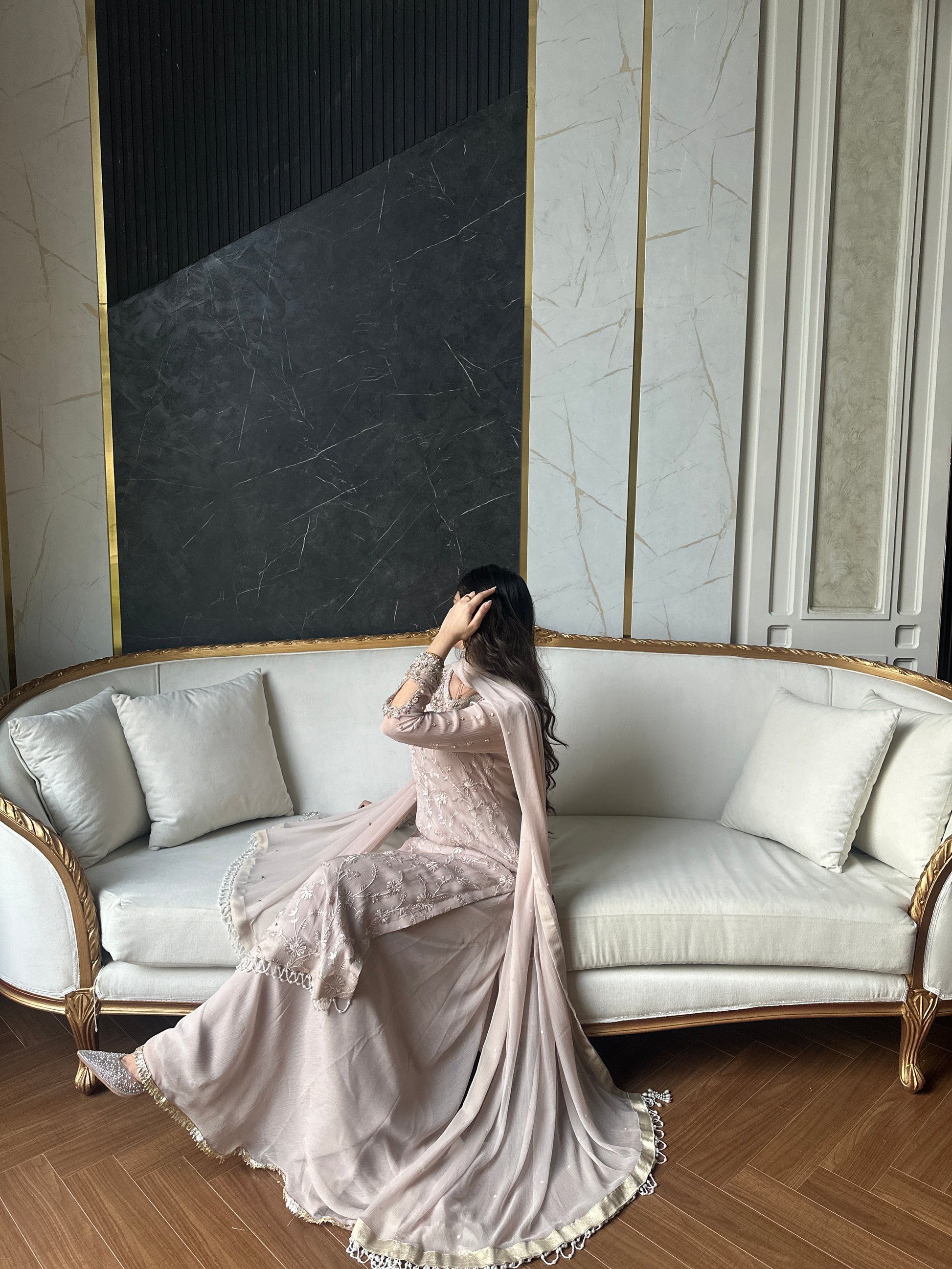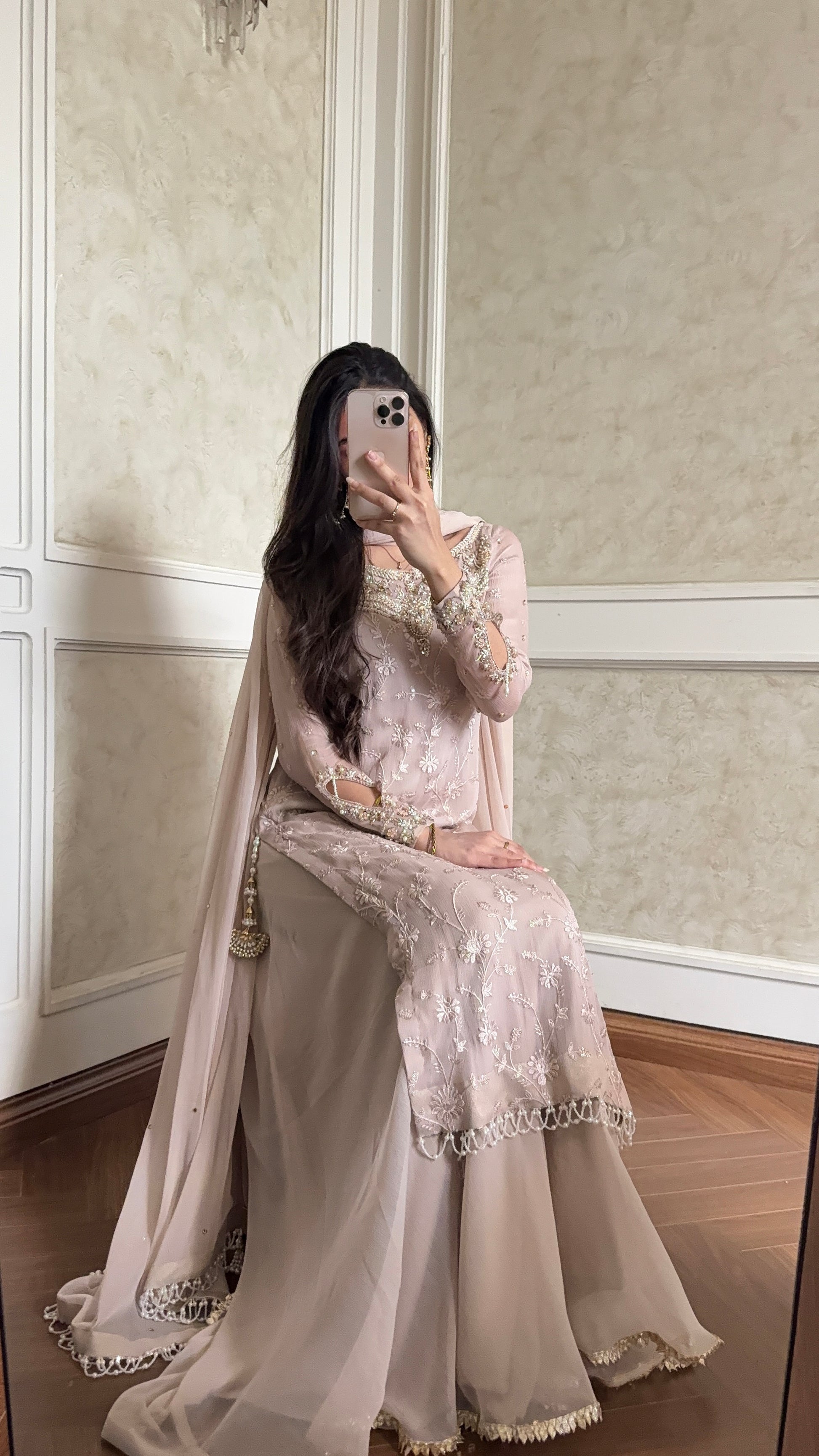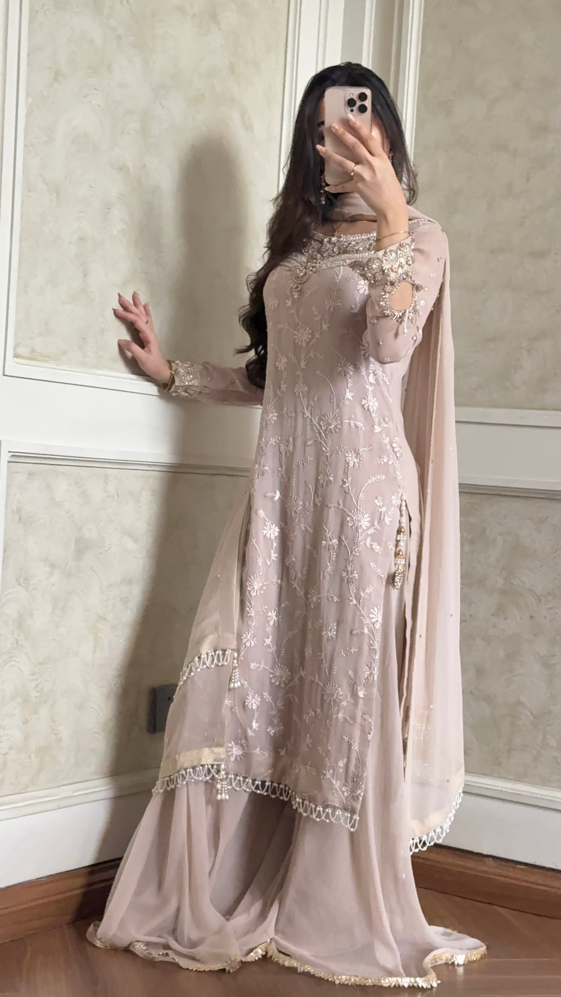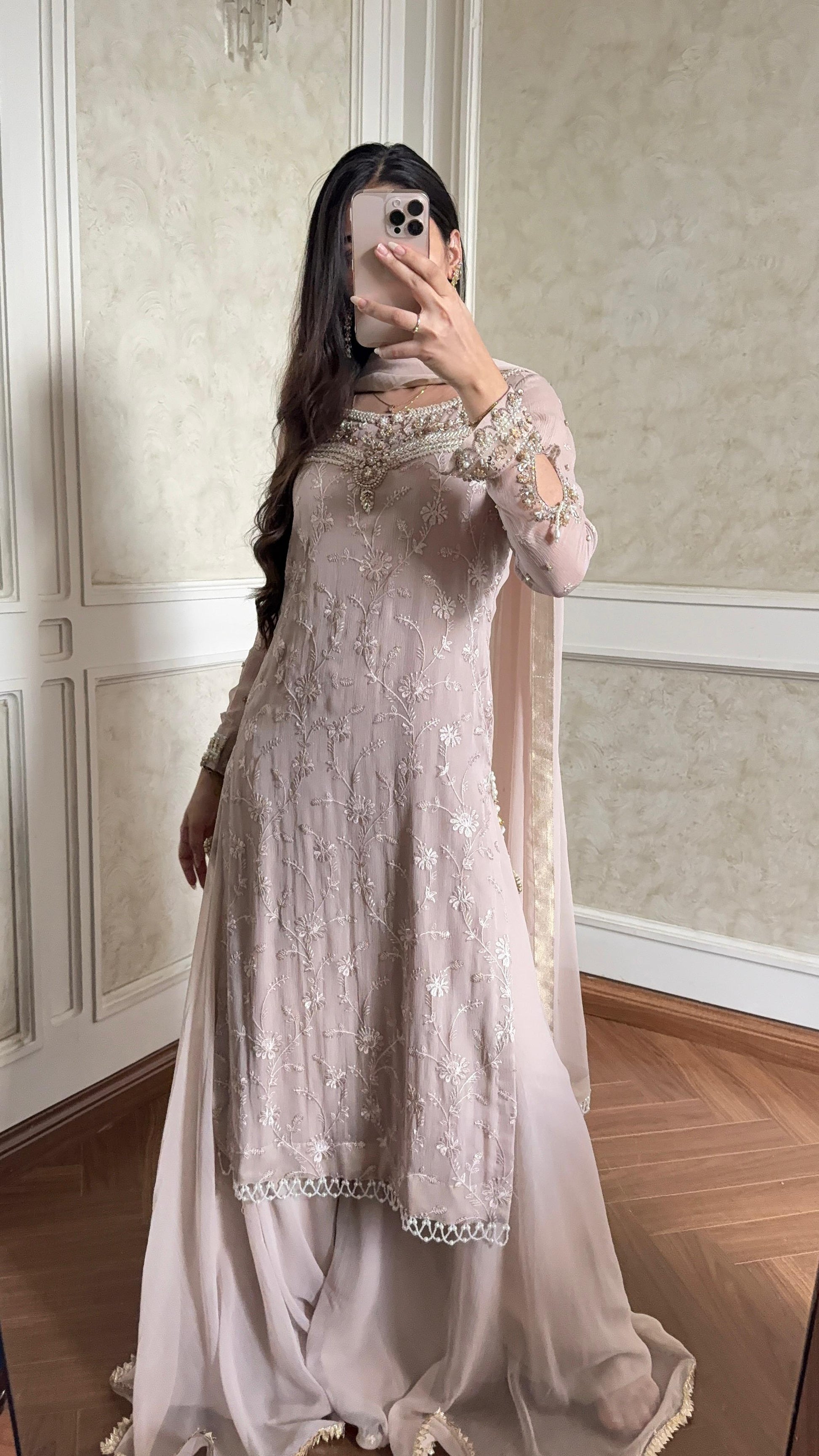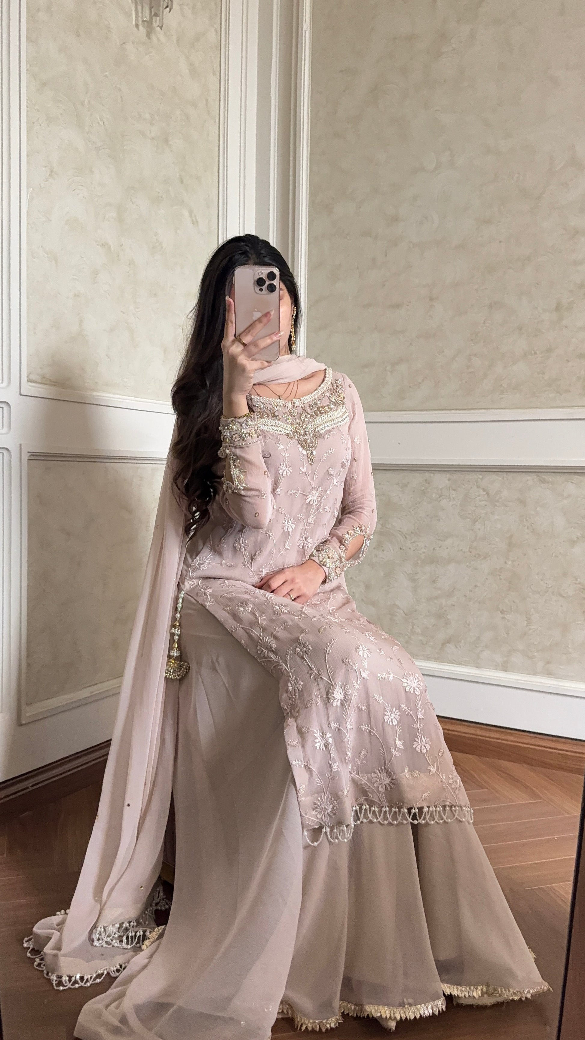 Embroidered chiffon base with handwork kaam and sleeves. the sleeves work has a border work and keyhole work with a dangling handmade tassle