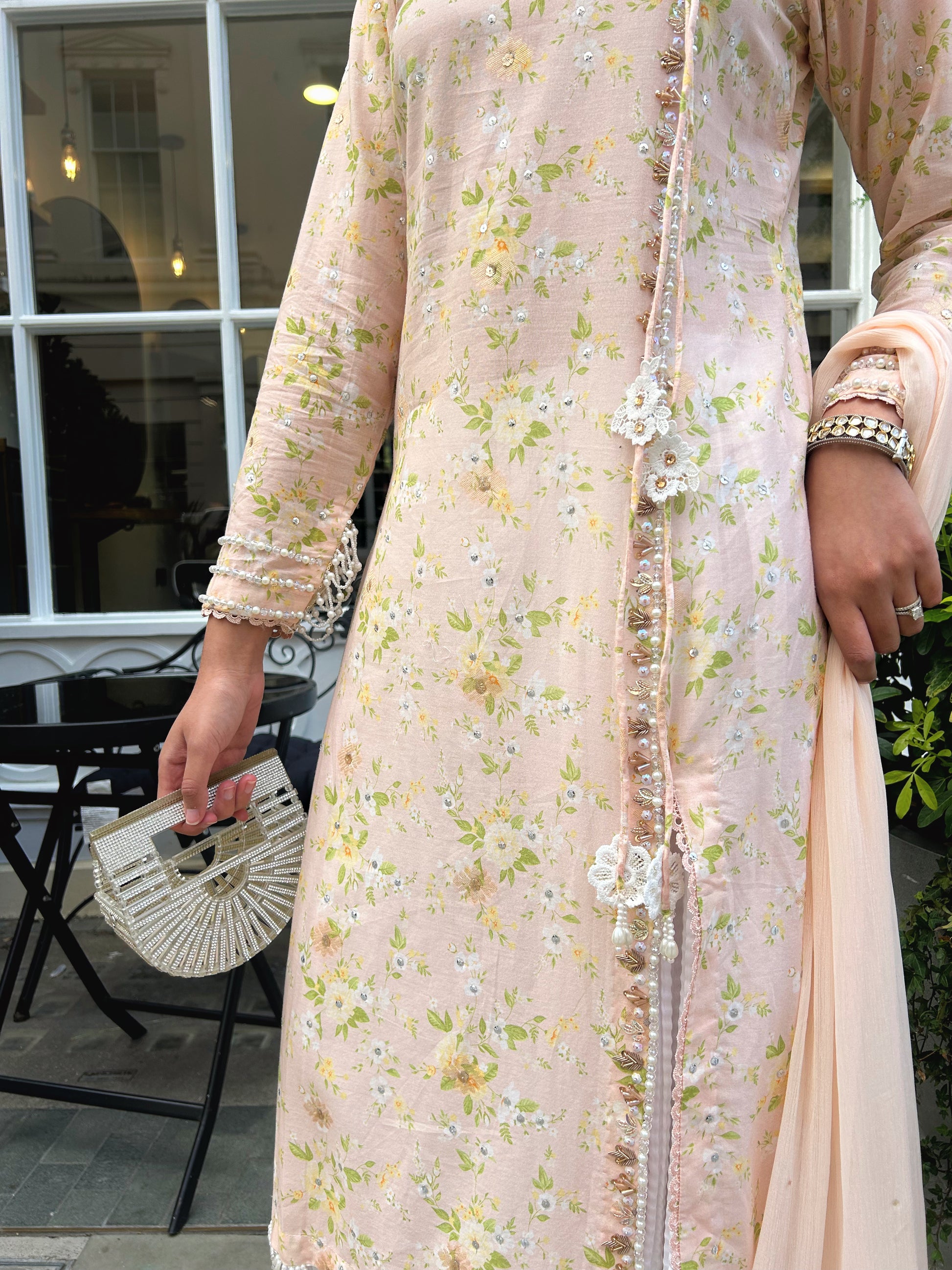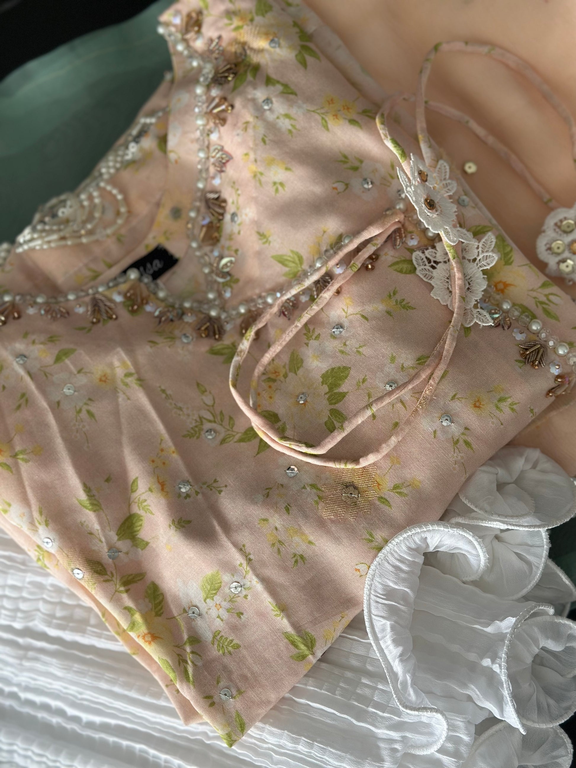 Stunning floral print with sequins and chan work on the print. handwork angrakha cut line and cute tassles