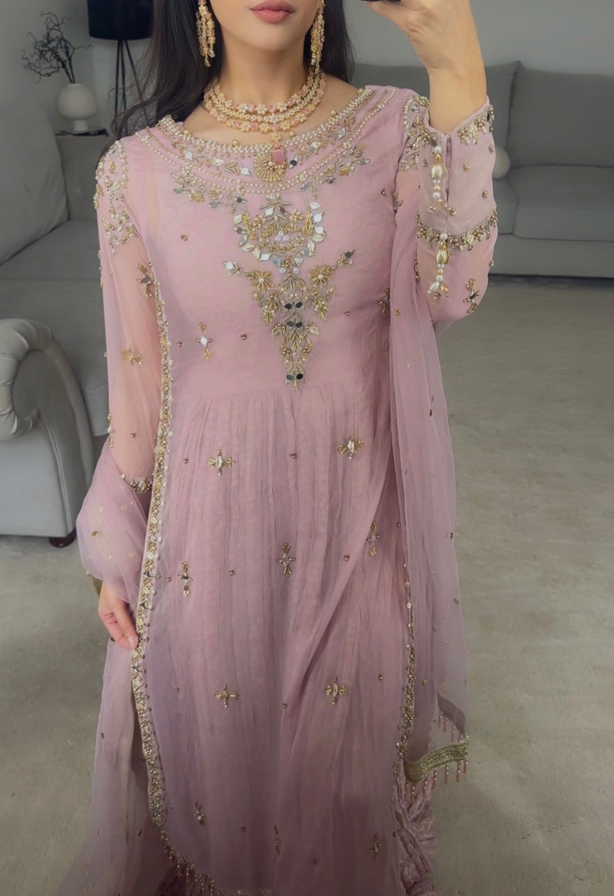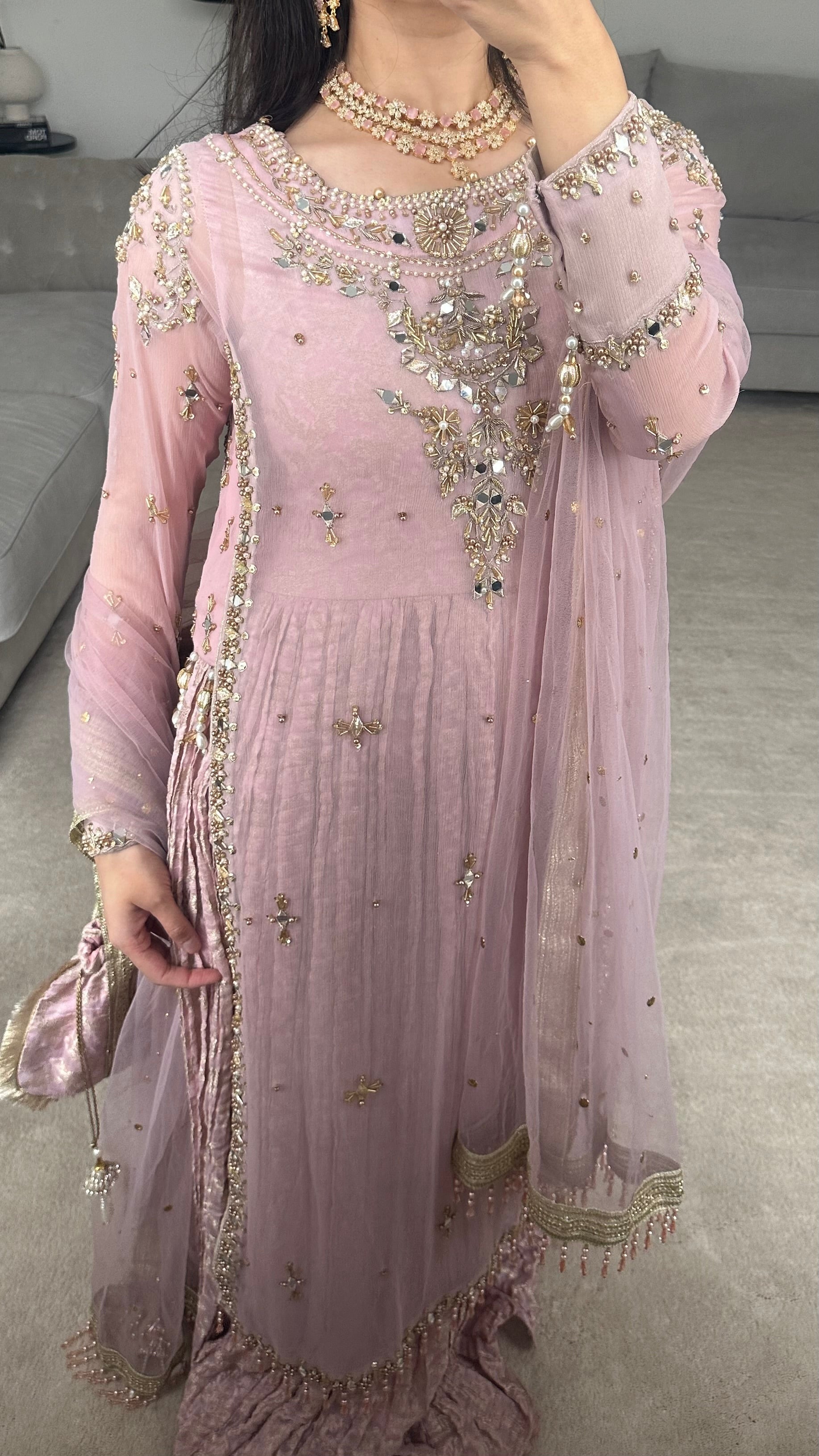 Simply WOW! This design is something new and different. A crush jamawar chiffon maxi underneath, with a heavy hand worked chiffon shirt on top. The mix of gold shades and silver work compliments the dress colour so well 🥹