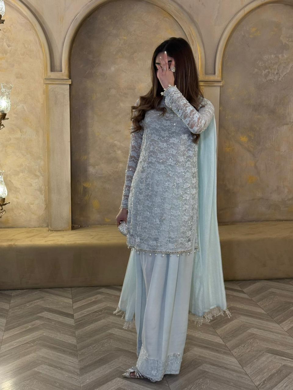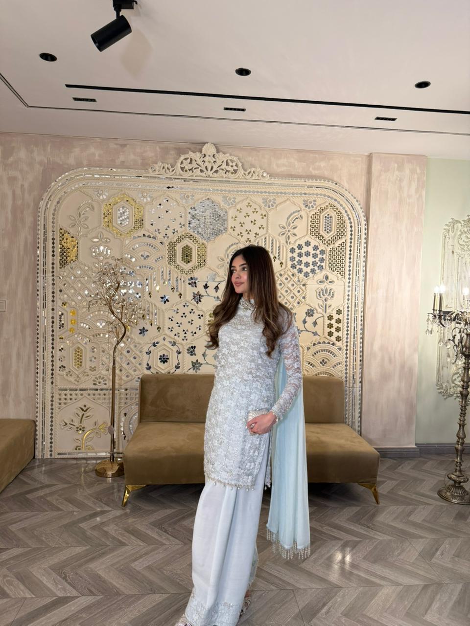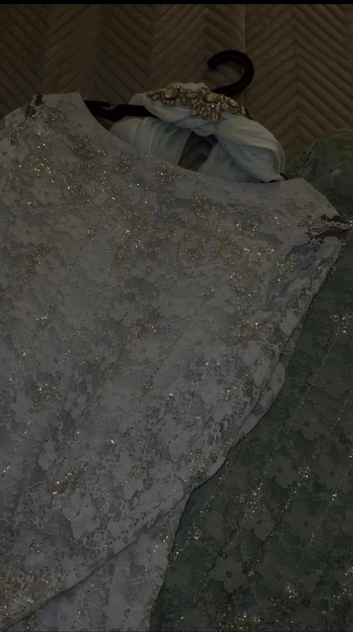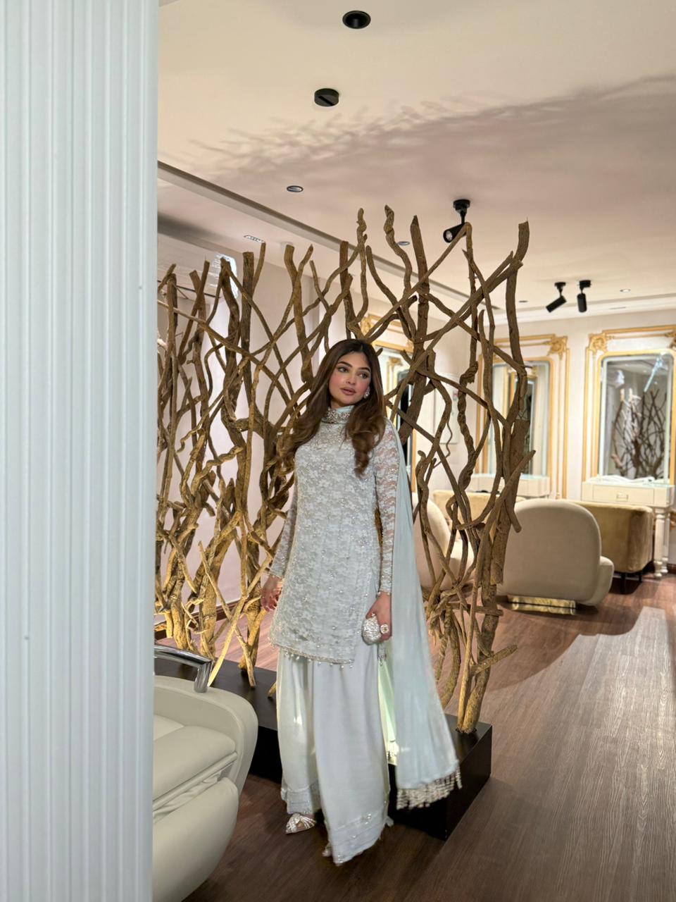 Our Chantilly x Aleena collab is full of 3 different colours on a stunning heavy pearl Cutwork base with stone work on the shirt.