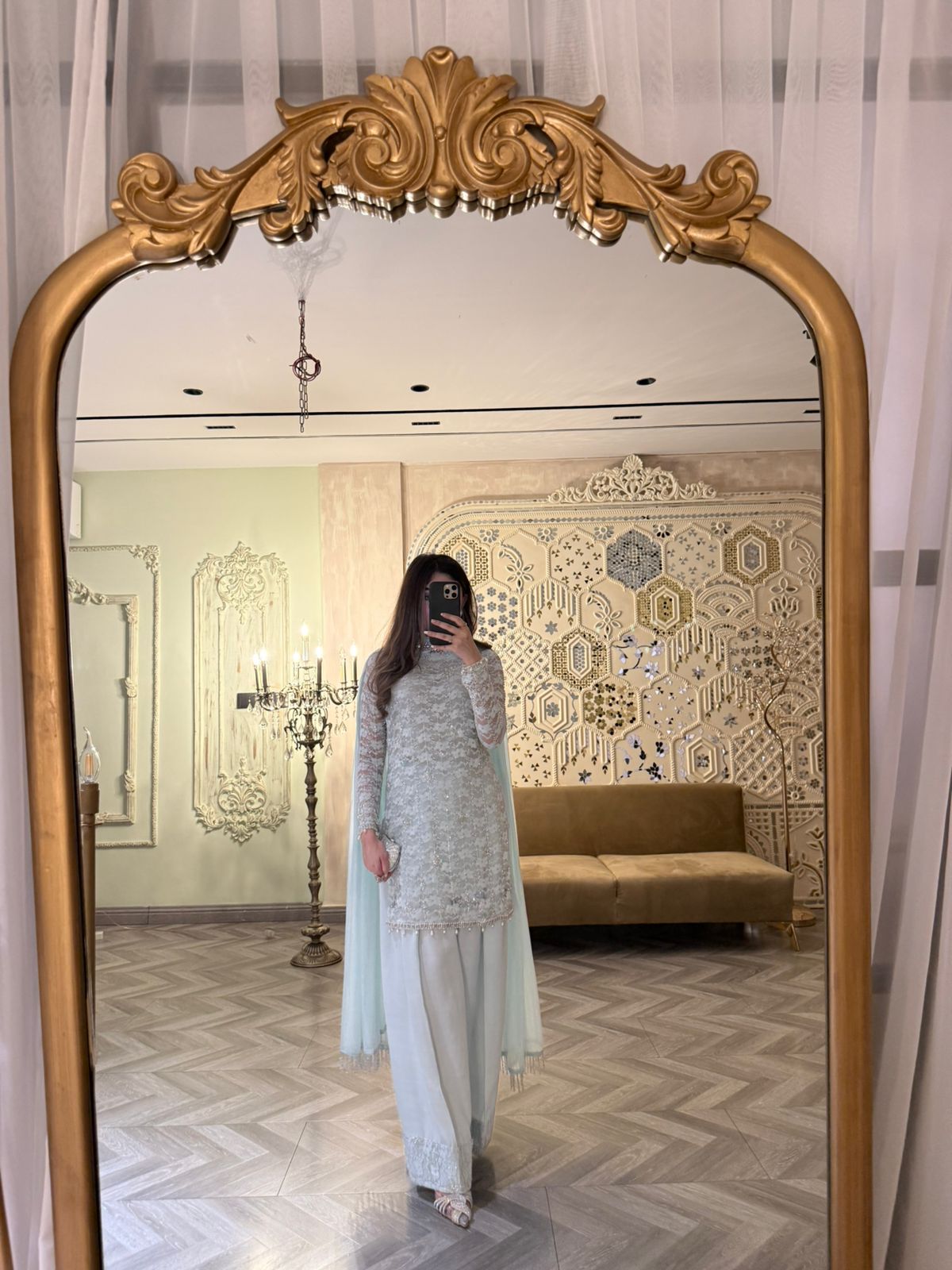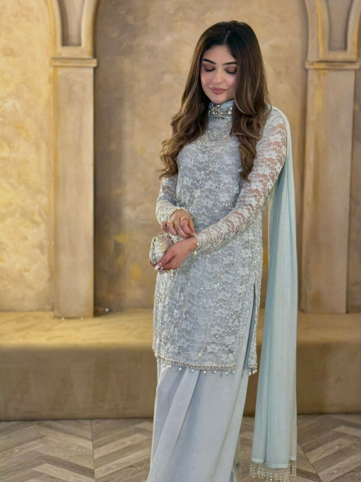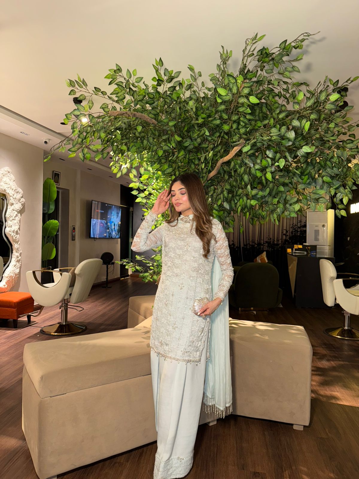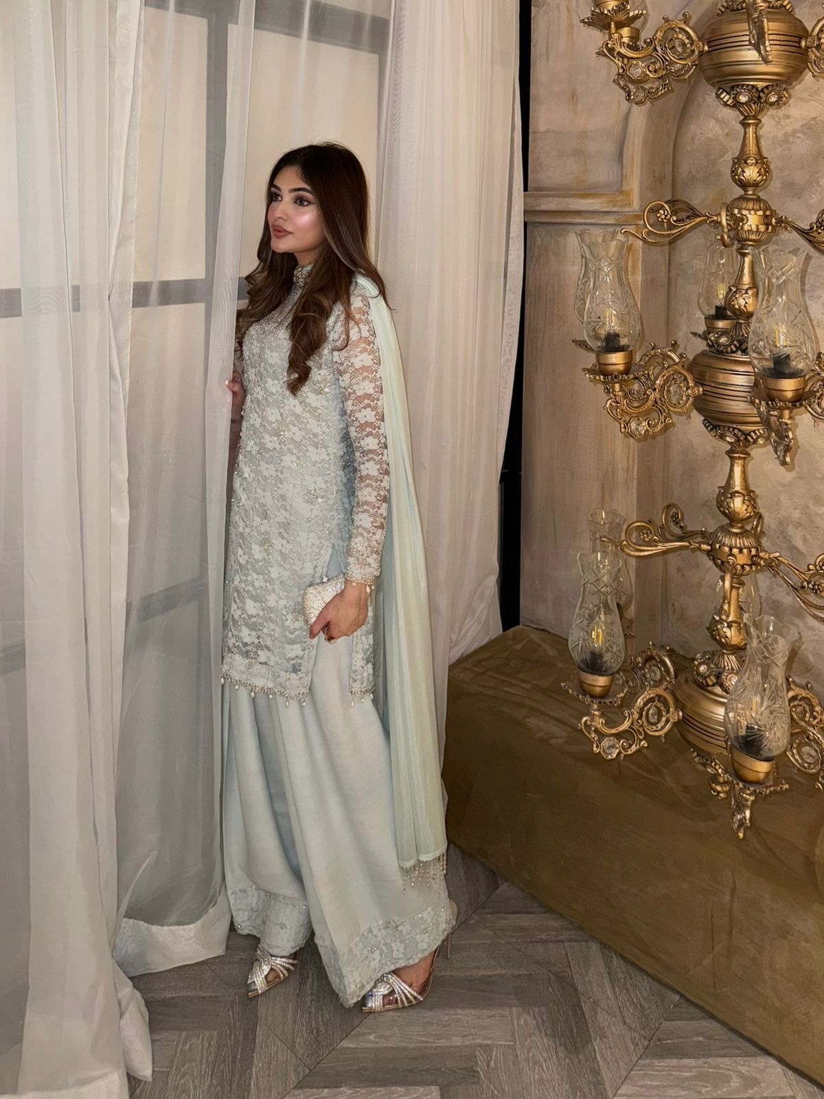 Our Chantilly x Aleena collab is full of 3 different colours on a stunning heavy pearl Cutwork base with stone work on the shirt.