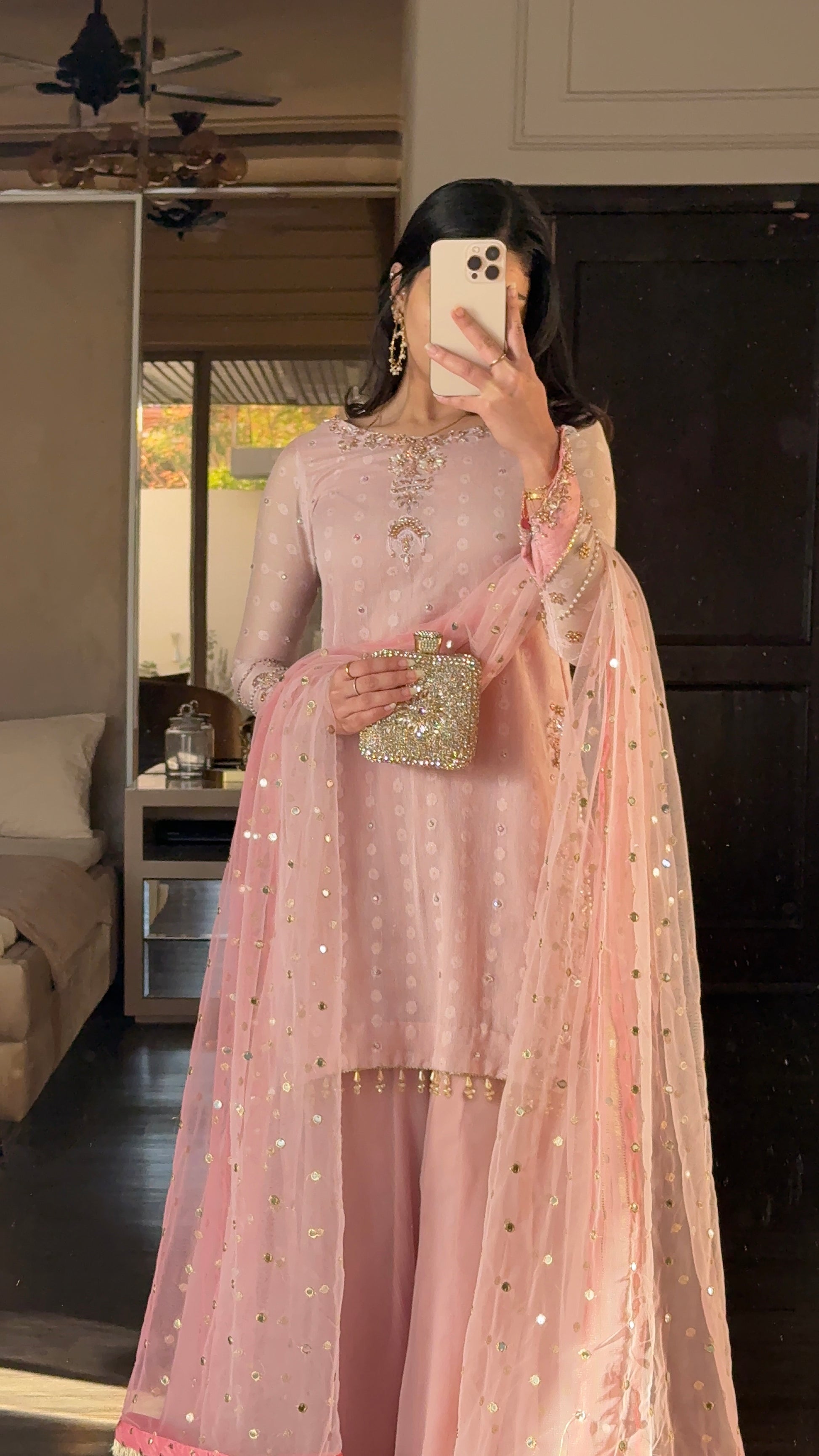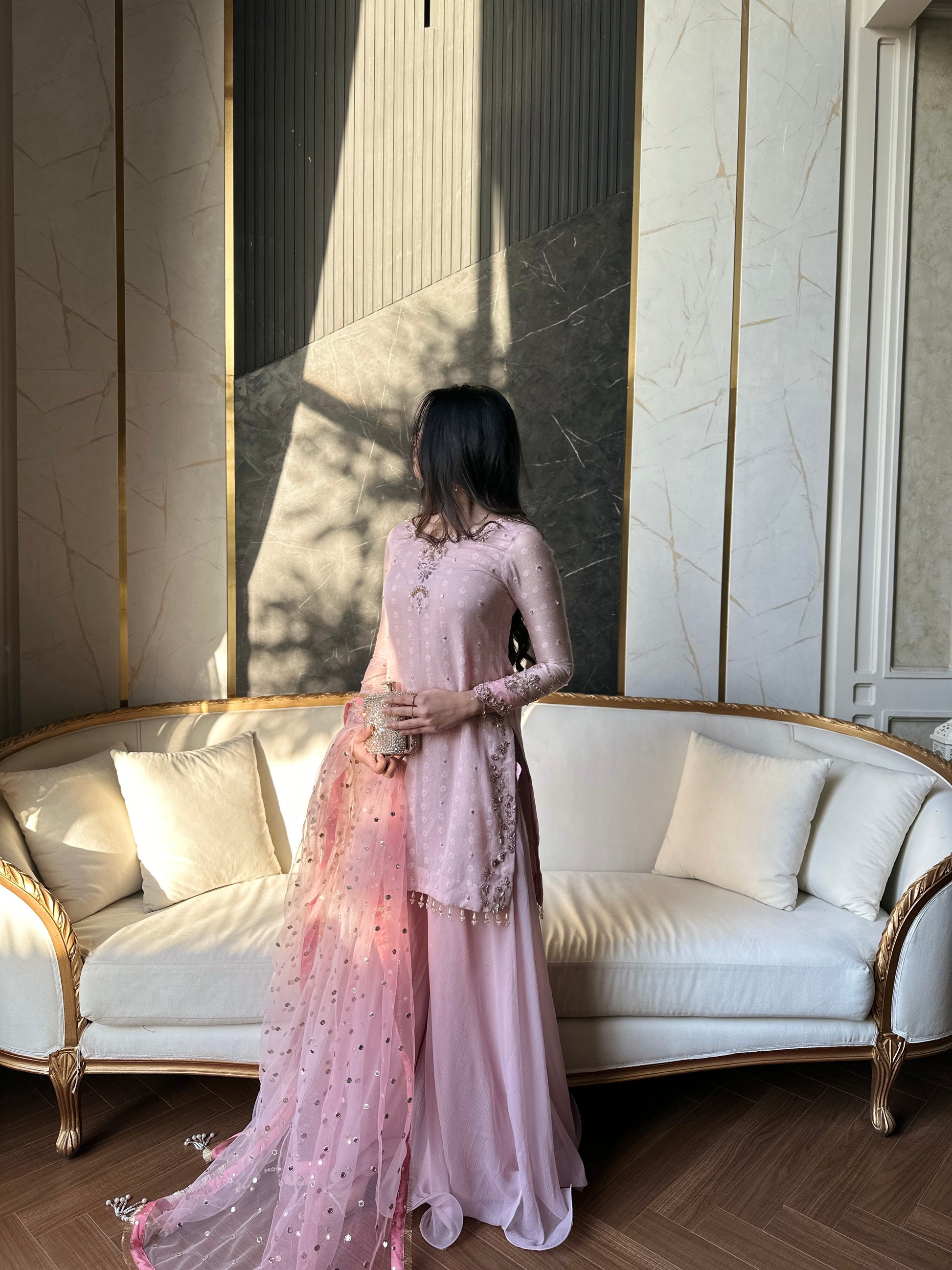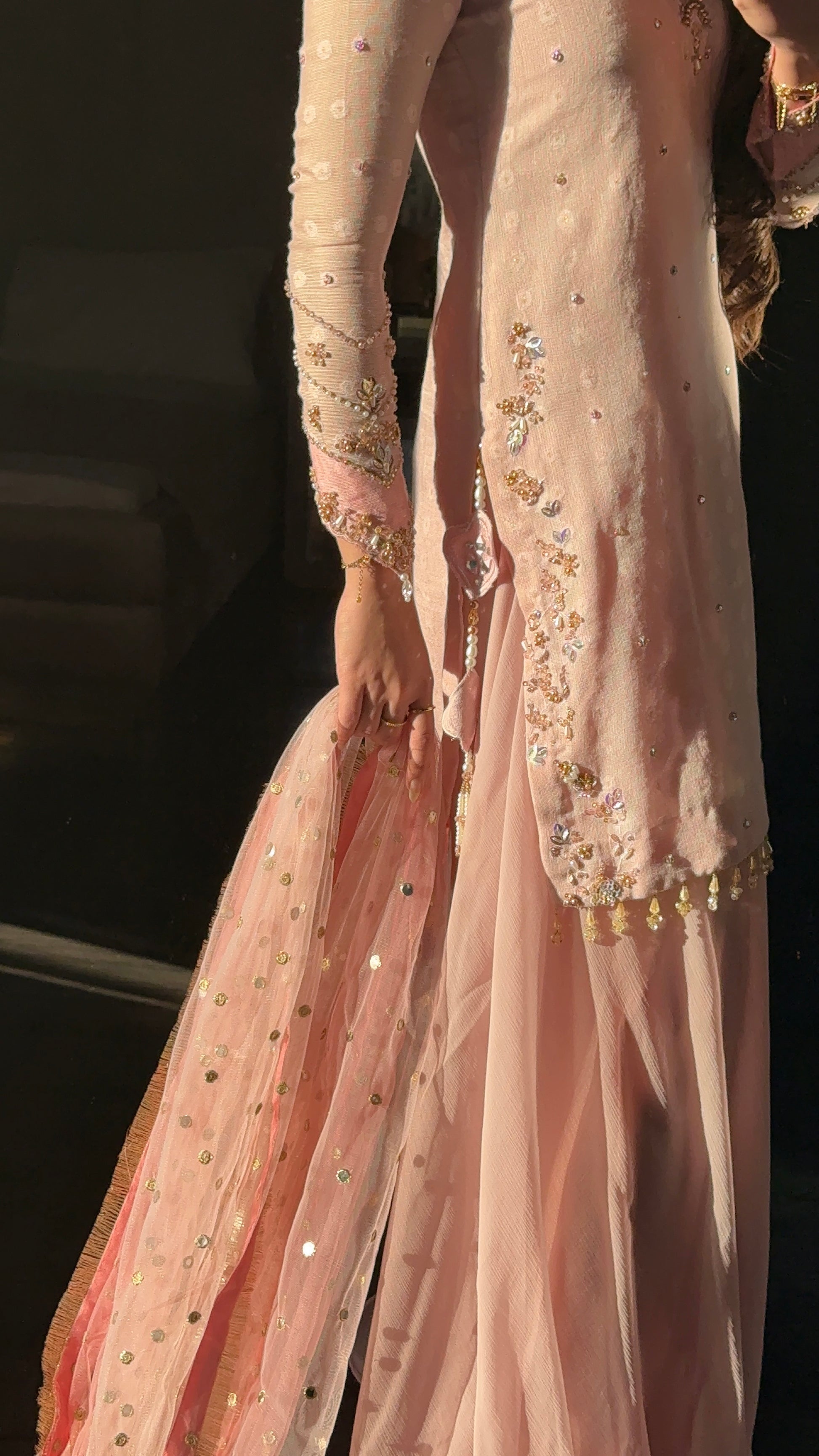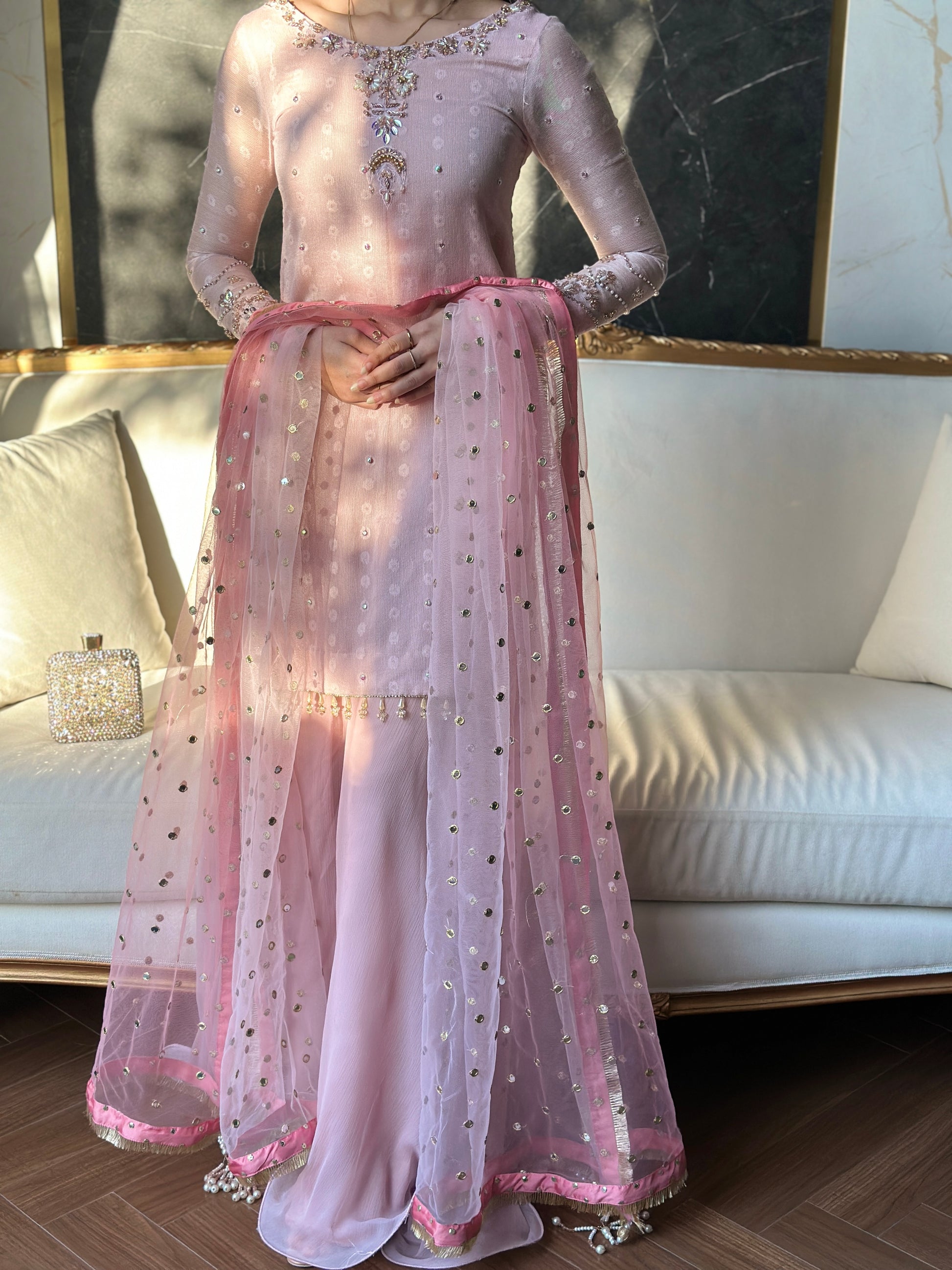 Paired with our signature sharara and a heavy dupatta with 2 tones of dusky pink and heavy pearl bead tassles in the corners