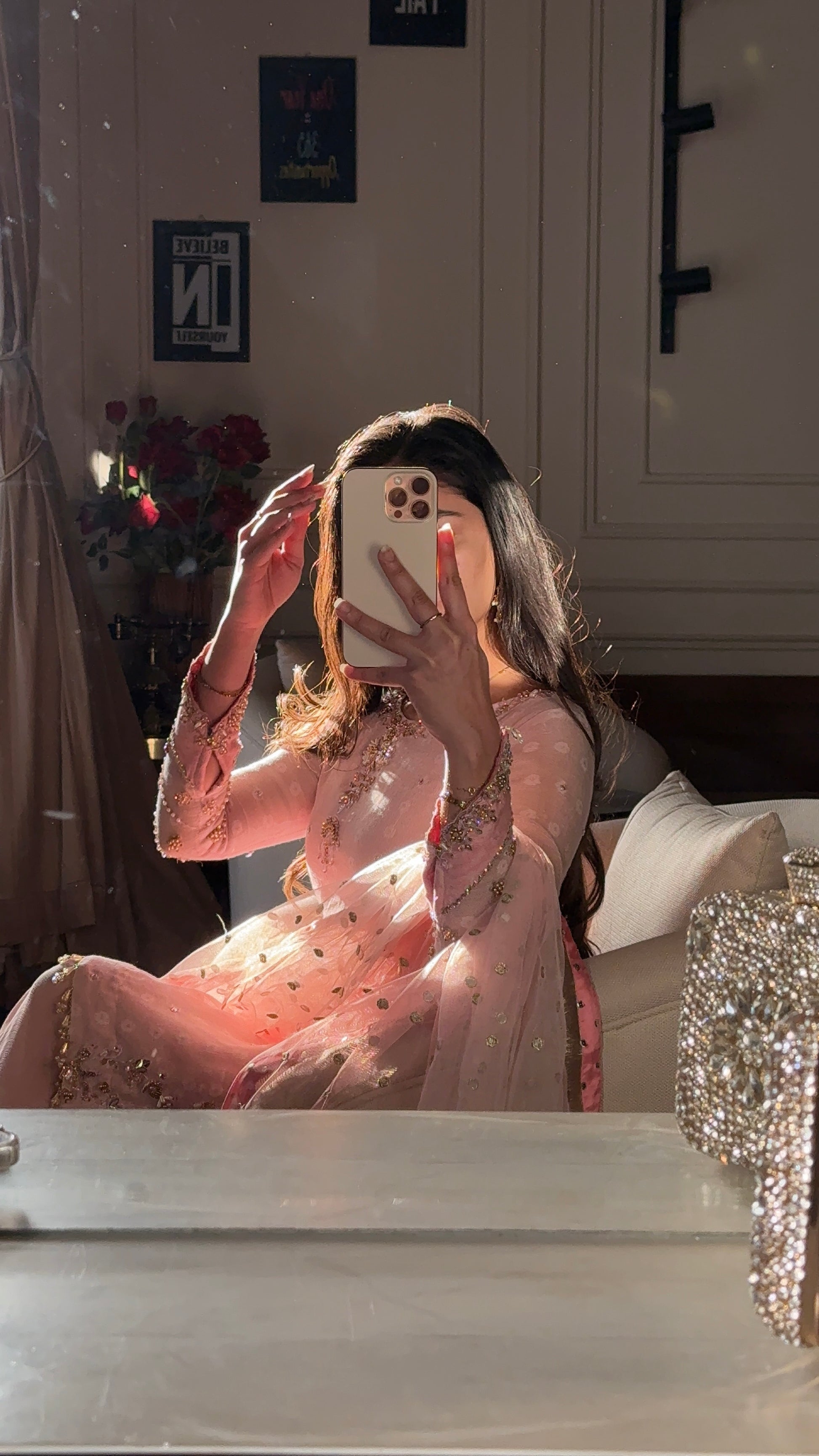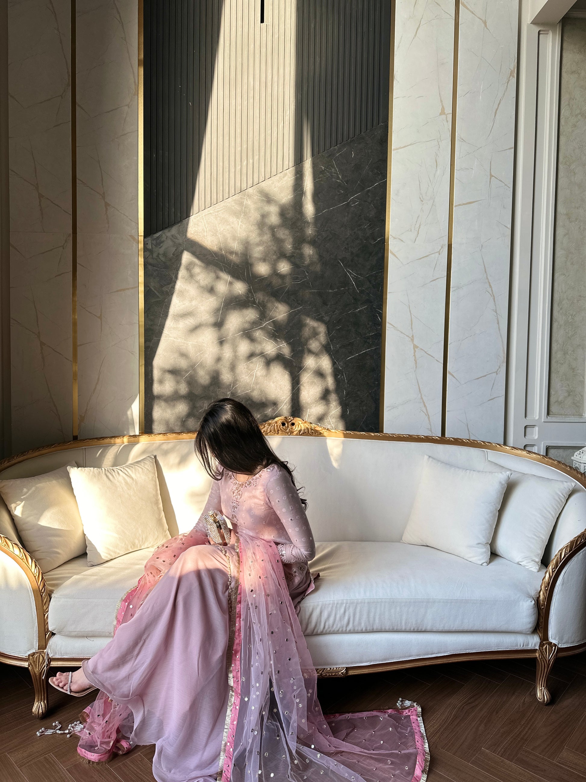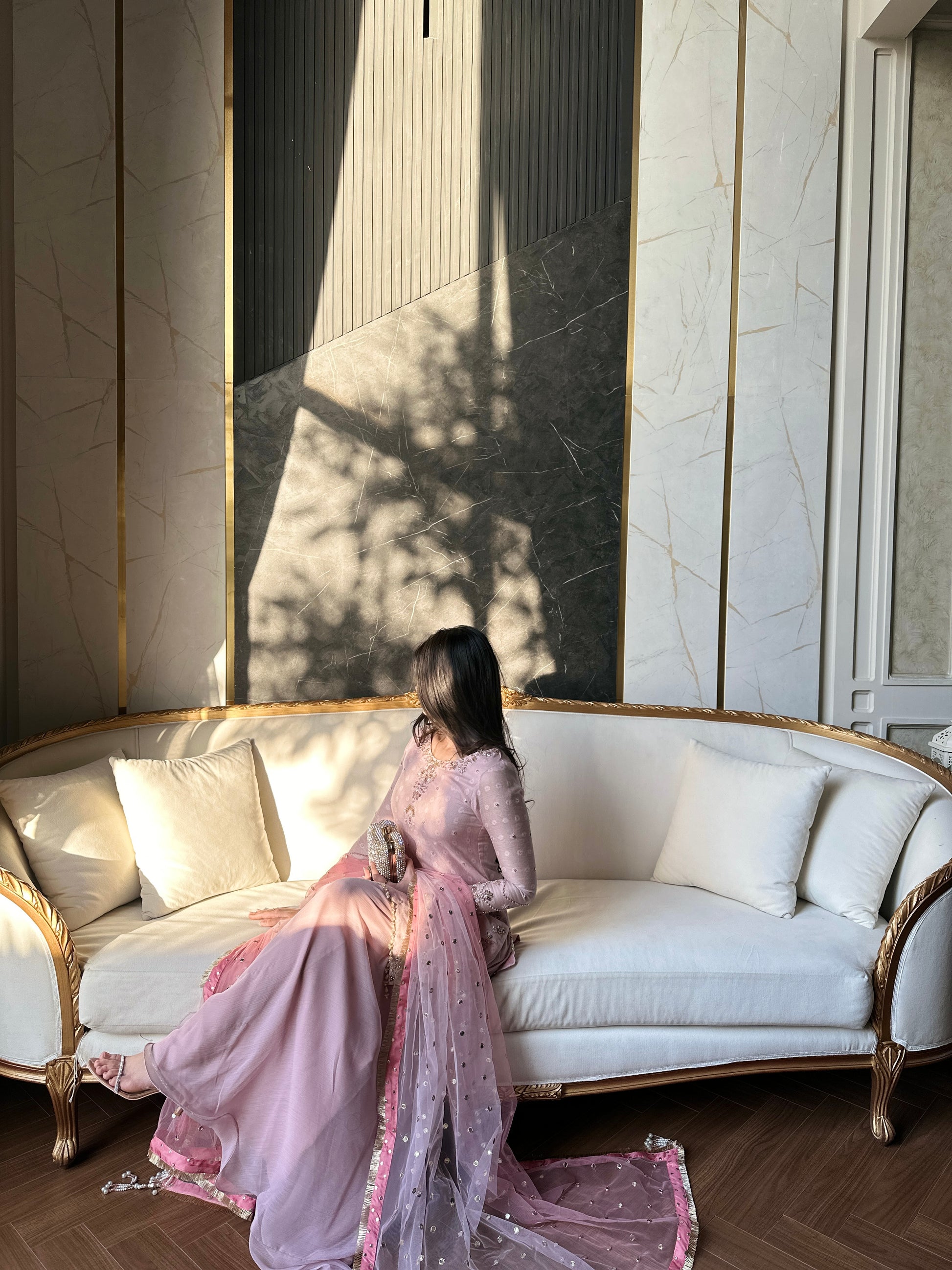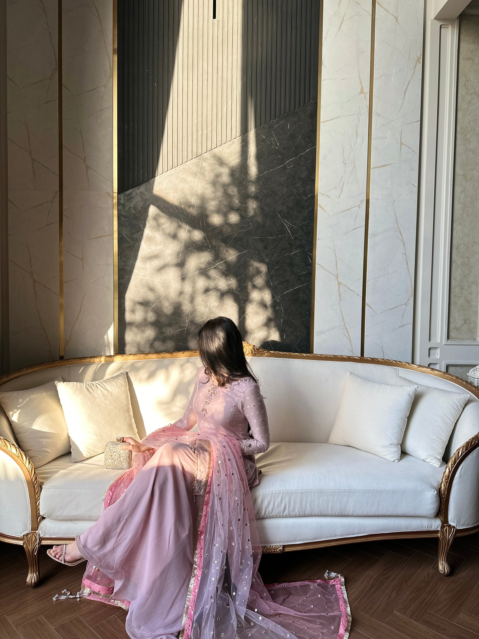 Paired with our signature sharara and a heavy dupatta with 2 tones of dusky pink and heavy pearl bead tassles in the corners